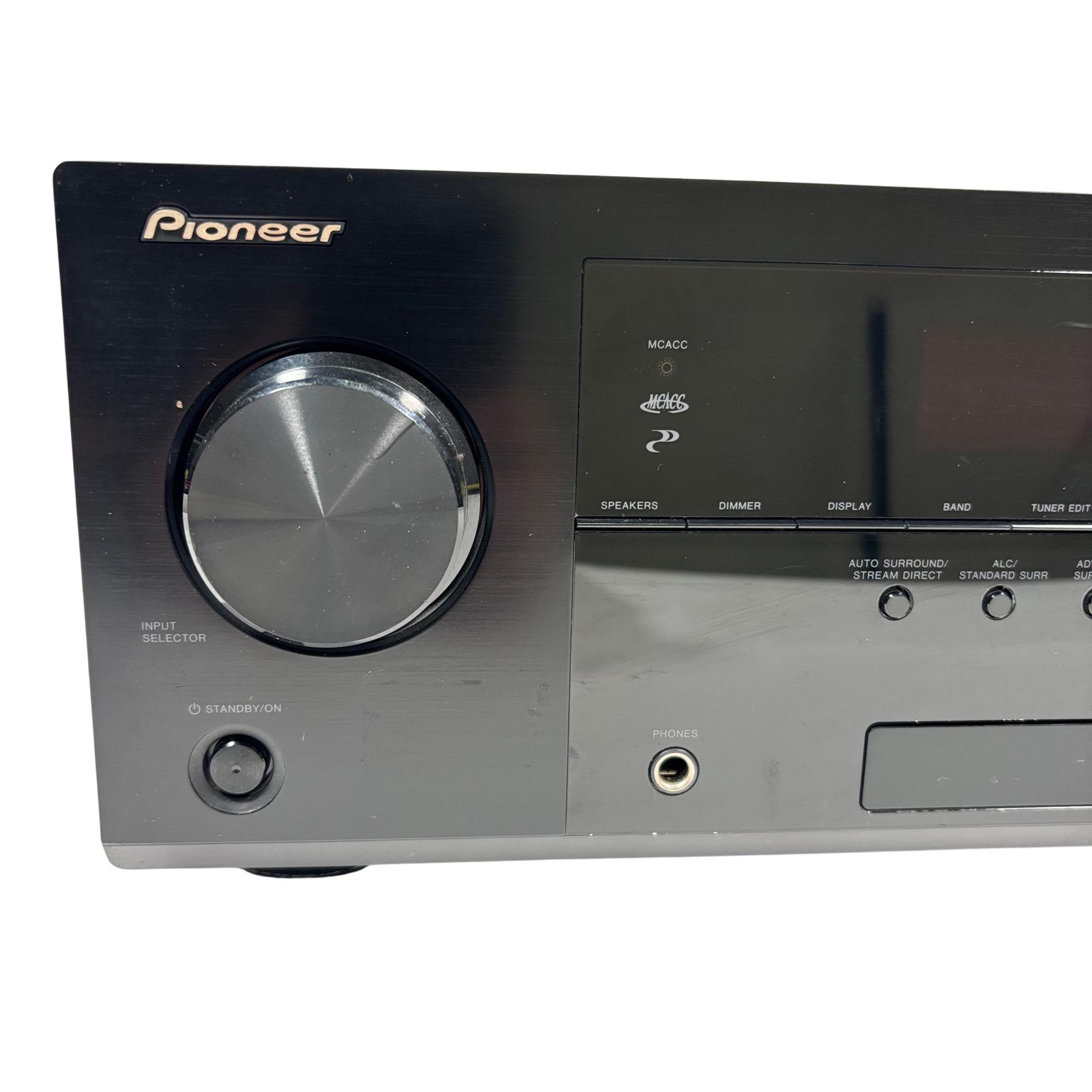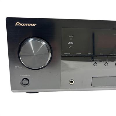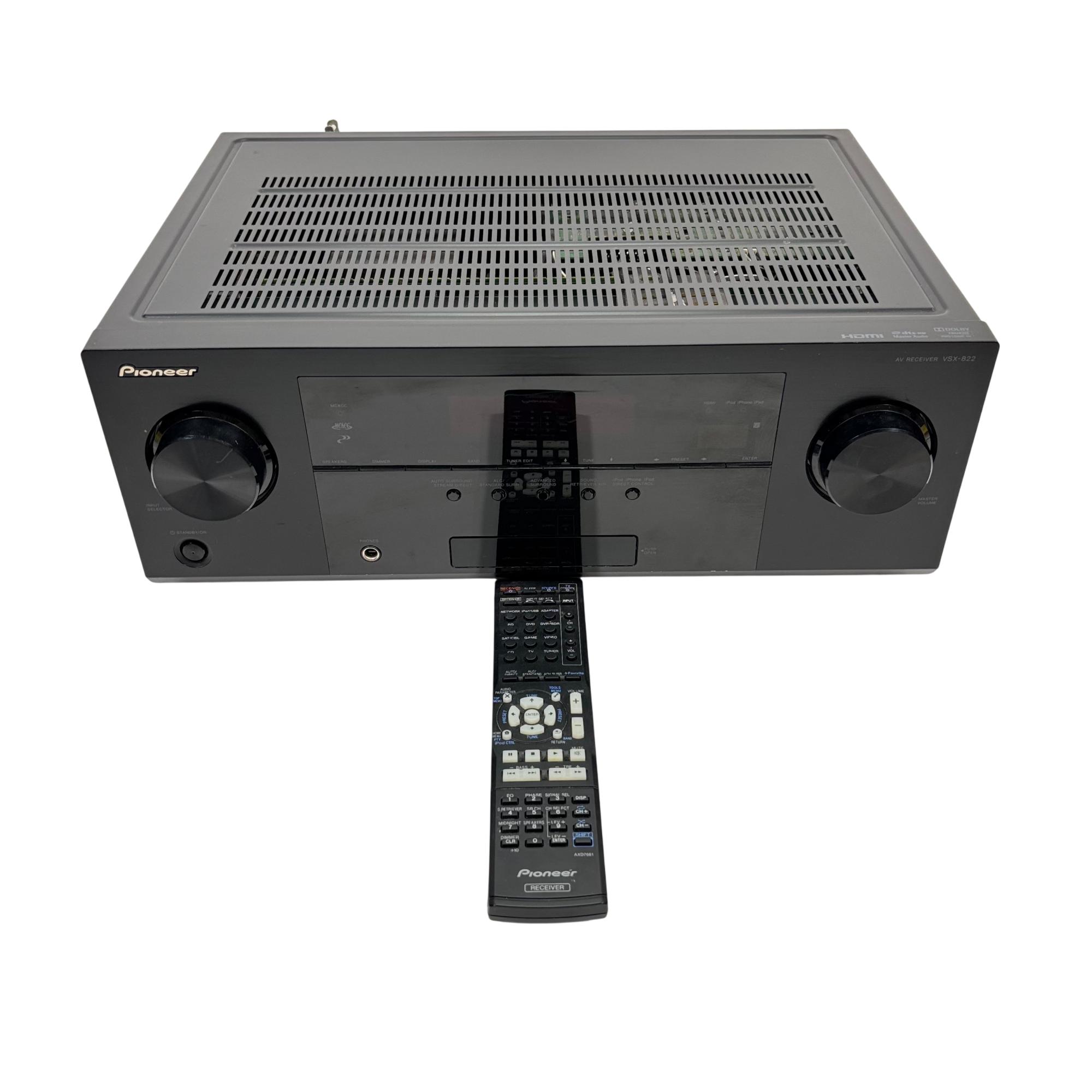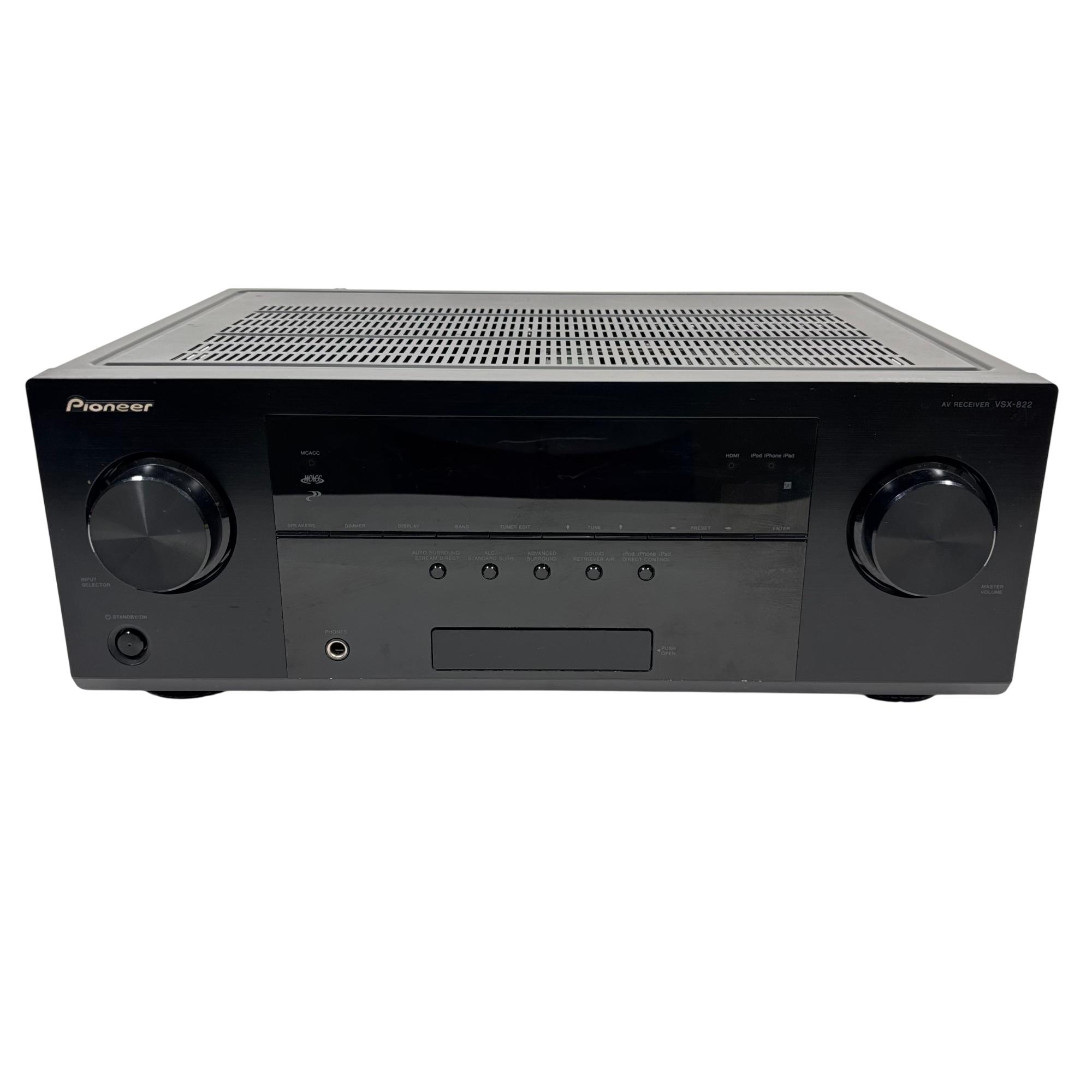 Pioneer VSX-822-K AV Receiver offers versatile connectivity options including HDMI, coaxial, and optical inputs for high-quality audio and video performance. This 7.1 channel receiver supports advanced surround sound formats and assignable speaker outputs, making it suitable for immersive home theater setups. Its intuitive design features multiple ports and controls designed to optimize multimedia entertainment systems.