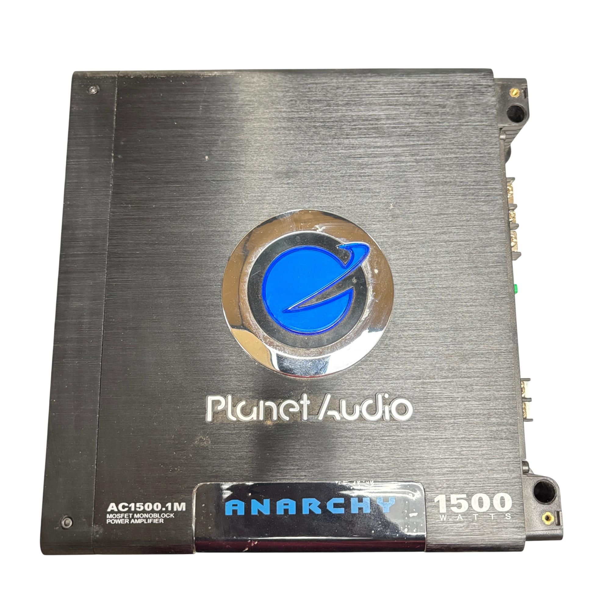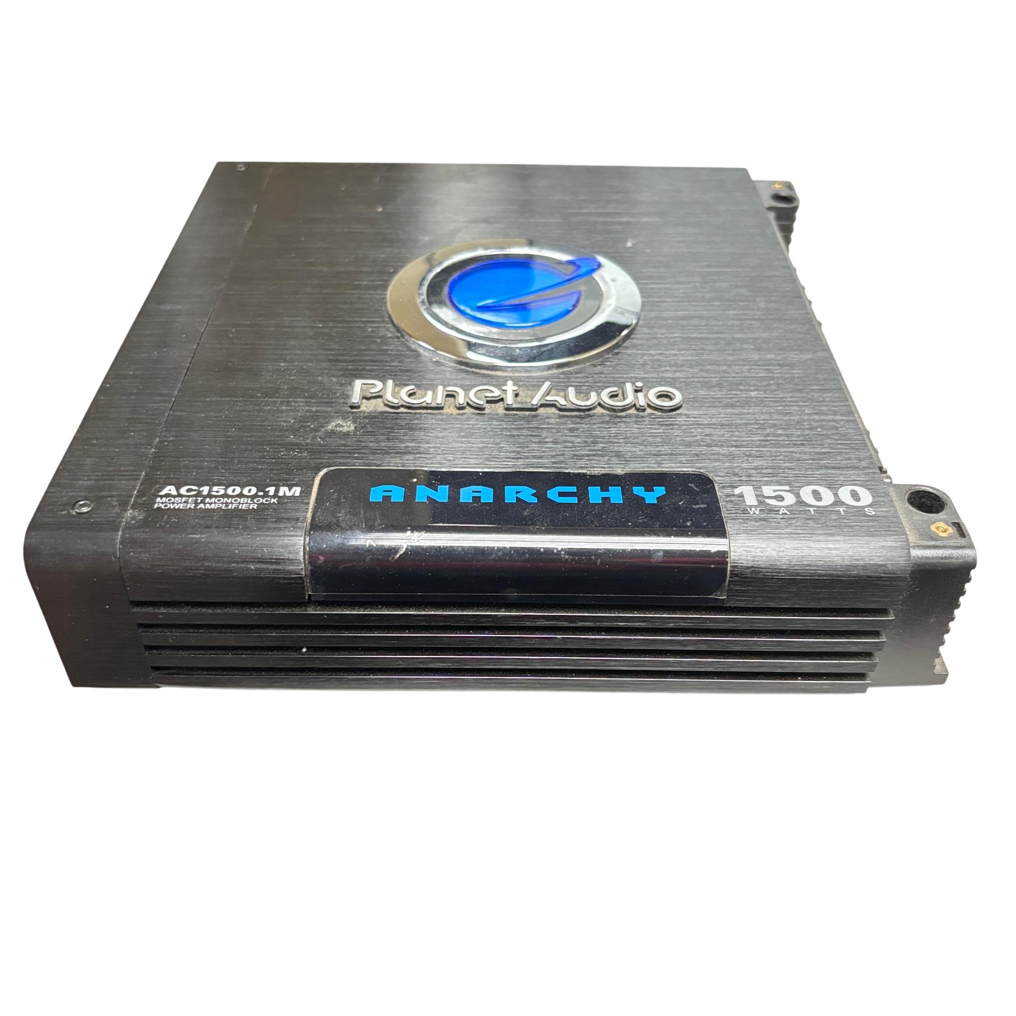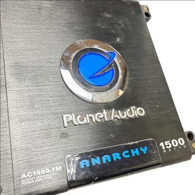 This Planet Audio Anarchy AC1500.1M MOSFET Monoblock Power Amplifier delivers high-performance 1500-watt power output designed for superior car audio systems. This black monoblock amplifier features advanced MOSFET circuitry and multiple power and speaker connections, ensuring reliable and efficient sound amplification tailored for automotive use.