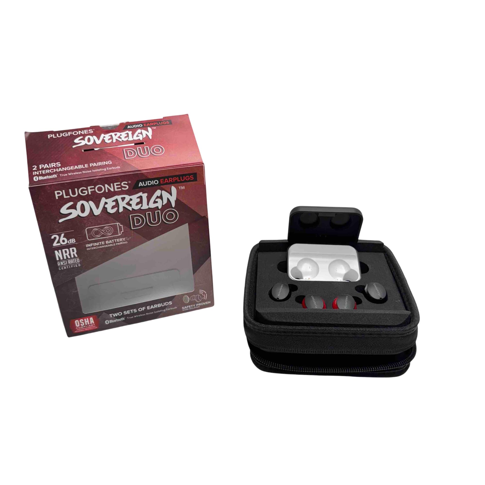 Experience superior sound and safety with the Plugfones Sovereign Duo, the ultimate Bluetooth true wireless noise isolating earbuds. This set features two pairs of interchangeable earbuds, offering both powerful audio performance and OSHA-compliant hearing protection with a 26dB noise reduction rating. Perfect for work, travel, or any environment where both clear music and effective noise isolation are essential.