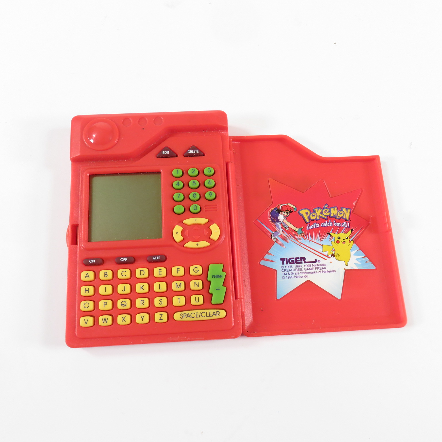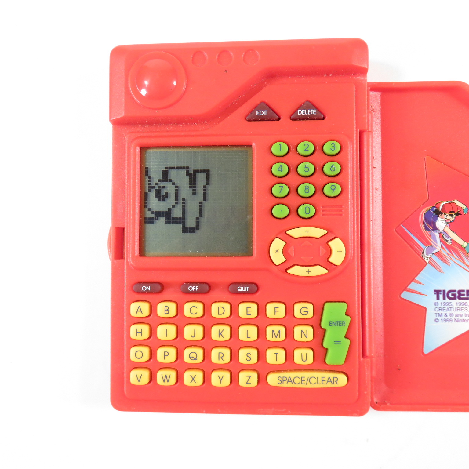The toy has a number pad and an alphabetical keyboard so that the user can input words and numbers.
