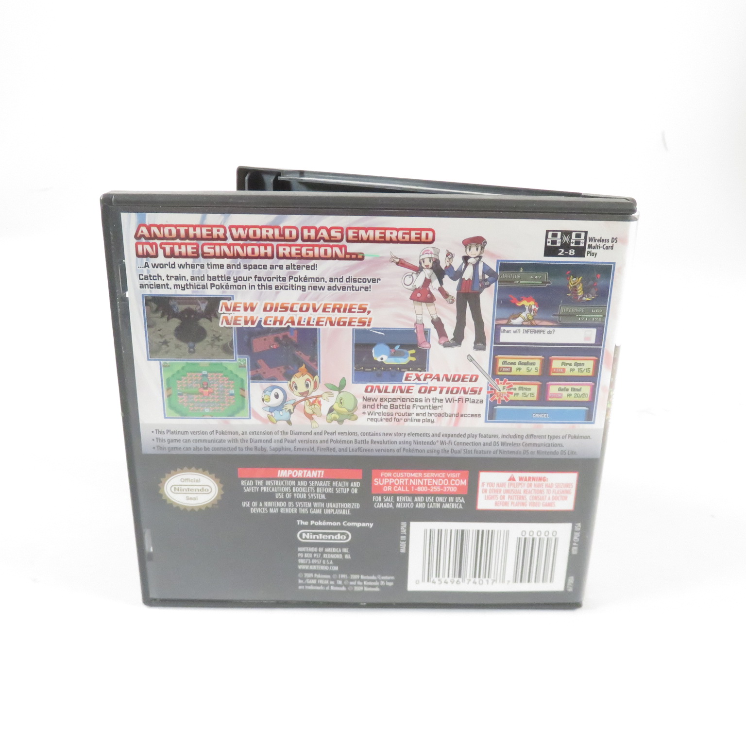 Pokémon Platinum features a new story full of adventure, never-before-seen forms of powerful Pokémon--including the legendary Giratina’s Origin Forme--and the Distortion World, a mysterious new world that suddenly appears in the Sinnoh region. In addition, with Pokémon Platinum up to 20 players can interact with other Pokémon fans from around the world in the new Wi-Fi Plaza, featuring mini-games and activities. Players can also enjoy the new features in the Global Terminal, such as posting battle videos using the new “Vs. Recorder.” In addition, Pokémon Platinum features a new Battle Frontier, where the toughest Trainers can test their skills in new ways.