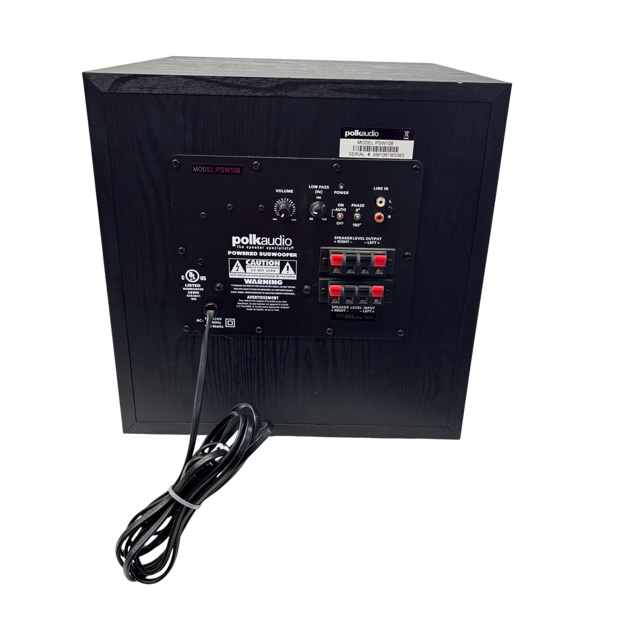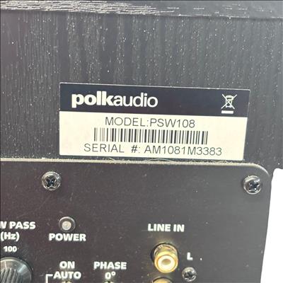 Polk Audio PSW108 10" Powered Subwoofer delivers deep, powerful bass with a front-firing design and a sleek black finish that complements any home audio setup. Featuring a 10-inch driver and advanced low-pass filter controls, it enhances the overall sound experience by providing rich, room-filling low frequencies. This powered subwoofer includes convenient speaker-level and line inputs for easy integration with various audio systems.