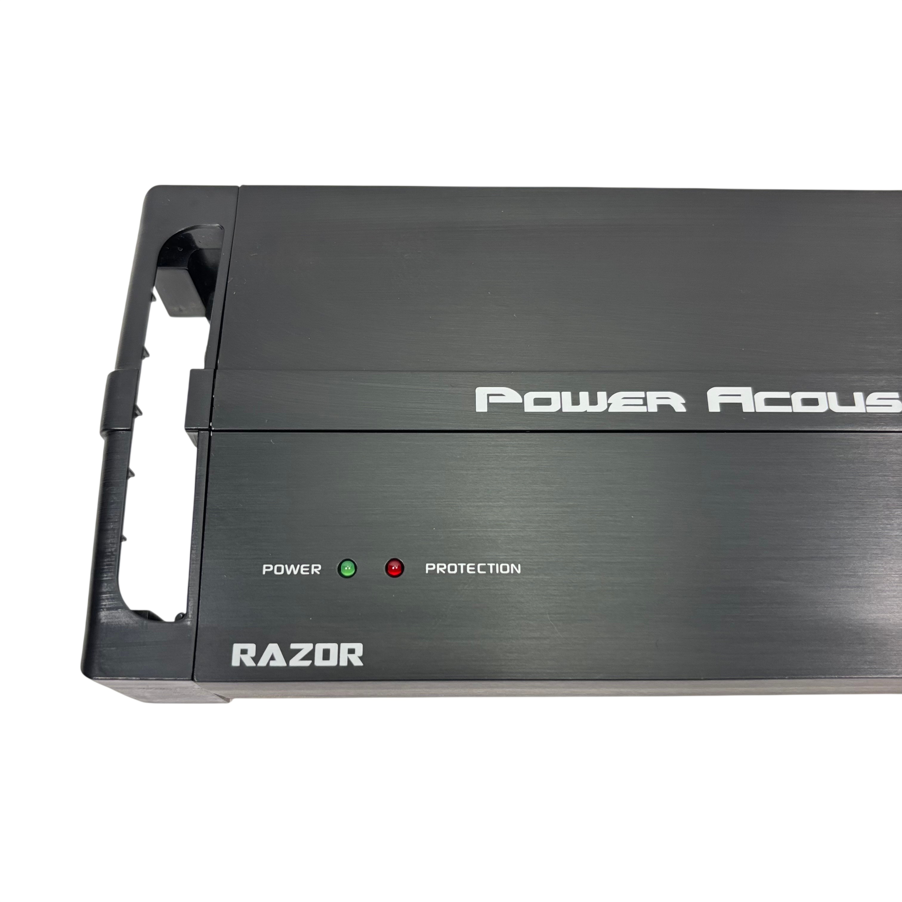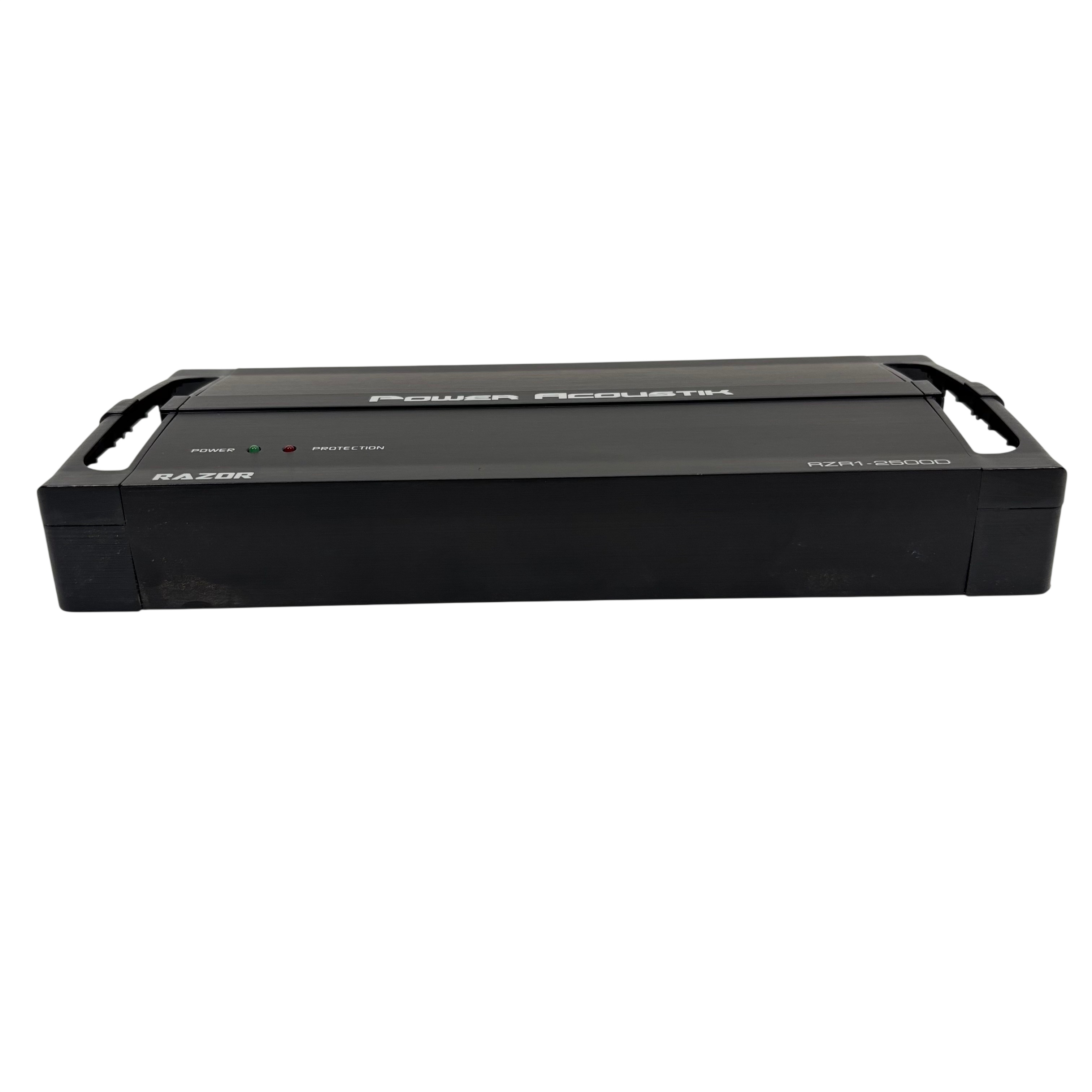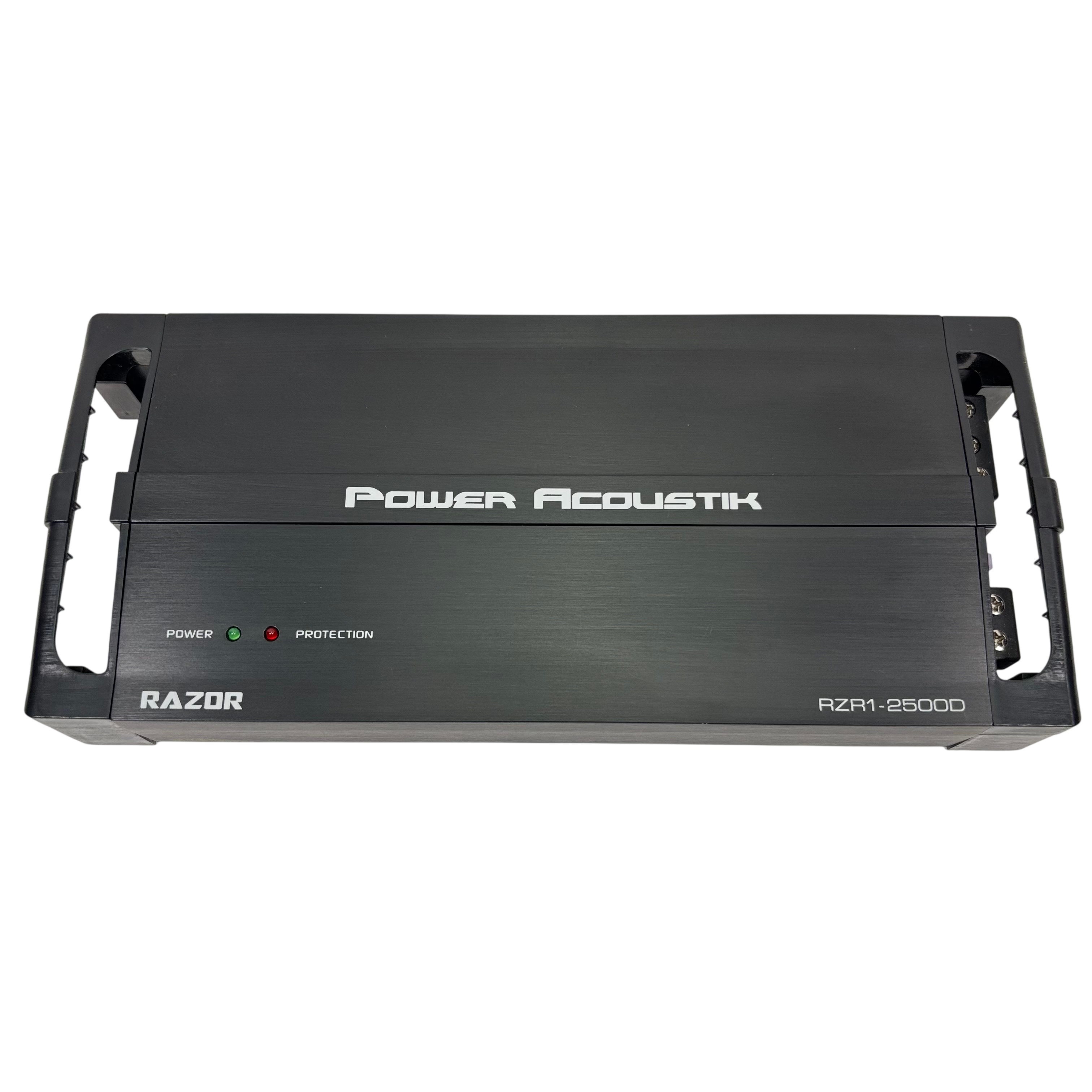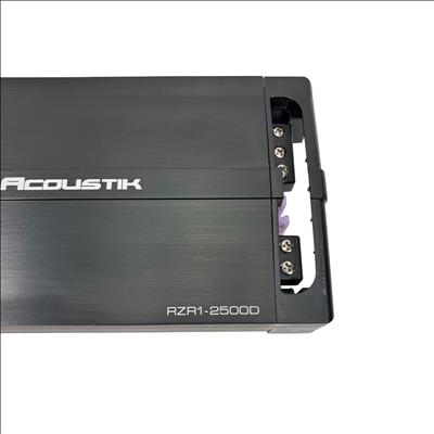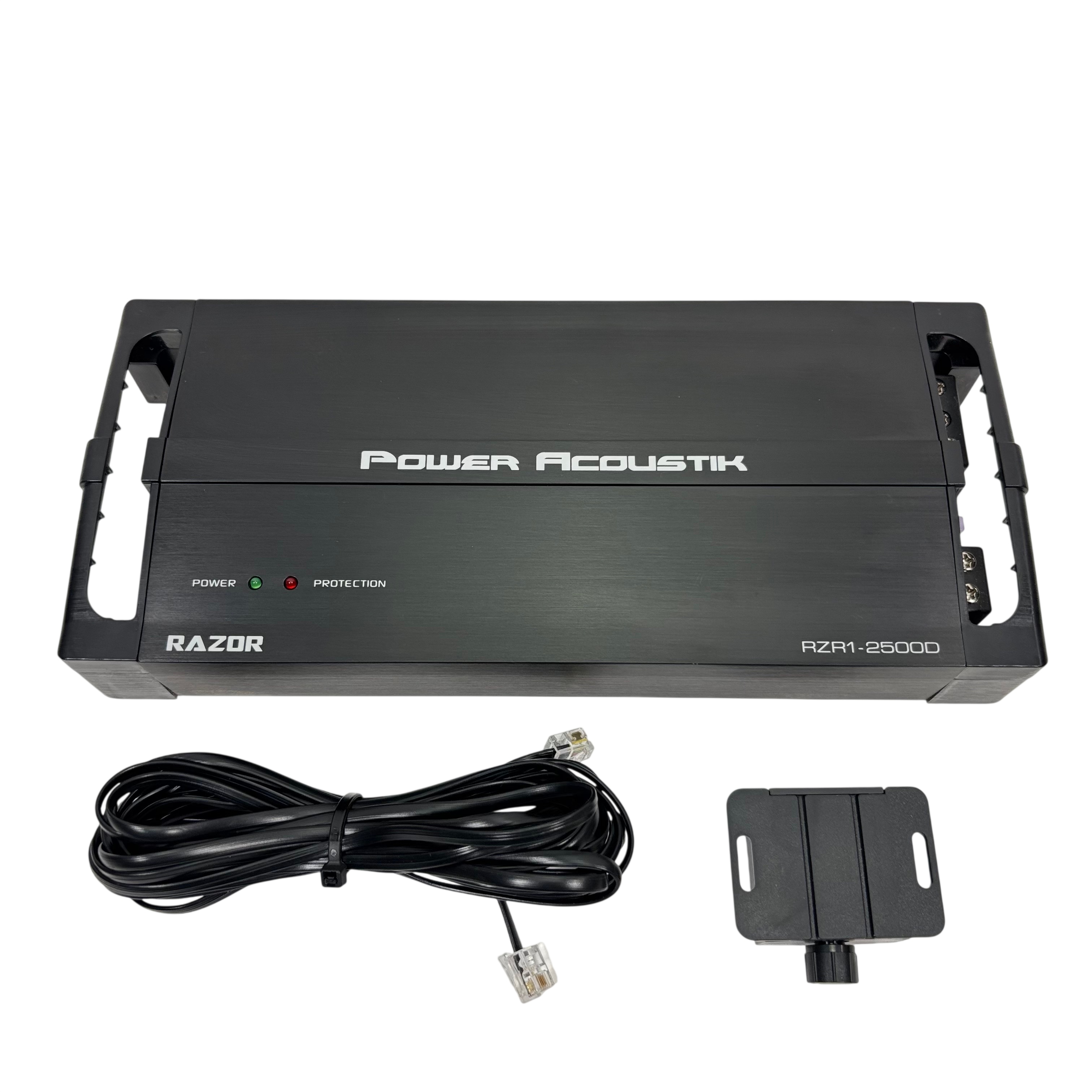 Power Acoustik Razor RZR1-2500D car audio amplifier is designed for 12V mobile use, delivering powerful sound enhancement with adjustable gain, bass boost, sub sonic, and low pass filters. This amplifier features protection circuitry to ensure reliable operation and includes a remote control with cable for easy bass adjustment from the drivers seat. Its compact black metal design measures approximately 14 inches in length, 7 inches in width, and 2 inches in height, making it a versatile addition to any car audio system.