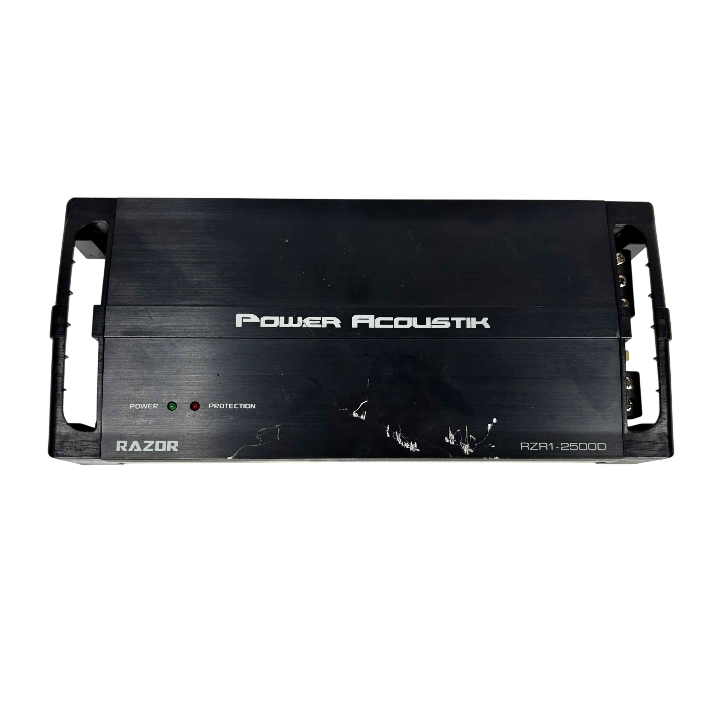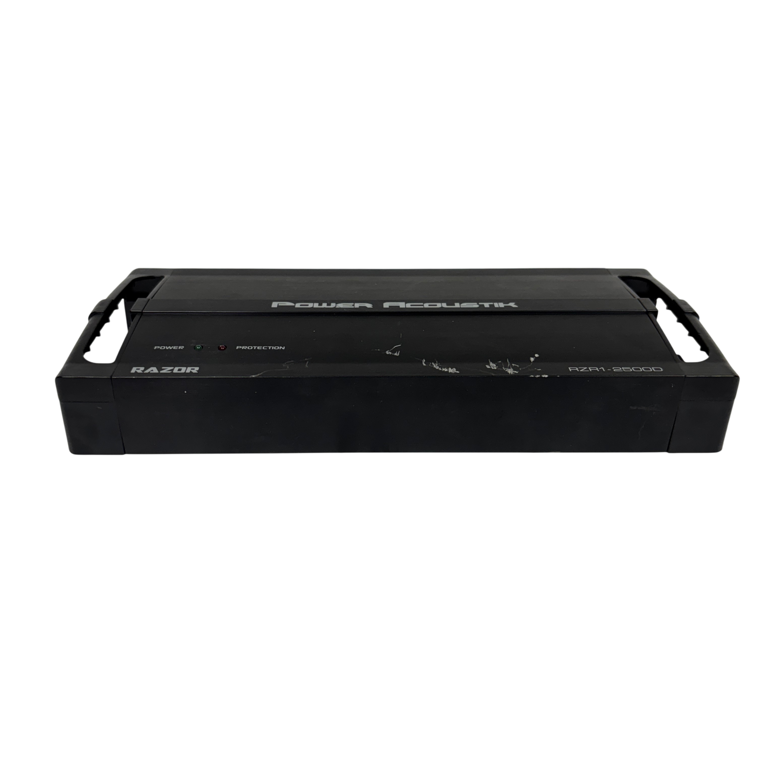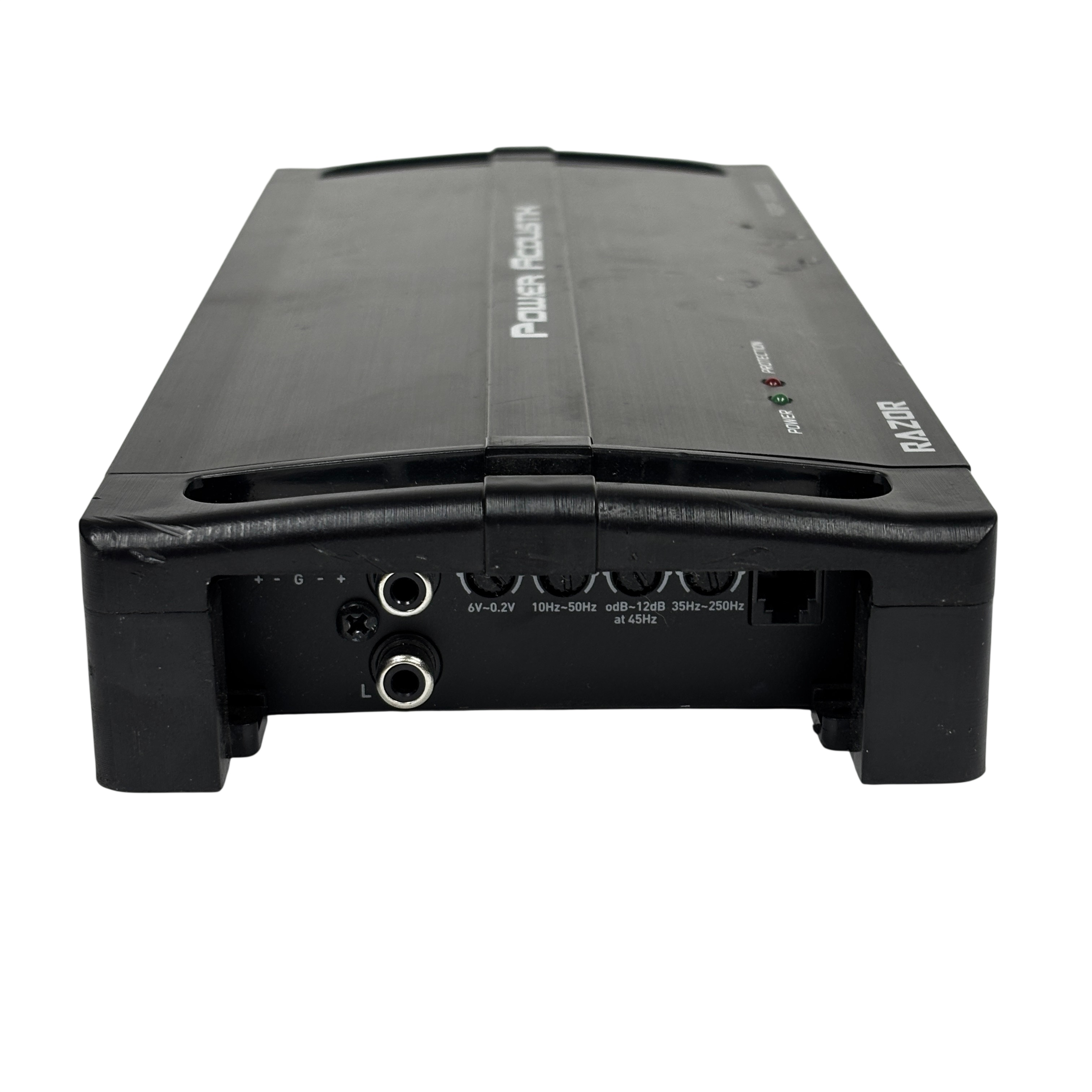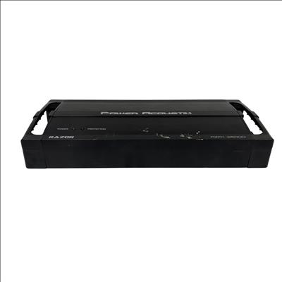 This Power Acoustik Razor RZR1-2500D Amplifier is a high-performance car audio amplifier designed to deliver powerful and clear sound. Featuring a frequency response range of 10Hz to 50Hz and adjustable gain from 0dB to 12dB, this amplifier allows fine-tuning for optimal audio output. The bass boost control covers 35Hz to 250Hz, enhancing low-frequency performance. Equipped with dual 25 Amp fuses and power/protection indicator LEDs, it ensures reliable operation and protection. Its compact black metal design measures approximately 2.00 inches in height, 6.00 inches in width, and 14.00 inches in length, weighing around 4.50 pounds, making it suitable for various car audio setups.