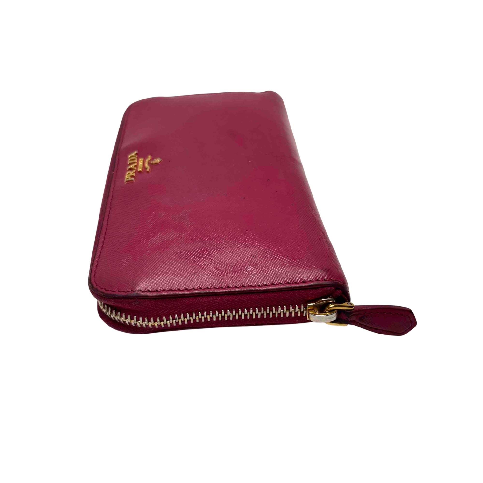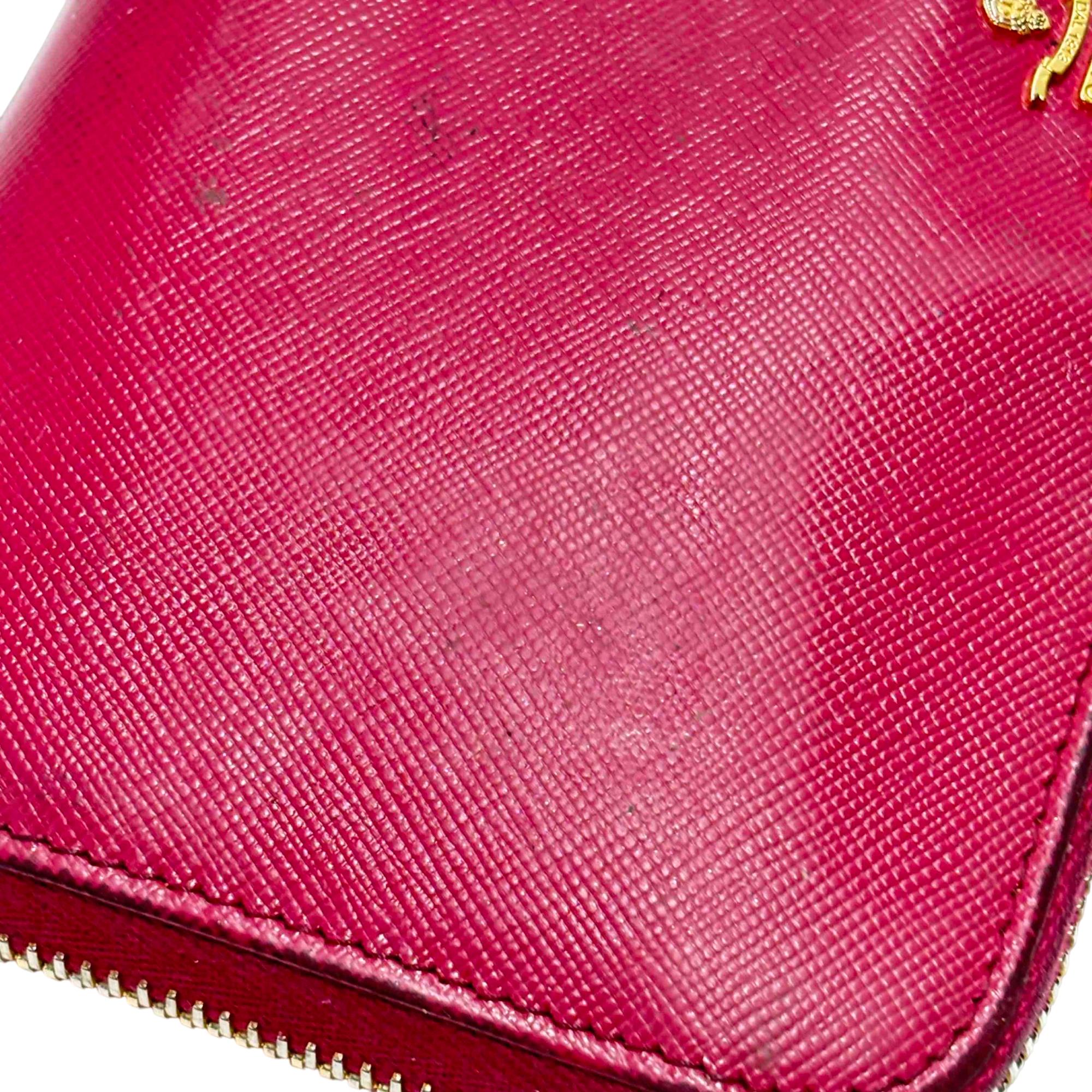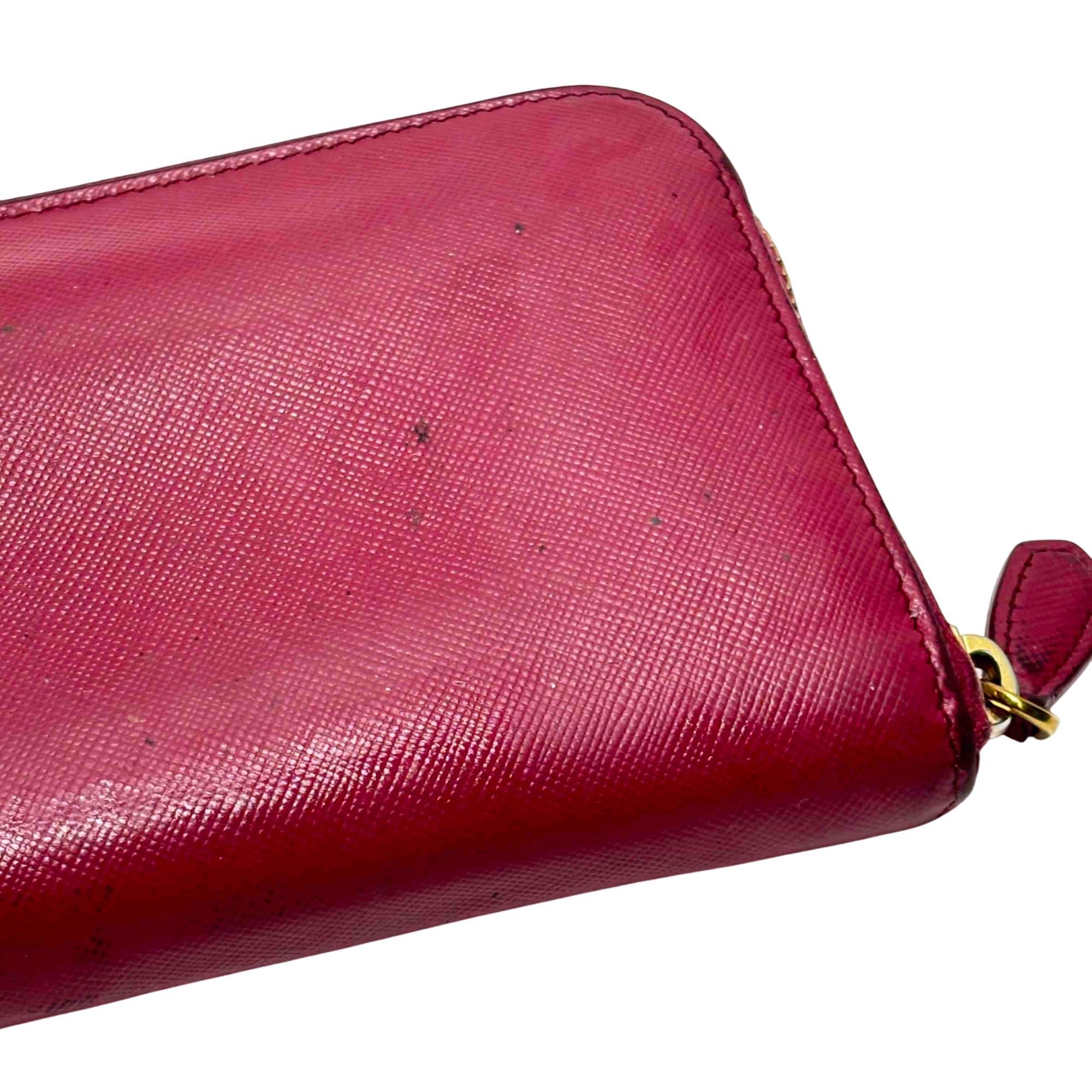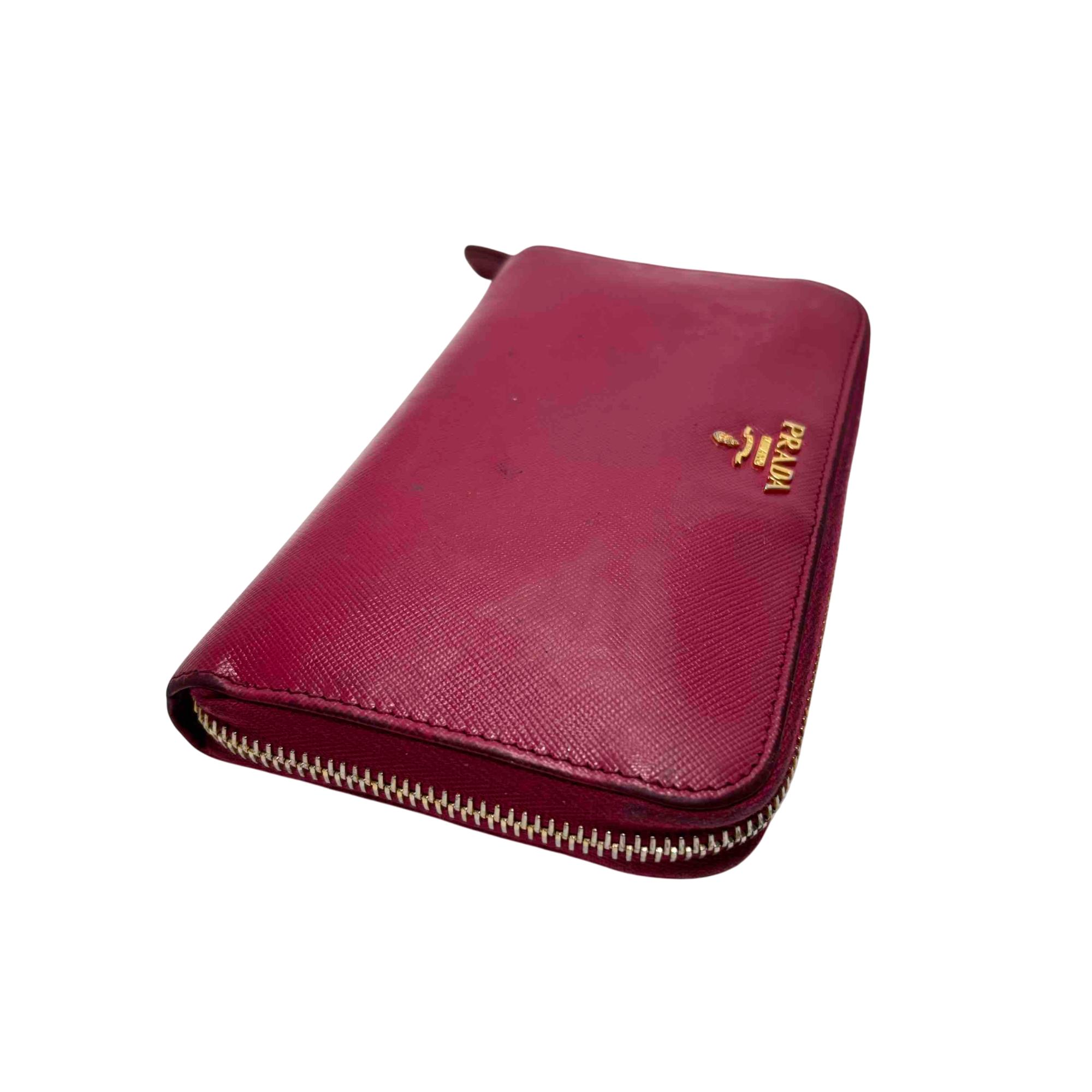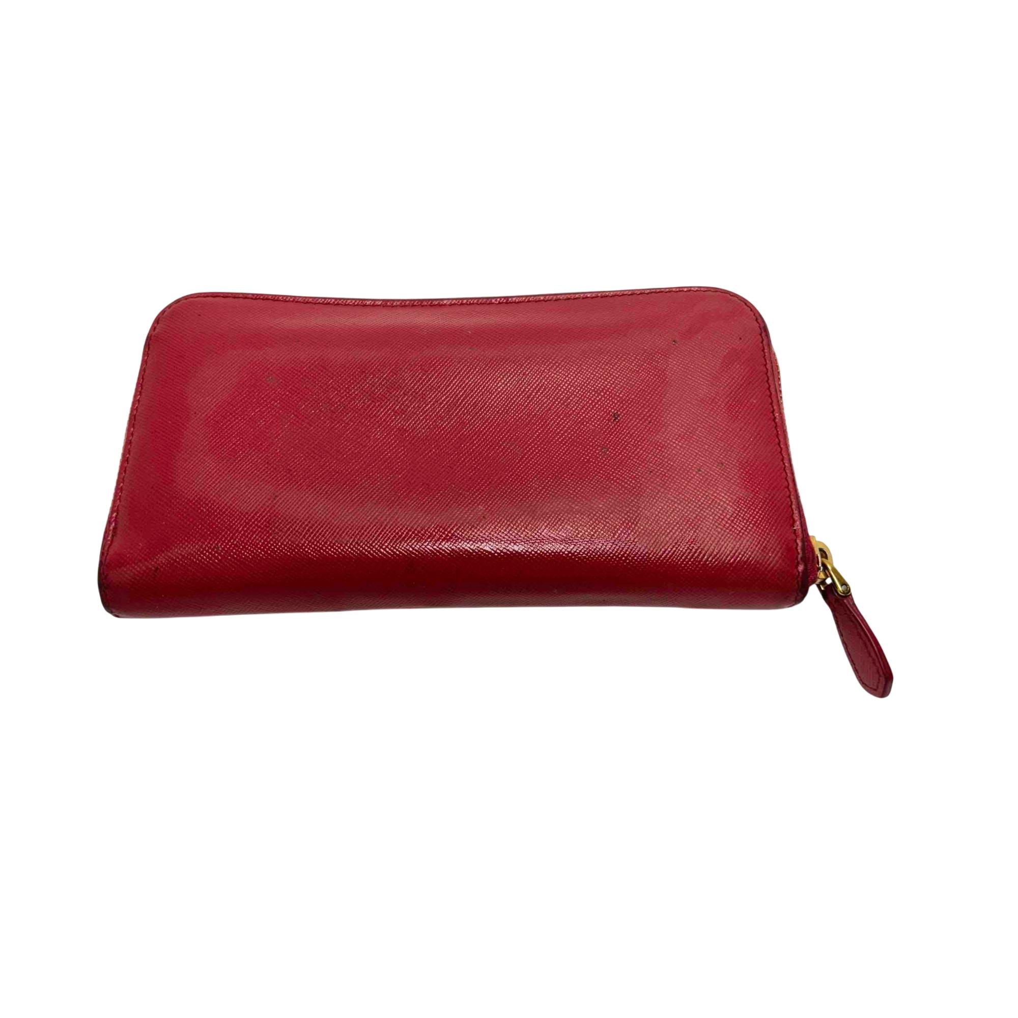 Elevate your accessory game with this authentic Prada Saffiano leather zip-around wallet in a striking red hue, accented with luxurious gold hardware. Known for its durability and iconic crosshatch texture, this wallet features multiple card slots and compartments for ultimate organization. A perfect blend of high fashion and practicality, this is a must-have for any designer enthusiast.