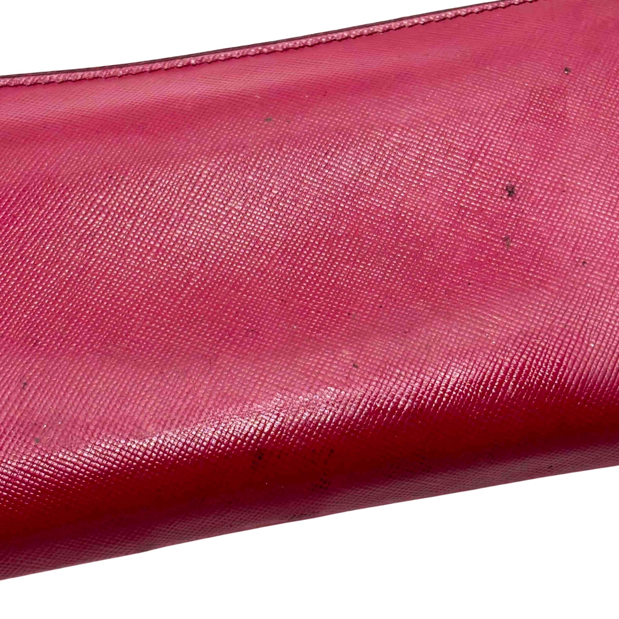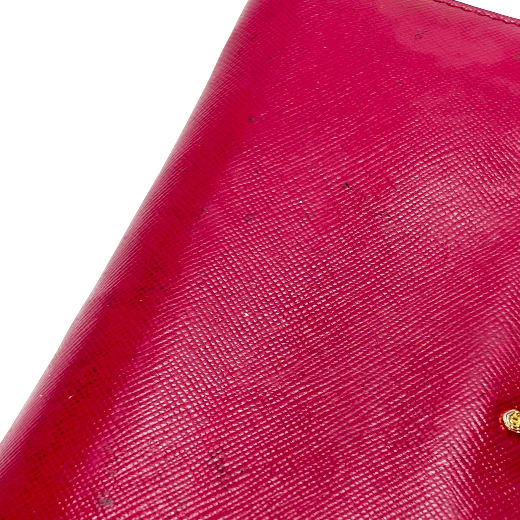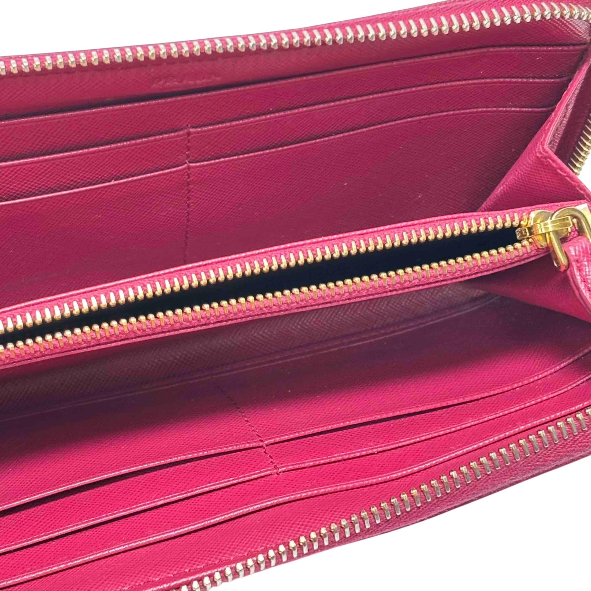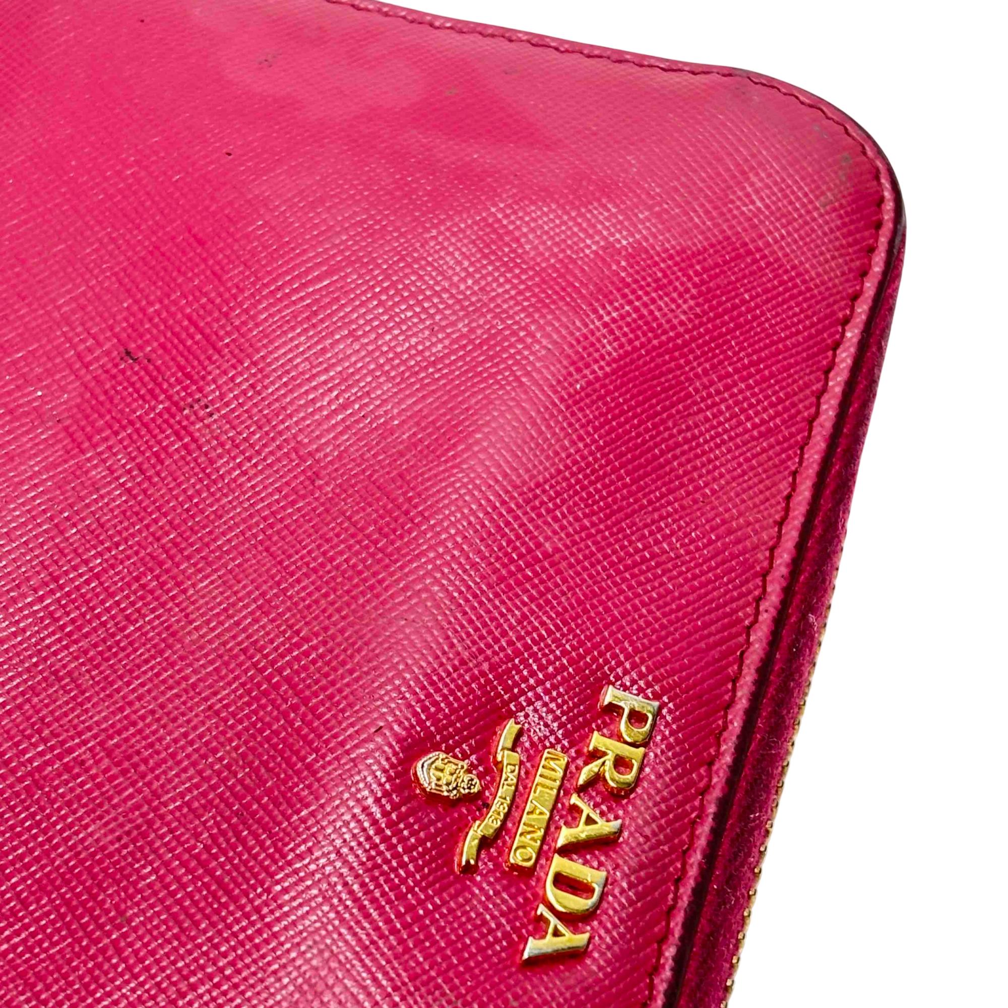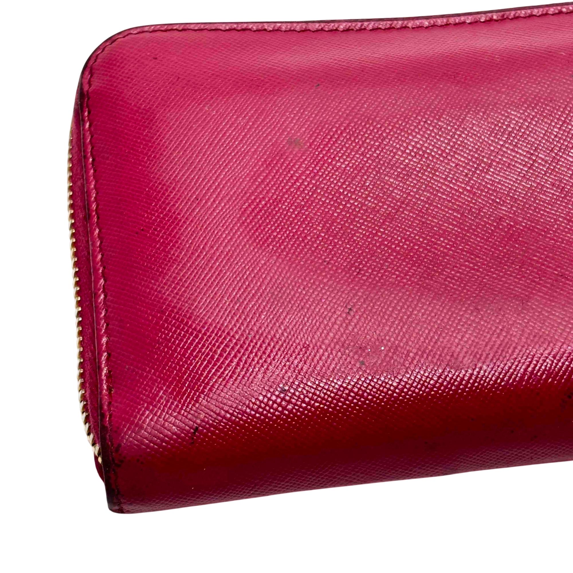 Elevate your accessory game with this authentic Prada Saffiano leather zip-around wallet in a striking red hue, accented with luxurious gold hardware. Known for its durability and iconic crosshatch texture, this wallet features multiple card slots and compartments for ultimate organization. A perfect blend of high fashion and practicality, this is a must-have for any designer enthusiast.