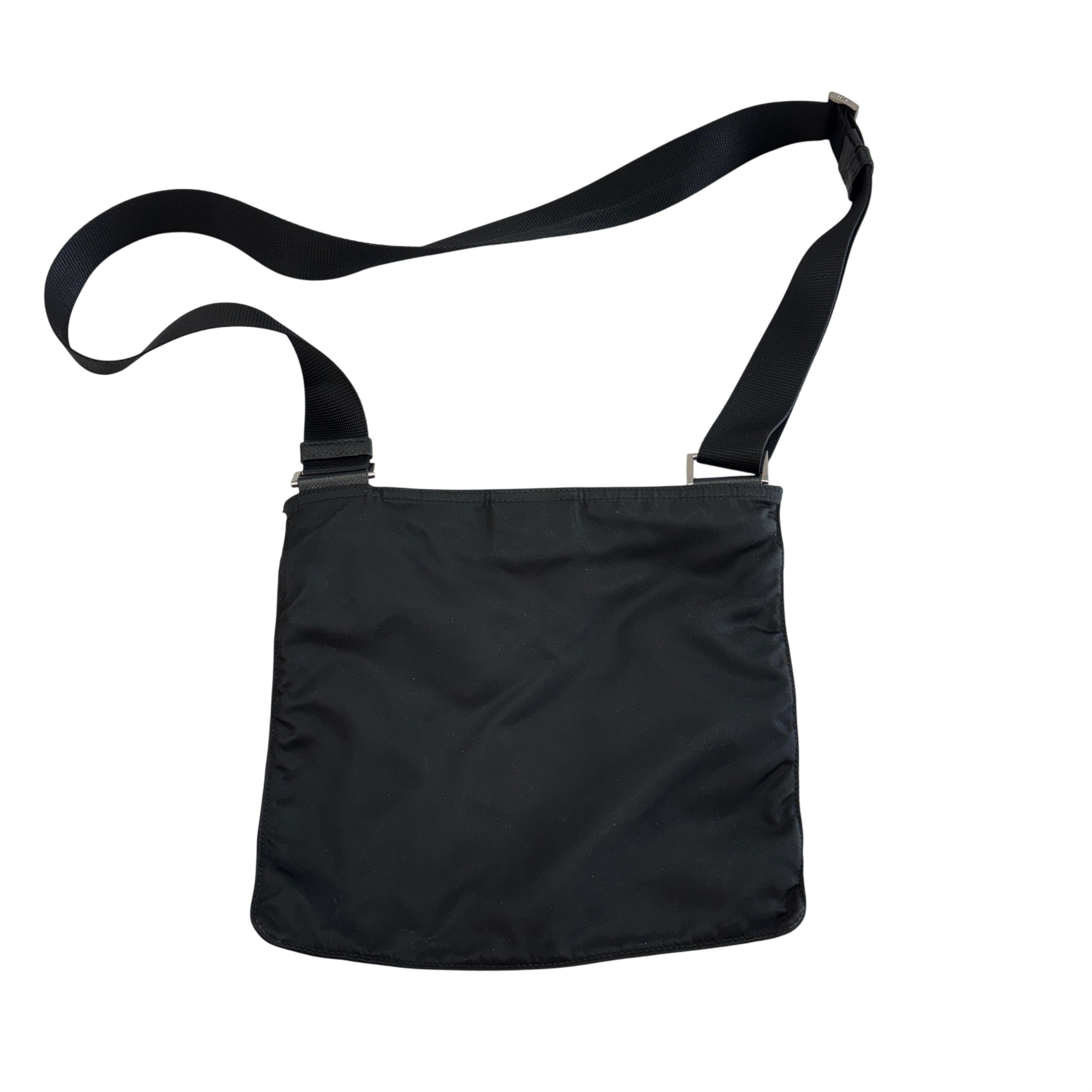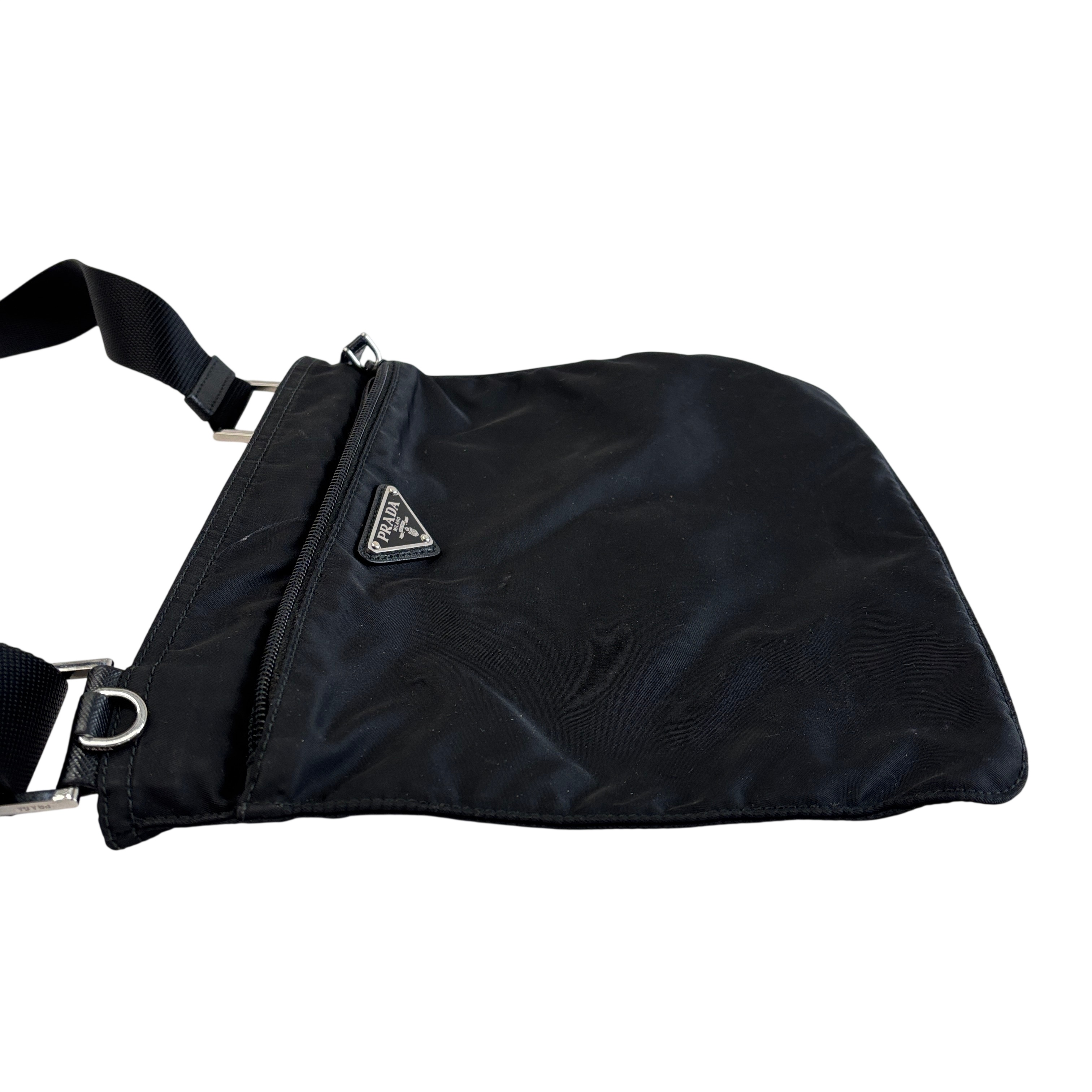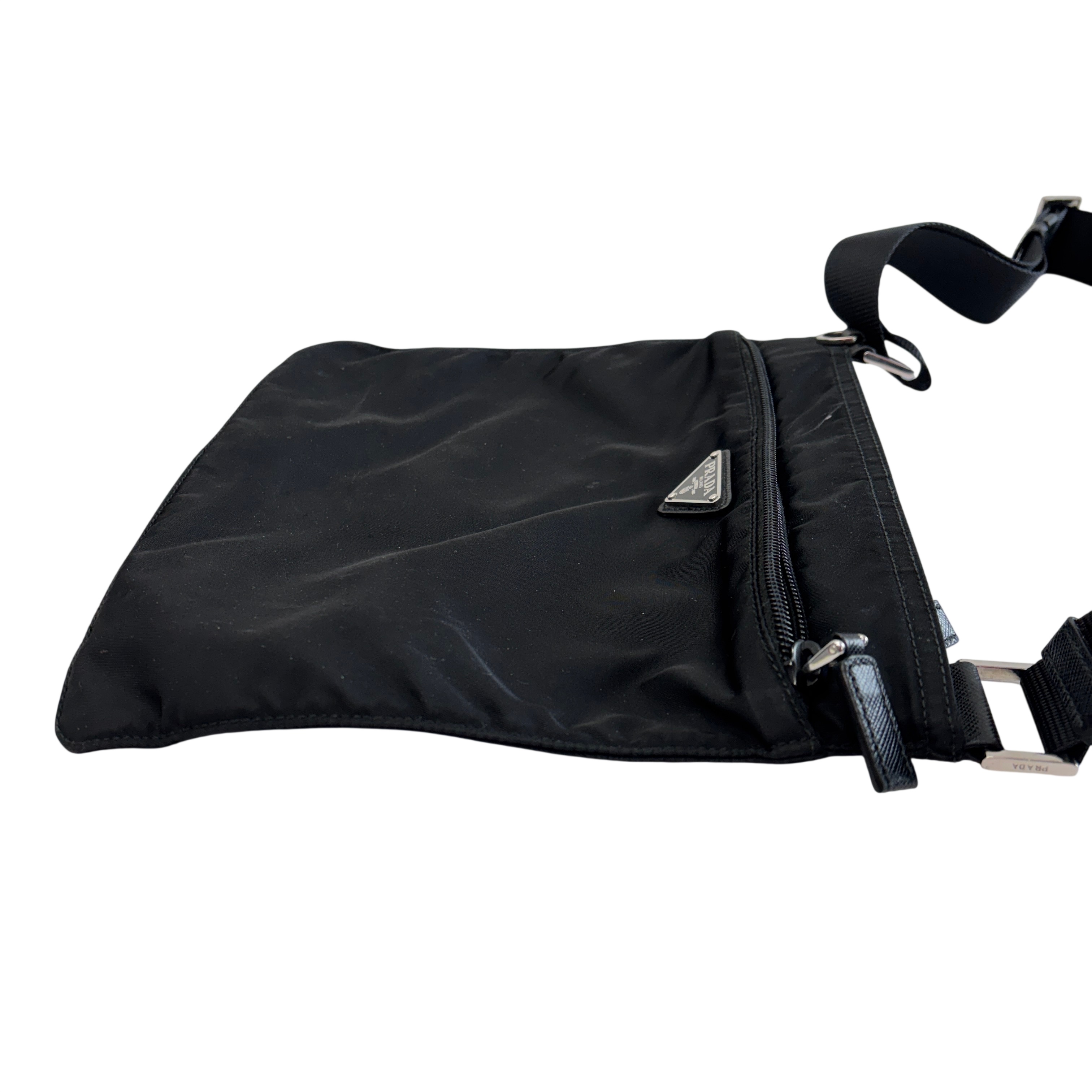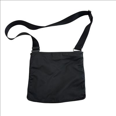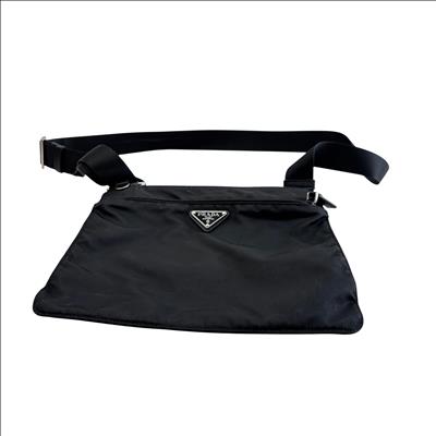 The Prada Tessuto Nylon Crossbody Bag is a sleek and lightweight accessory crafted from durable black nylon. Featuring an adjustable strap and a front zippered pocket with the iconic Prada logo plaque, this bag offers both style and practicality. Measuring approximately 9.5 inches in length, 8 inches in height, and 0.5 inches in width, it is perfect for carrying essentials hands-free. Ideal for everyday use or travel, this crossbody bag combines luxury branding with functional design.