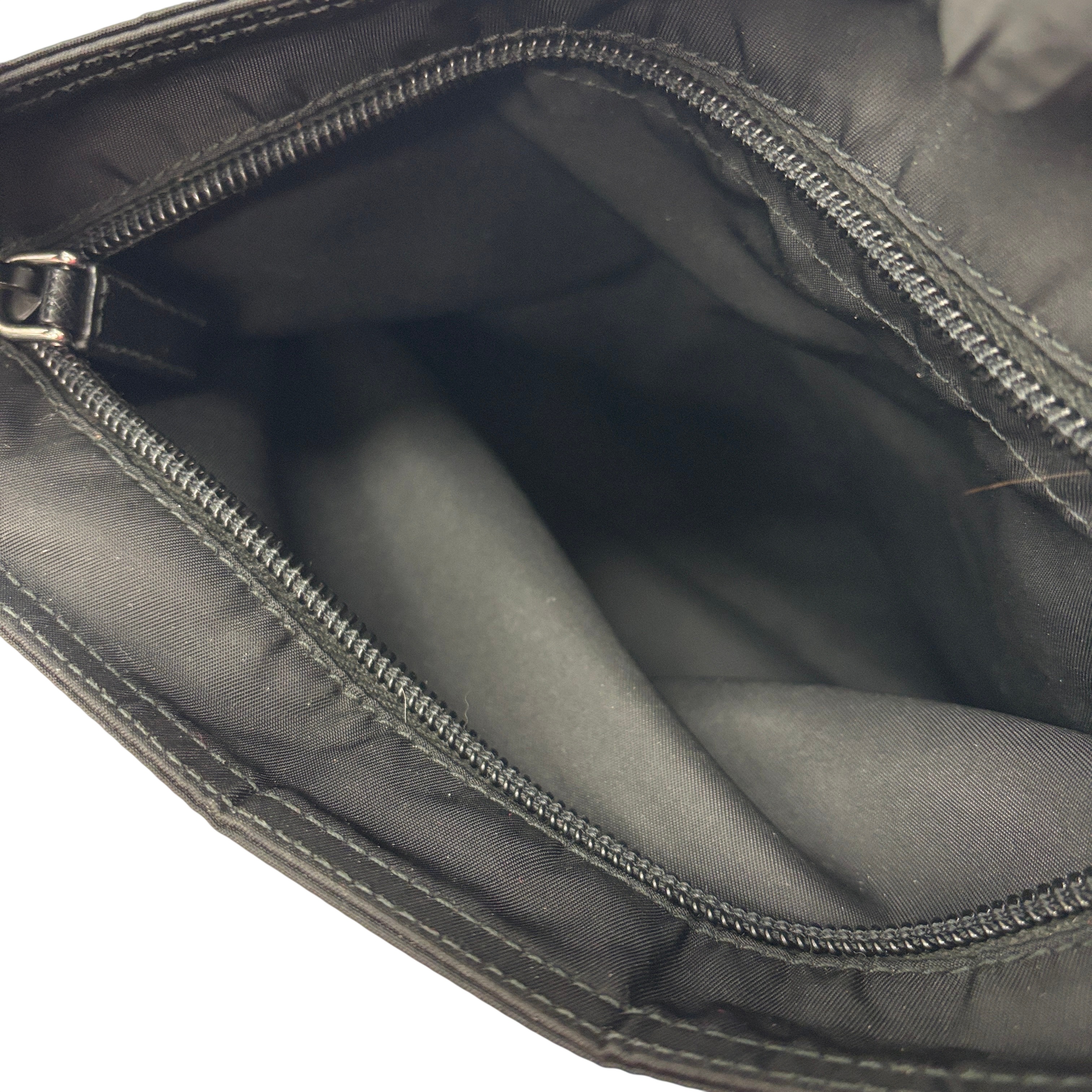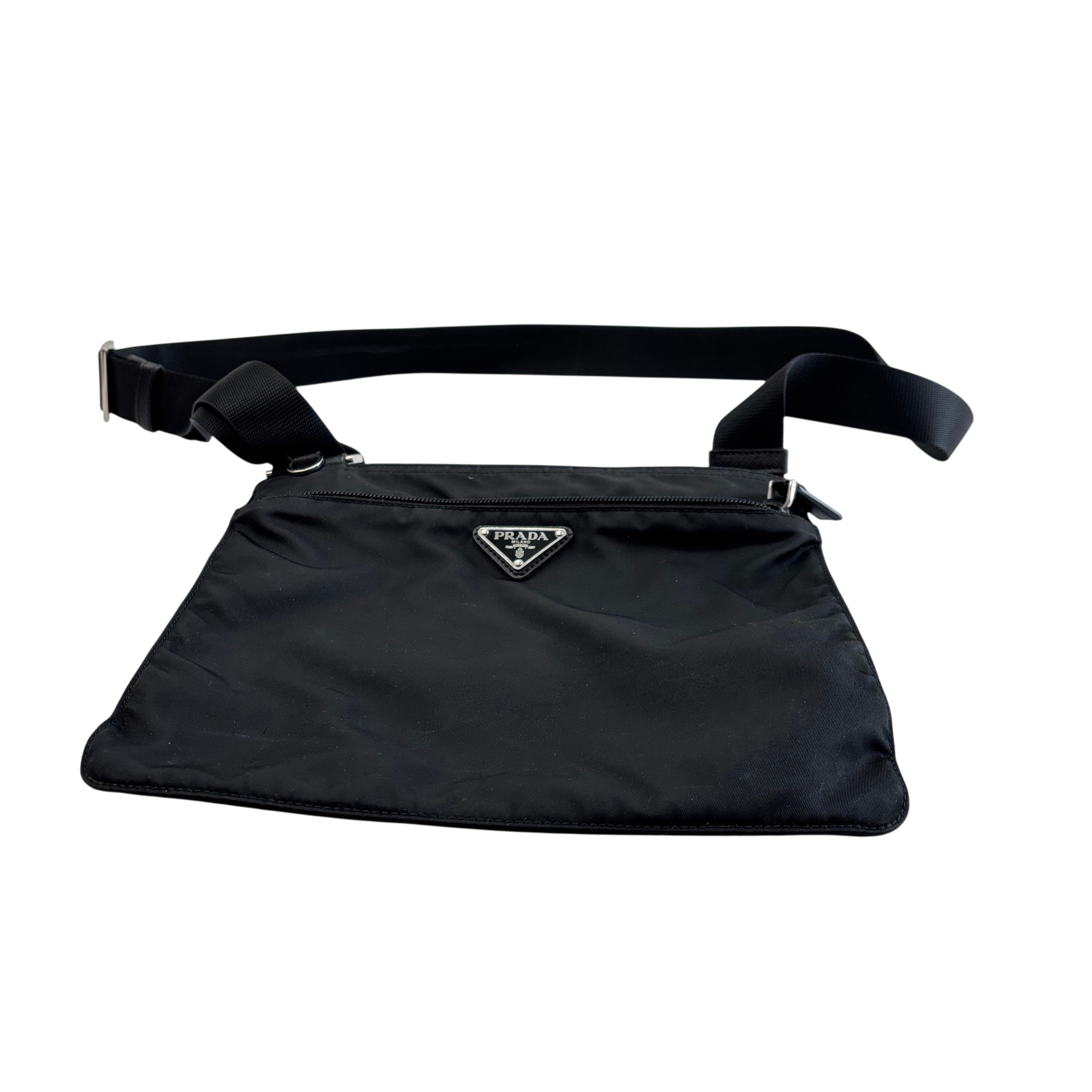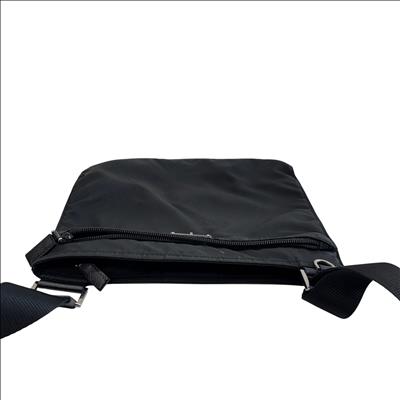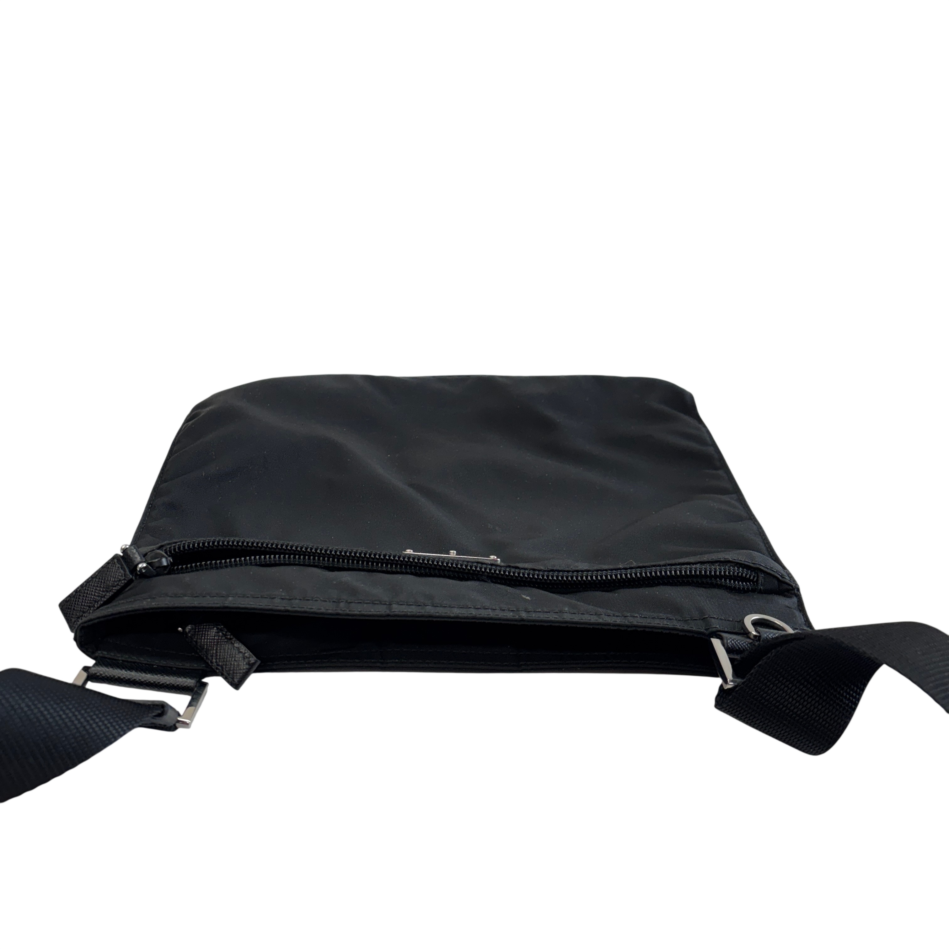 The Prada Tessuto Nylon Crossbody Bag is a sleek and lightweight accessory crafted from durable black nylon. Featuring an adjustable strap and a front zippered pocket with the iconic Prada logo plaque, this bag offers both style and practicality. Measuring approximately 9.5 inches in length, 8 inches in height, and 0.5 inches in width, it is perfect for carrying essentials hands-free. Ideal for everyday use or travel, this crossbody bag combines luxury branding with functional design.