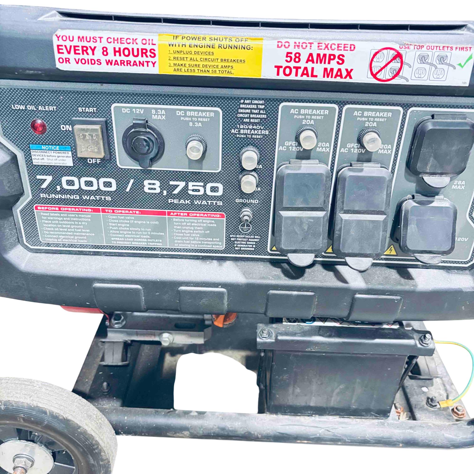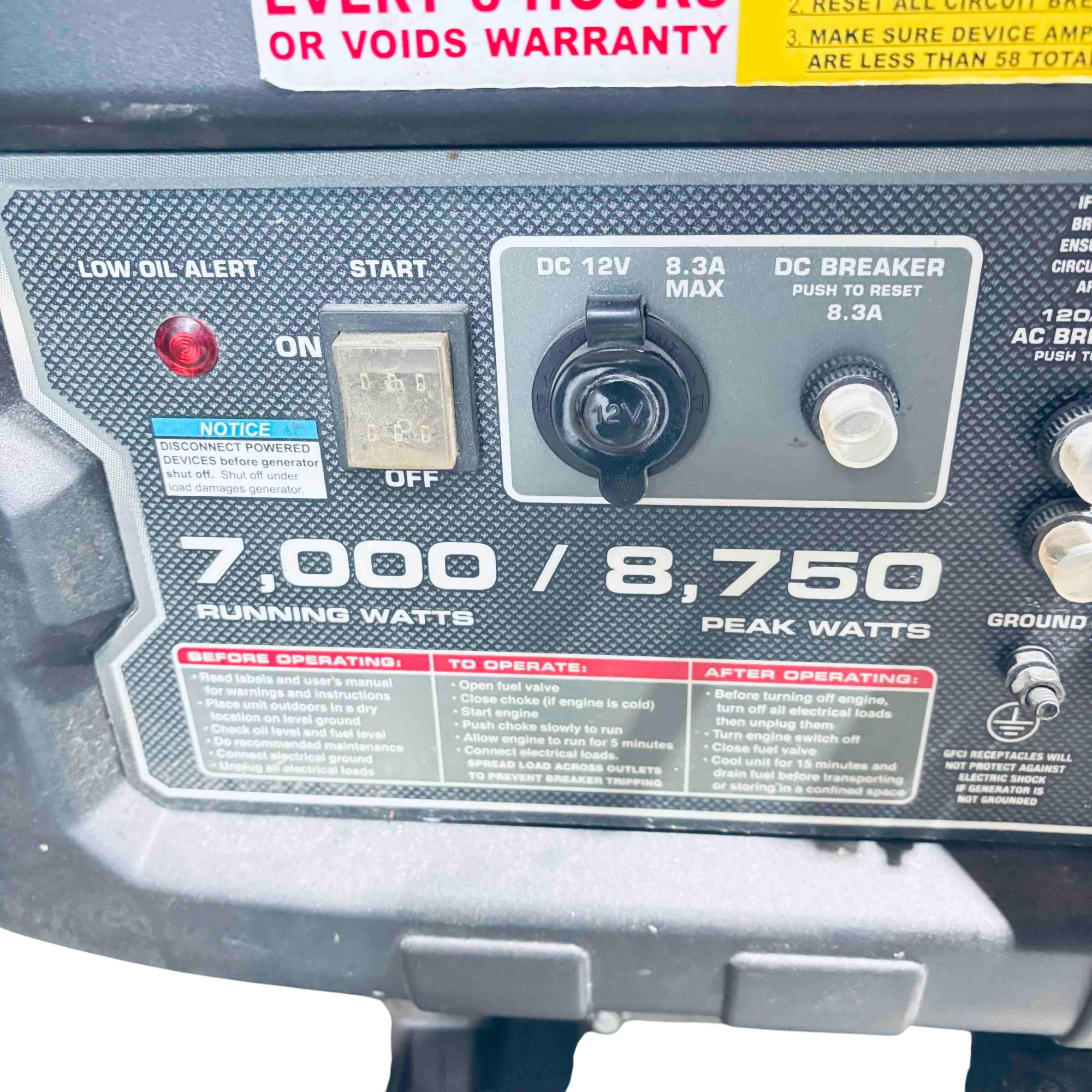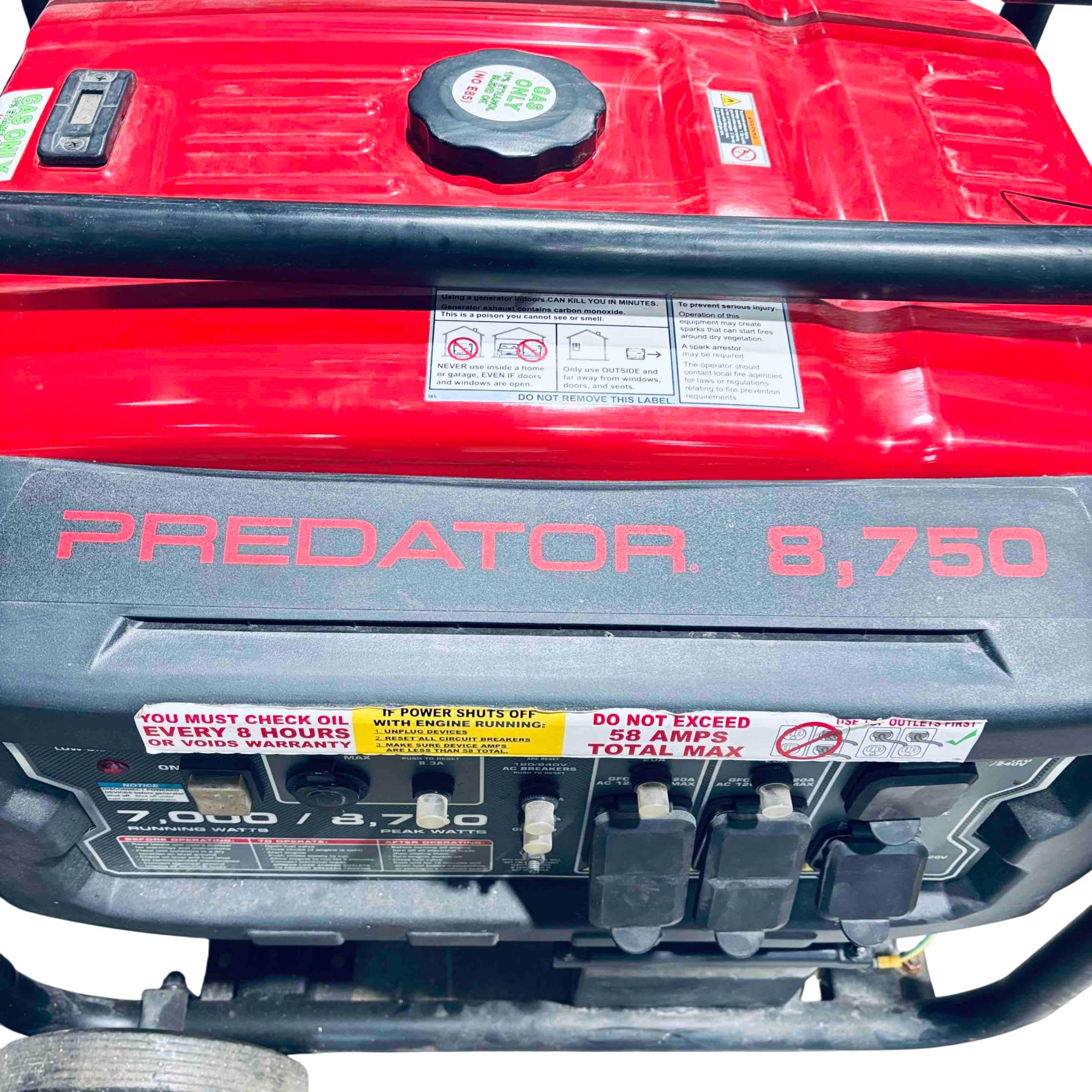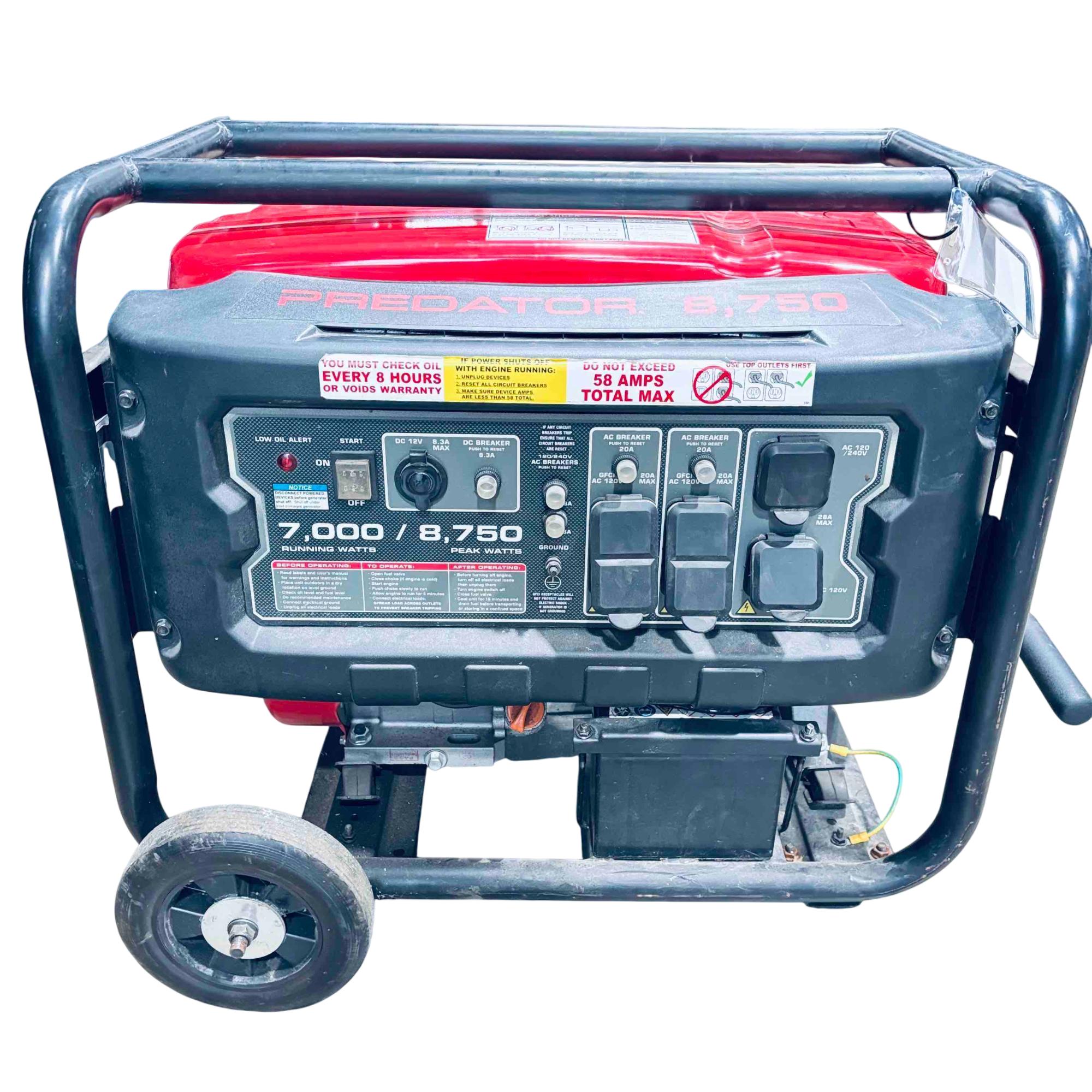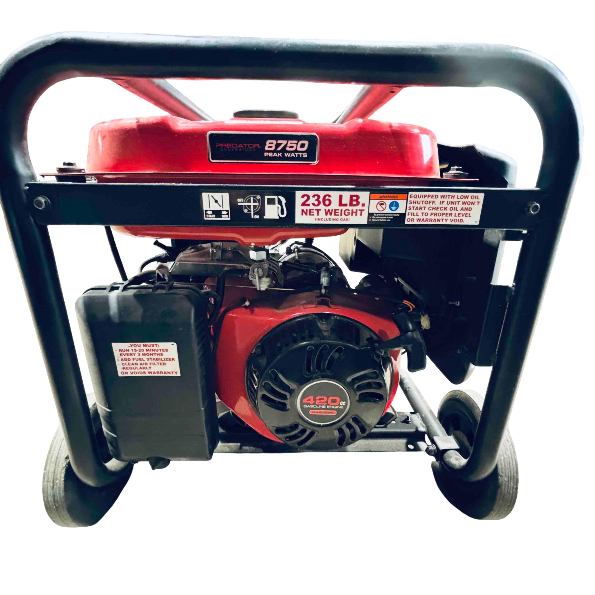 Experience reliable, high-power performance with the Predator 8750 portable generator, boasting a robust 420cc gasoline engine. This generator delivers 8750 peak watts and 7000 running watts, equipped with multiple outlets and essential safety features like low oil shutdown and overload protection—perfect for job sites, home backup, or recreational use.
