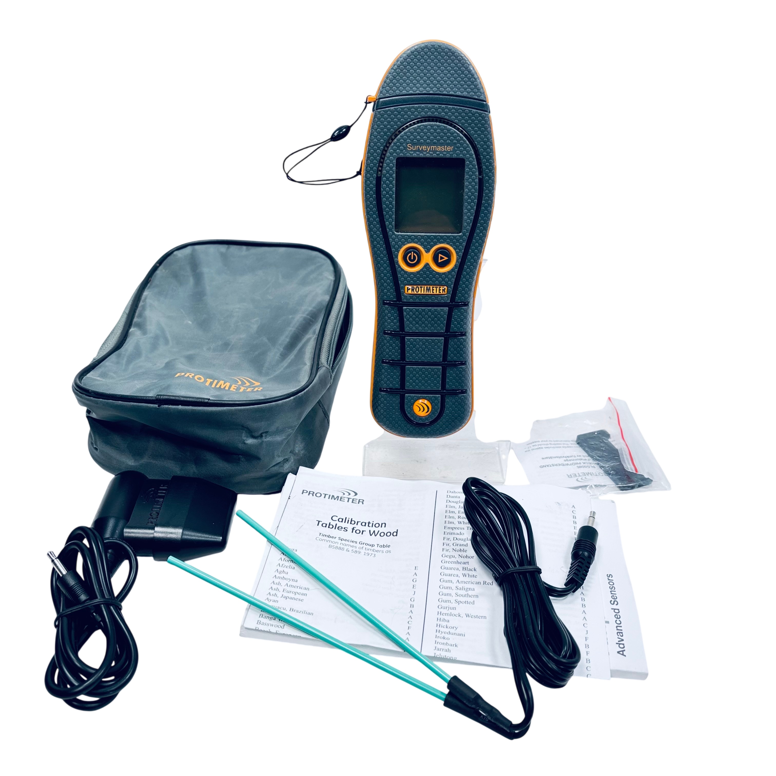 The Protimeter Surveymaster Moisture Meter (Model POL5365) is a professional-grade tool designed for accurate moisture measurement in wood and other building materials. Featuring digital % WME (Wood Moisture Equivalent) readings, this meter comes complete with sensor probes, a charger, calibration tables, and a protective carrying case. Its ergonomic design and reliable performance make it ideal for surveyors, contractors, and woodworkers who require precise moisture detection to prevent damage and ensure quality. Compact and lightweight, it is easy to carry and use on-site for efficient moisture assessment.