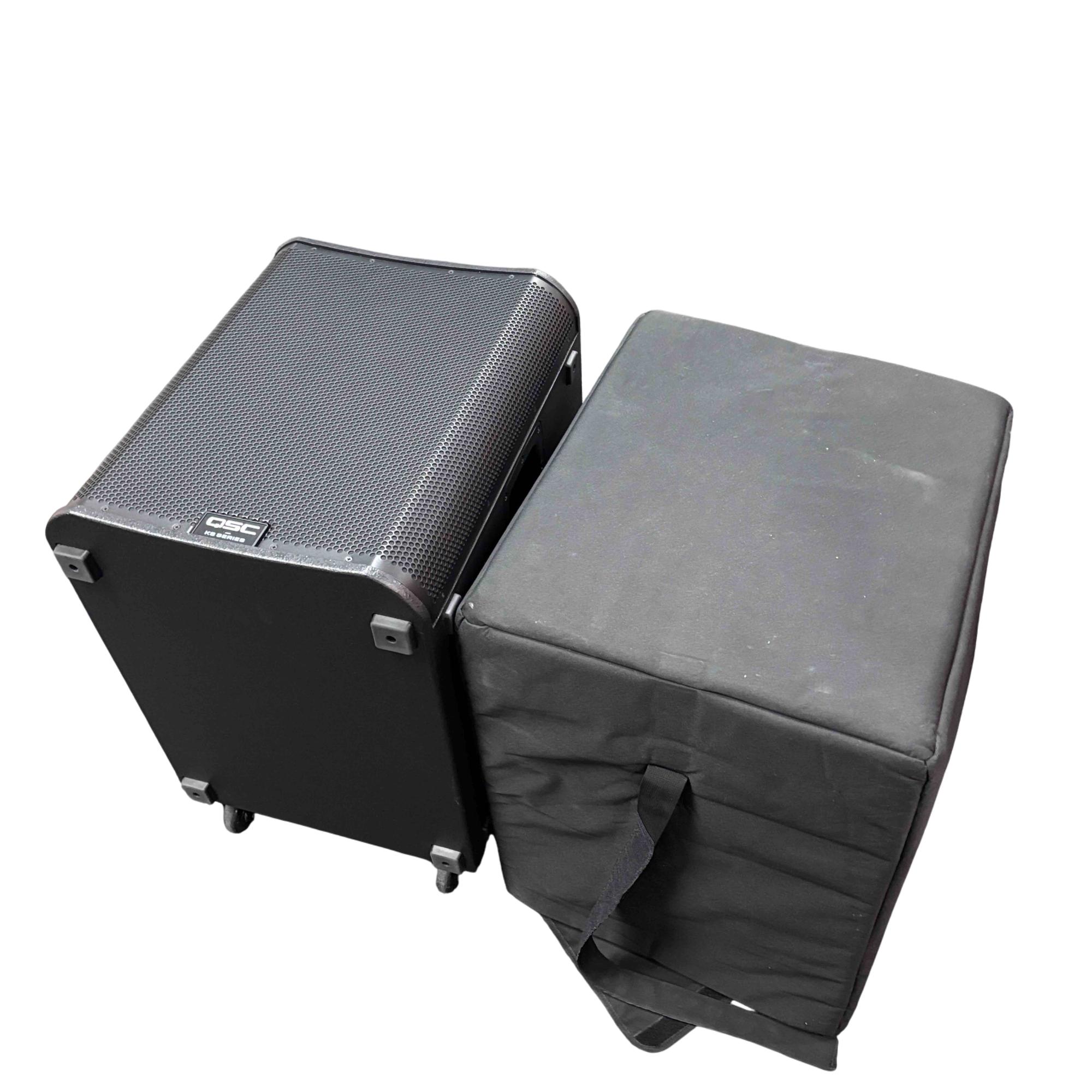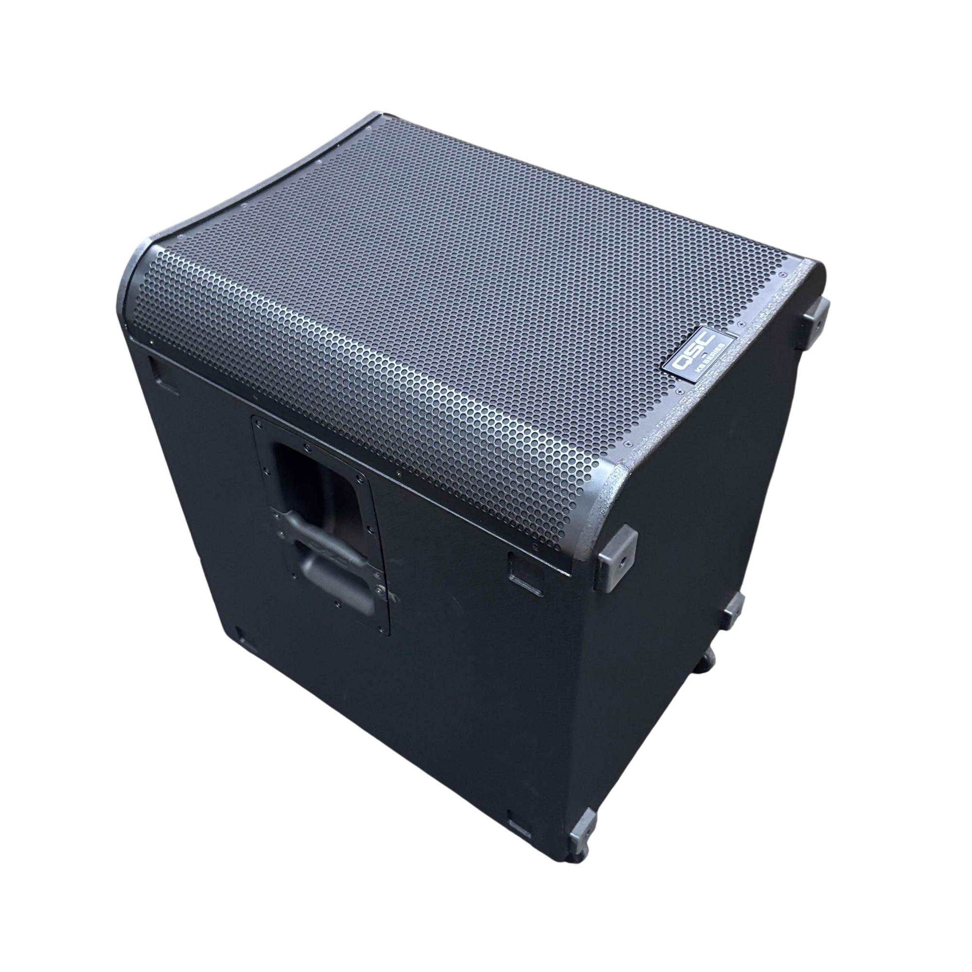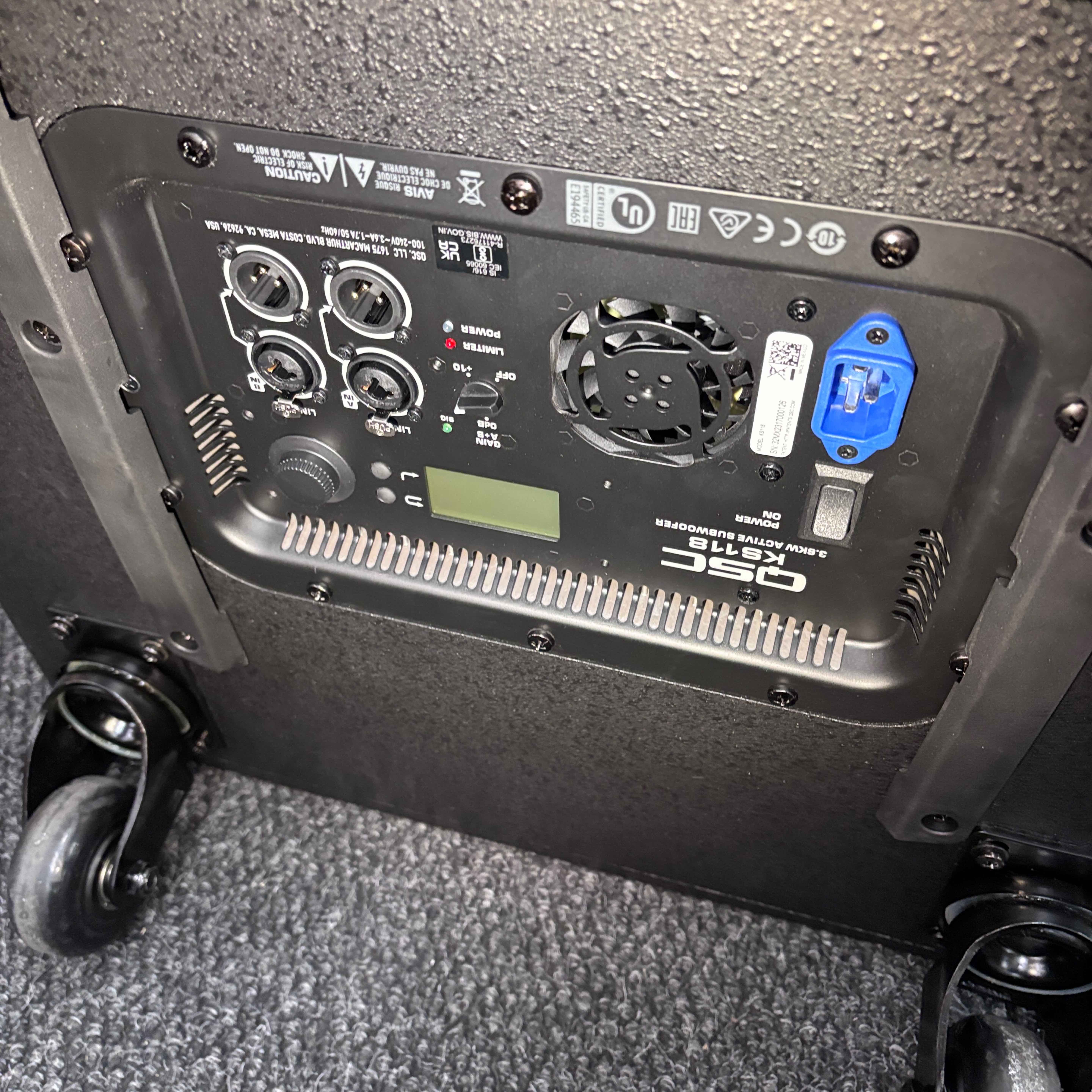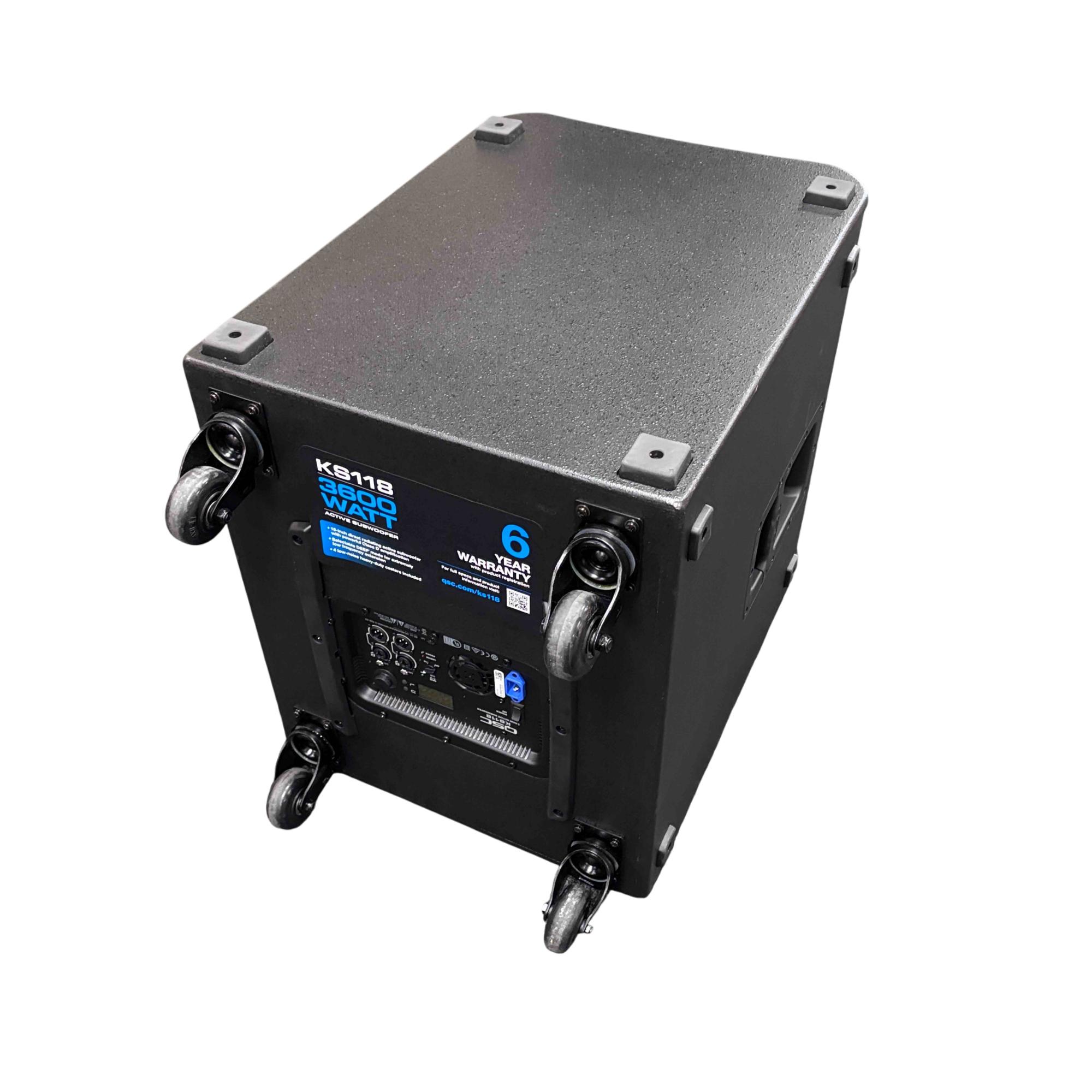 This QSC KS118 3,600W 18-inch powered active subwoofer delivers powerful low-frequency sound with Class-D amplification, ideal for professional audio applications. Featuring a robust design with integrated controls and high-quality components, it ensures precise bass response and reliable performance. The unit includes a durable black case with wheels for easy transport and setup in various environments.