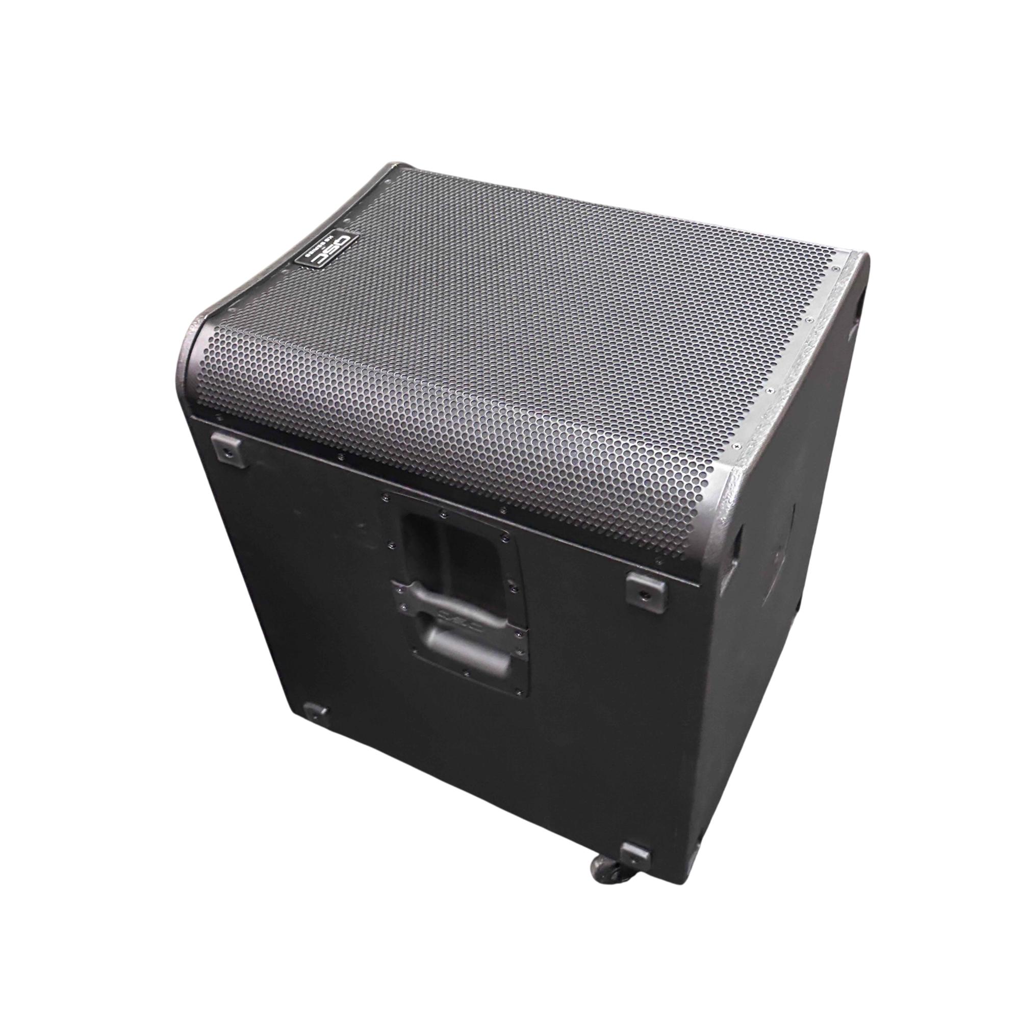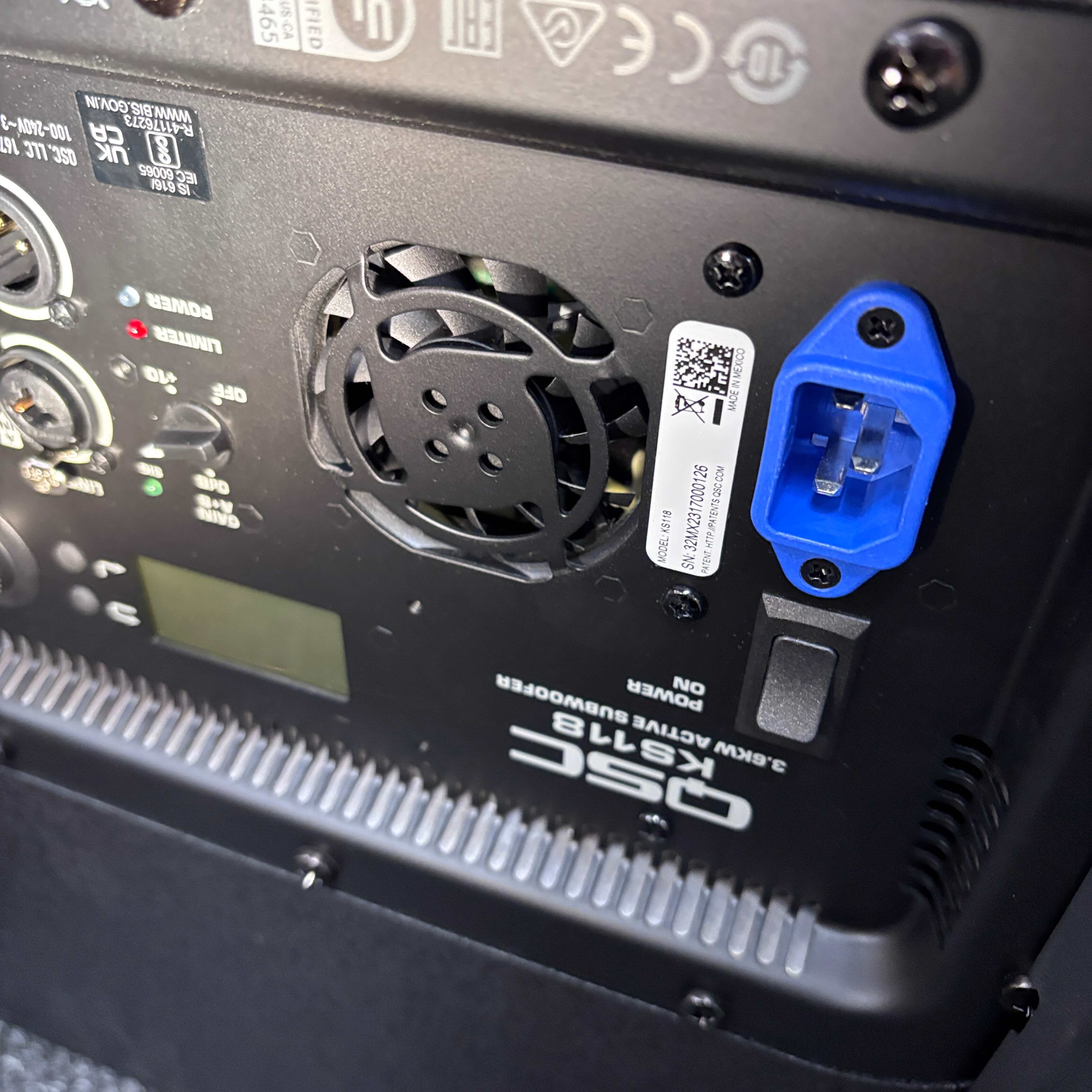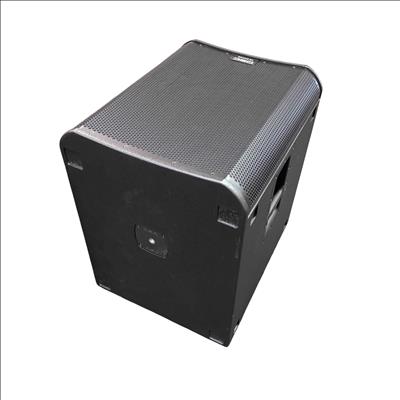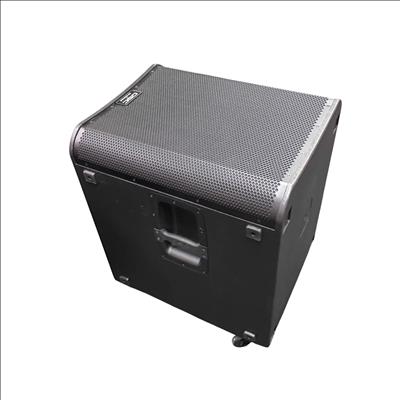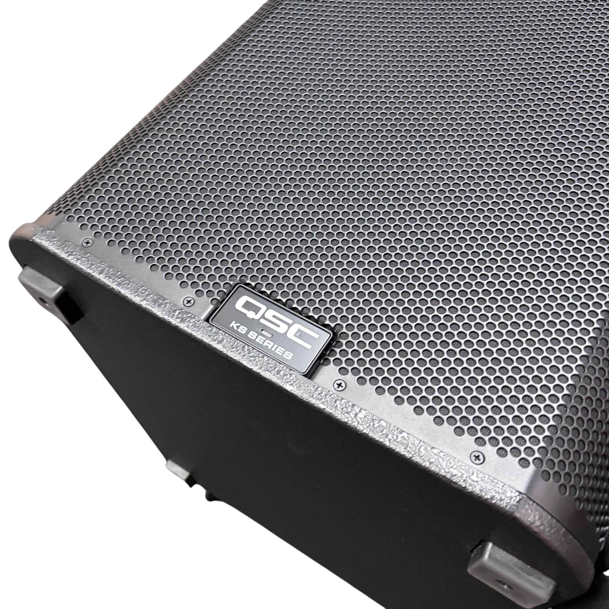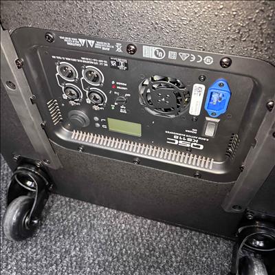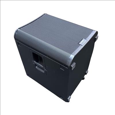 This QSC KS118 3,600W 18-inch powered active subwoofer delivers powerful low-frequency sound with Class-D amplification, ideal for professional audio applications. Featuring a robust design with integrated controls and high-quality components, it ensures precise bass response and reliable performance. The unit includes a durable black case with wheels for easy transport and setup in various environments.
