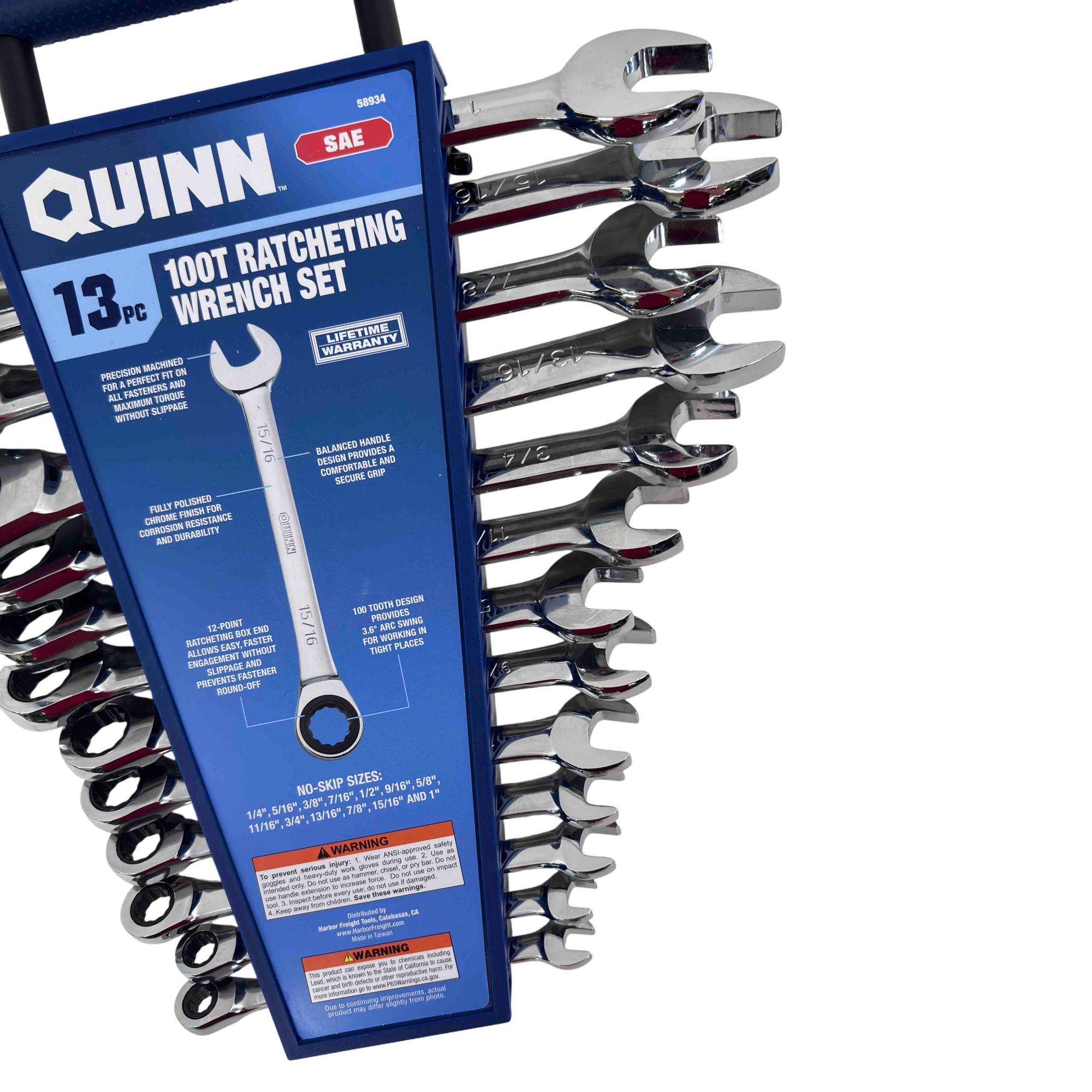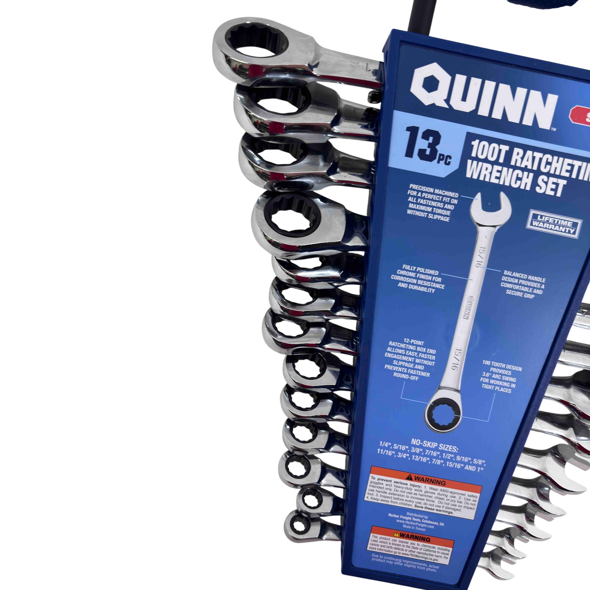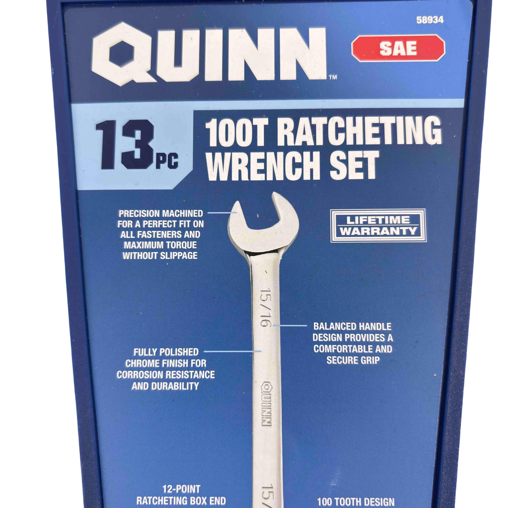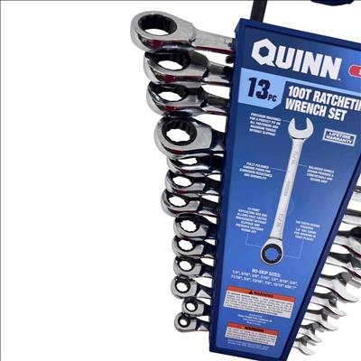 Upgrade your tool kit with the Quinn 13-piece SAE 100T Ratcheting Wrench Set, designed for both professionals and avid DIYers. Featuring precision-machined, fully polished chrome wrenches for corrosion resistance and durability, each wrench has a 100-tooth ratcheting mechanism and a comfortable, balanced handle for maximum torque without slippage. With a complete range of no-skip sizes from 1/4" to 1", this set promises reliable performance and a lifetime warranty.
