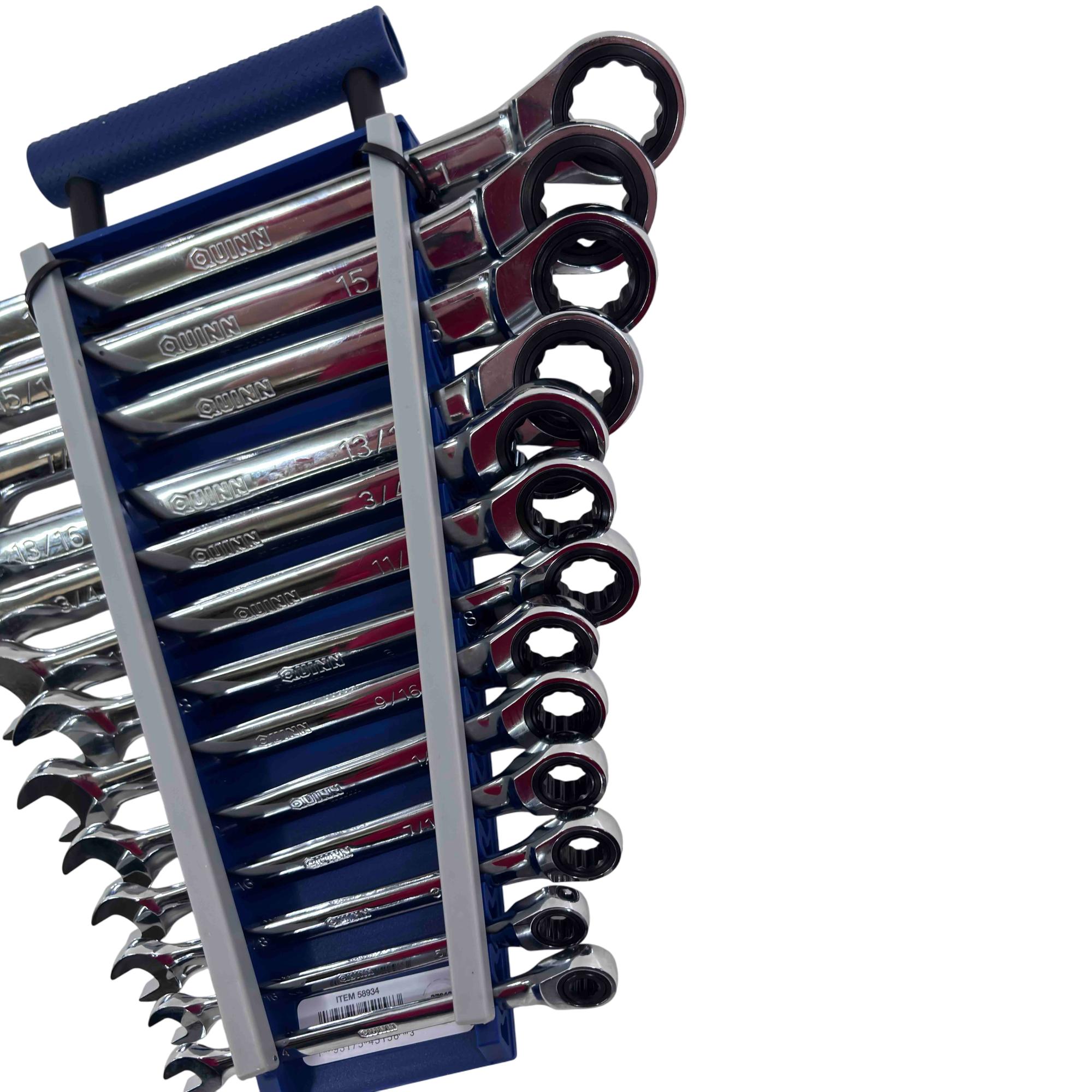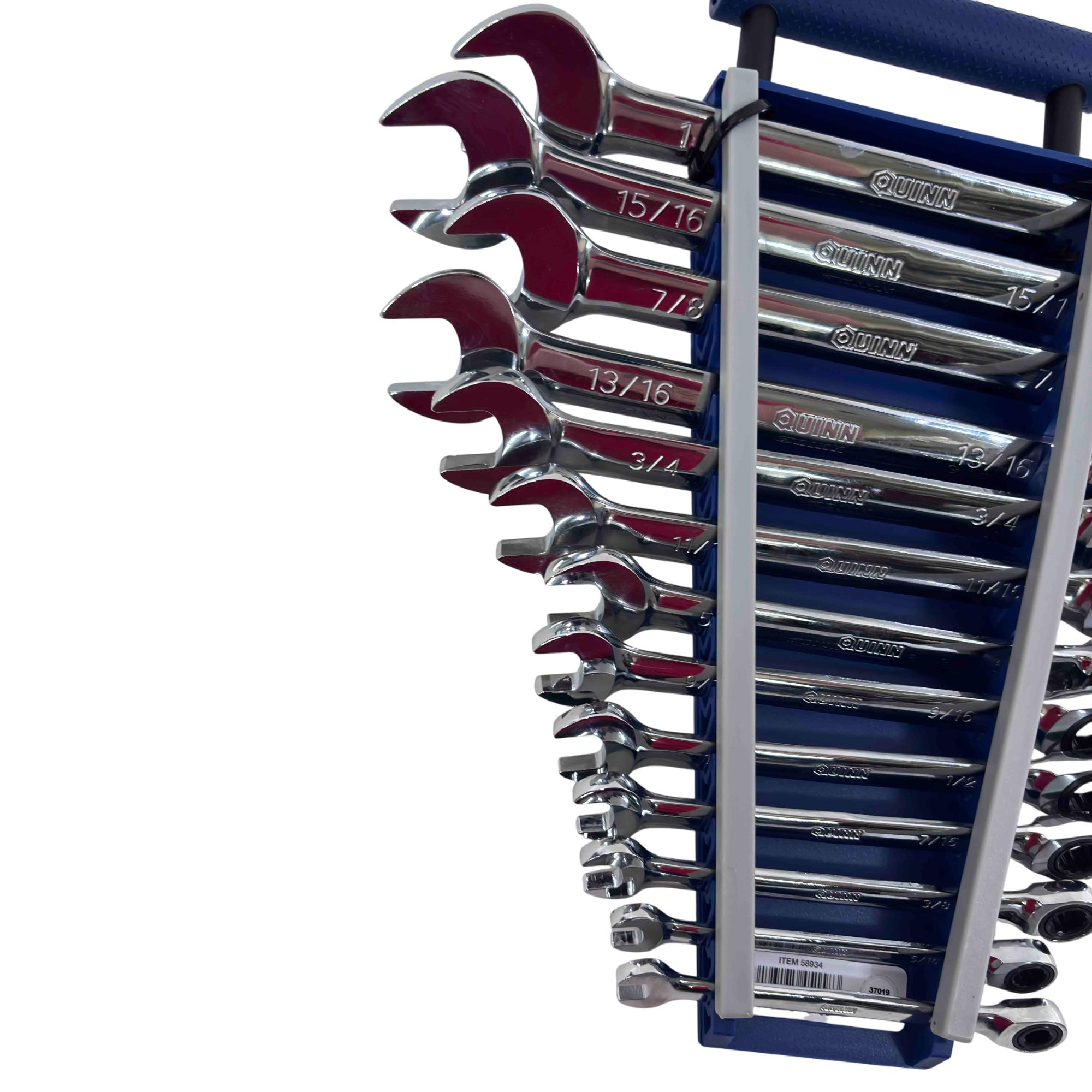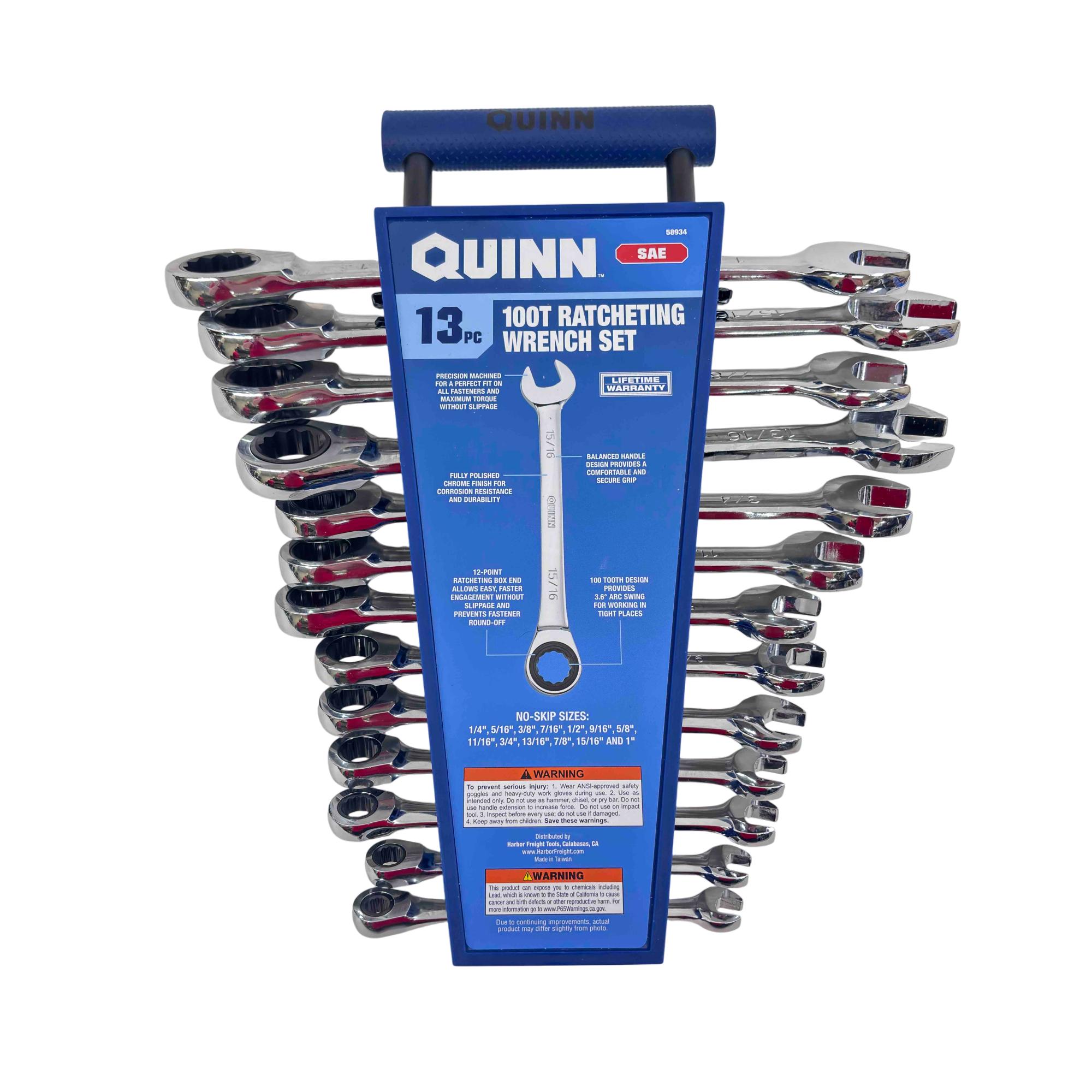 Upgrade your tool kit with the Quinn 13-piece SAE 100T Ratcheting Wrench Set, designed for both professionals and avid DIYers. Featuring precision-machined, fully polished chrome wrenches for corrosion resistance and durability, each wrench has a 100-tooth ratcheting mechanism and a comfortable, balanced handle for maximum torque without slippage. With a complete range of no-skip sizes from 1/4" to 1", this set promises reliable performance and a lifetime warranty.