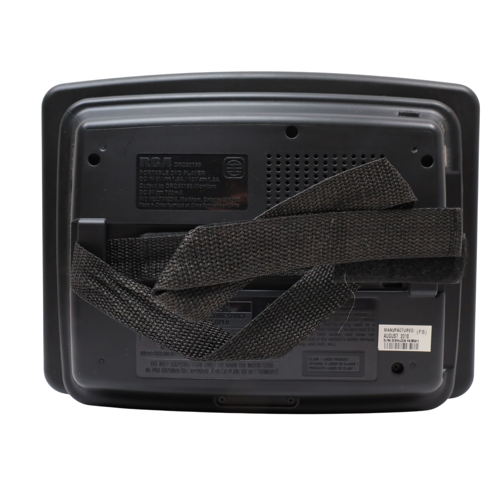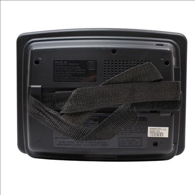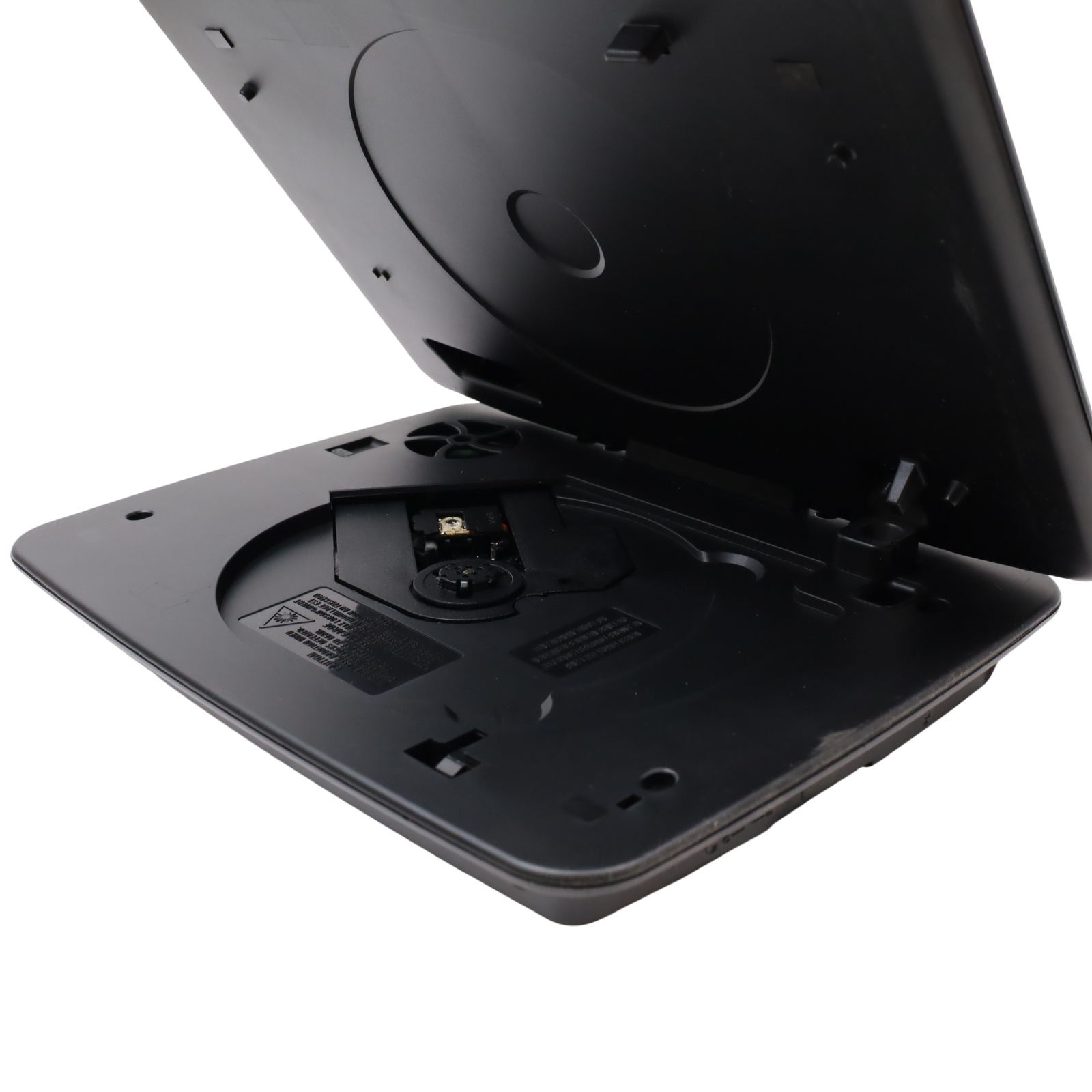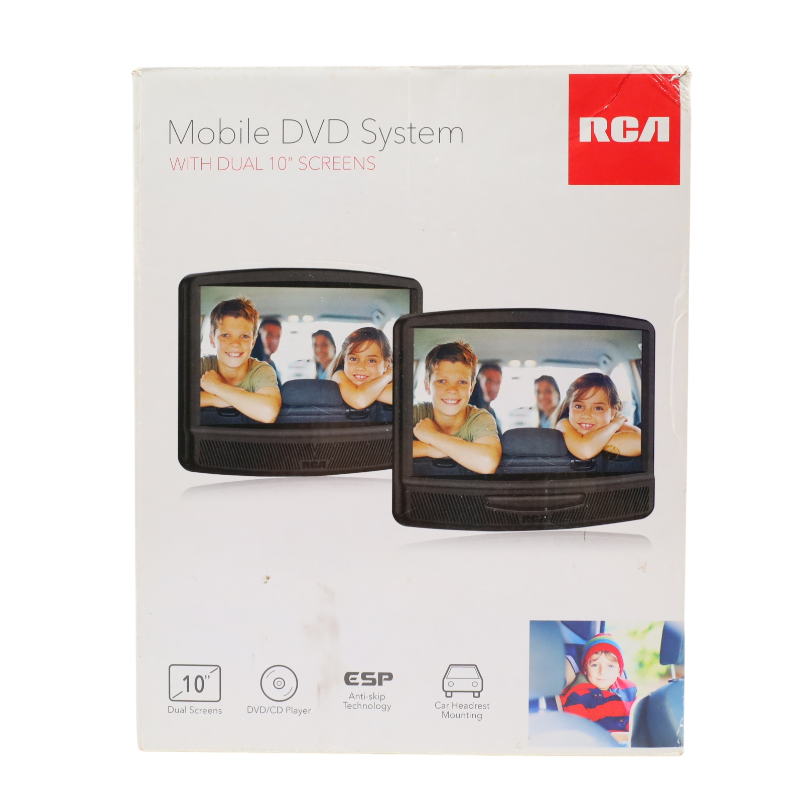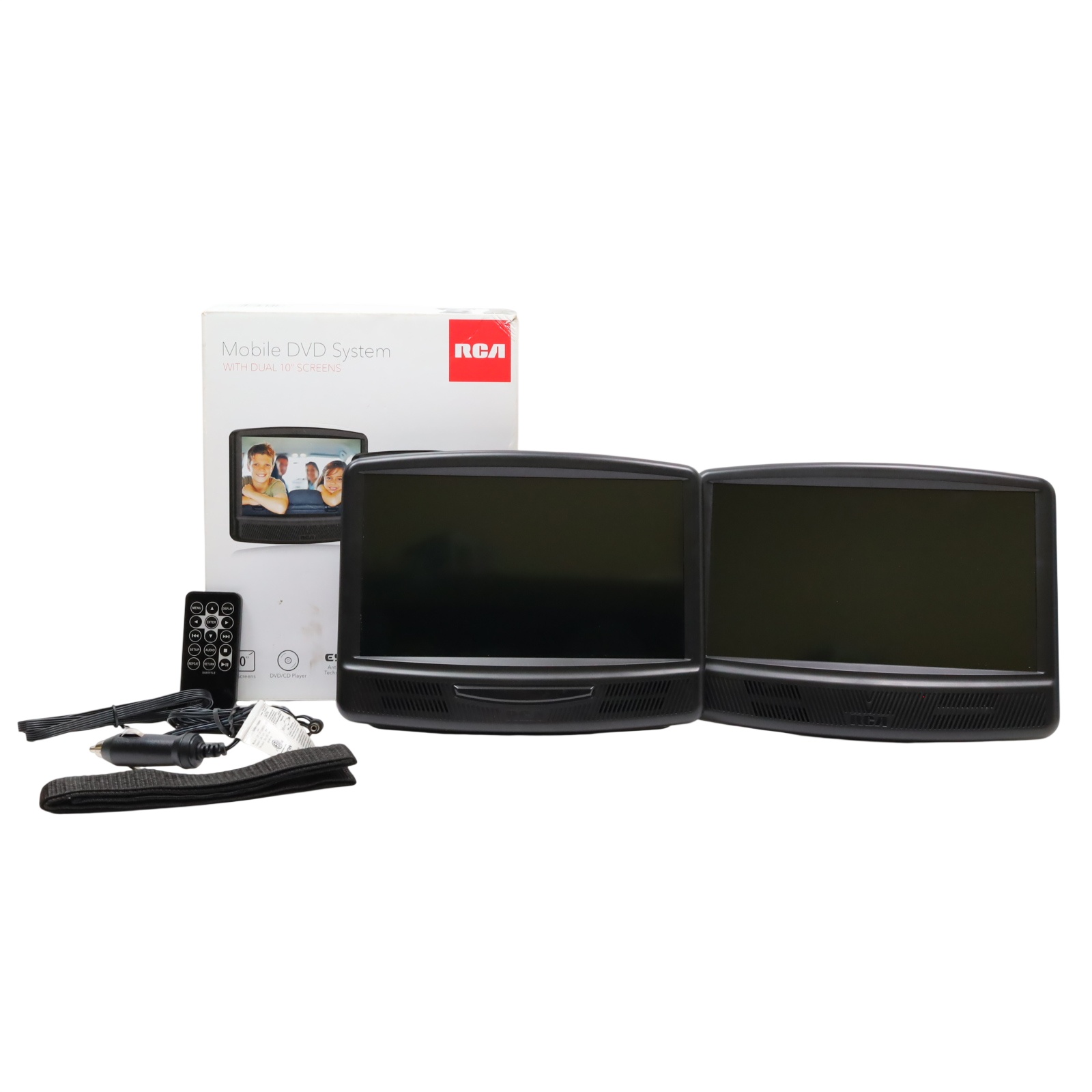 A dual screen portable DVD player equipped with two 10-inch displays that support audio output through built-in speakers or headphone jacks for private listening. A USB cable connects the units to enable dual screen playback synchronization, while headrest mounting straps are included to secure the devices to vehicle seats.