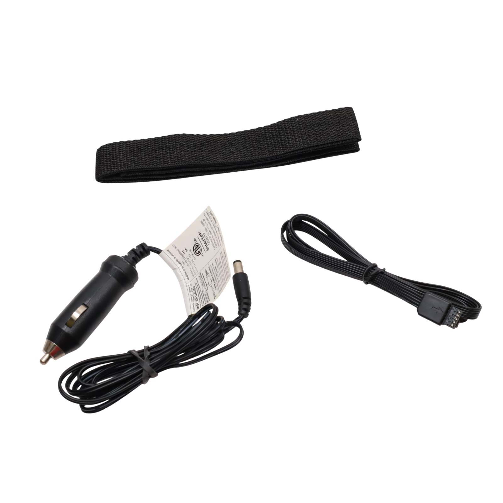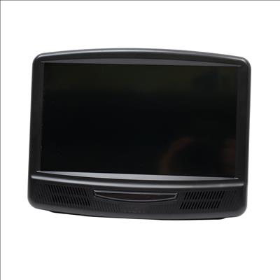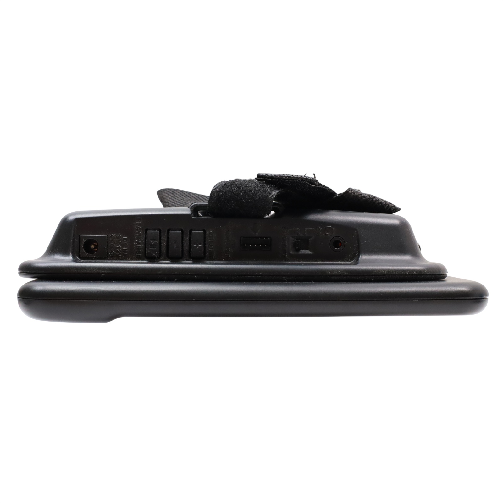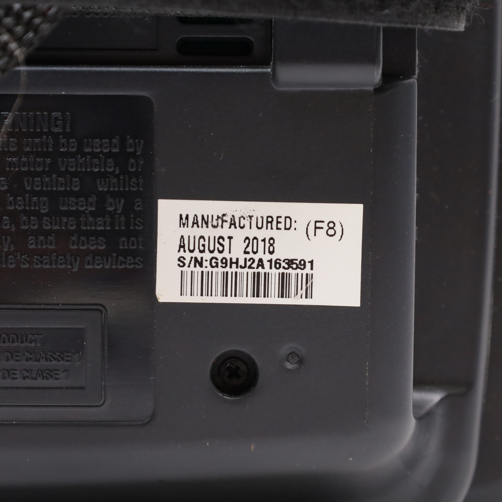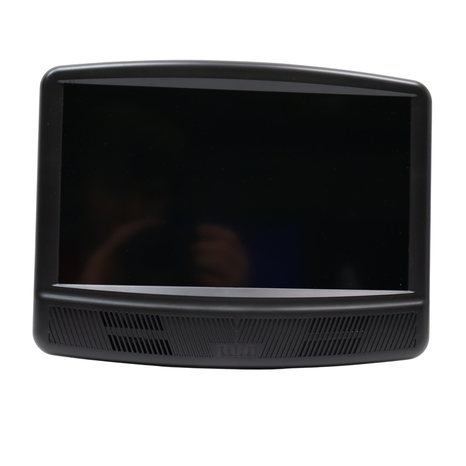 A dual screen portable DVD player equipped with two 10-inch displays that support audio output through built-in speakers or headphone jacks for private listening. A USB cable connects the units to enable dual screen playback synchronization, while headrest mounting straps are included to secure the devices to vehicle seats.