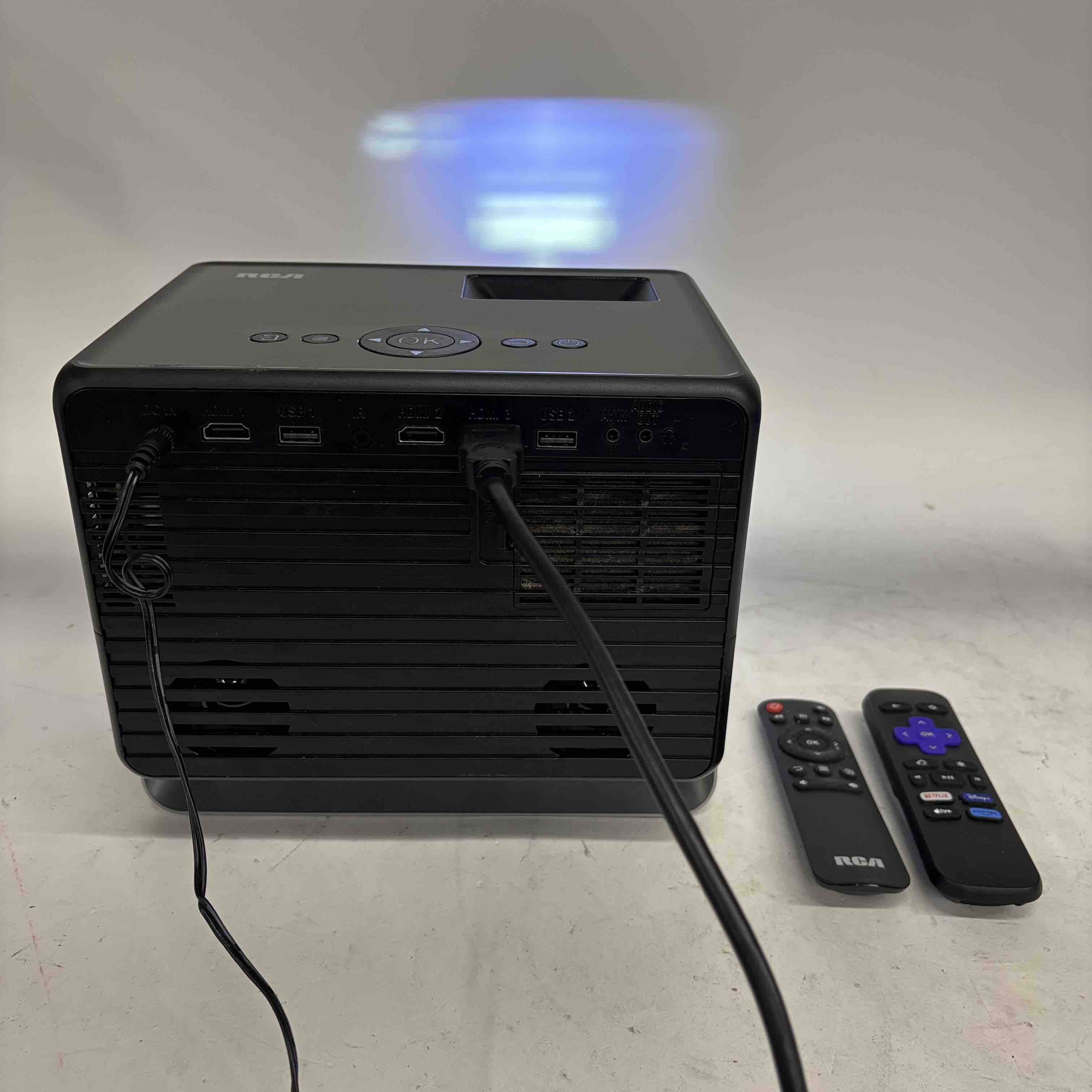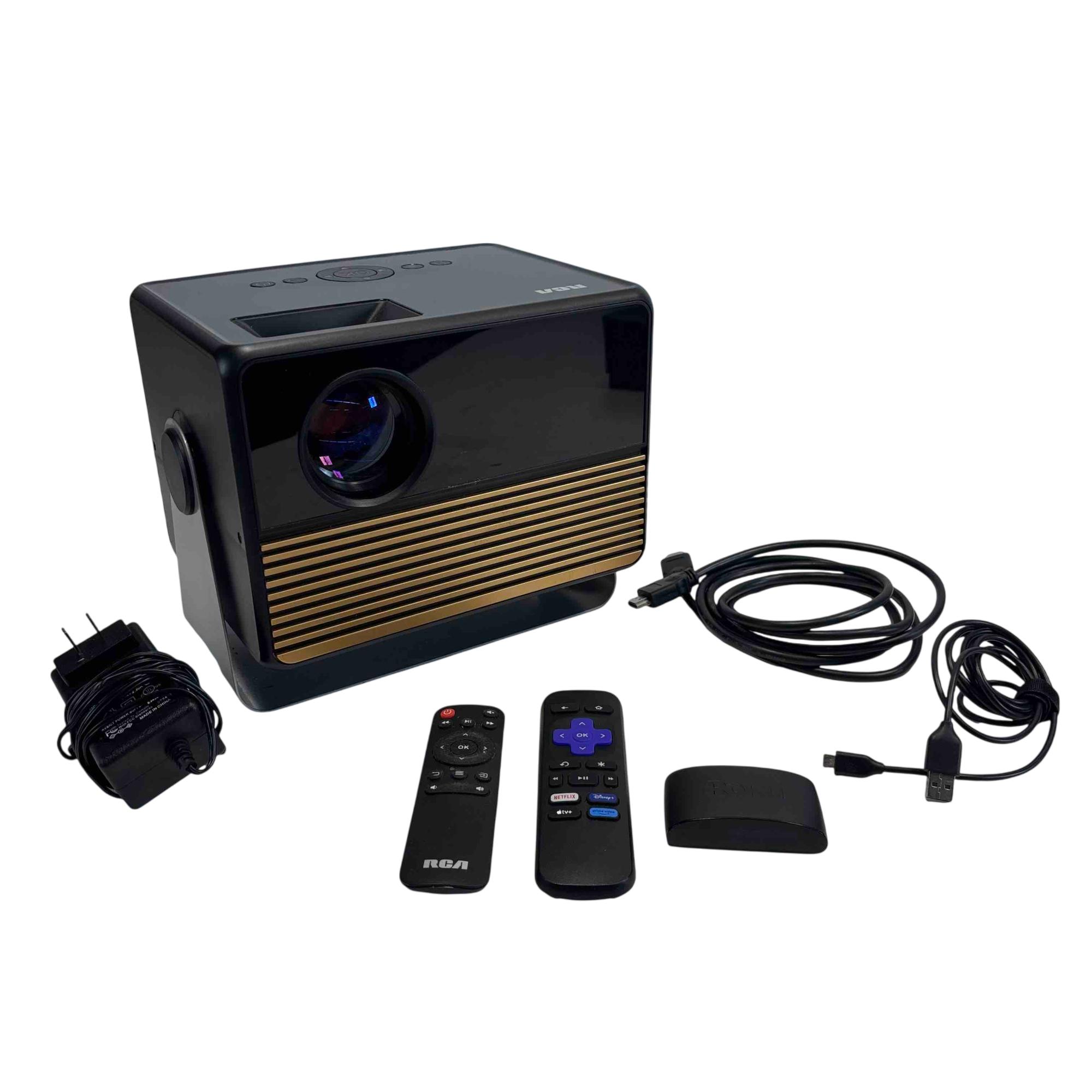 Enjoy cinematic experiences at home with this RCA projector, featuring HDMI and USB connectivity for versatile media playback. This projector comes with both an RCA-branded remote and a Roku remote, allowing seamless access to your favorite streaming services. With its stylish black design and gold accent, its perfect for movie nights, presentations, and family entertainment.