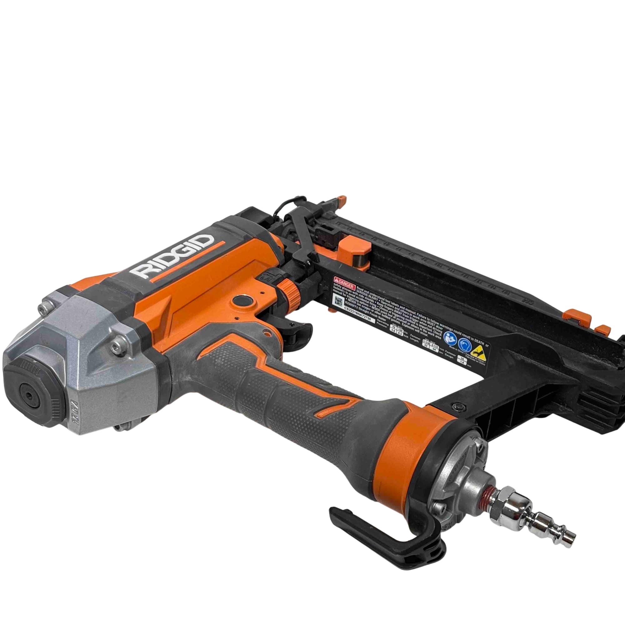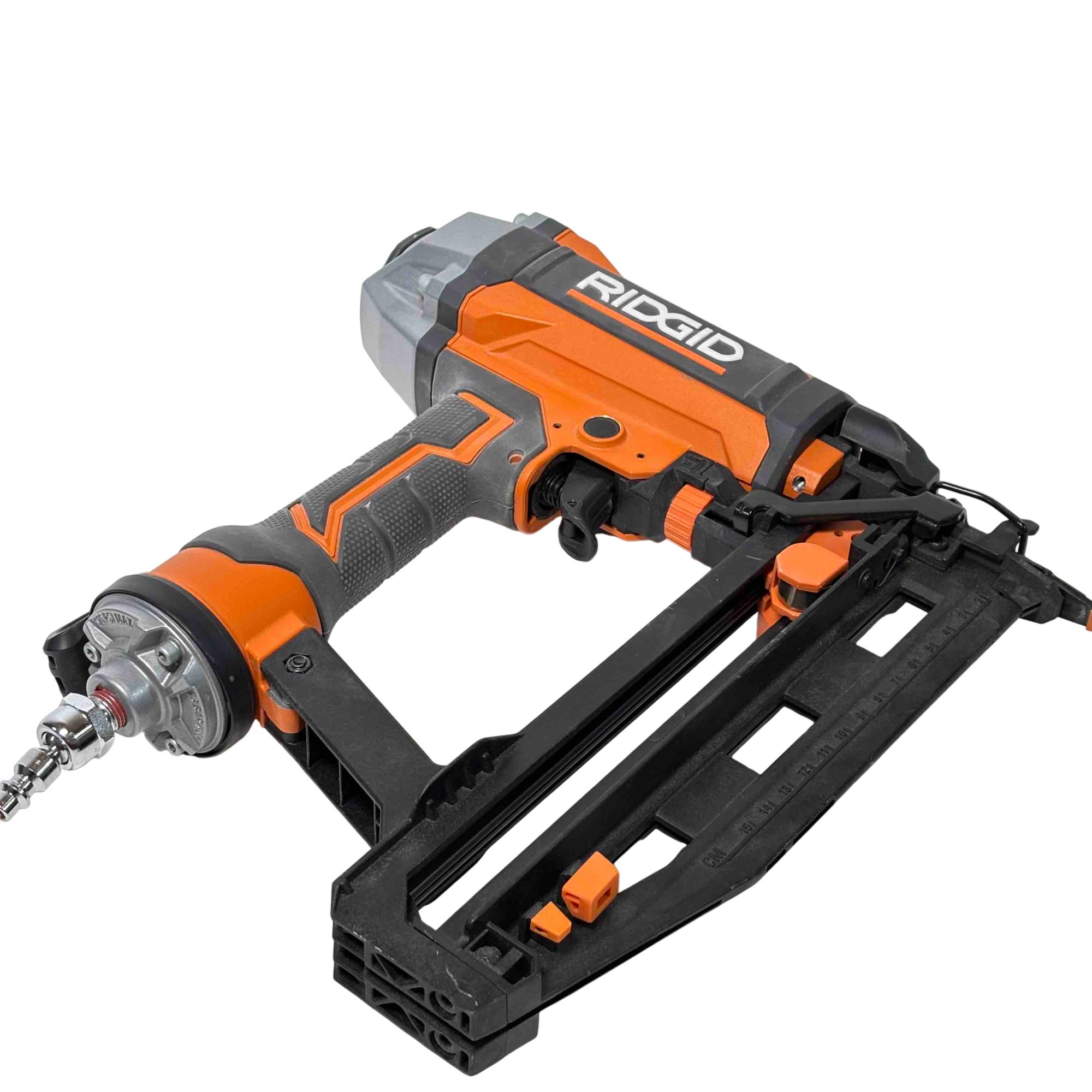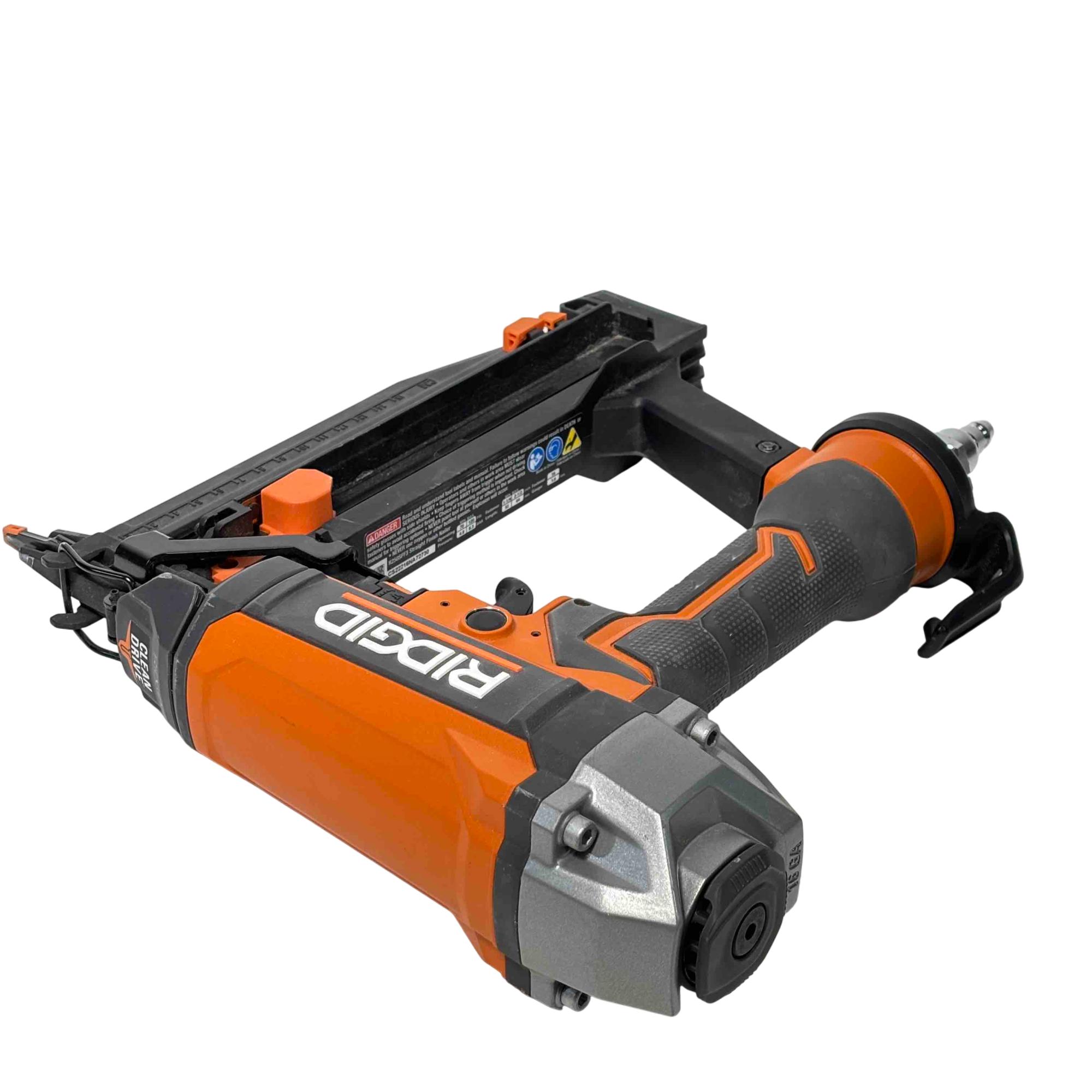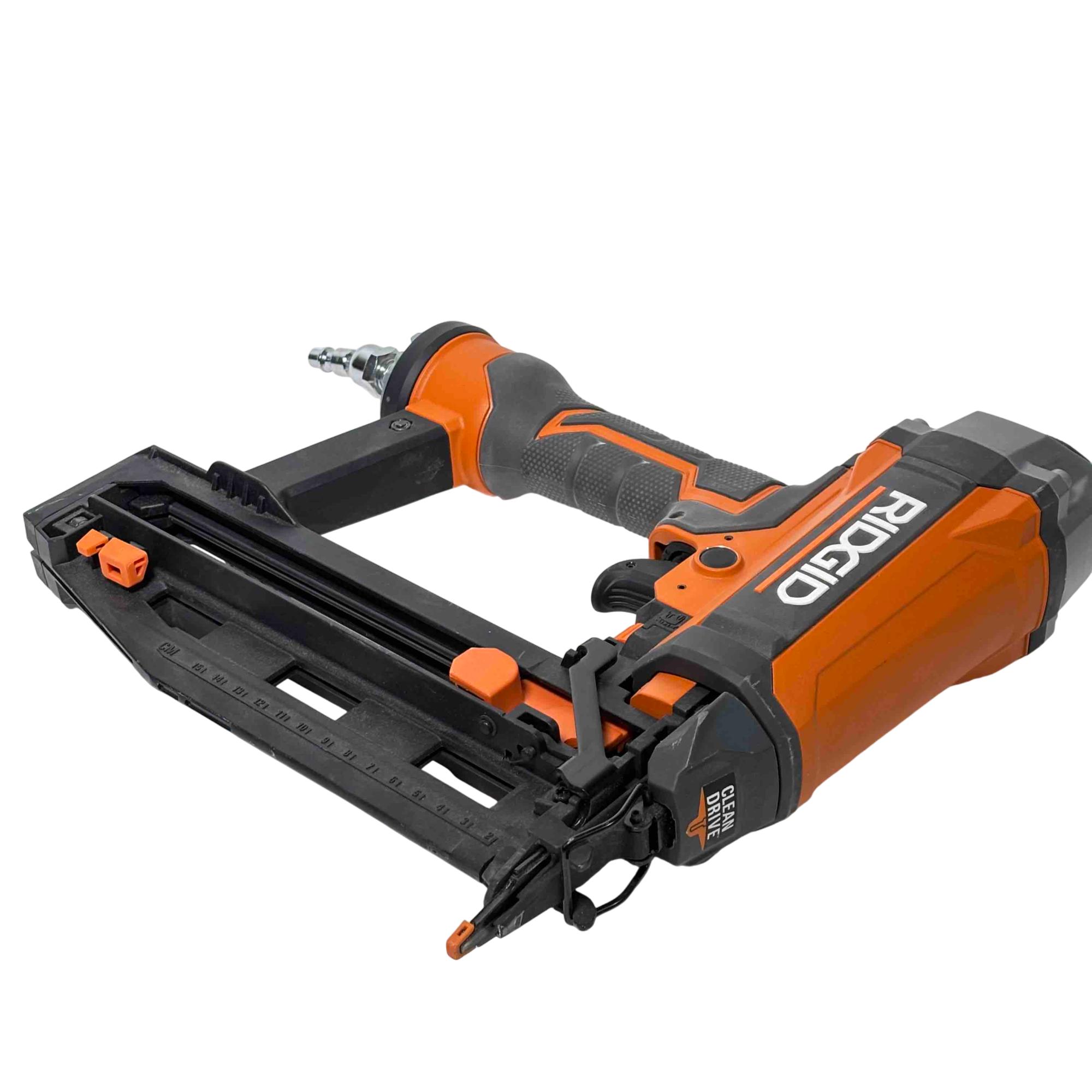 Get the job done efficiently with the RIDGID R150FSF3 16-Gauge Clean Drive Straight Finish Nailer. This durable pneumatic tool is designed for precision and power, perfect for finish carpenters, furniture builders, or anyone in need of a reliable nailing solution. With its sleek black and orange design and ergonomic handle, this nailer offers ease of use and comfort during extended periods of work.
