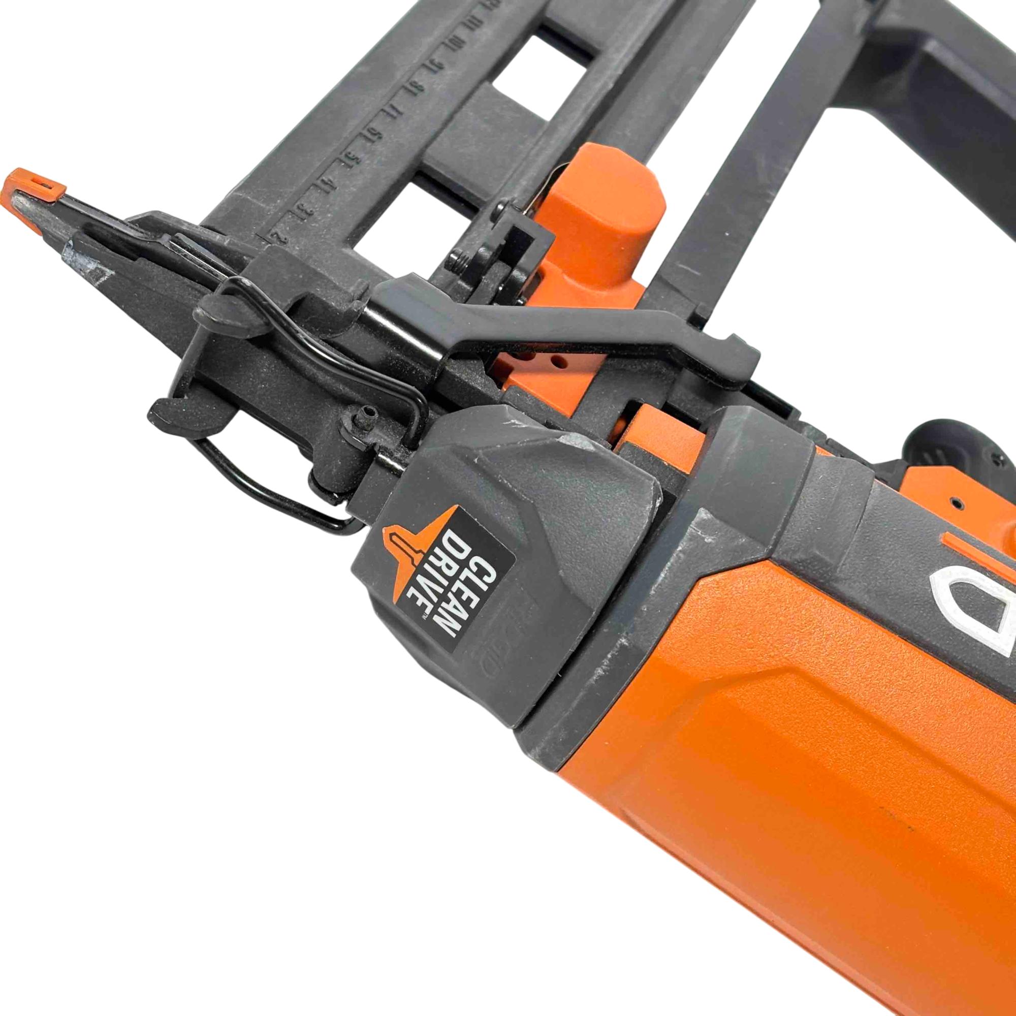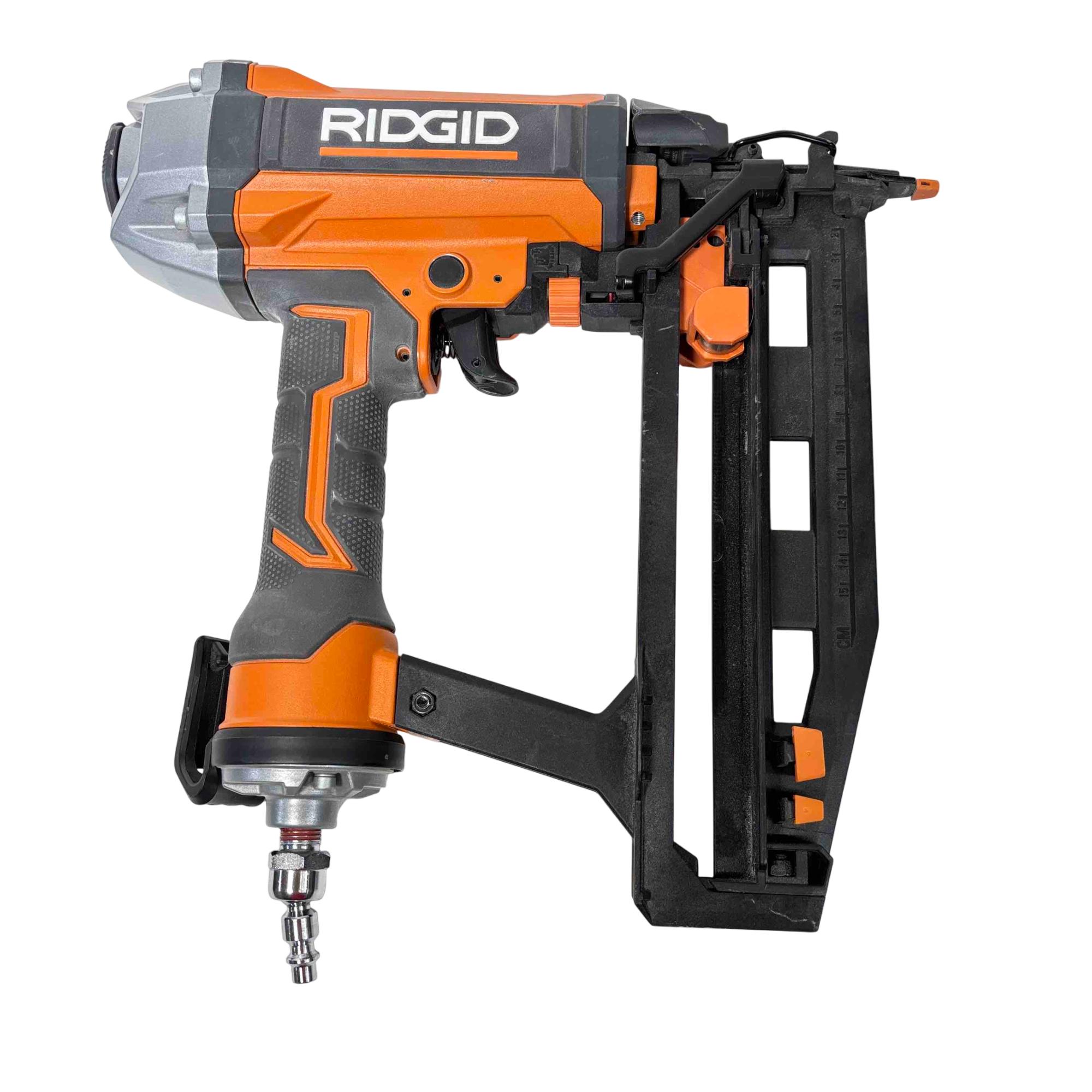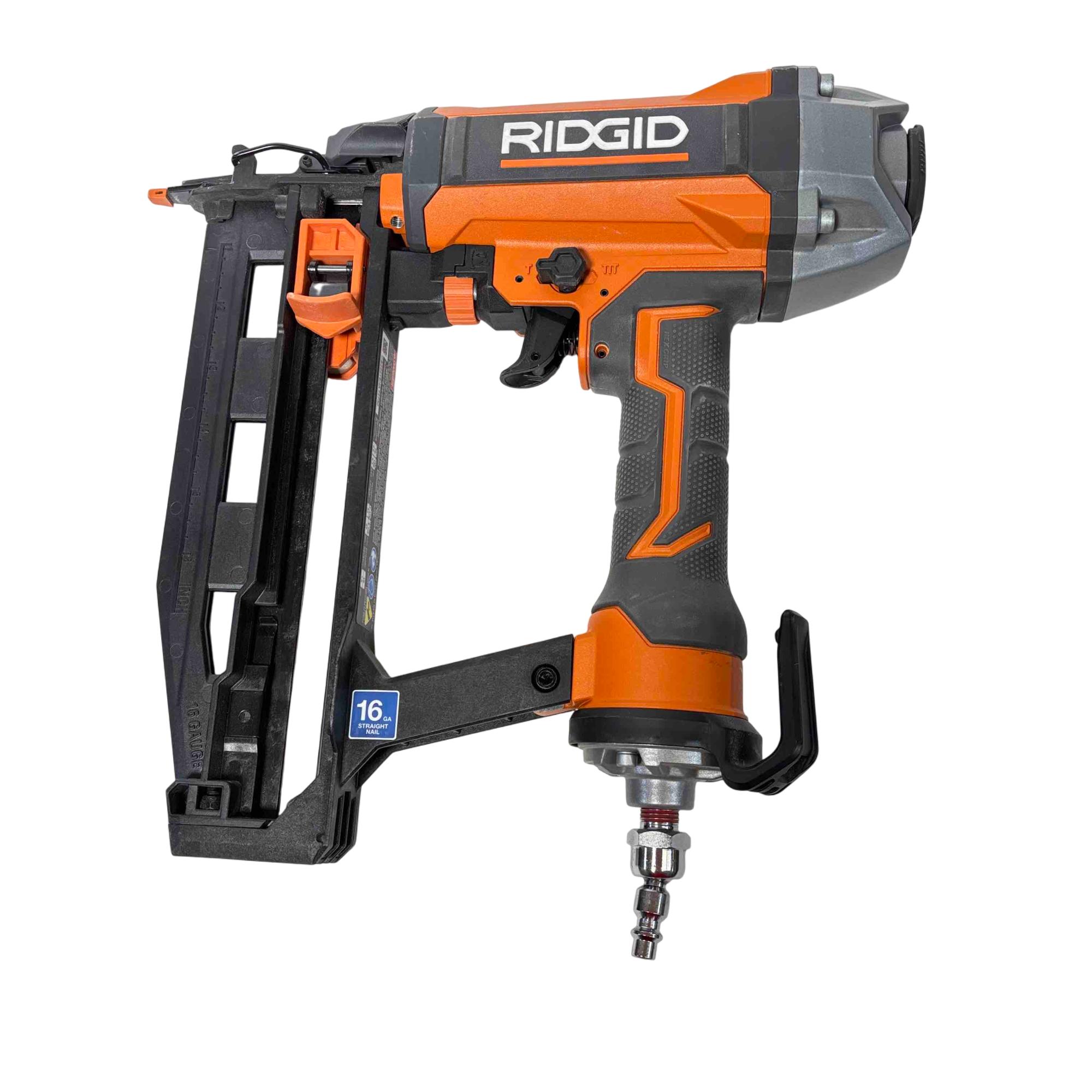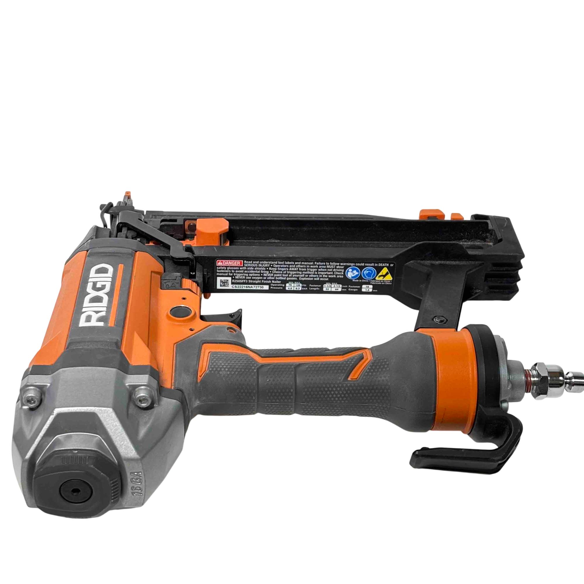 Get the job done efficiently with the RIDGID R150FSF3 16-Gauge Clean Drive Straight Finish Nailer. This durable pneumatic tool is designed for precision and power, perfect for finish carpenters, furniture builders, or anyone in need of a reliable nailing solution. With its sleek black and orange design and ergonomic handle, this nailer offers ease of use and comfort during extended periods of work.