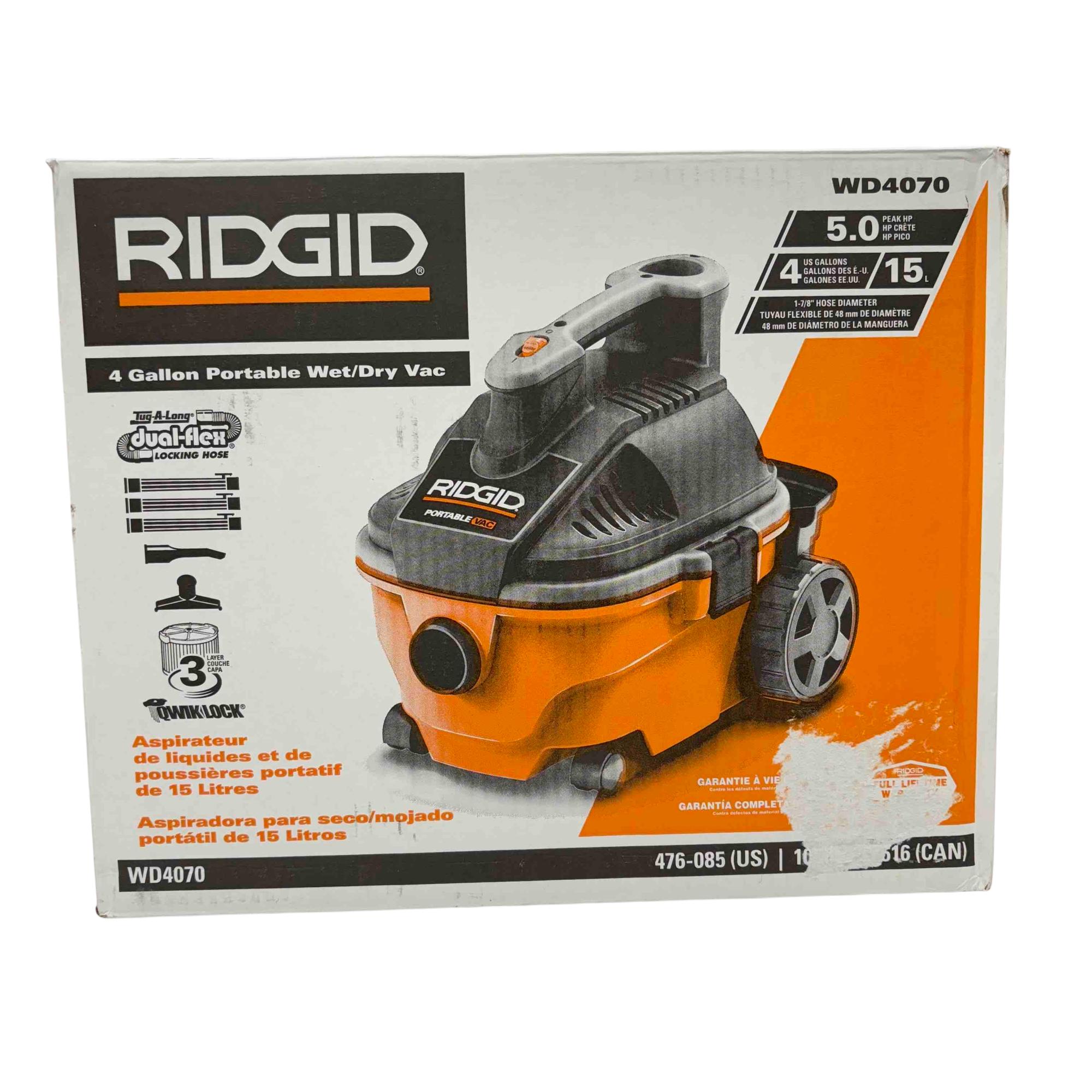 Unleash the power of clean with the RIDGID WD4070 4 Gallon Portable Wet/Dry Vacuum Cleaner. Equipped with a robust 5.0 Peak HP motor, this versatile vacuum tackles both wet and dry messes with ease. Its innovative Tug-A-Long Dual-Flex Locking Hose offers superior flexibility and reach, making it an indispensable tool for home or workshop cleanup.