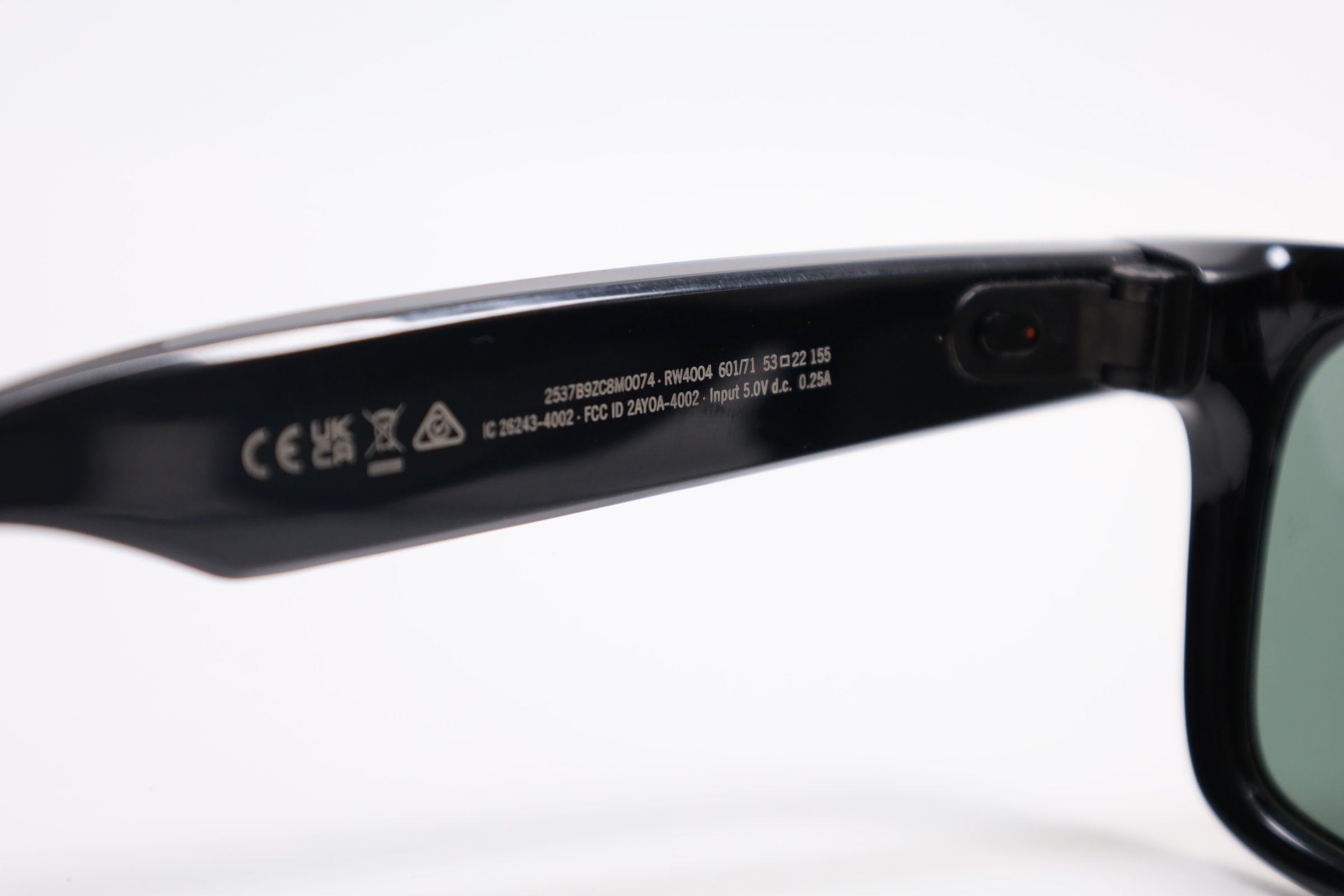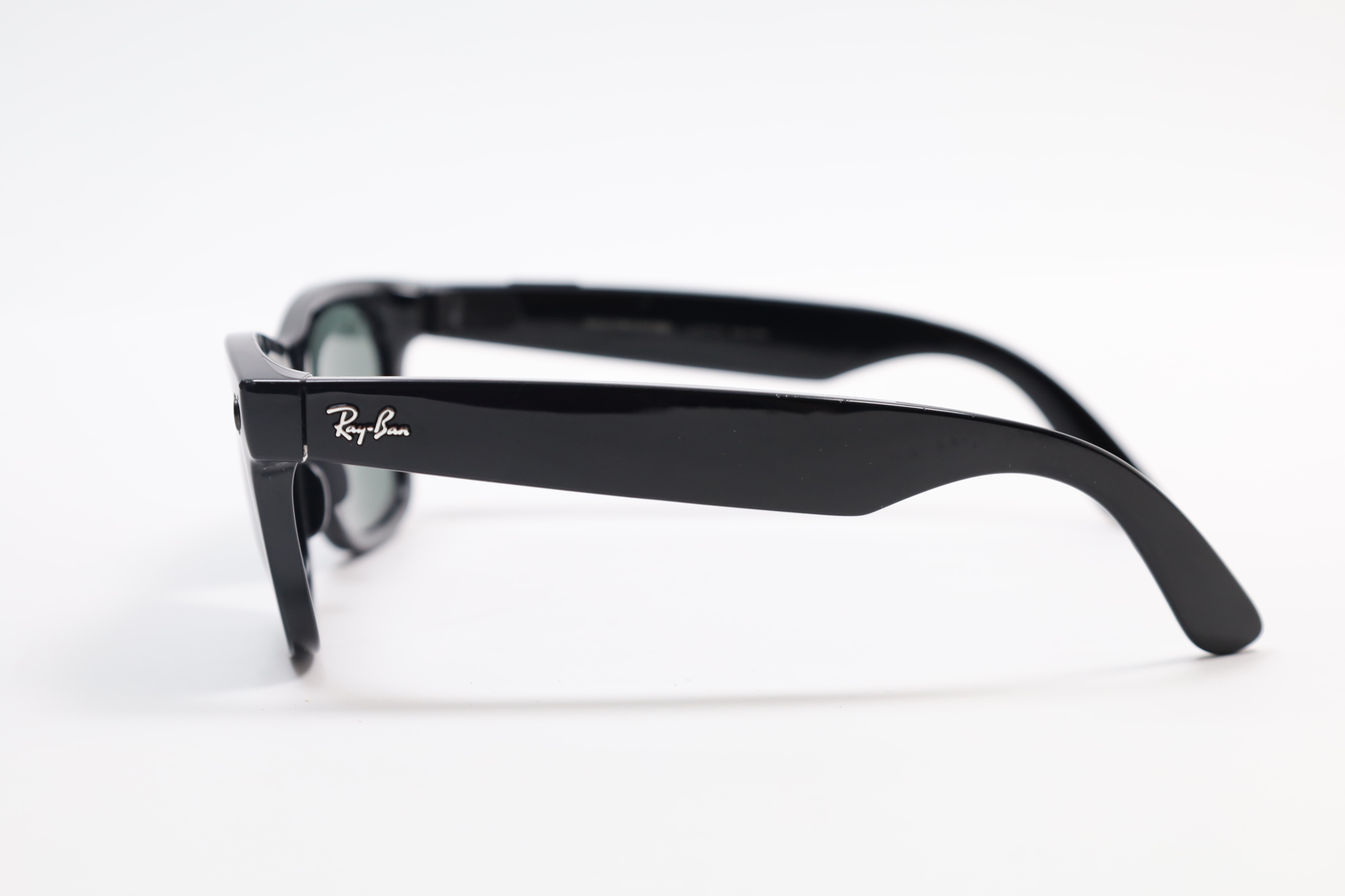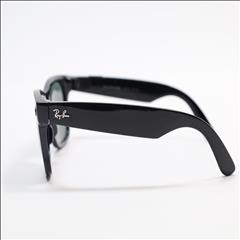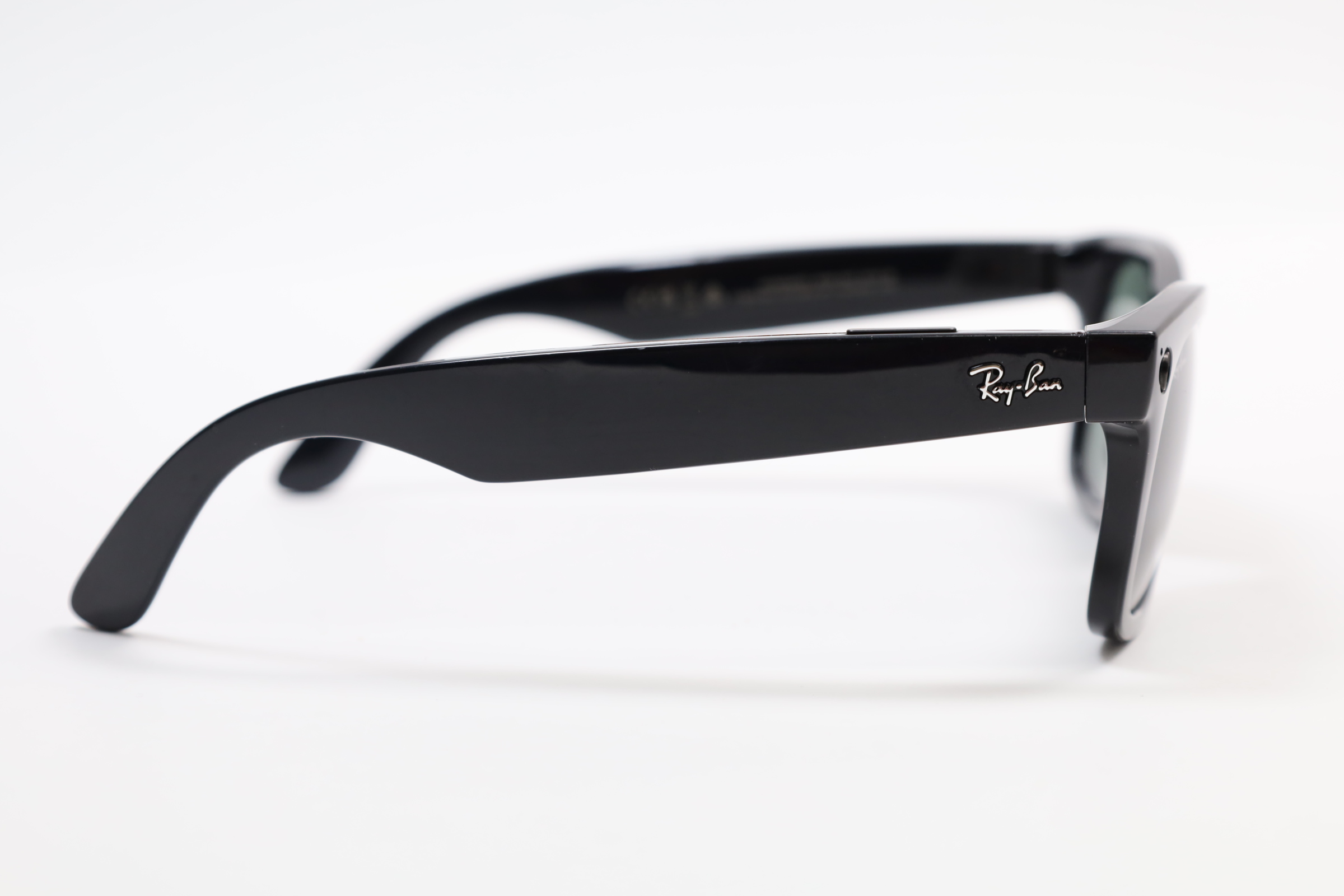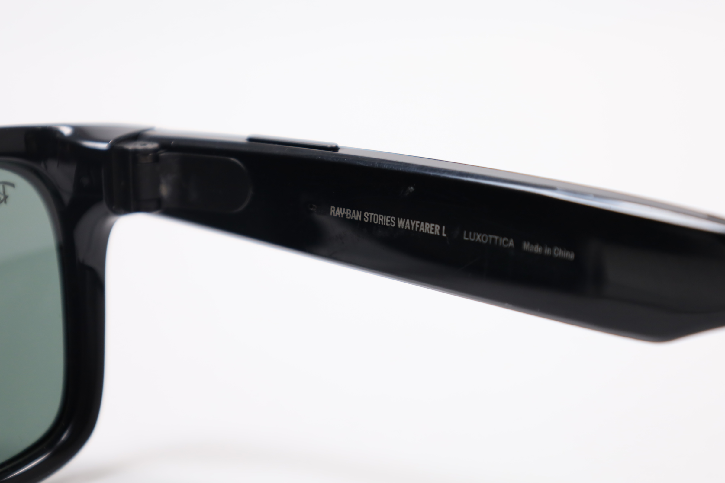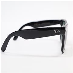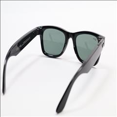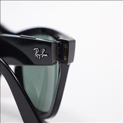 Introducing the Ray-Ban Stories Wayfarer Large RW4004 Smart Sunglasses, a modern twist on the classic Wayfarer design. These sunglasses feature G-15 green lenses and wearable technology that allows you to capture photos and videos, make phone calls, and listen to music. They offer glare protection, water resistance, smudge protection, and enhanced durability with a high-quality, scratch-resistant coating. The frame is made of plastic and the glasses come with a cleaning cloth and a hard case. Lens Width: 53 mm, Lens Height: 43.6 mm, Bridge Width: 22 mm, SportRx Frame Width (SFW): 141 mm, Temple Arm Length: 155 mm. Experience the perfect blend of style and technology with these smart sunglasses.