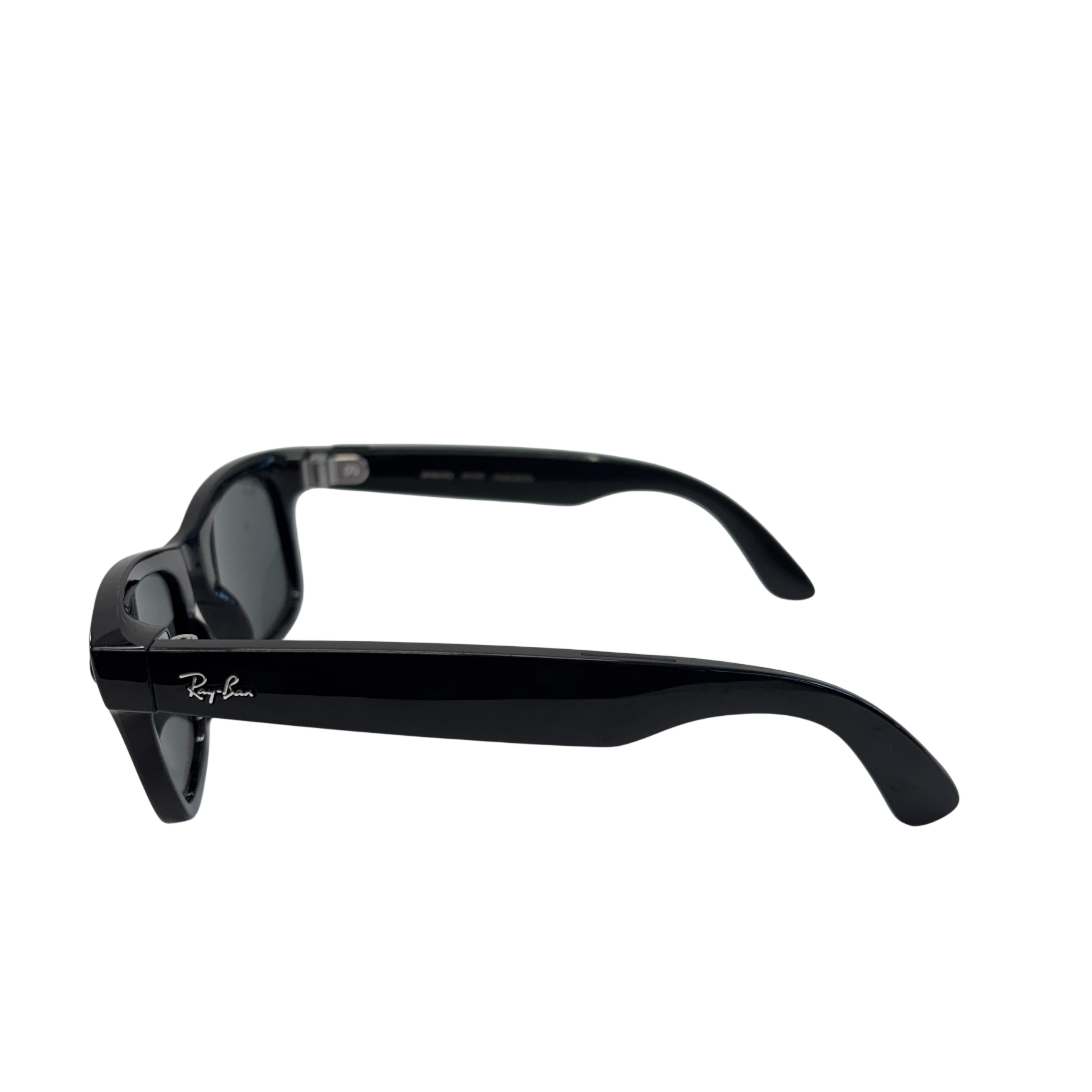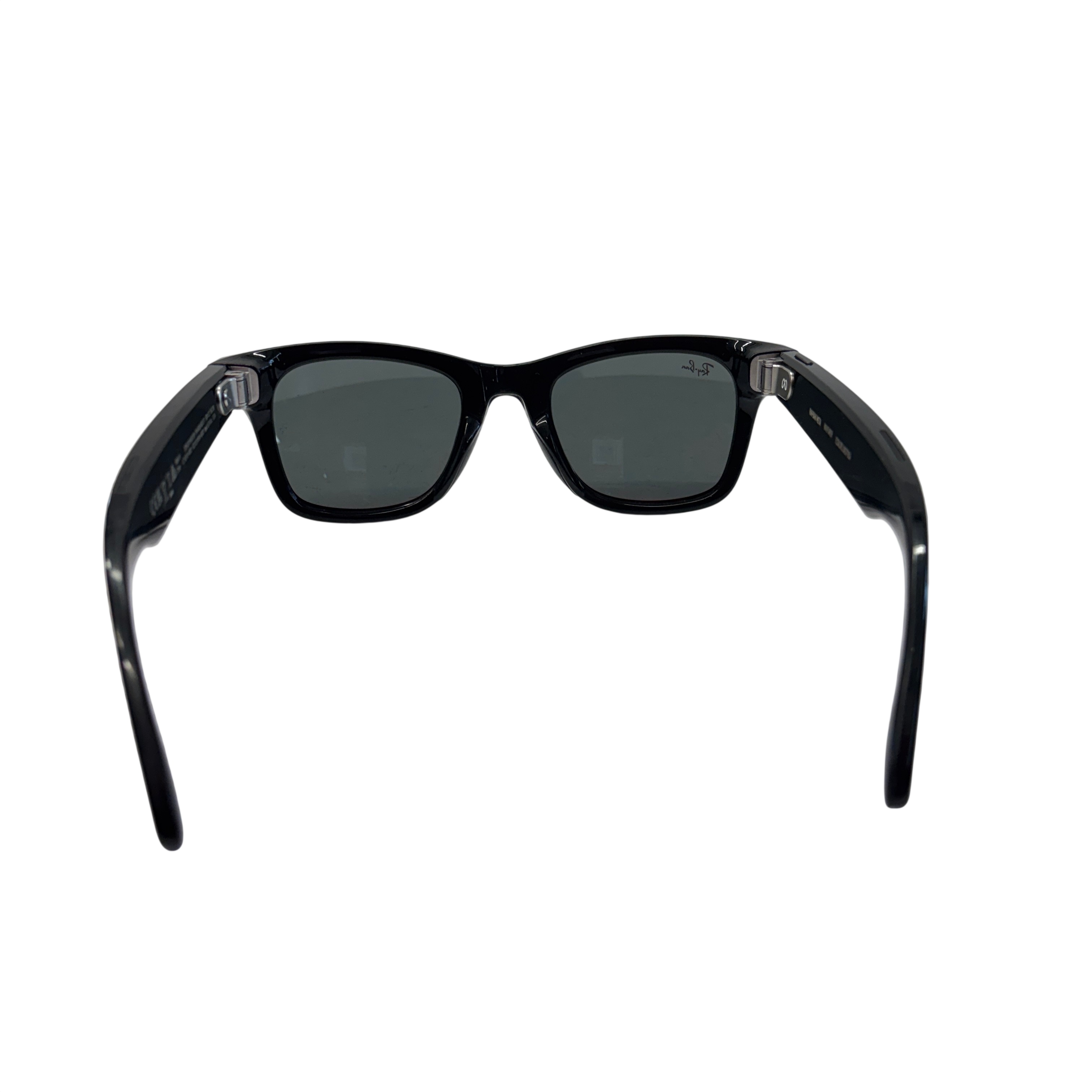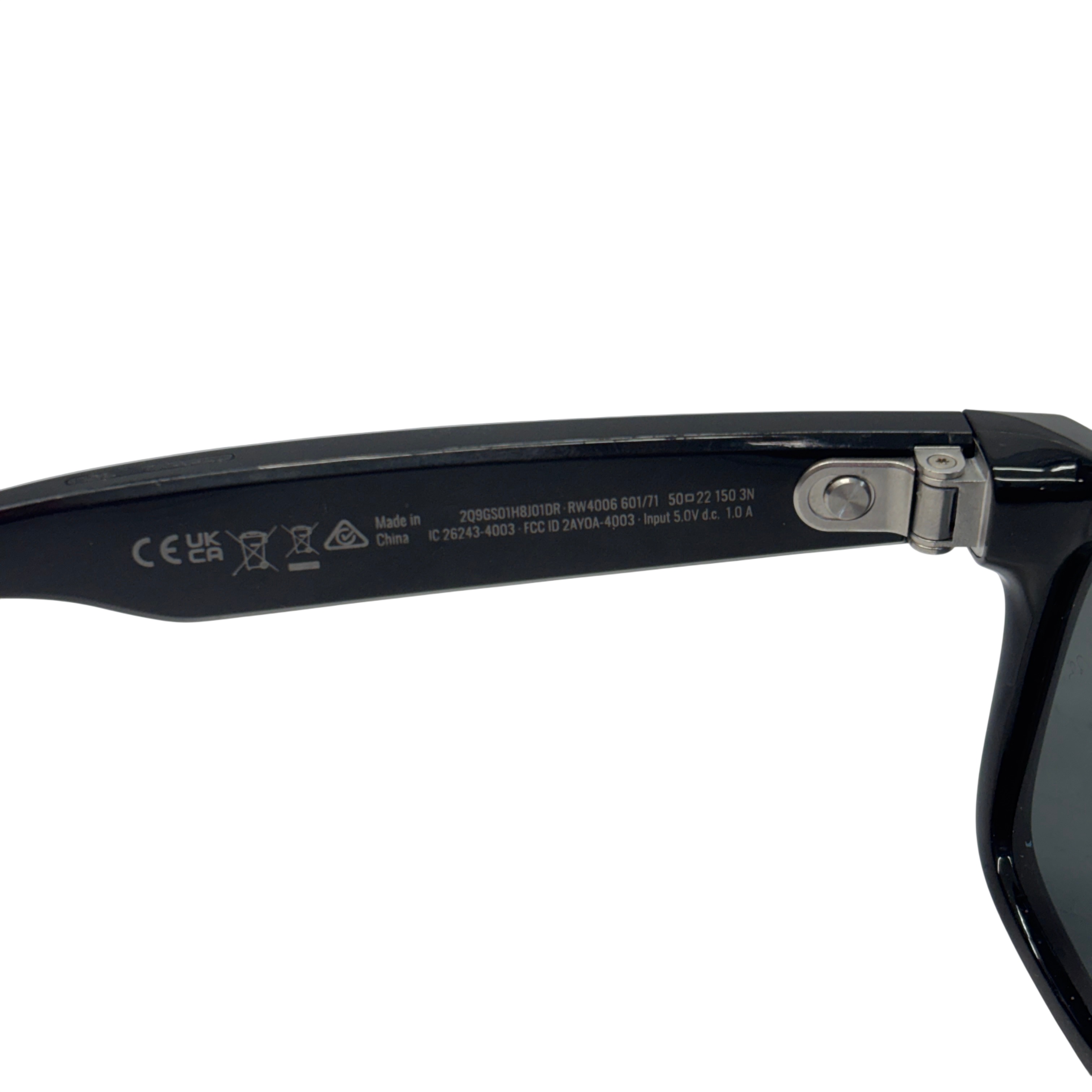 Rayban RW4006 META Wayfarer Smart Sunglasses combine classic Wayfarer style with modern smart technology. These black-framed sunglasses feature dark lenses and integrated electronics powered by a 5V DC input. The size measures 50mm lens width, 22mm bridge, and 150mm temple length, offering a comfortable fit. Included is a brown Rayban hard case for secure storage. Ideal for those seeking stylish eyewear with smart features in a trusted Rayban design.