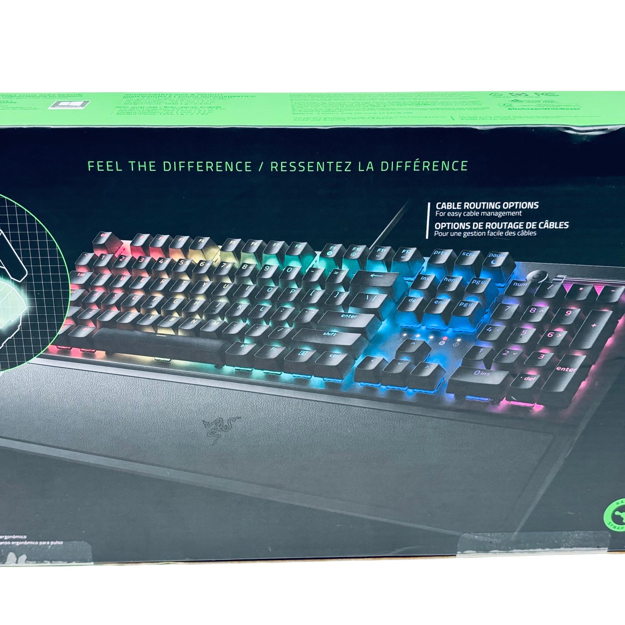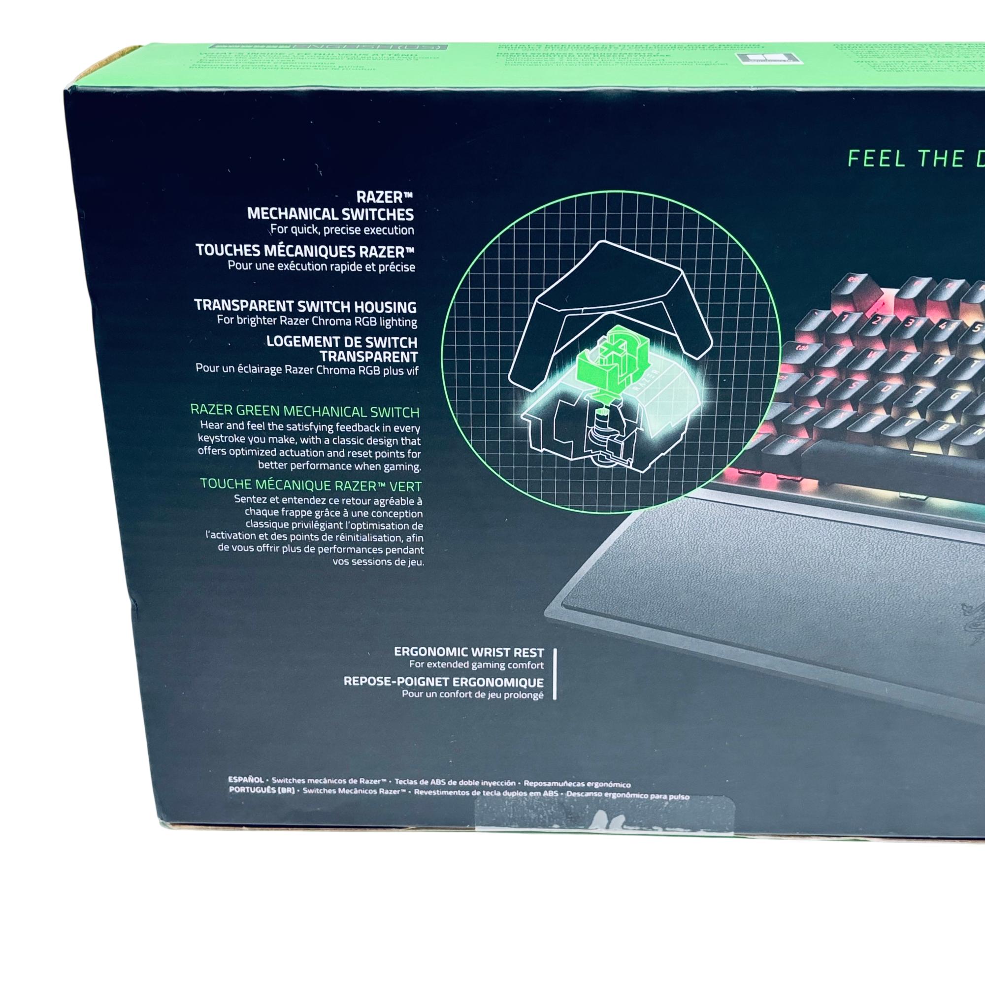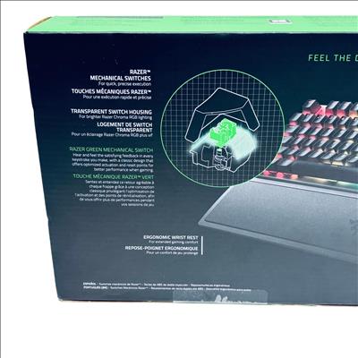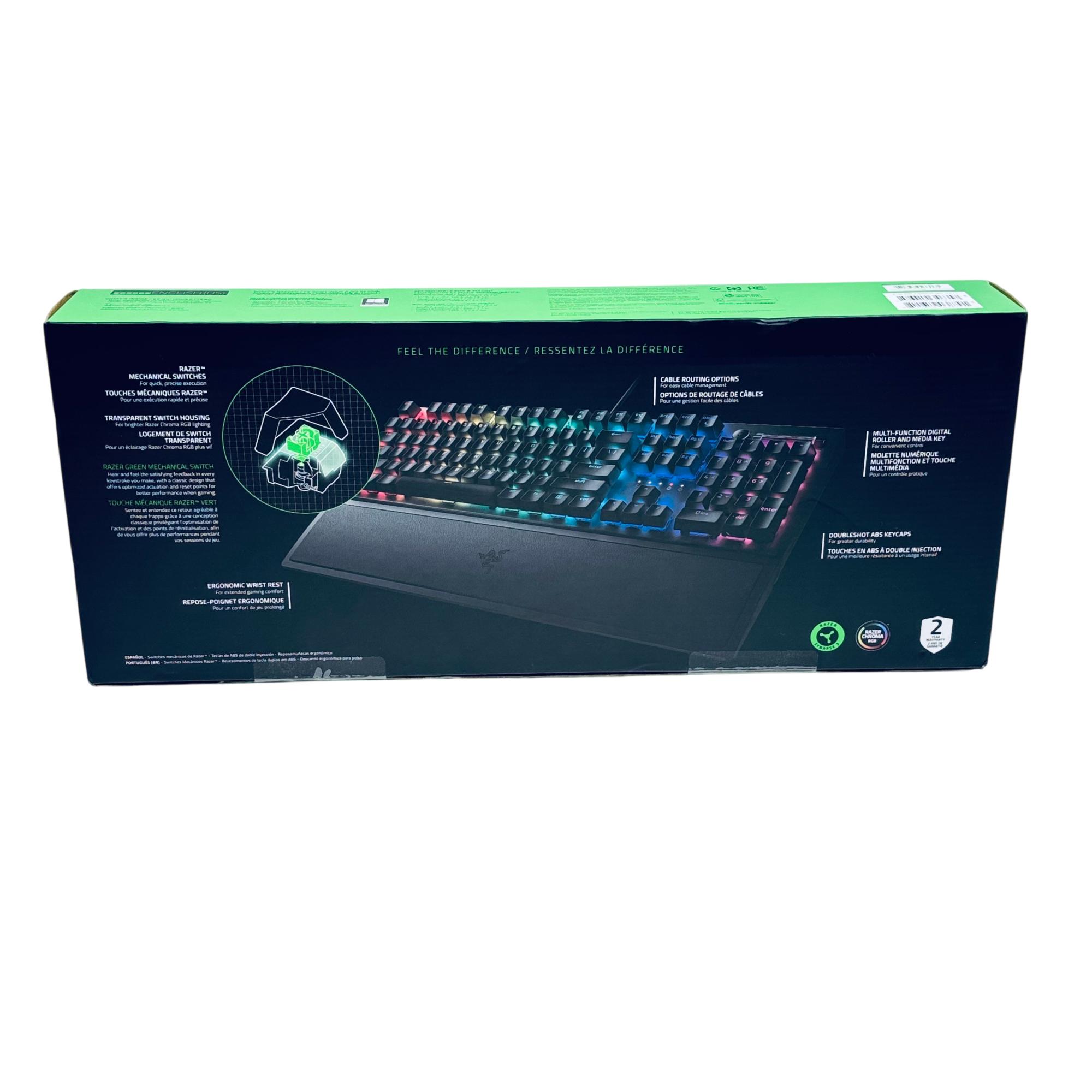 Razer BlackWidow V3 Mechanical Gaming Keyboard offers precise and responsive performance with its Green mechanical switches featuring optimized actuation and reset points. This wired keyboard includes double-shot ABS keycaps and a transparent switch housing that enhances vibrant RGB Chroma lighting effects. Designed for extended gaming sessions, it also features an ergonomic wrist rest for added comfort and cable routing options for easy cable management.