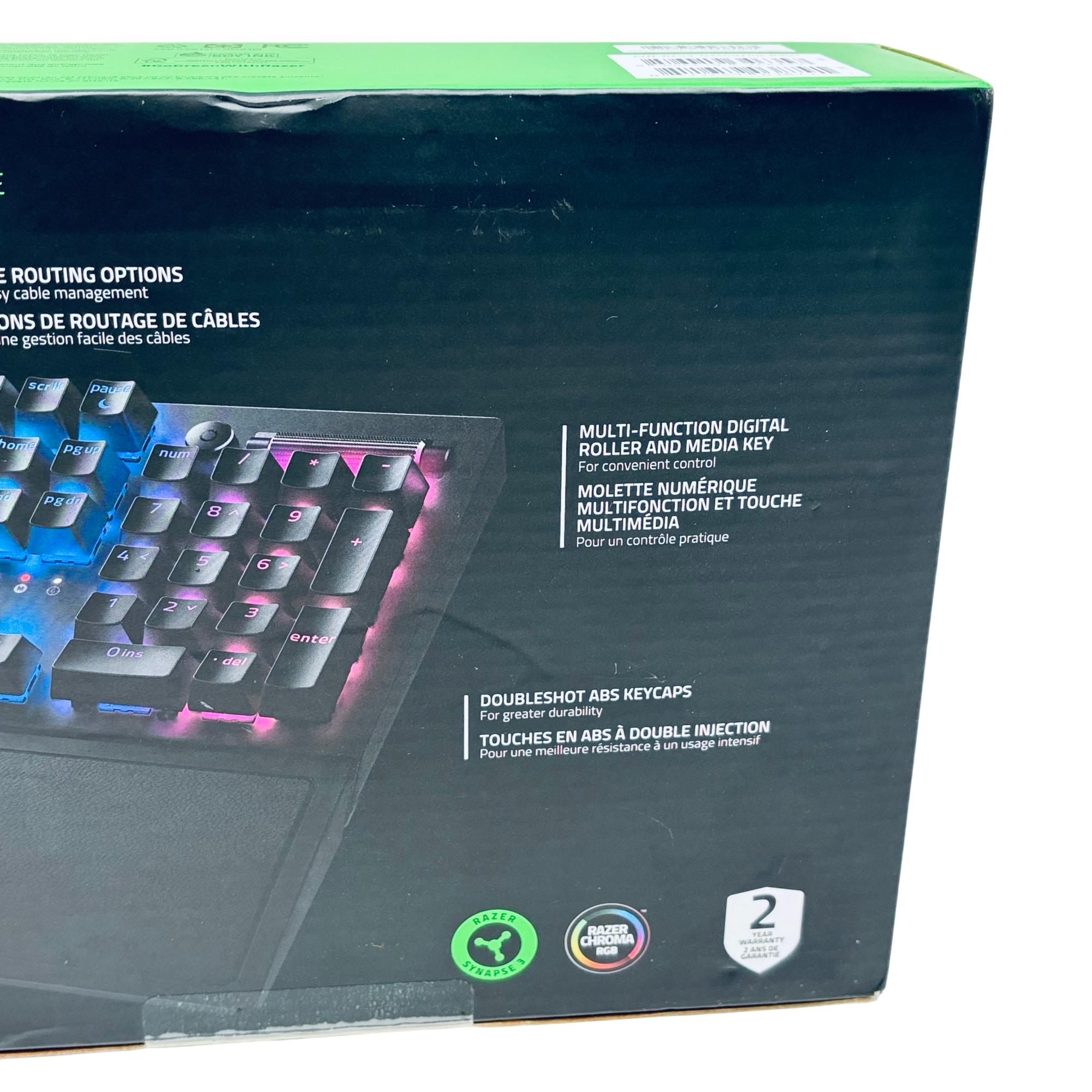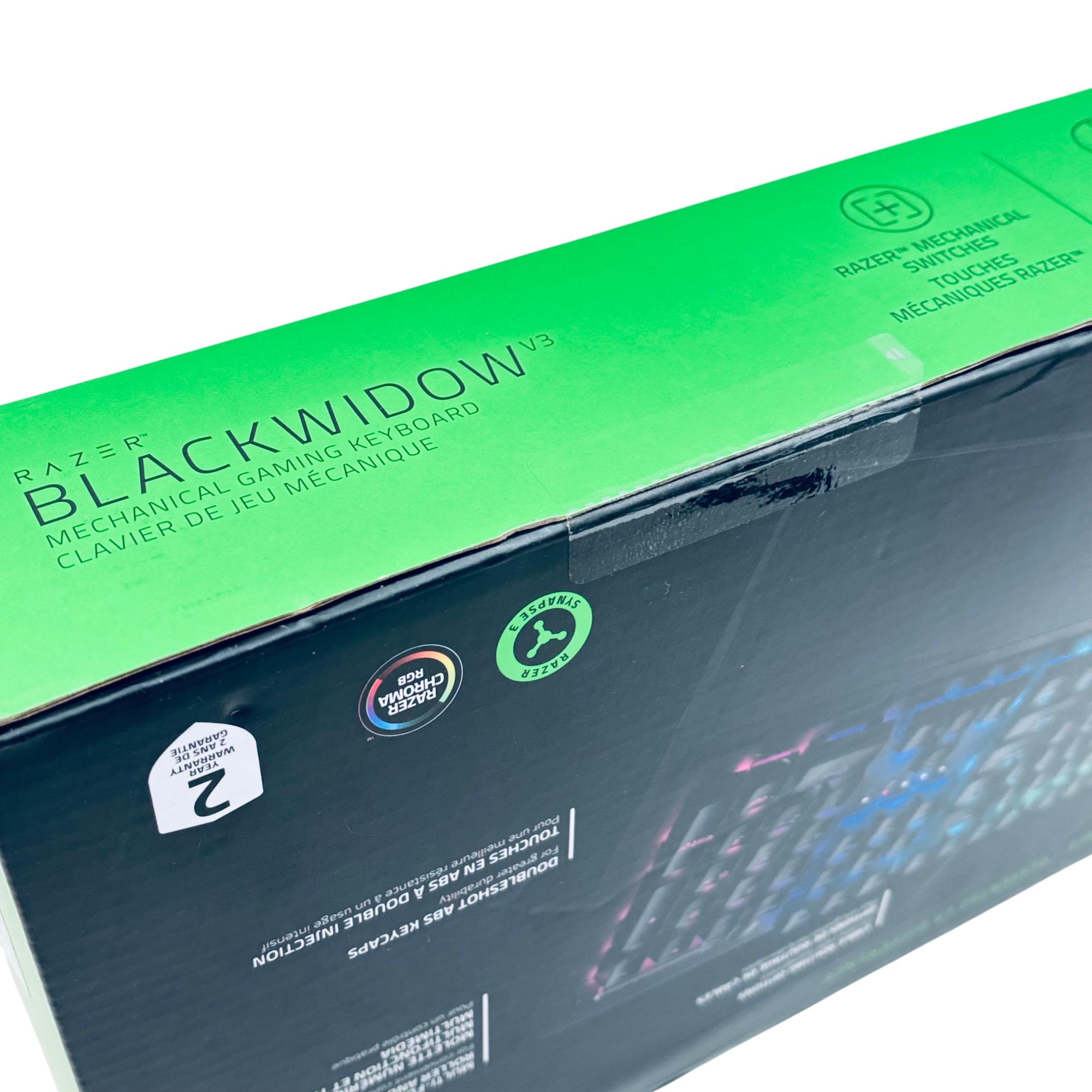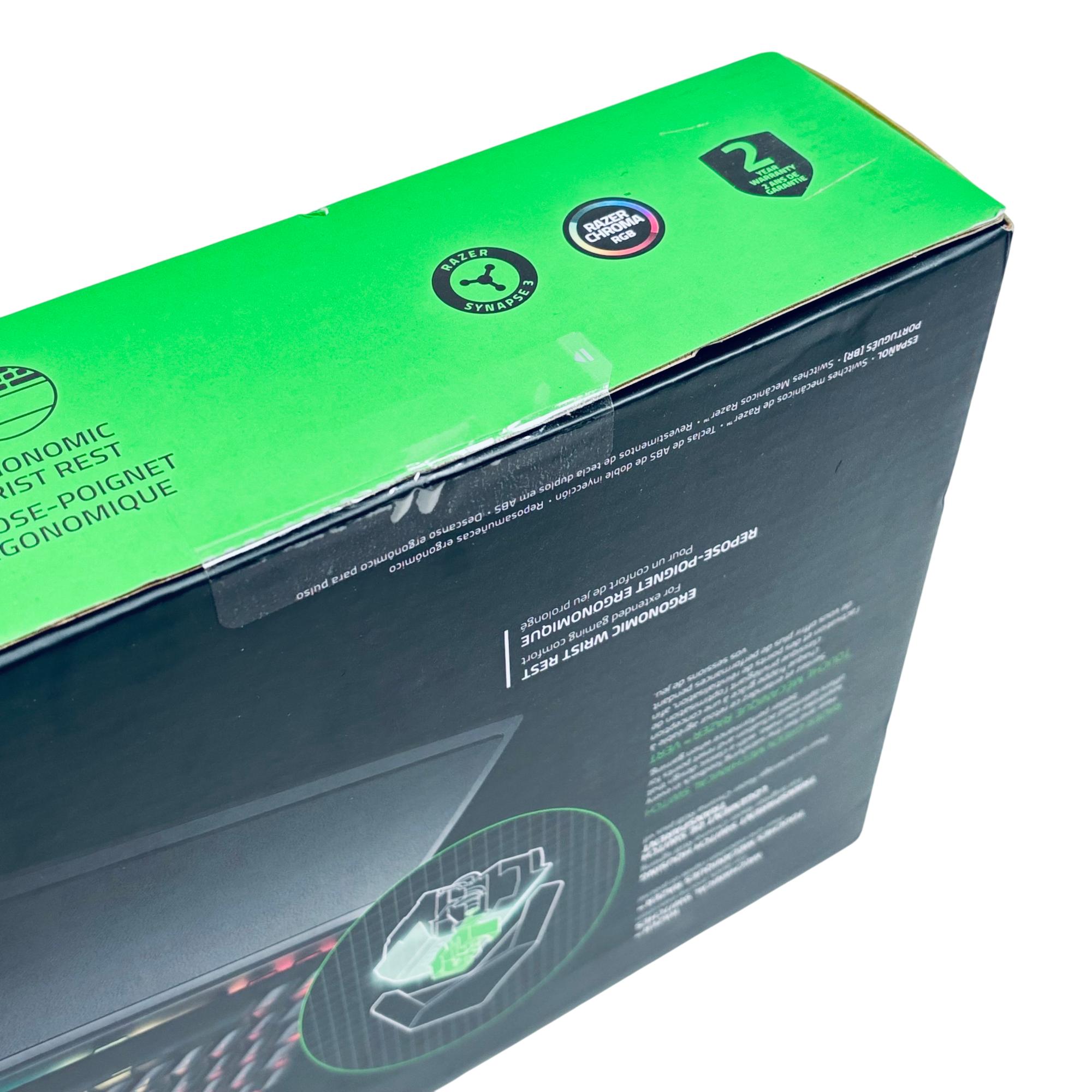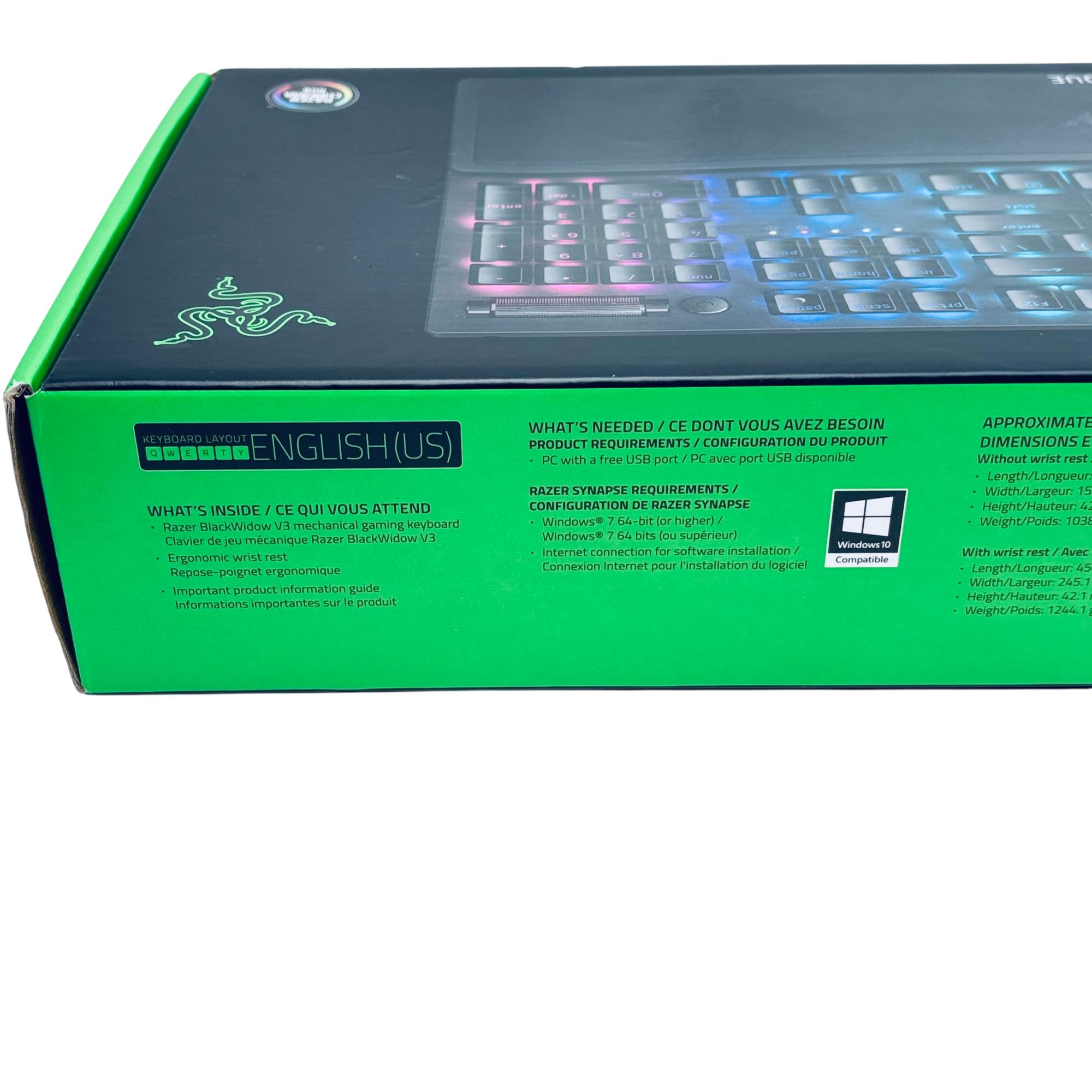 Razer BlackWidow V3 Mechanical Gaming Keyboard offers precise and responsive performance with its Green mechanical switches featuring optimized actuation and reset points. This wired keyboard includes double-shot ABS keycaps and a transparent switch housing that enhances vibrant RGB Chroma lighting effects. Designed for extended gaming sessions, it also features an ergonomic wrist rest for added comfort and cable routing options for easy cable management.