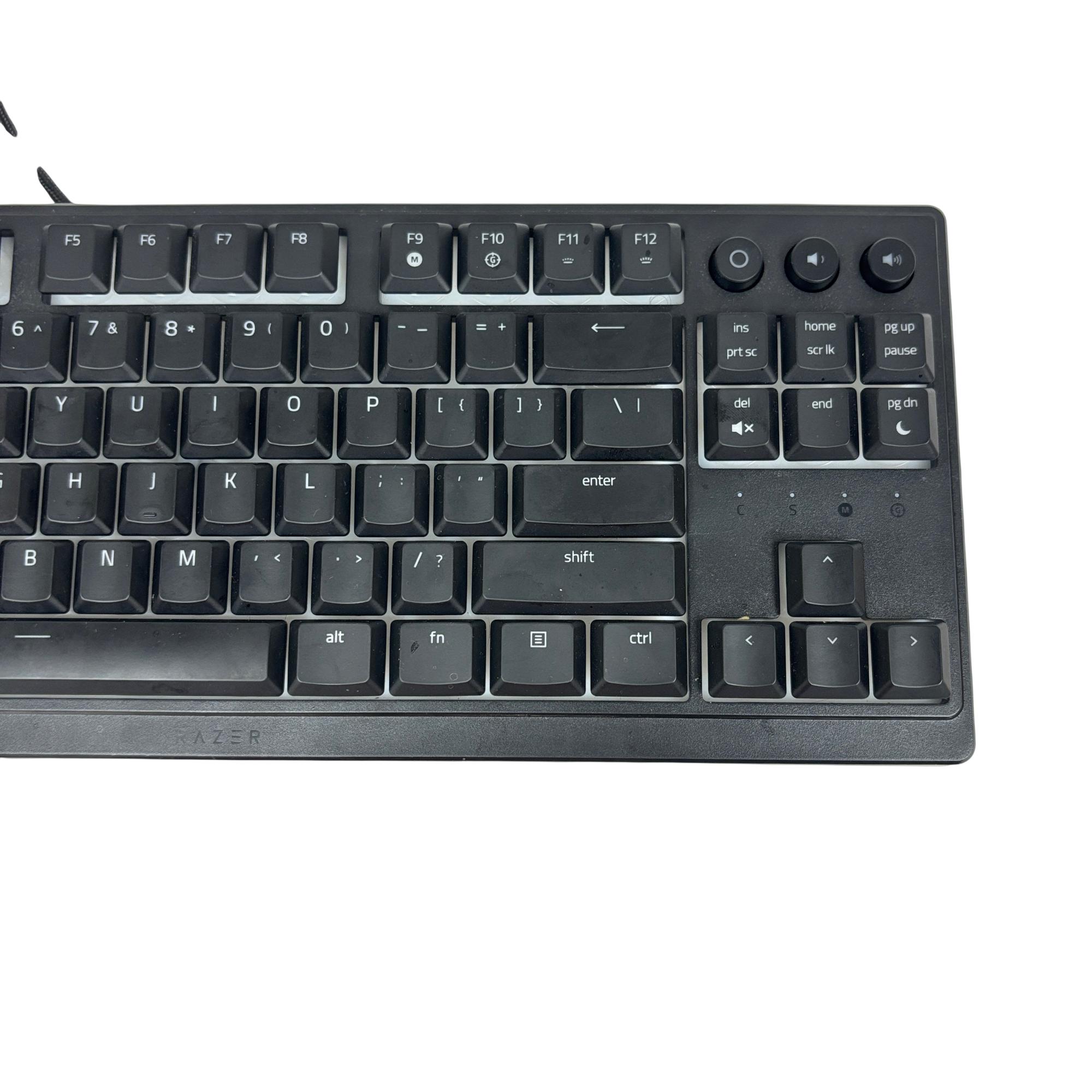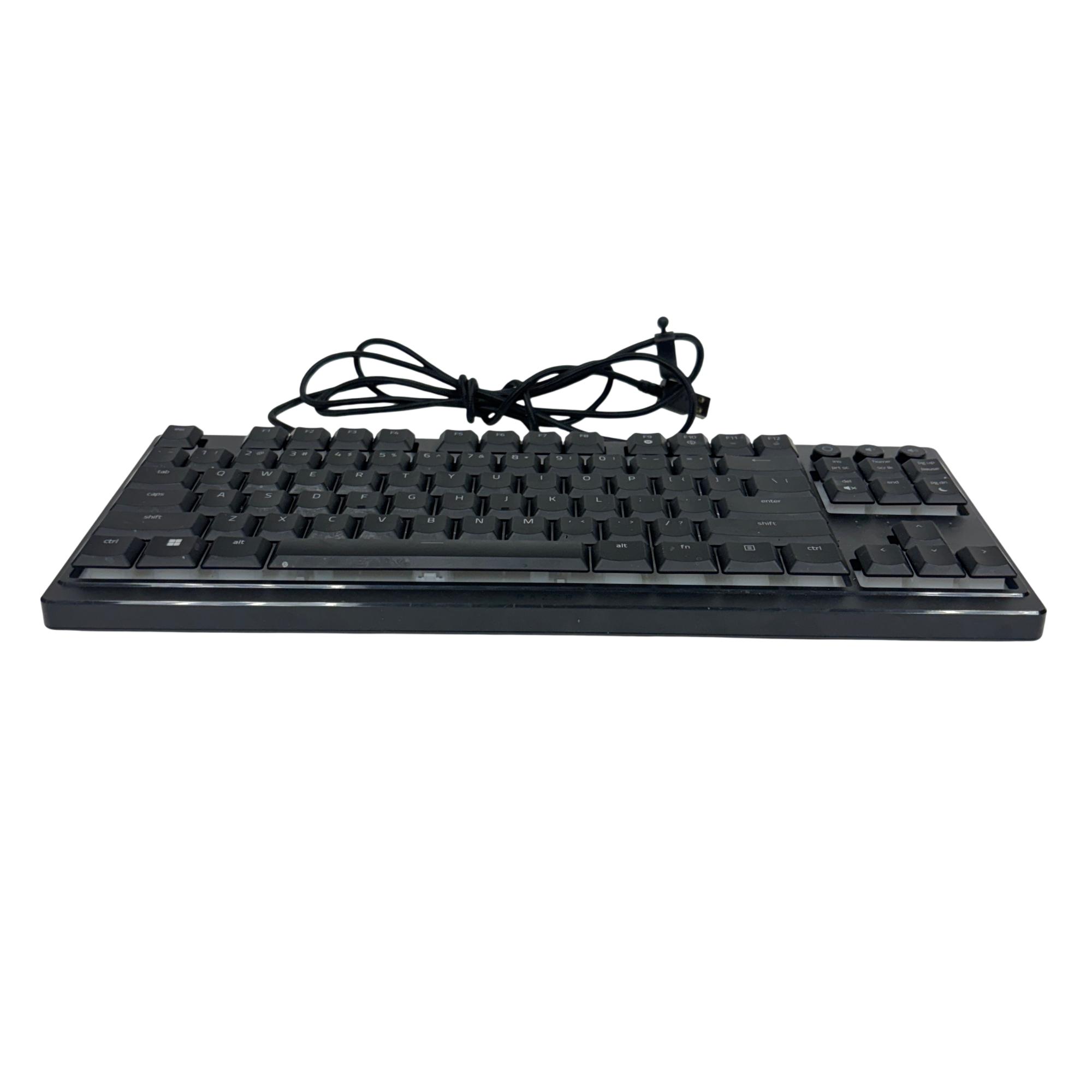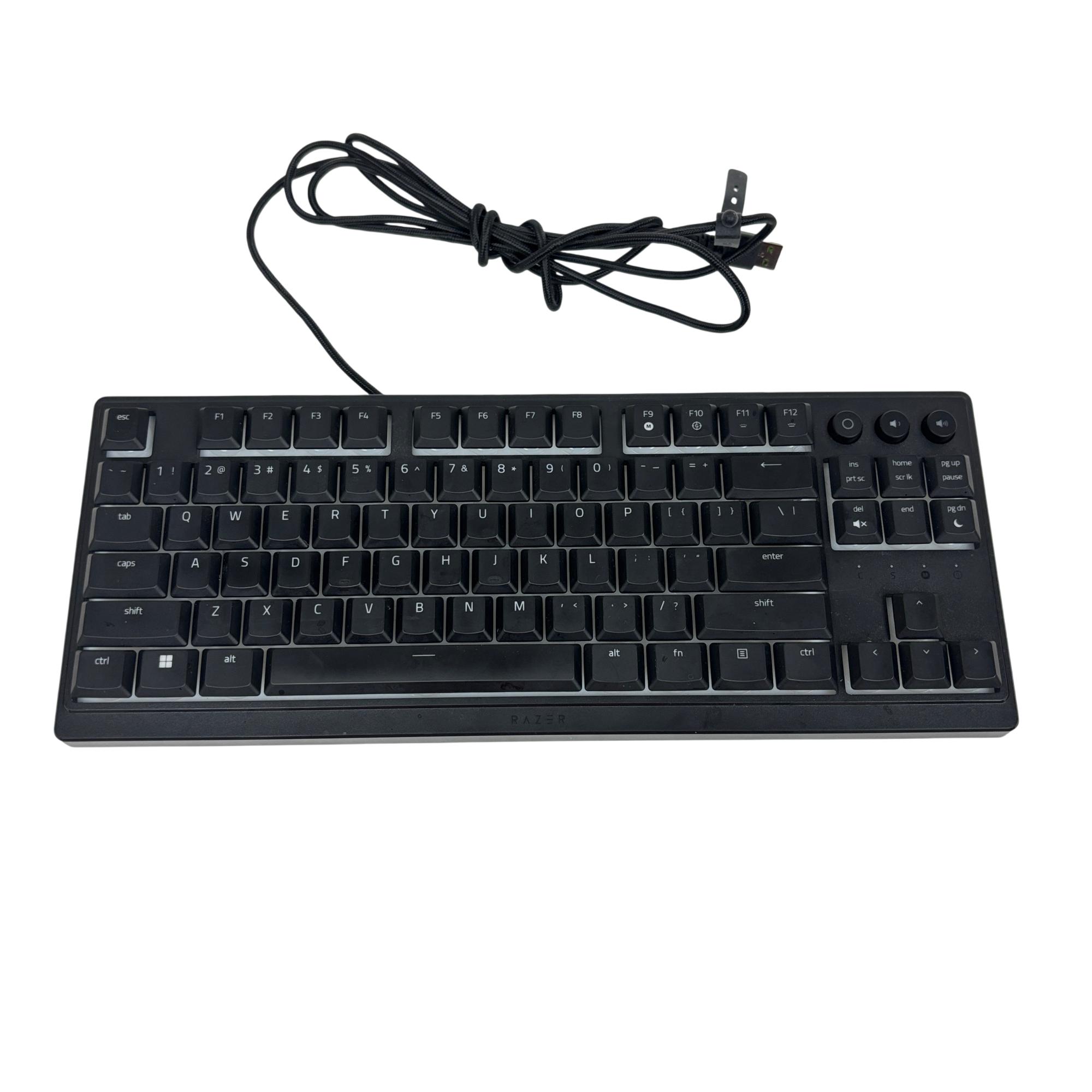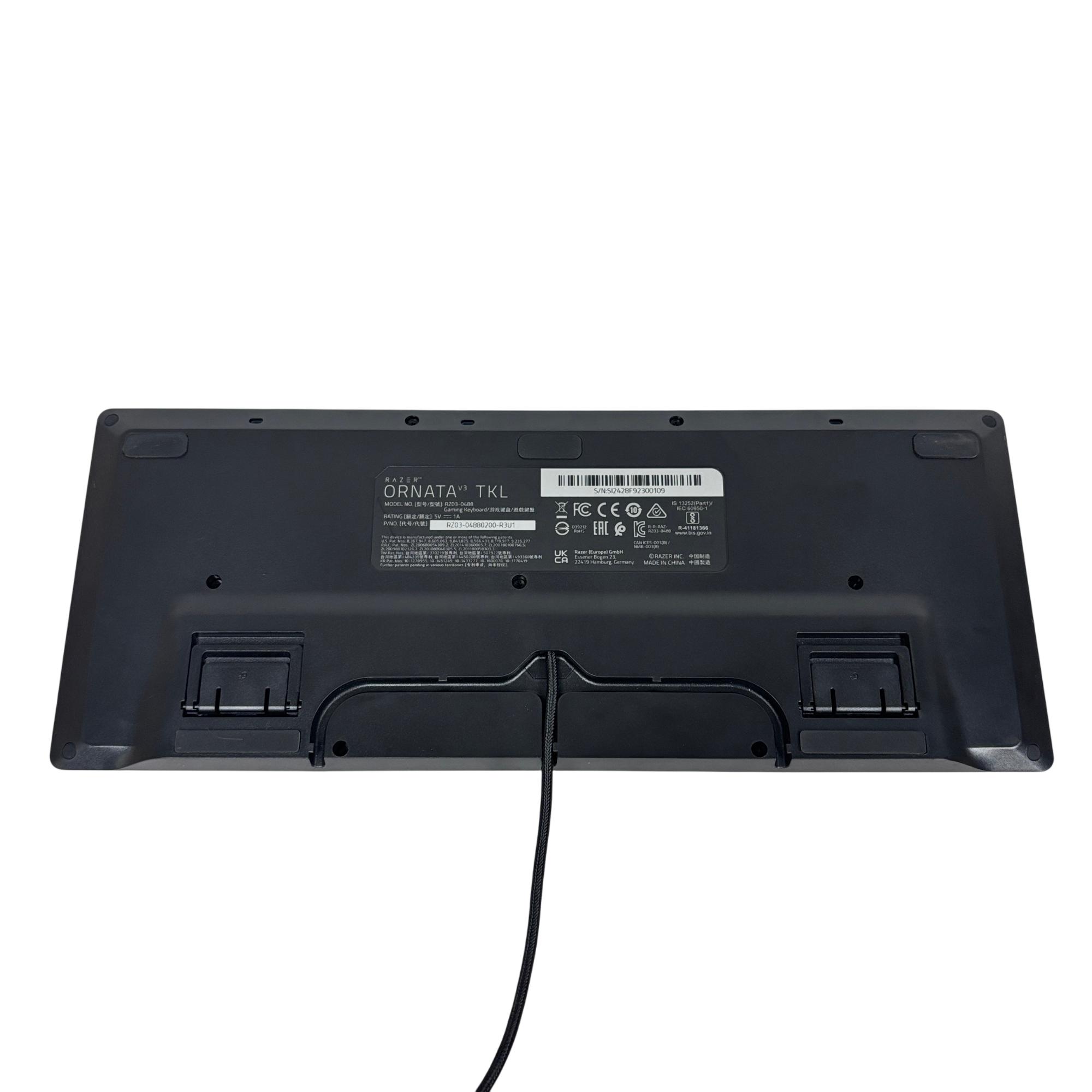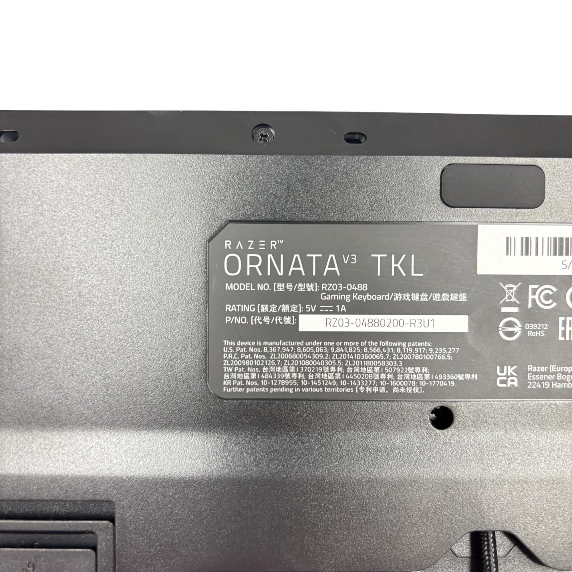 The Razer Ornata V3 TKL Mecha-Membrane Wired Gaming Keyboard features a tenkeyless design with low-profile keys that combine mechanical and membrane switch technologies for responsive and tactile feedback. Its wired connection ensures stable performance, while the sleek black finish with white lettering offers an ergonomic and durable gaming experience optimized for precision and speed.