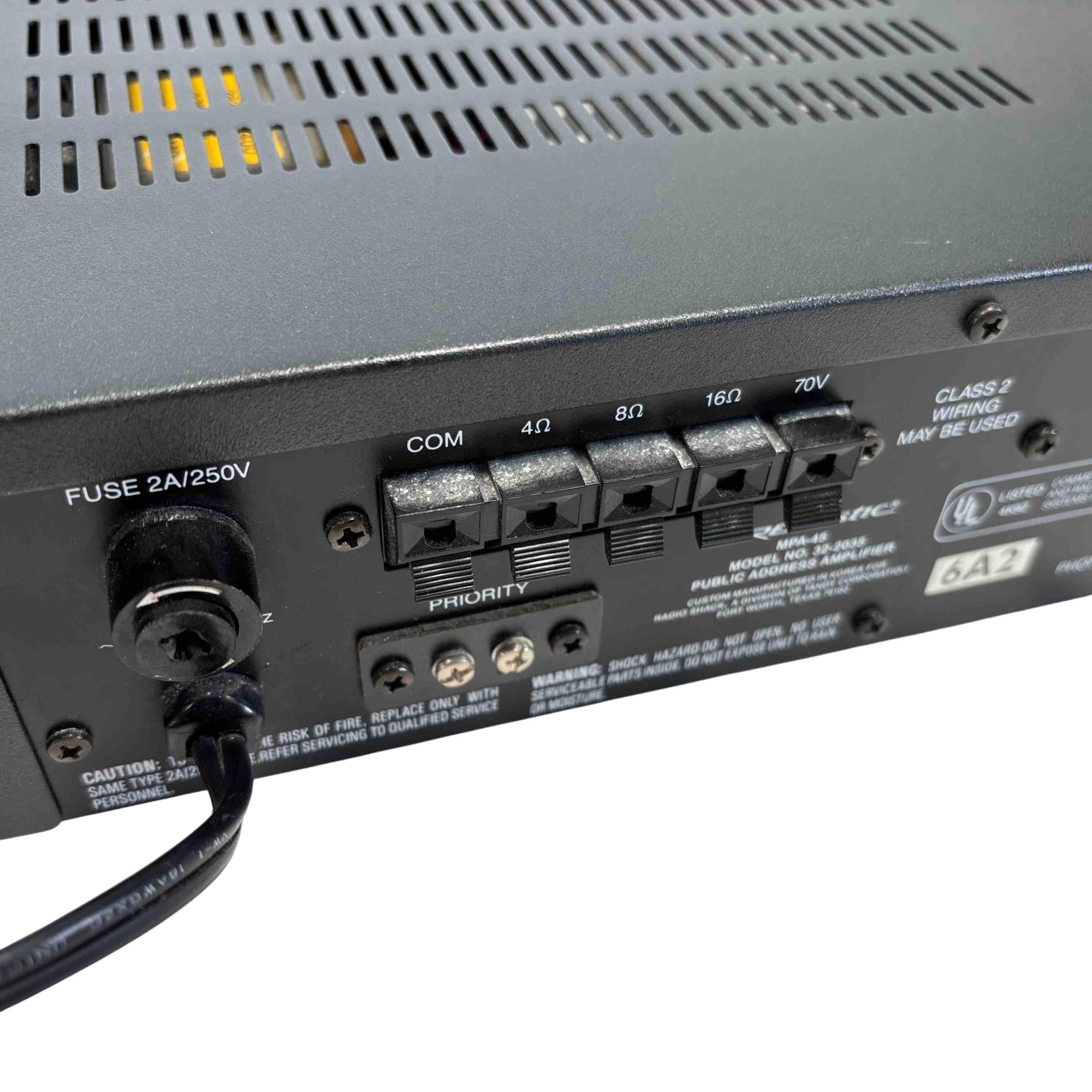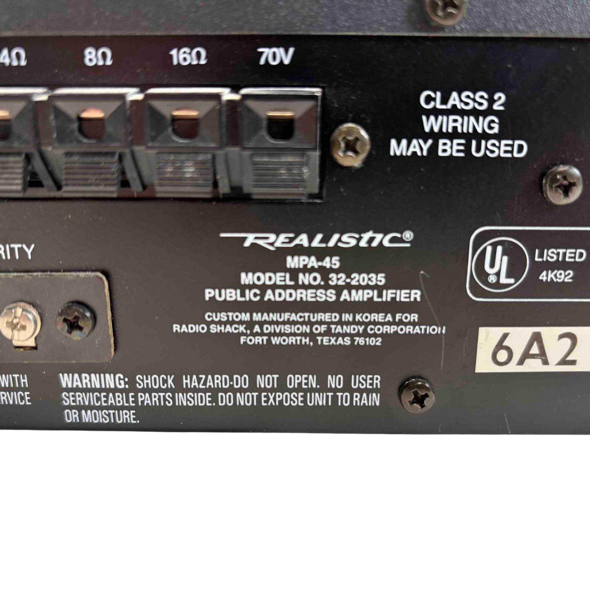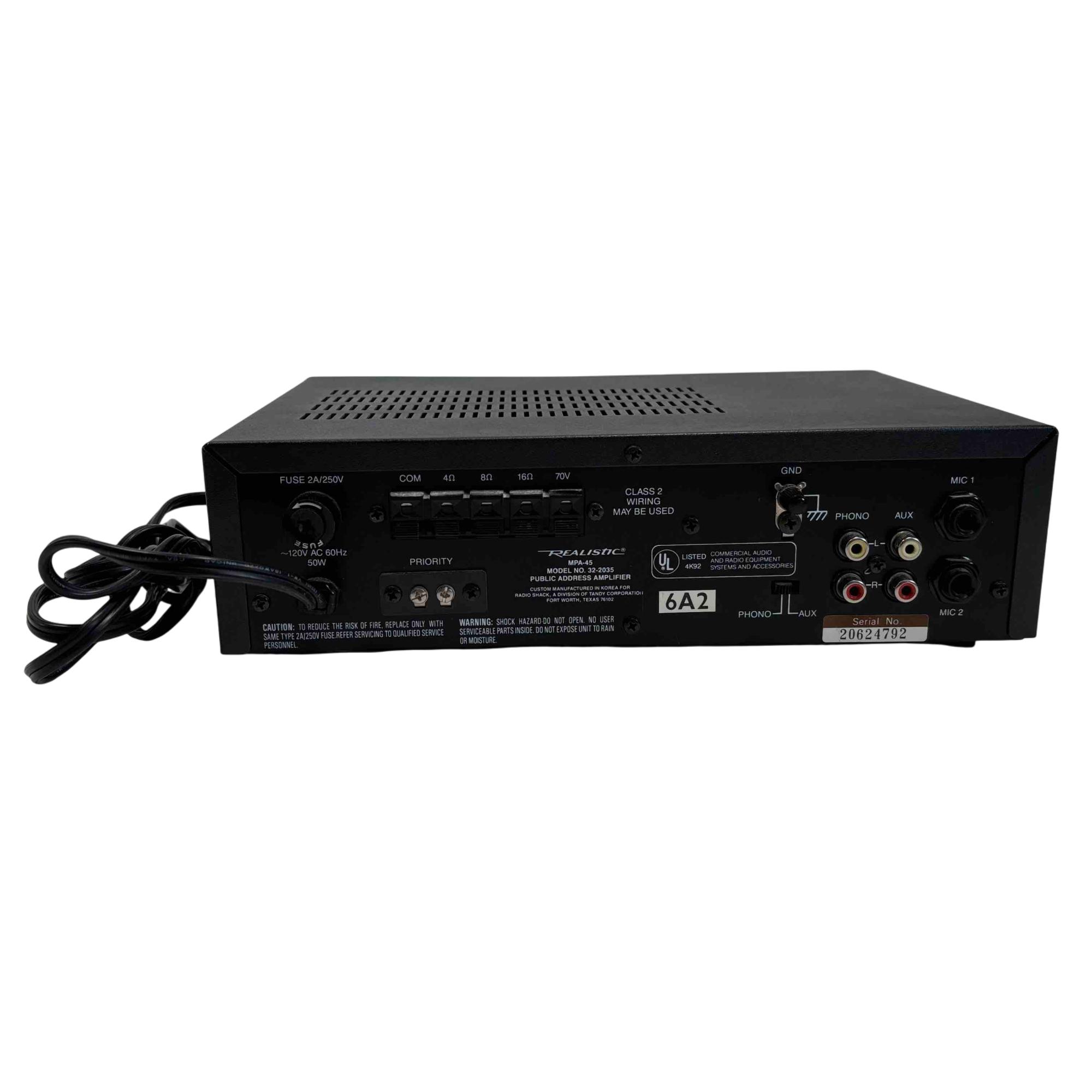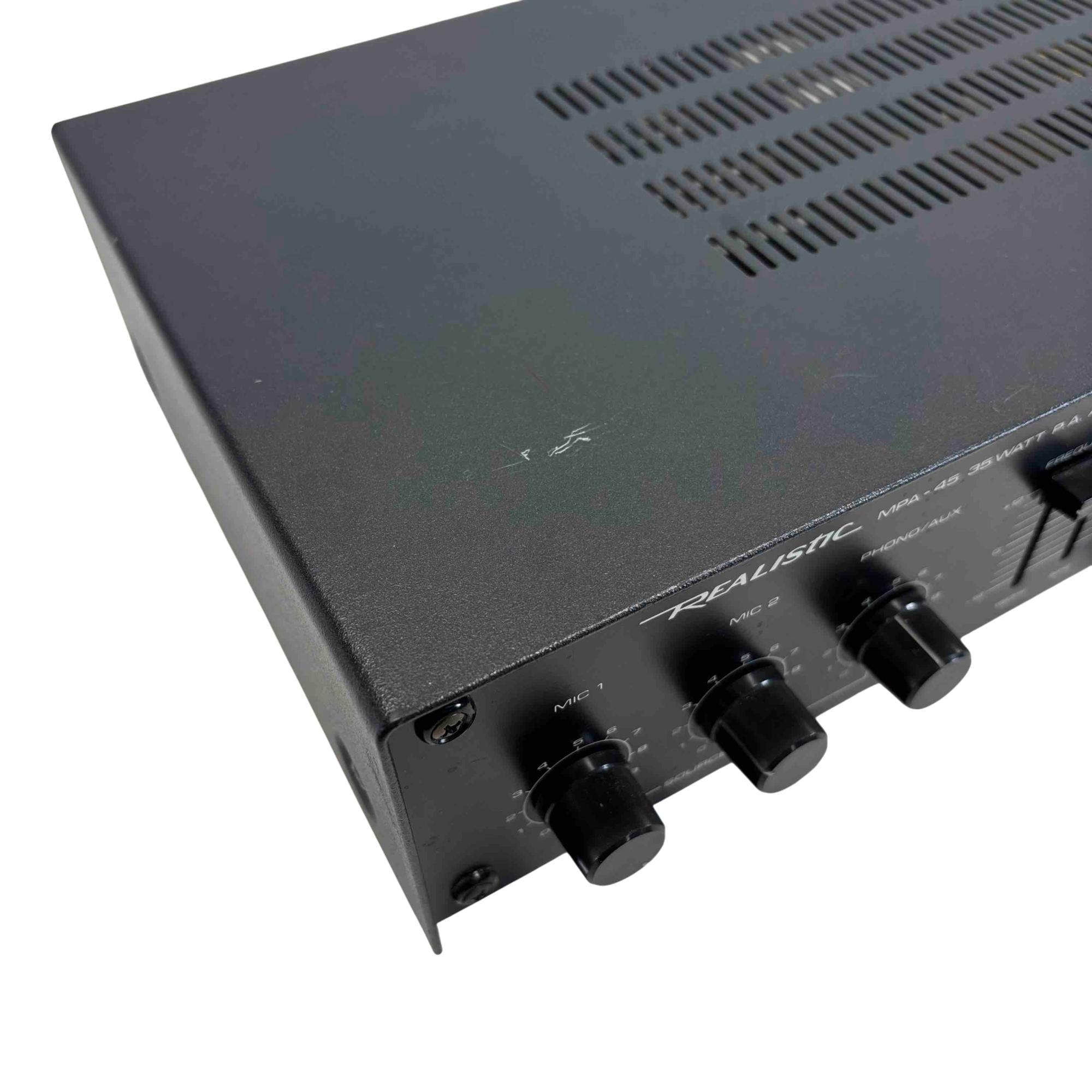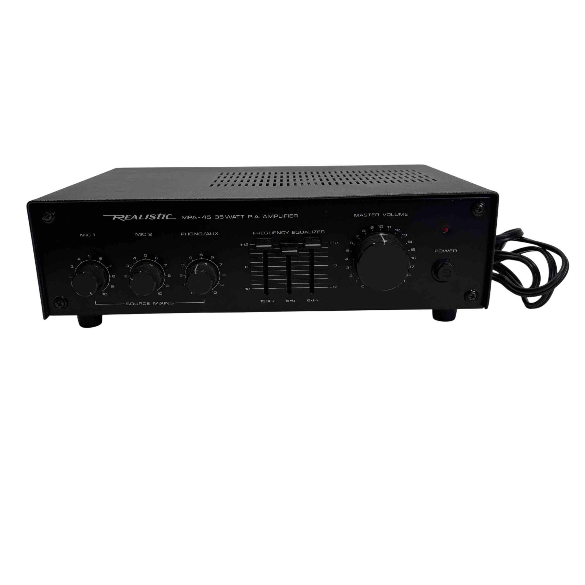 The Realistic MPA-45 is a classic public address amplifier. Featuring two mic inputs, phono/aux connectivity, precise frequency equalizer controls, and robust source mixing options, this amplifier is perfect for small venues, studios, or vintage audio enthusiasts seeking reliable, high-quality sound performance.