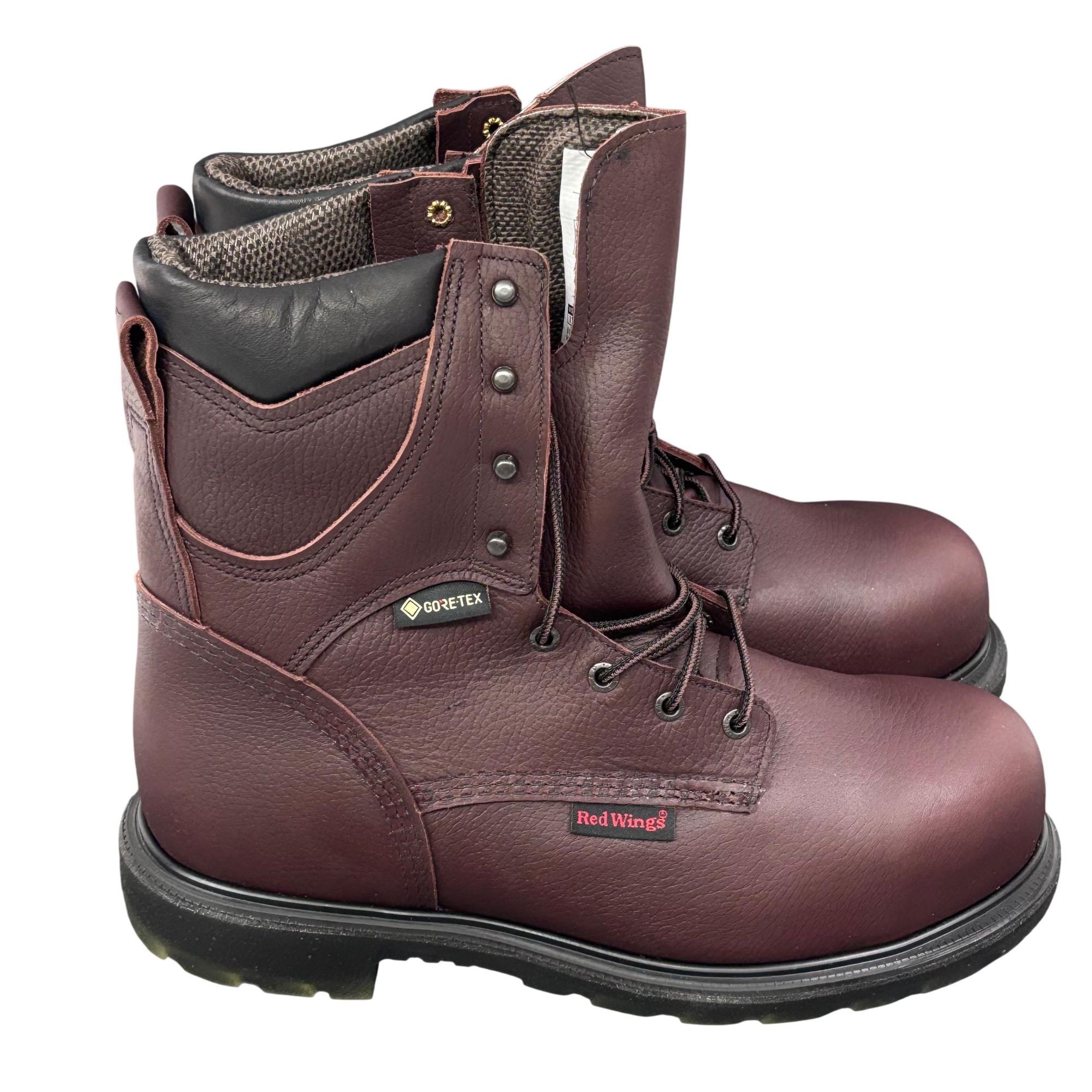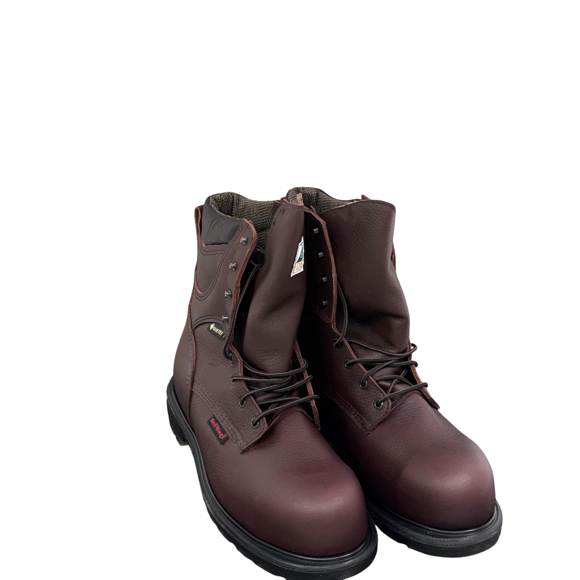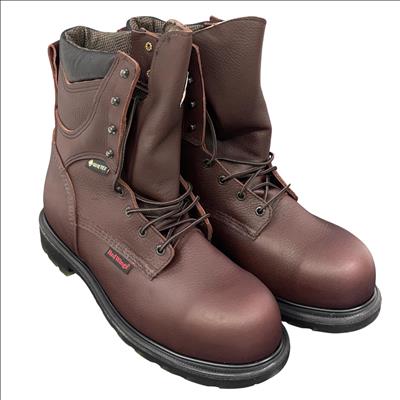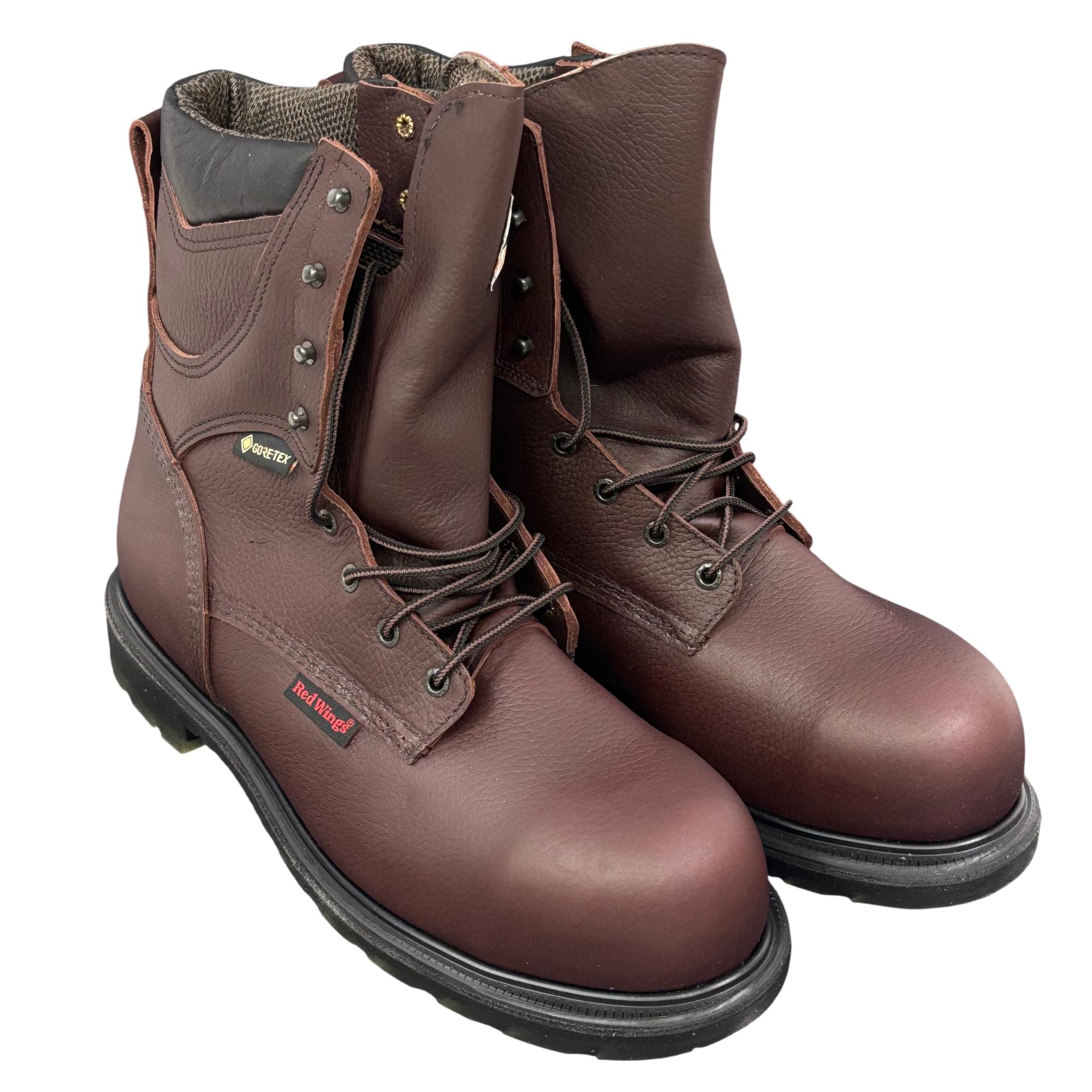 Red Wing Mens SuperSole 2.0 8-Inch Waterproof Work Boot 2412 features premium brown leather construction combined with GORE-TEX technology for reliable waterproof performance. Designed with a durable 8-inch height and a broad 11EE width, this work boot offers exceptional support and comfort suitable for demanding environments.