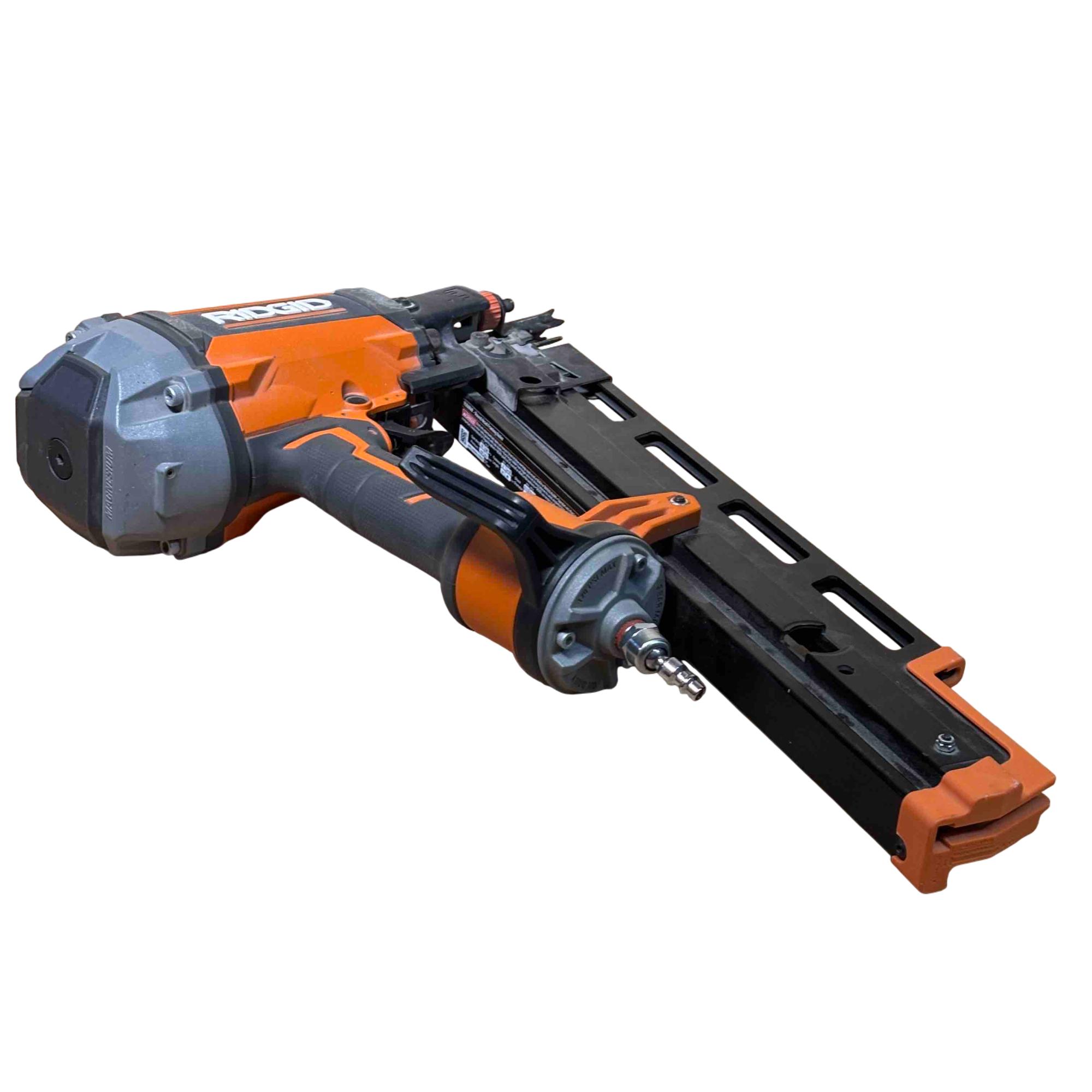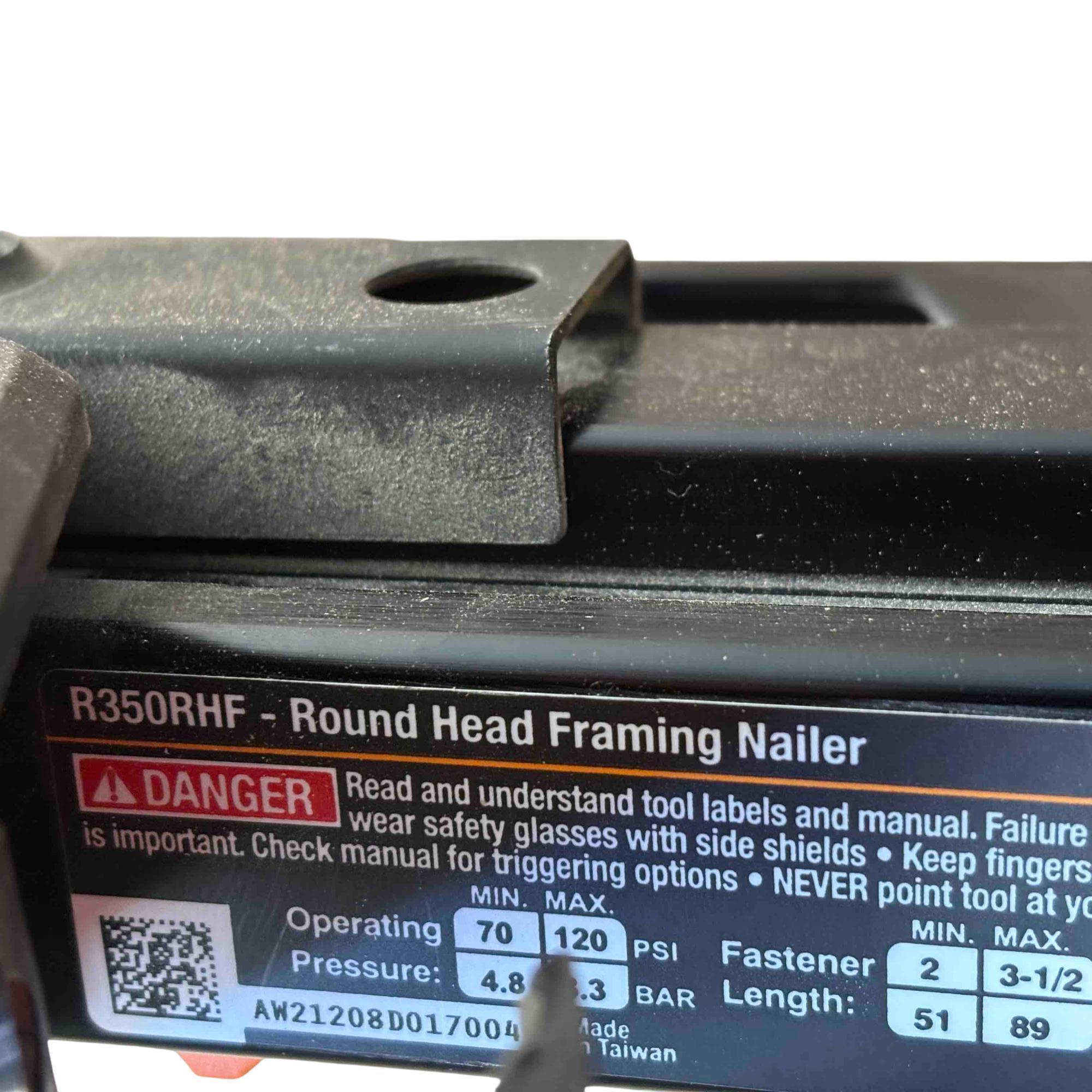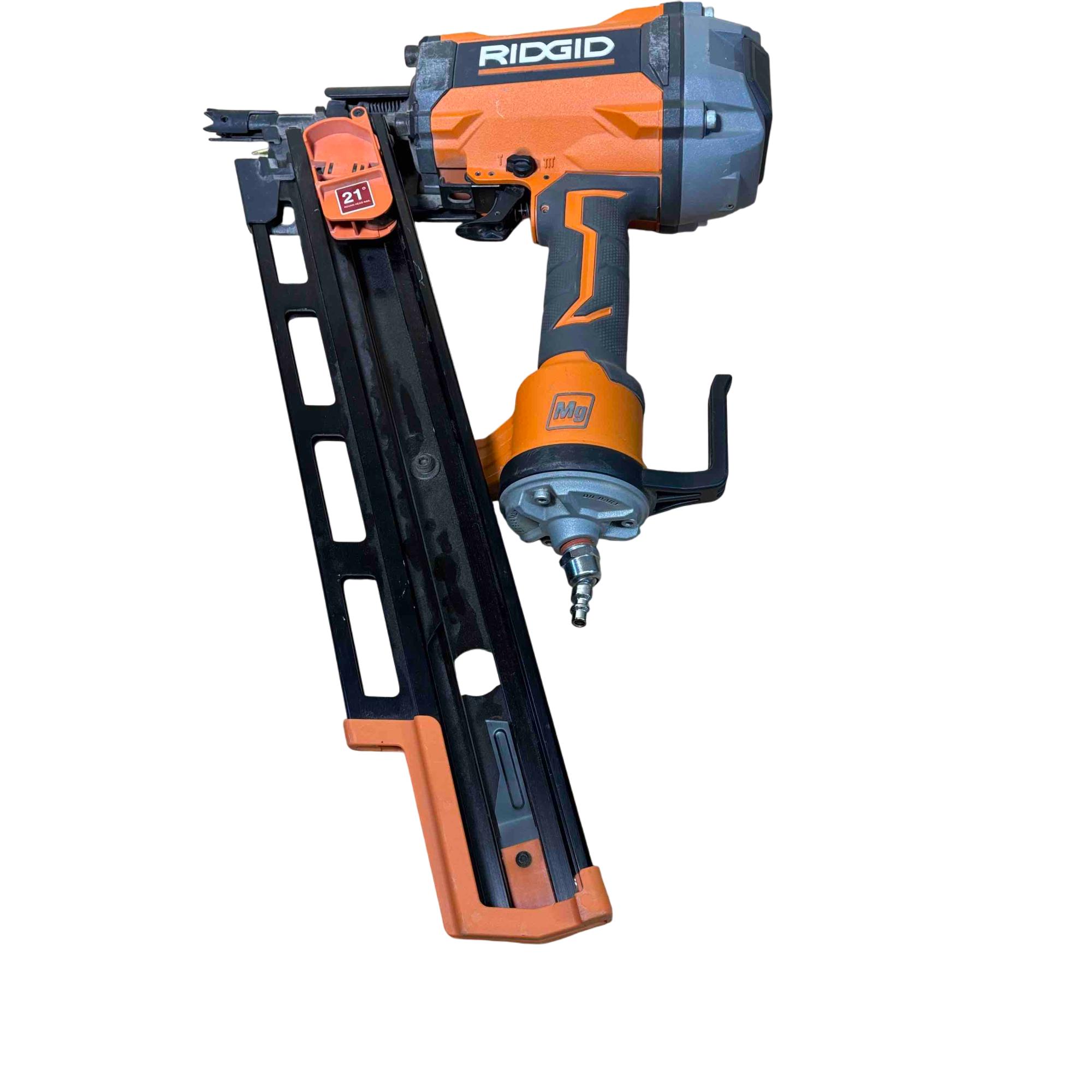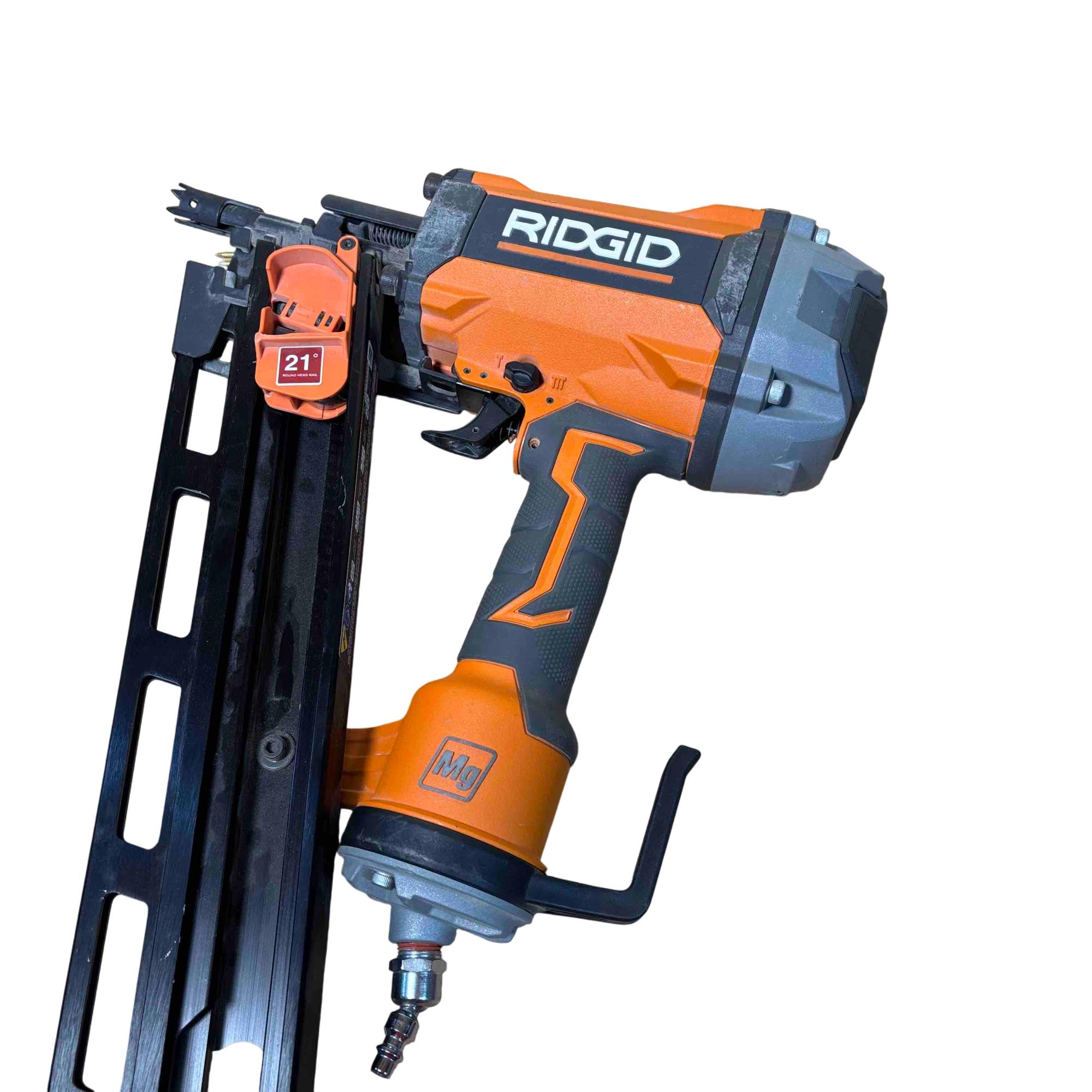 RIDGID R350RHF 21° Round Head Framing Nailer (Mg Body) is a durable pneumatic tool designed for efficient wood framing and construction tasks. Featuring a lightweight magnesium body and a 3-1/2 inch round-head nail capacity, this framing nailer delivers precision and power for professional-grade performance.