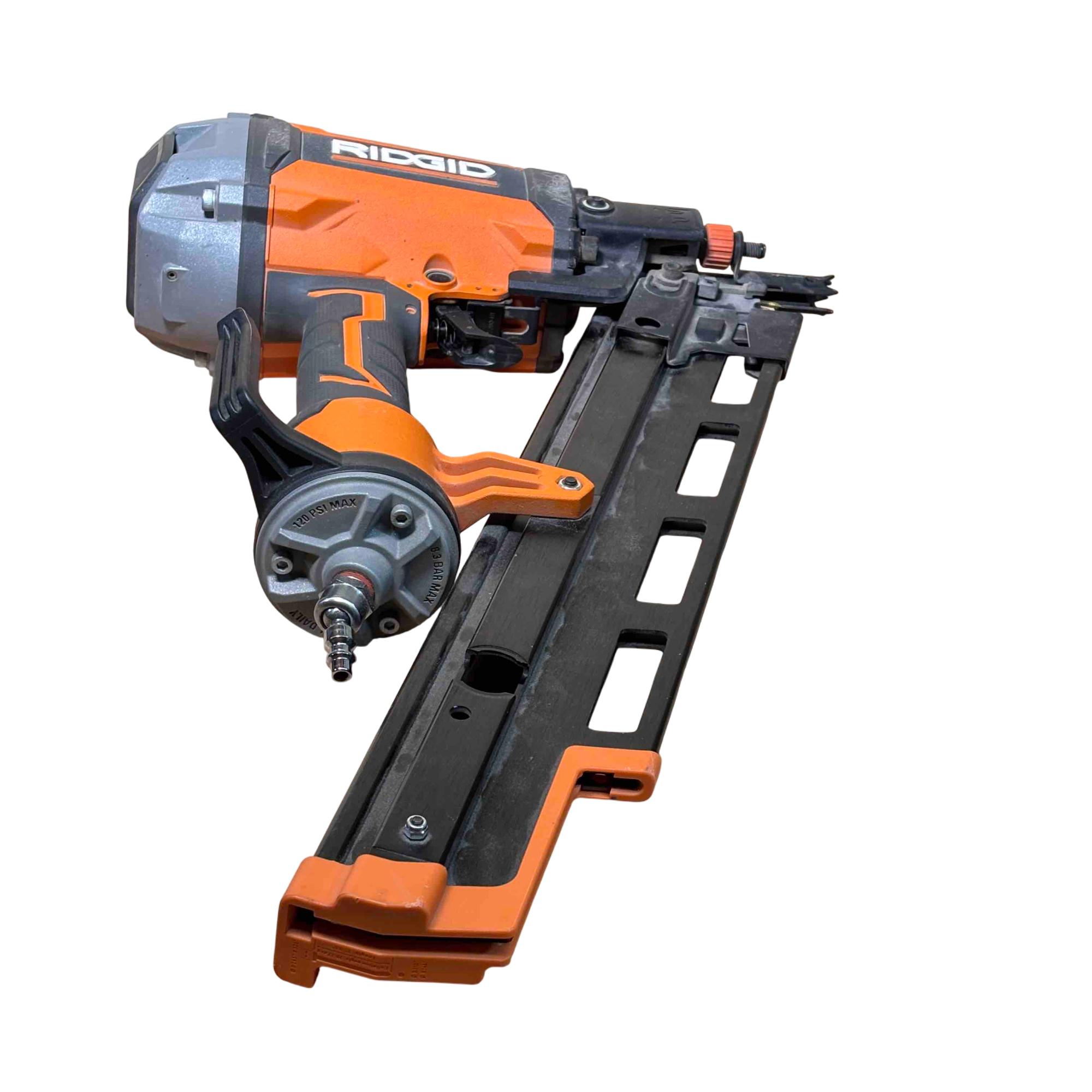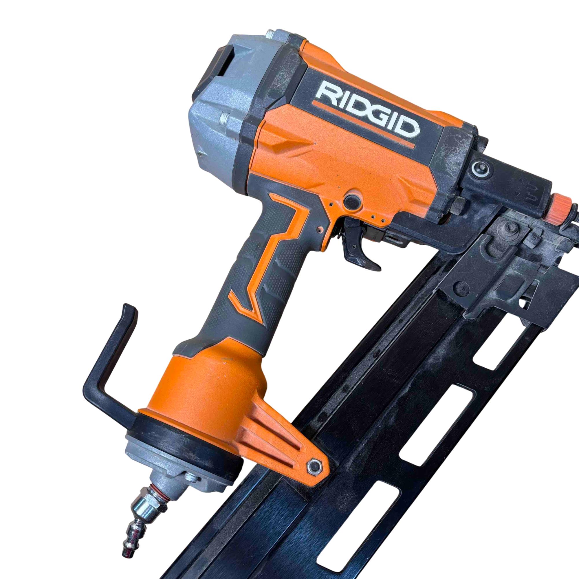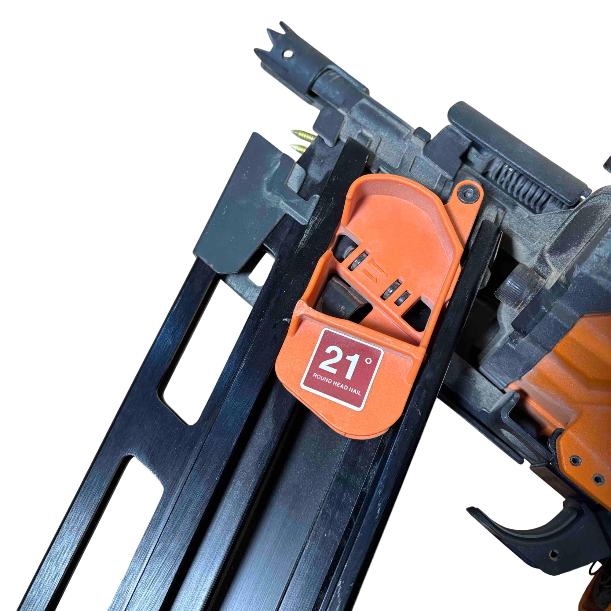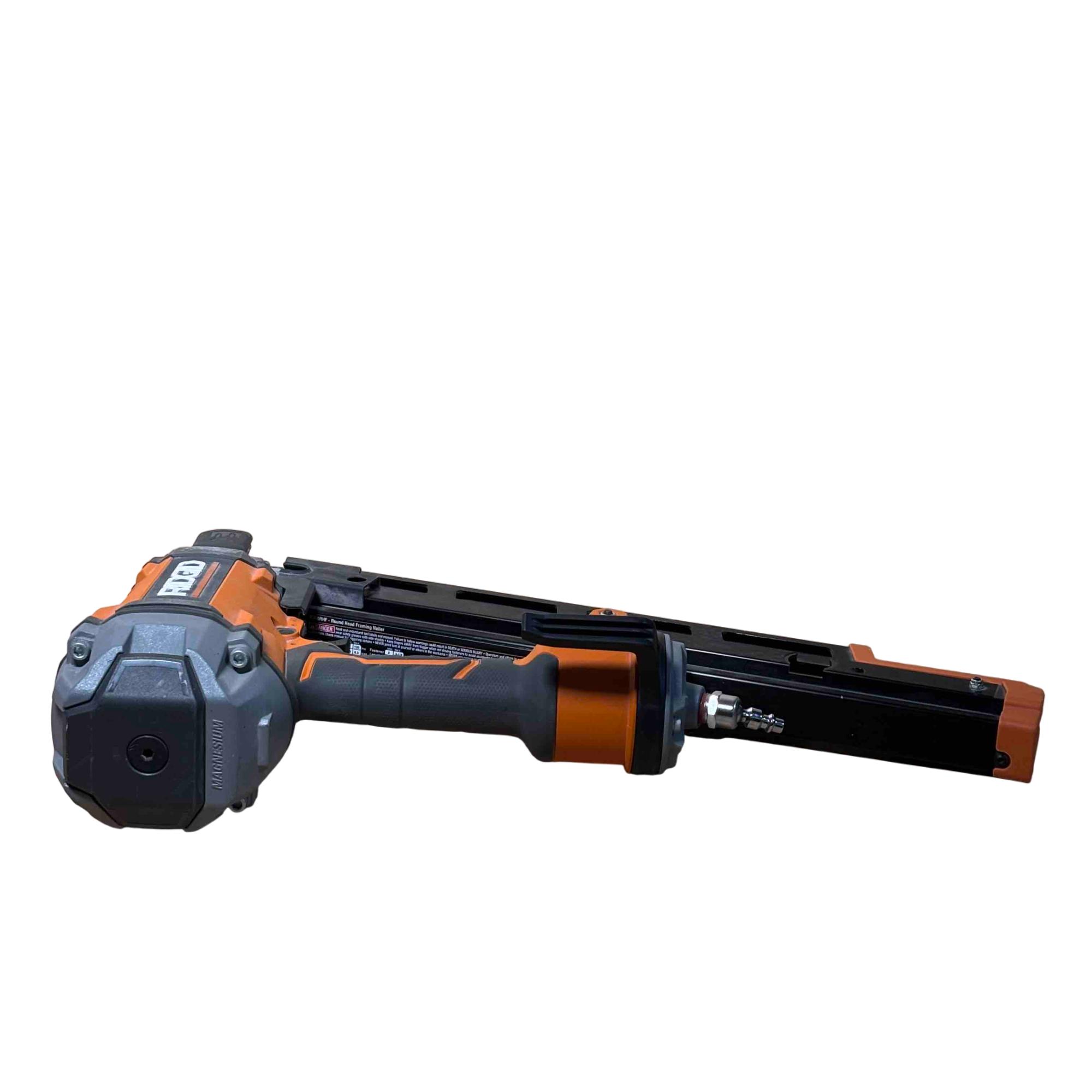 RIDGID R350RHF 21° Round Head Framing Nailer (Mg Body) is a durable pneumatic tool designed for efficient wood framing and construction tasks. Featuring a lightweight magnesium body and a 3-1/2 inch round-head nail capacity, this framing nailer delivers precision and power for professional-grade performance.
