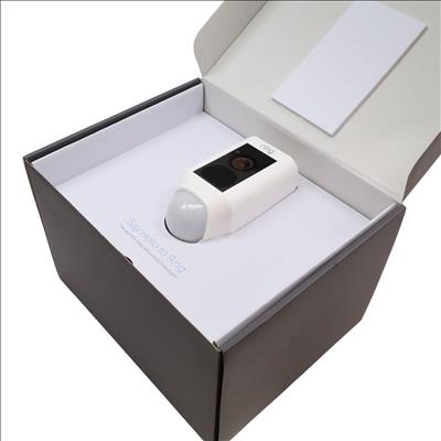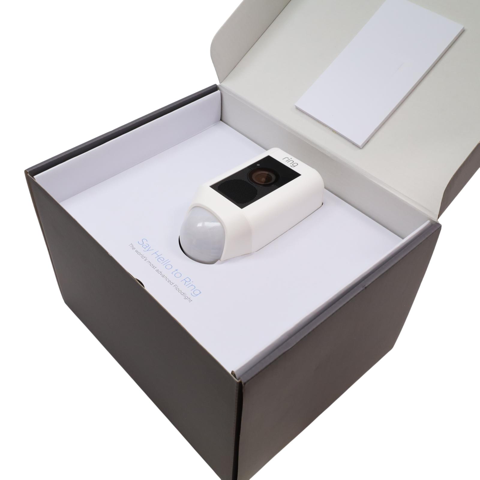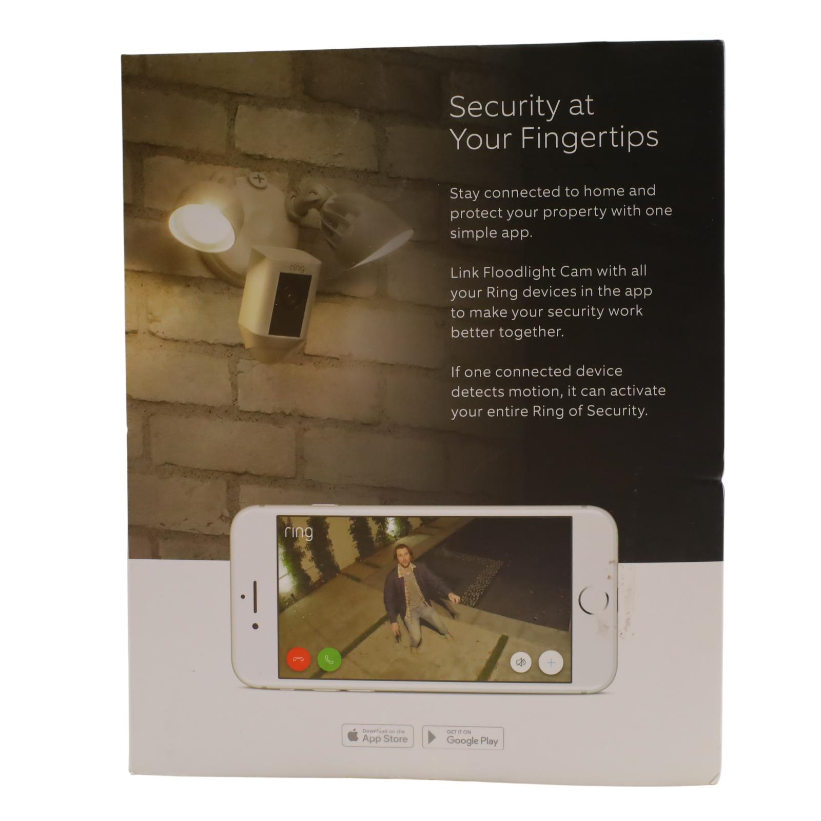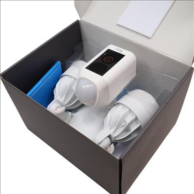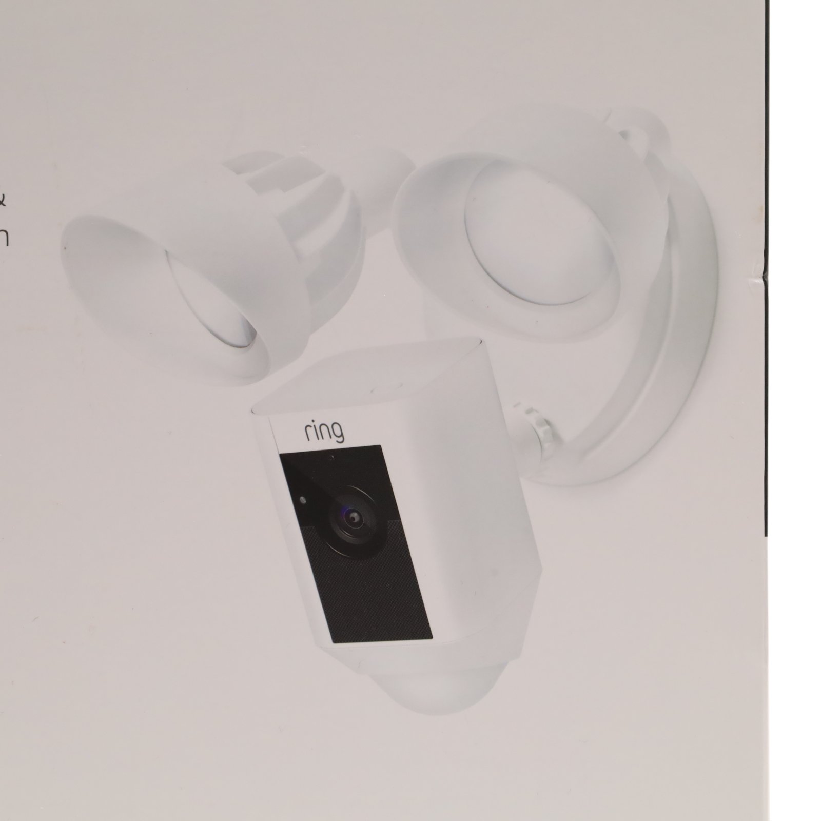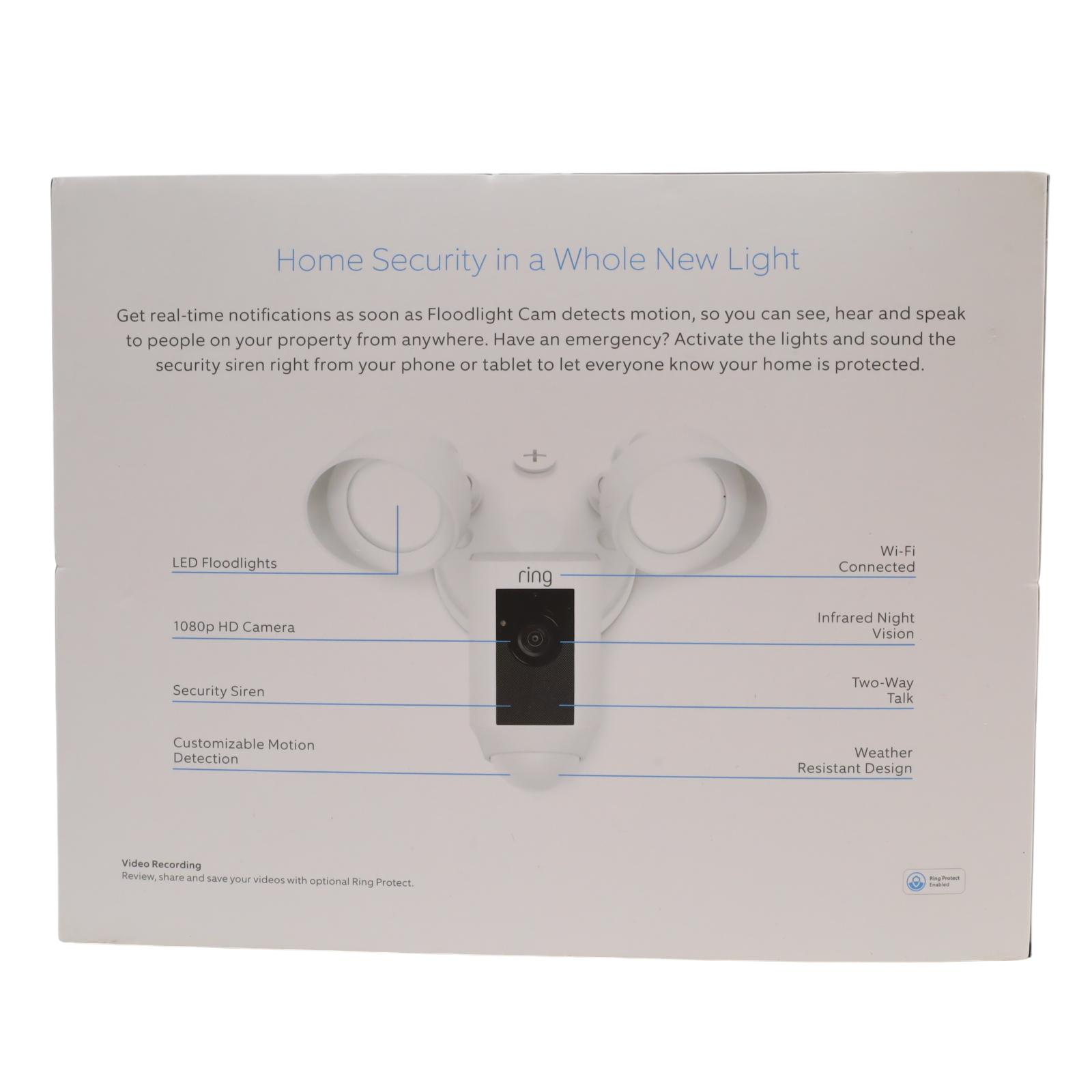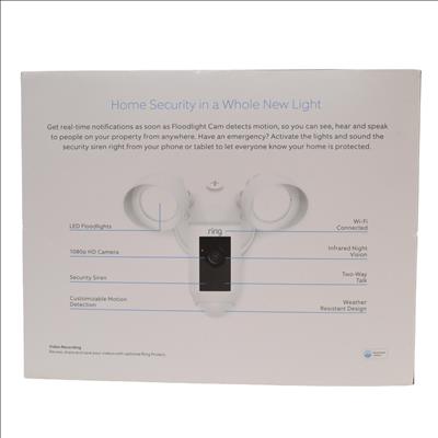A hardwired outdoor security camera that records in 1080p HD and activates two built-in LED floodlights when motion is detected. It features customizable motion zones, infrared night vision, and a built-in siren for added security. The device provides real-time alerts to your phone or tablet and supports two-way audio so you can hear and speak to visitors directly. Live View access allows you to check in anytime, and the unit is designed to help cover blind spots and improve visibility around your property.