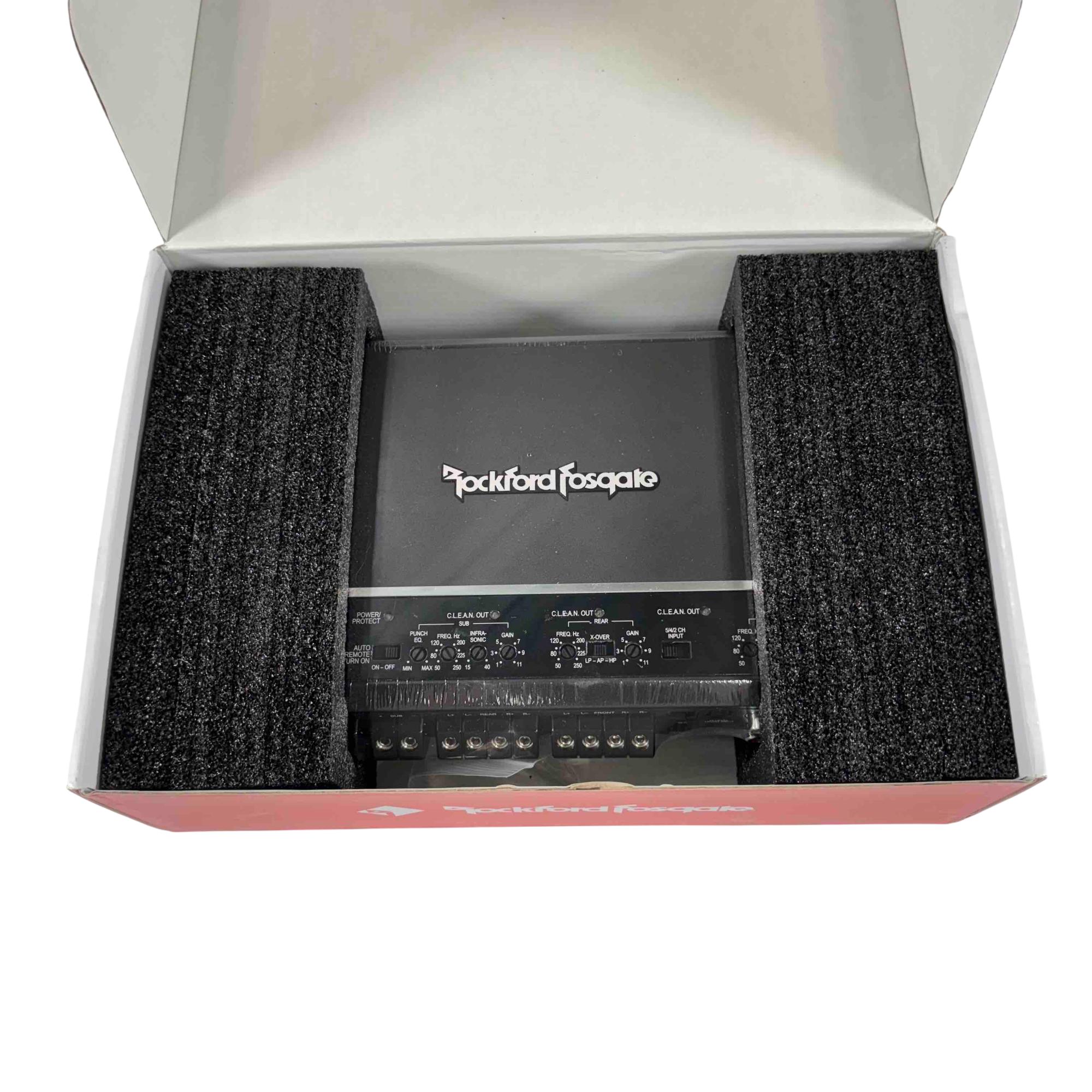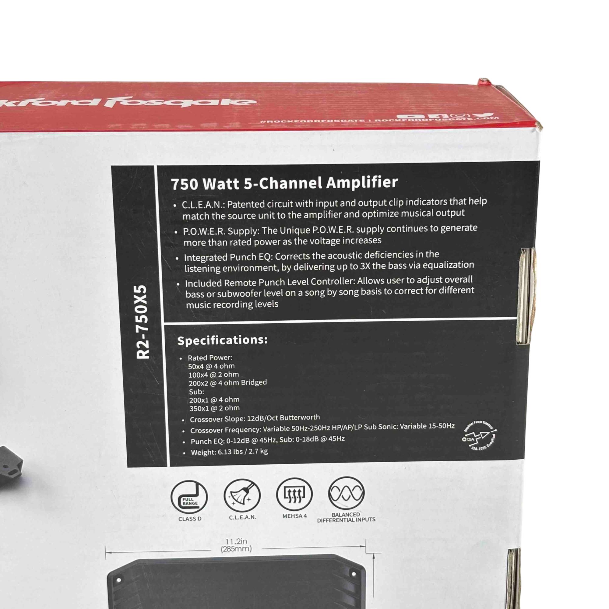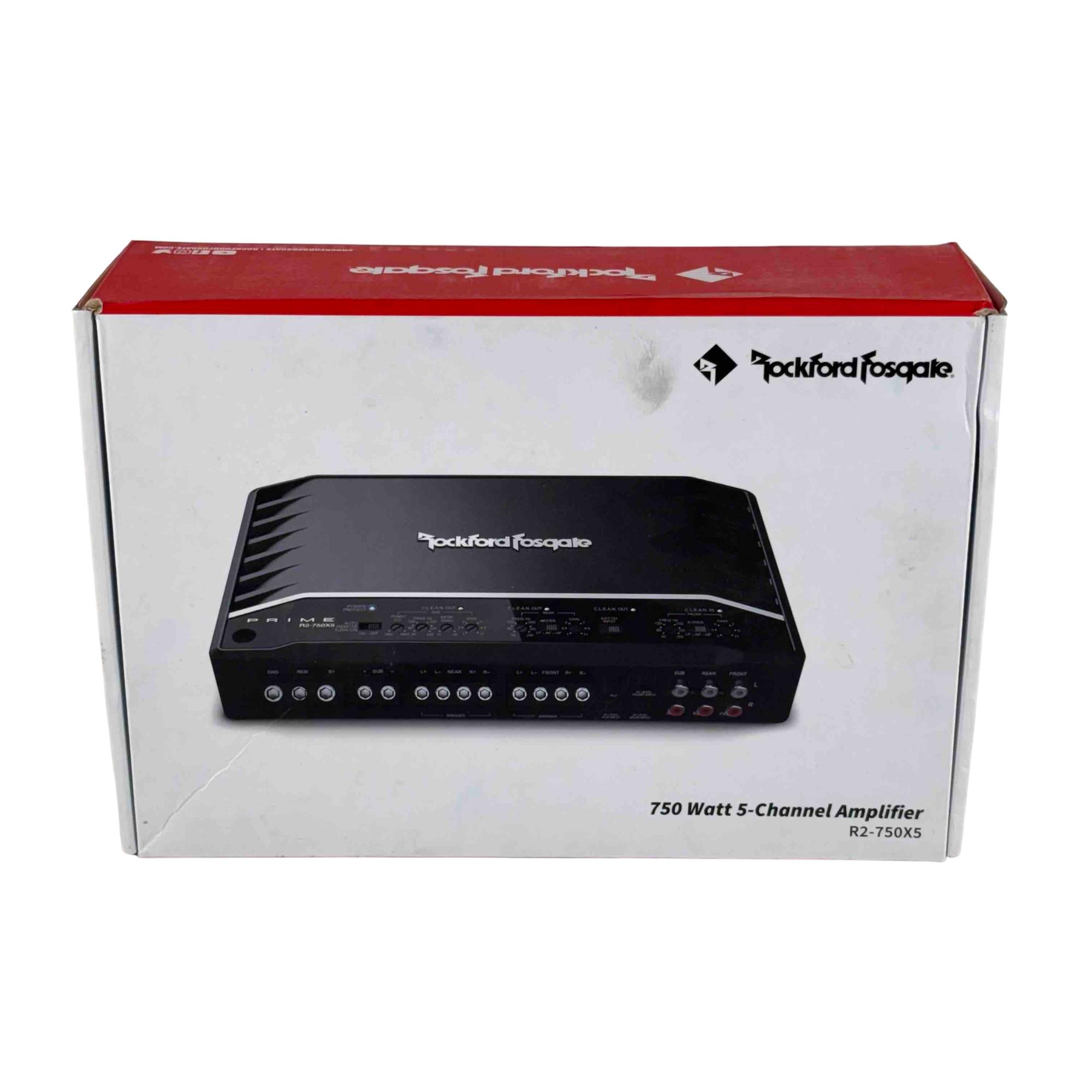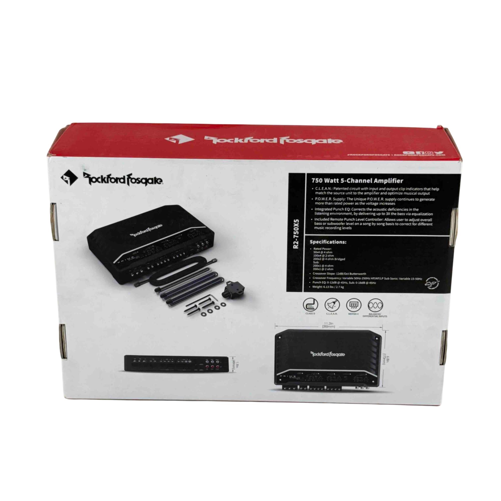 The Rockford Fosgate Prime R2-750X5 is a compact Class-D 5-channel car amplifier delivering 750 watts of RMS power for powerful, efficient performance. It features C.L.E.A.N. circuitry for precise gain adjustment, a P.O.W.E.R. supply that boosts output with voltage, and integrated Punch EQ for enhanced bass. With adjustable 12 dB/octave crossovers, balanced differential inputs, RCA pass-through outputs, and top-mounted controls, it provides clean, customizable sound in a space-saving design.