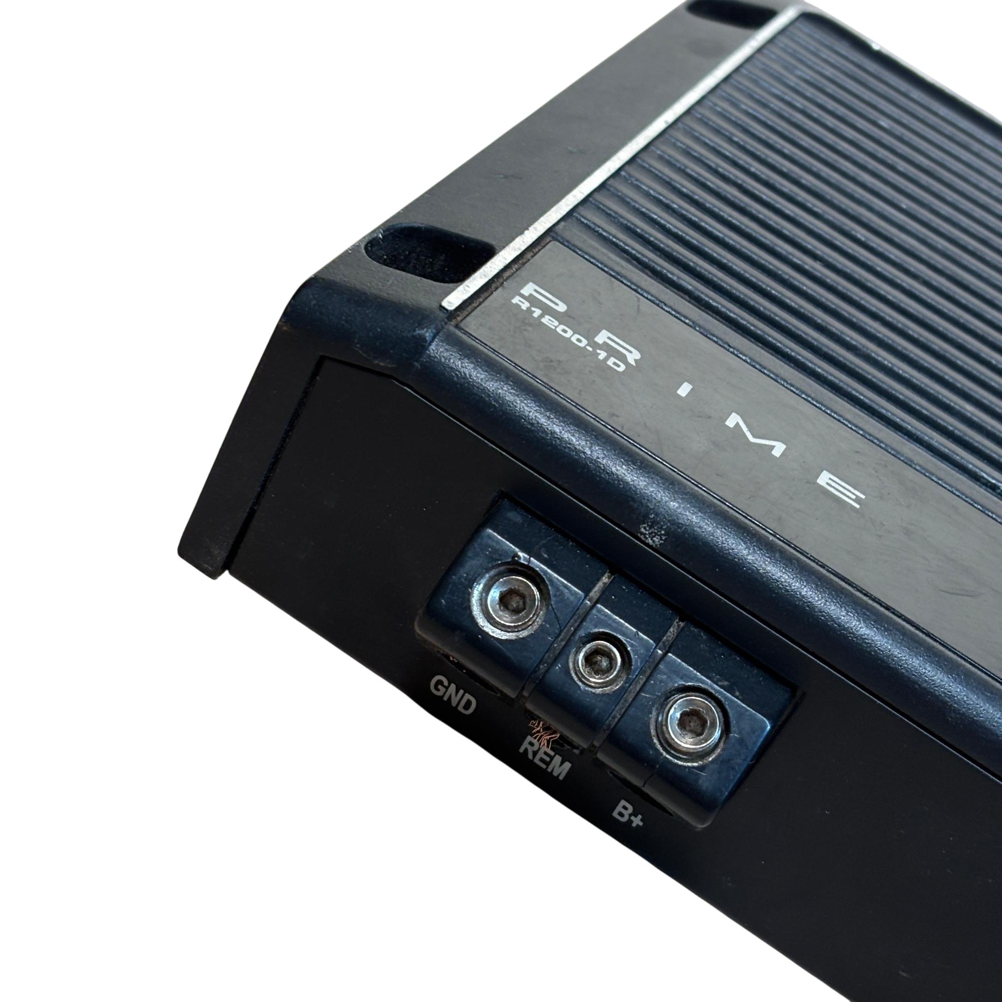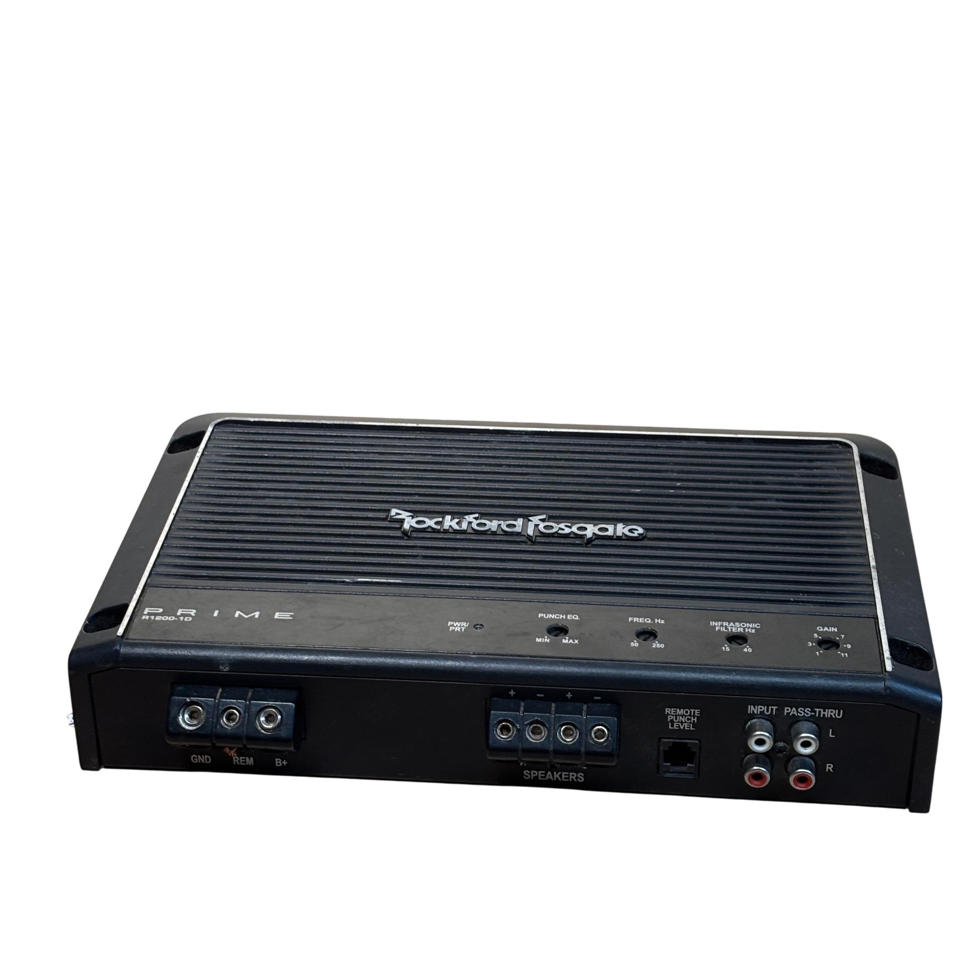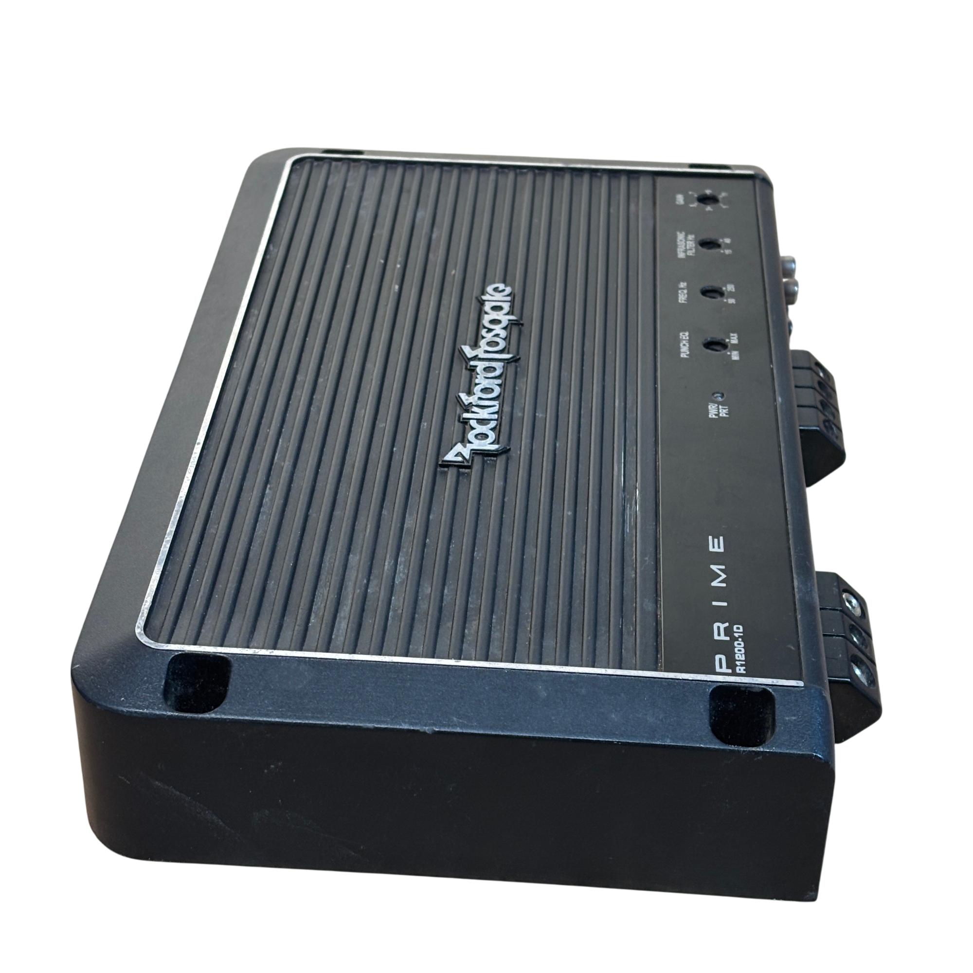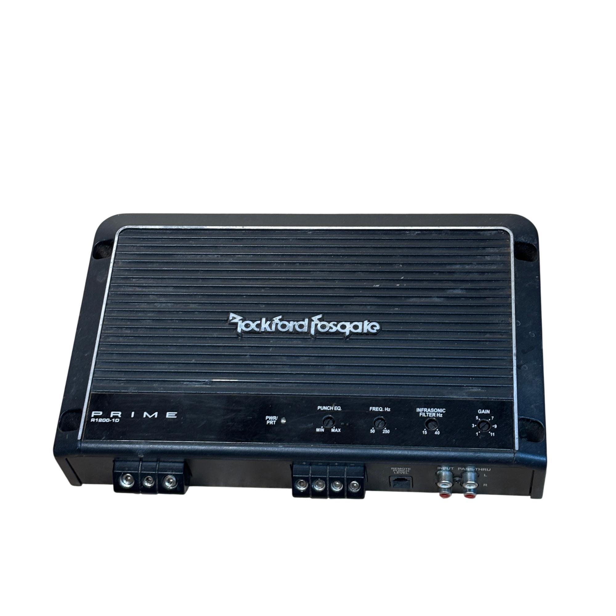 Rockford Fosgate Prime R1200-1D 1,200 Watt Class-D Mono Car Amplifier delivers powerful and efficient performance with a sleek black design. This amplifier features precise control options including punch EQ, frequency adjustments, and gain for tailored sound quality. Engineered for high output and durability, it is ideal for enhancing car audio systems with deep, robust bass.