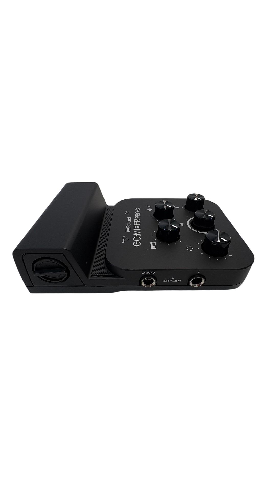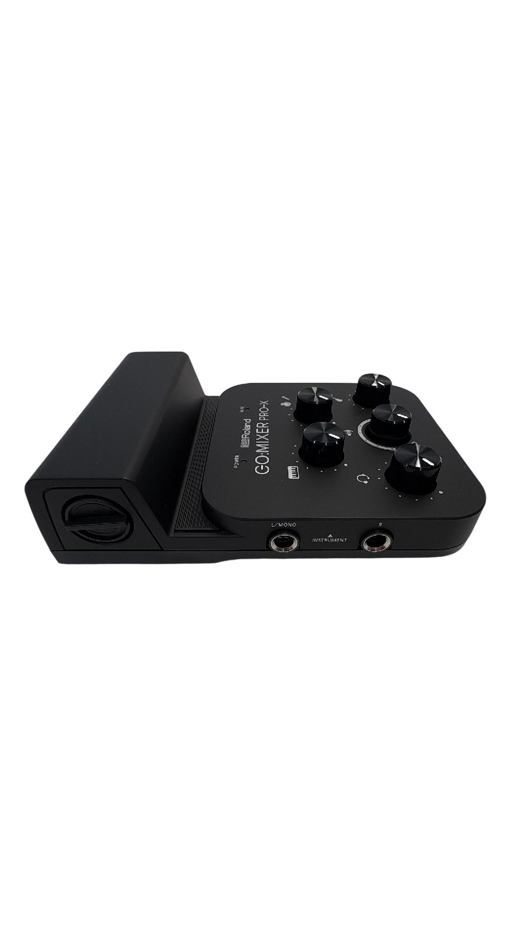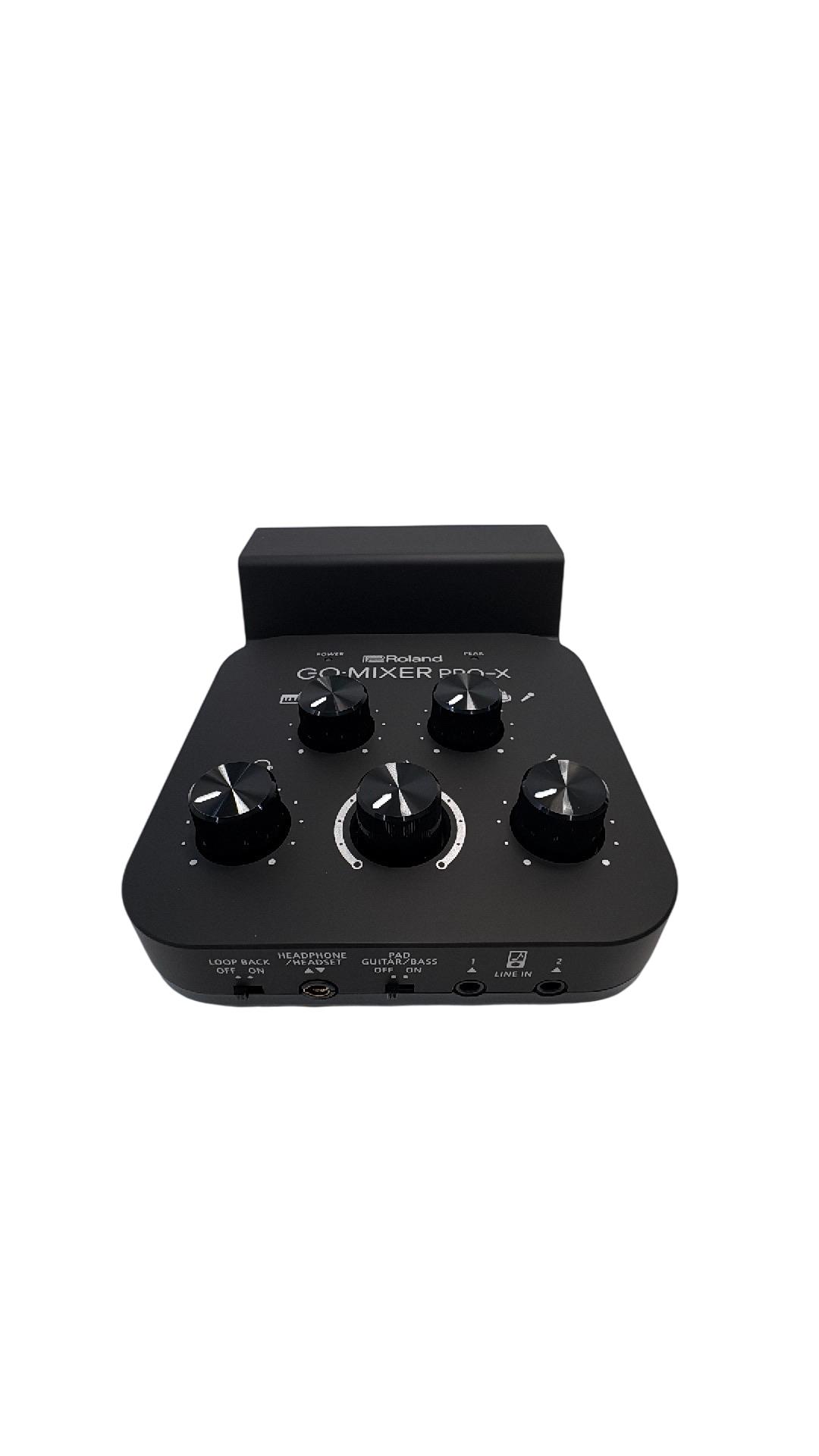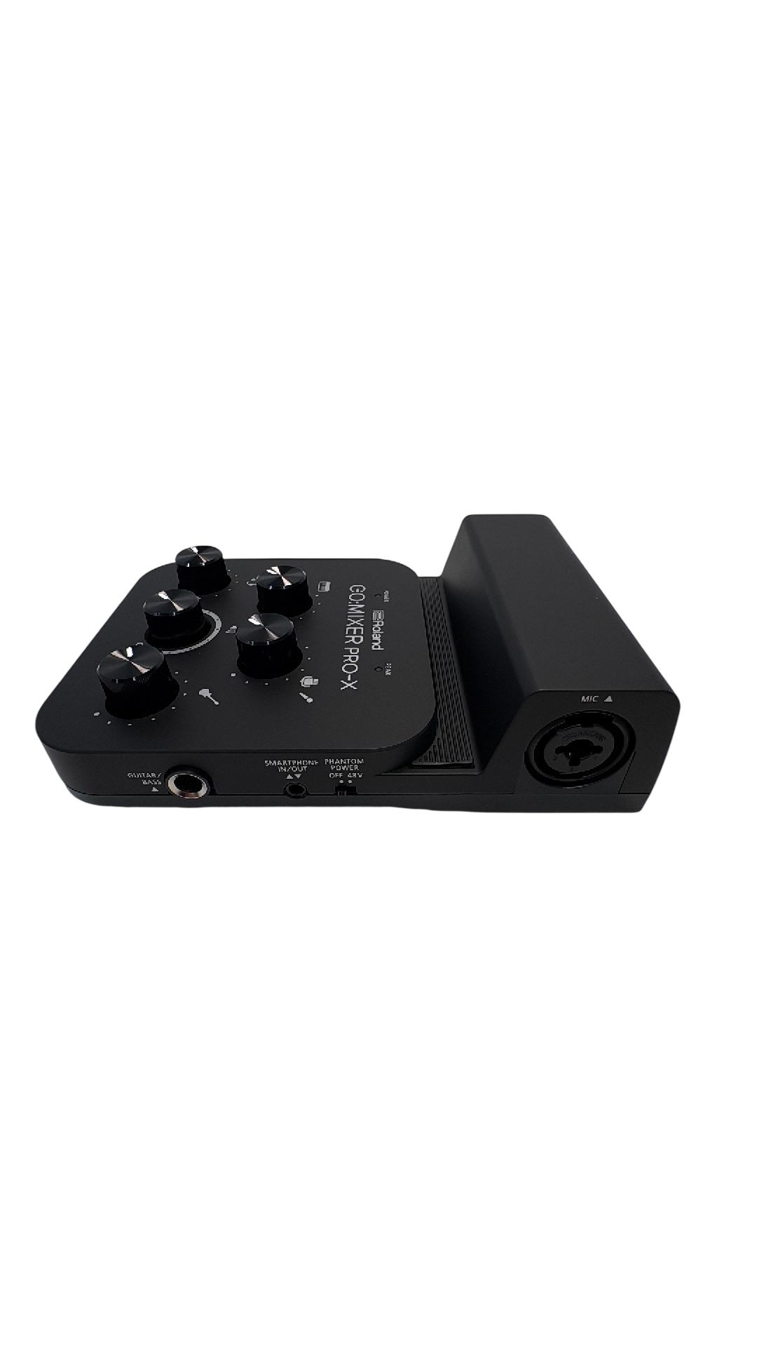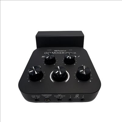 The Roland GO:MIXER PRO-X Audio Mixer for Smartphones is a compact and versatile audio mixer designed for seamless sound control during live streaming and recording. Featuring multiple knobs and buttons, it offers precise adjustment of audio inputs with clear labeling for professional-grade mixing performance. Its sleek black design combined with intuitive controls makes it ideal for content creators seeking high-quality smartphone audio solutions.