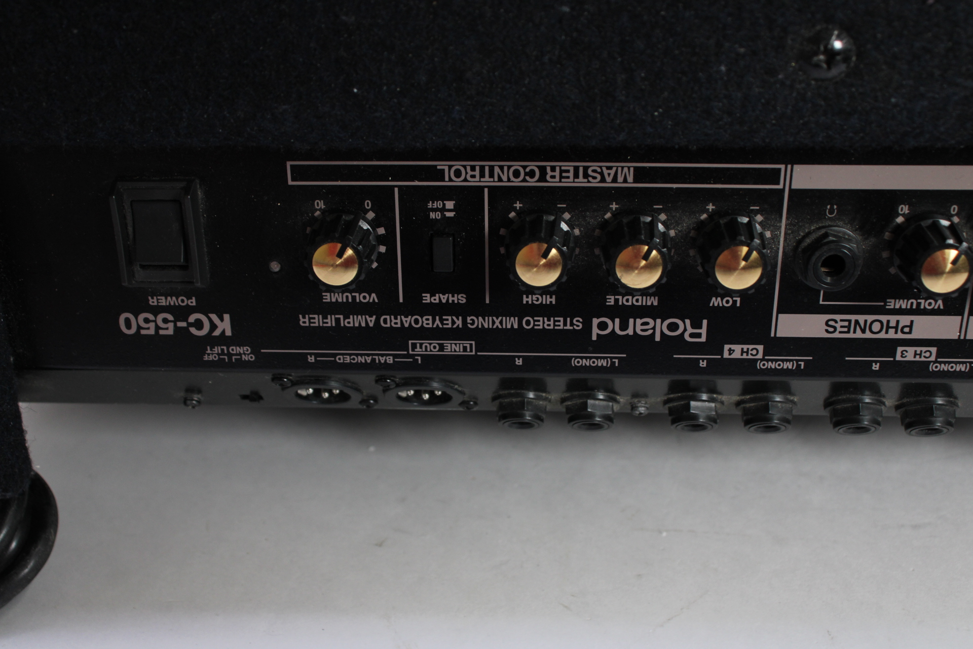 The KC-550 boasts 180 watts of powerful sound via a 15-inch speaker and horn tweeter. In addition to its four input channels, this flagship amp includes an Output Select switch for selecting the monitor sound destination, a Shape switch for quick sound adjustment and an XLR Line output for direct connection to a mixing console.