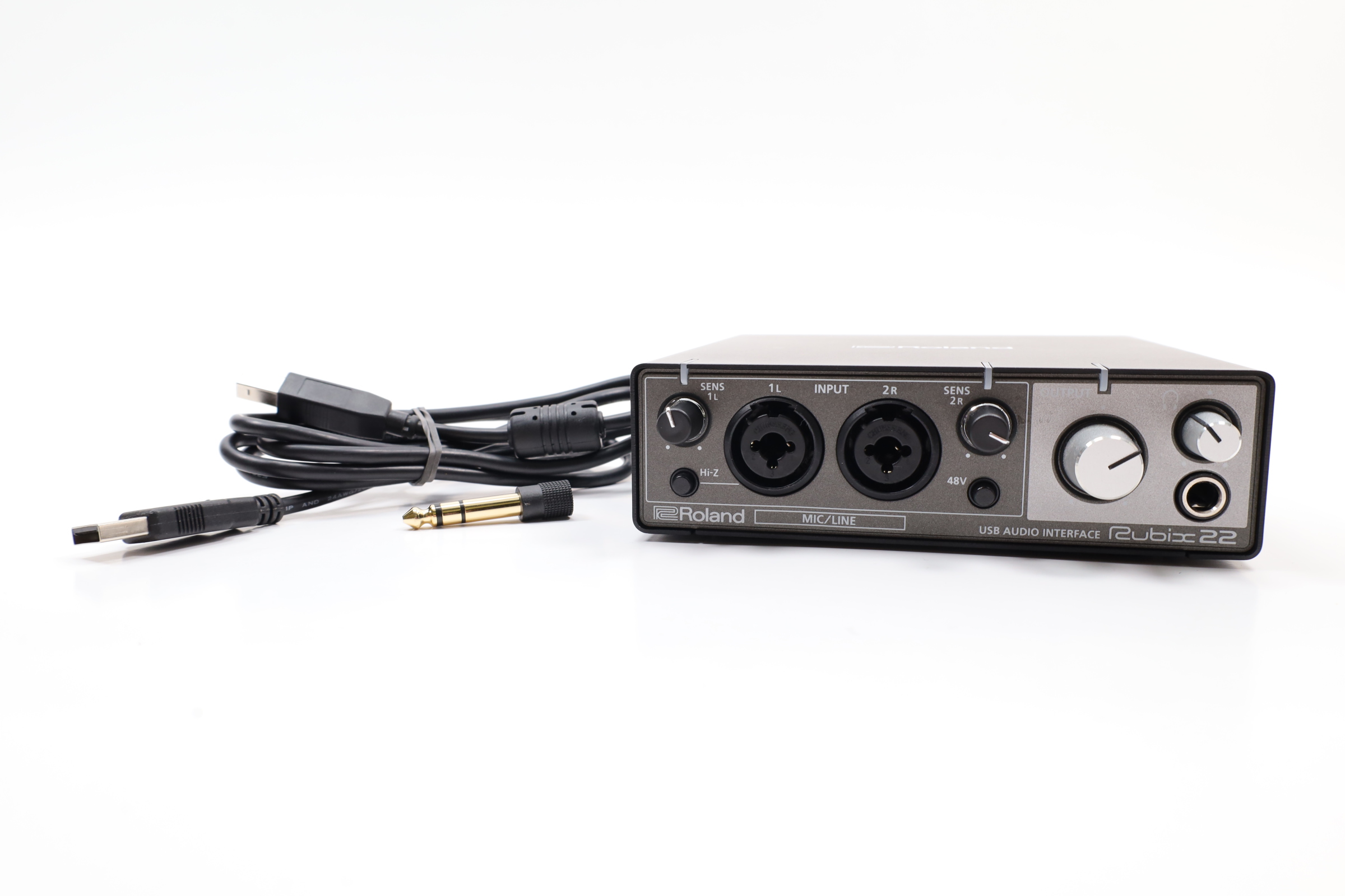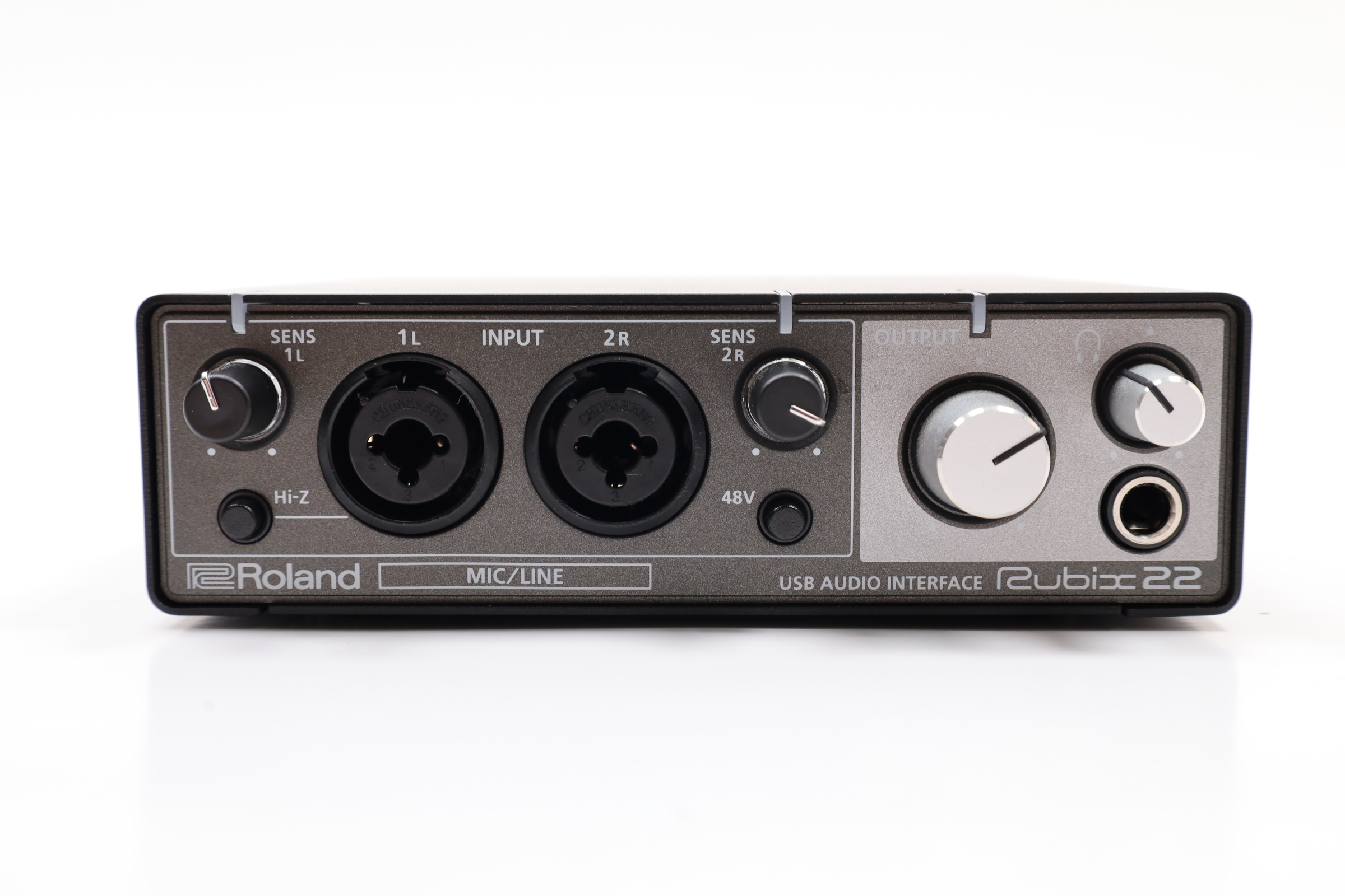 A 2-channel USB audio interface designed for mobile recording and live or studio use. It supports up to 24-bit/192kHz high-resolution audio and features two low-noise microphone preamplifiers with extensively shielded construction to prevent noise. The interface includes a universal ground-lift switch to eliminate 60Hz AC hum and offers MIDI I/O for connecting keyboards and controllers. Ports include two XLR-1/4" combo inputs (mic/line/Hi-Z), two 1/4" analog outputs, a 1/4" headphone jack, MIDI In/Out, one USB Type B, and one USB Micro-B. The Rubix 22 is built with a shielded metal chassis for durability and noise prevention.