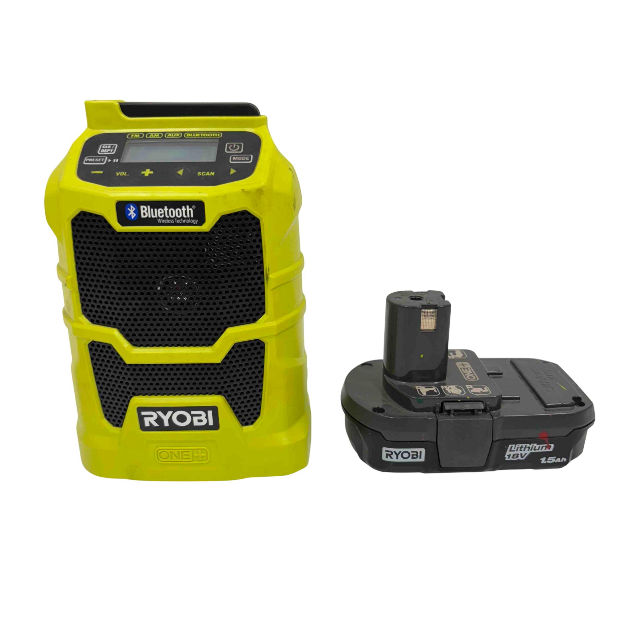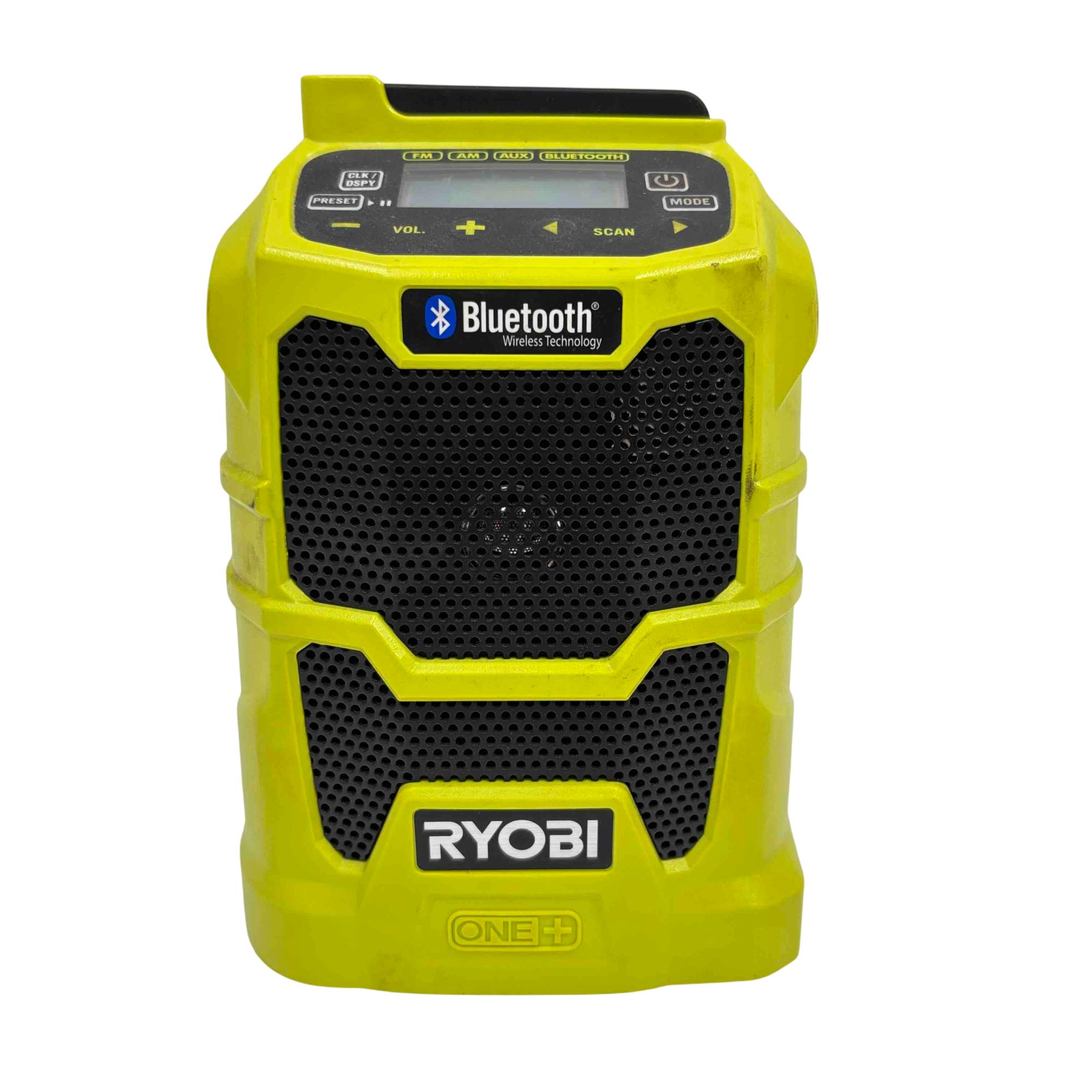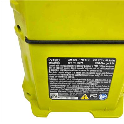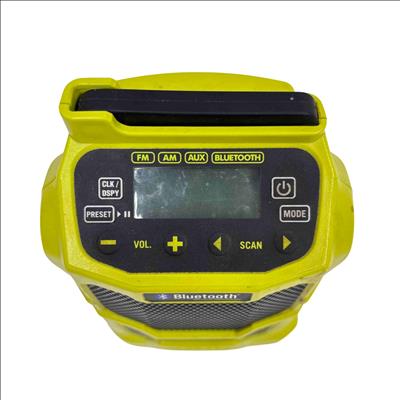 Enjoy your favorite music anywhere with the Ryobi 18V ONE+ Compact Radio, featuring FM, AM, AUX, and Bluetooth wireless technology. Designed for the jobsite or home, this robust yellow and black radio is powered by Ryobi's versatile ONE+ 18V lithium-ion battery system, offering portability, durability, and clear sound. Its compact design, LCD screen, and multiple listening modes make it an essential companion for work or play.