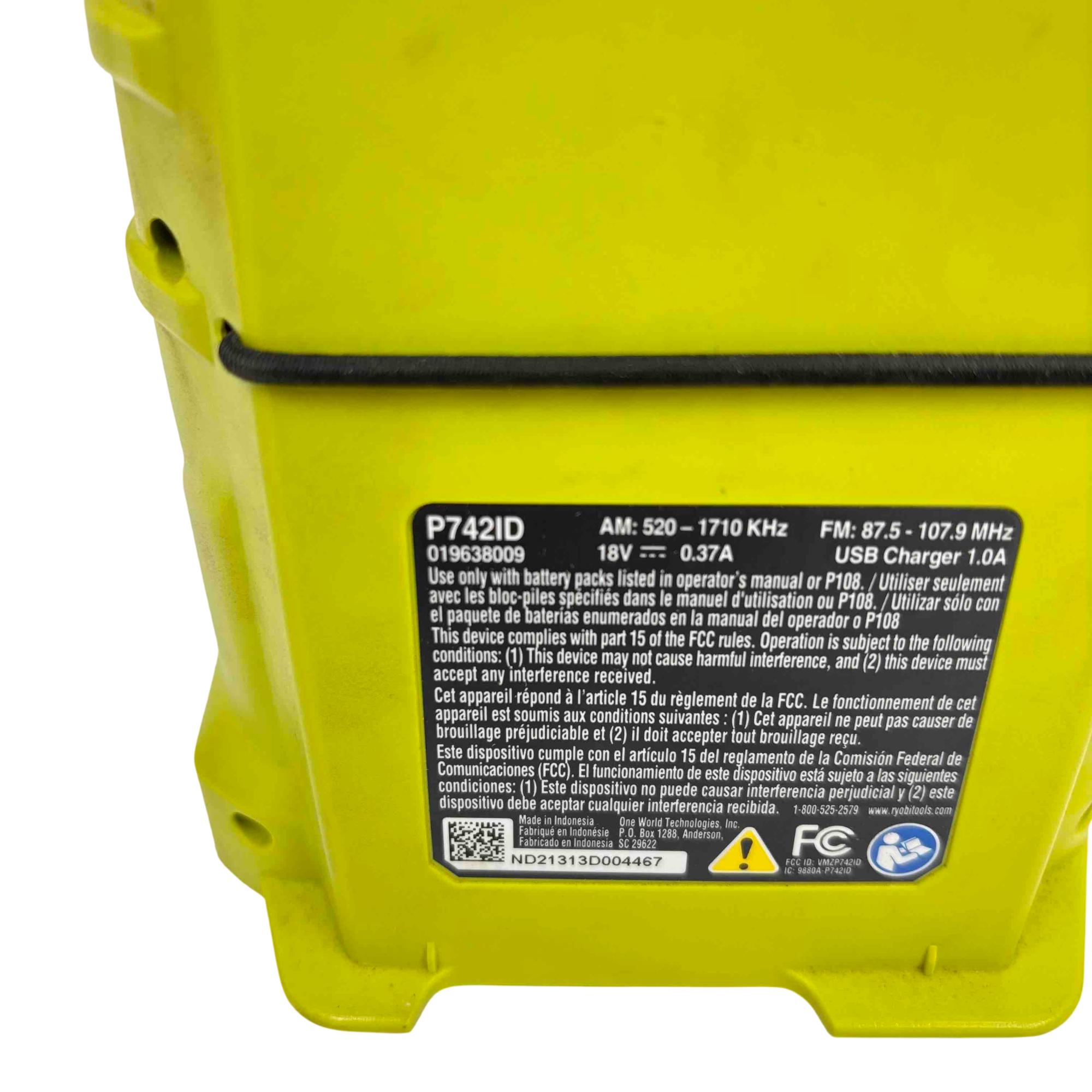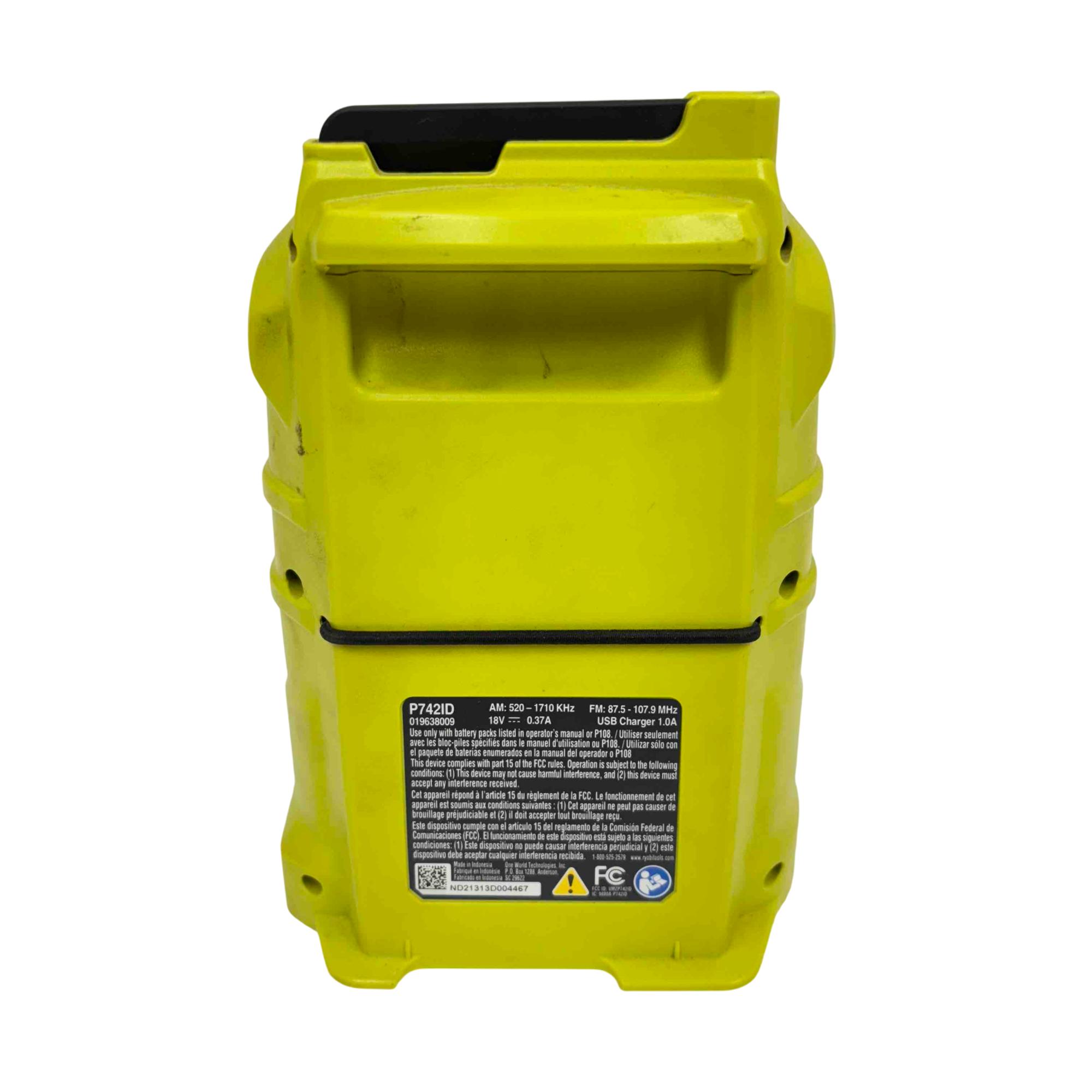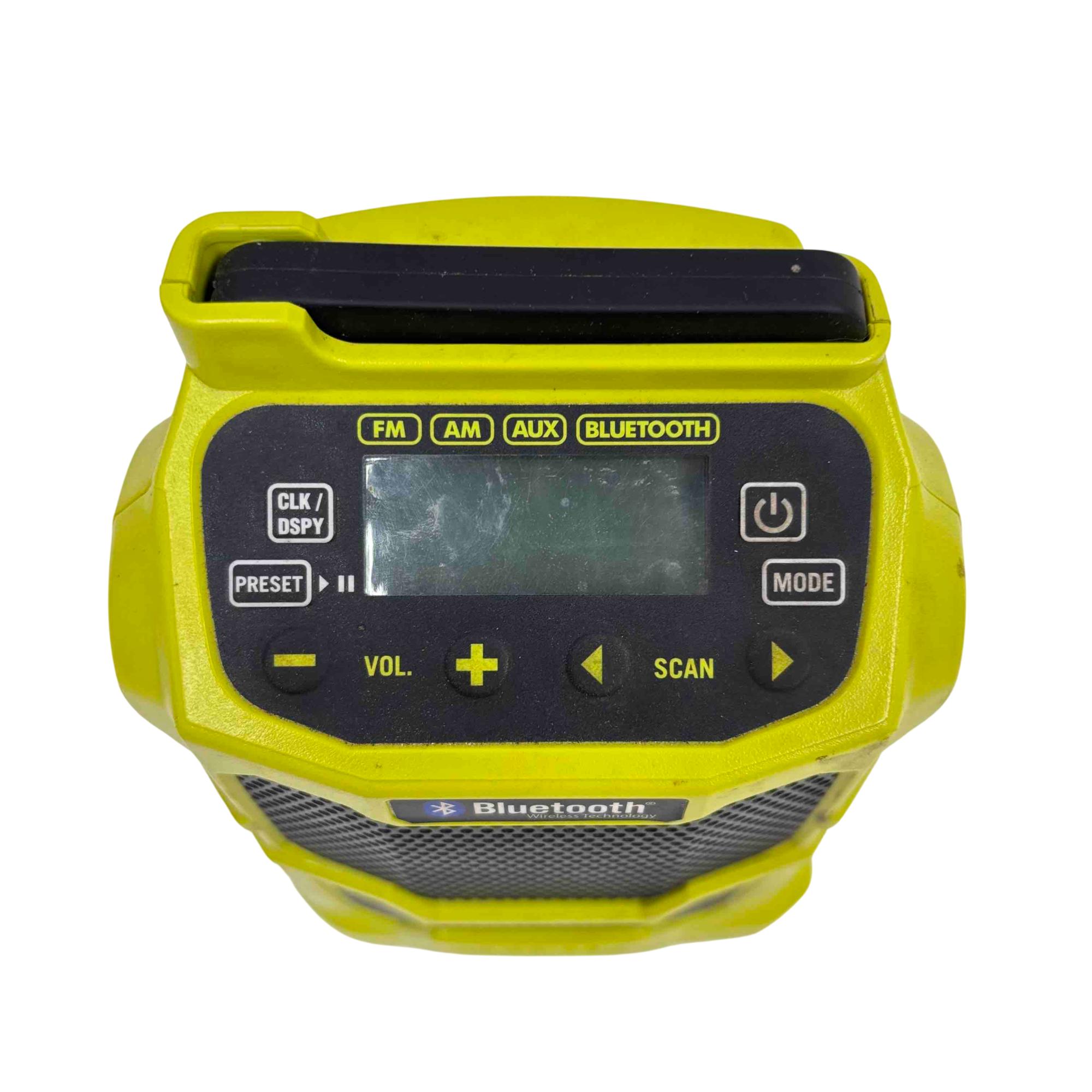 Enjoy your favorite music anywhere with the Ryobi 18V ONE+ Compact Radio, featuring FM, AM, AUX, and Bluetooth wireless technology. Designed for the jobsite or home, this robust yellow and black radio is powered by Ryobi's versatile ONE+ 18V lithium-ion battery system, offering portability, durability, and clear sound. Its compact design, LCD screen, and multiple listening modes make it an essential companion for work or play.