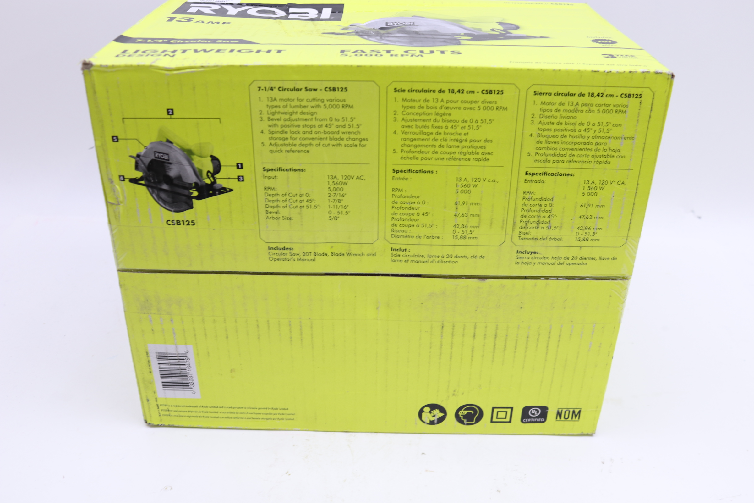 The powerful RYOBI 7-1/4 in. Circular Saw comes equipped with a contoured design and front pommel handle for added comfort and grip. With a 13 Amp motor and 20 tooth steel blade, this saw is ready for any job. With a 2-7/16 in. depth of cut at 0 degree , 1-7/8 in. depth of cut at 45 degree and 1-11/16 in. depth of cut at 51.5 degree . The RYOBI Circular Saw has an on-board wrench storage as well as adjustable depth of cut with scale for quick reference to improve user accuracy and convenience.
