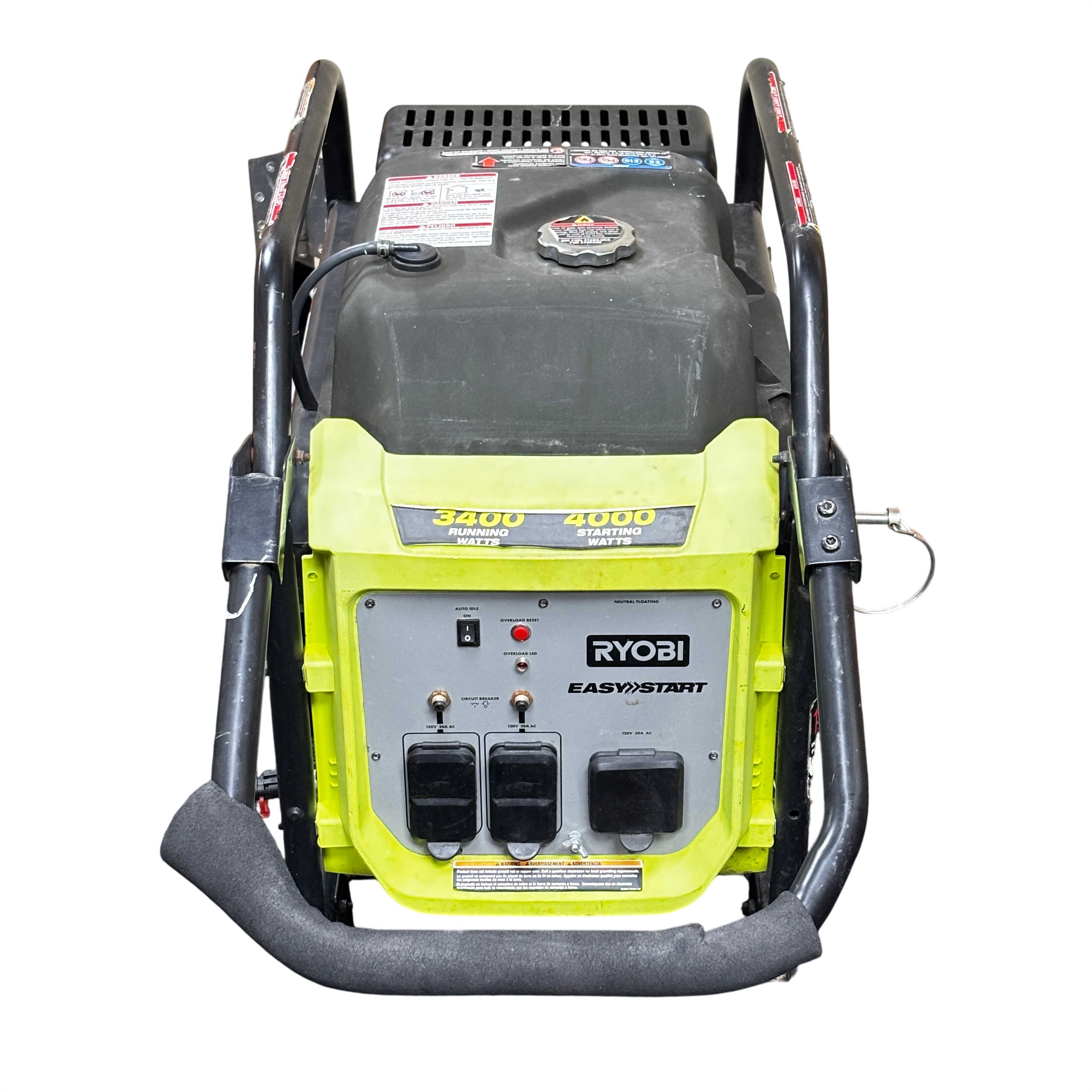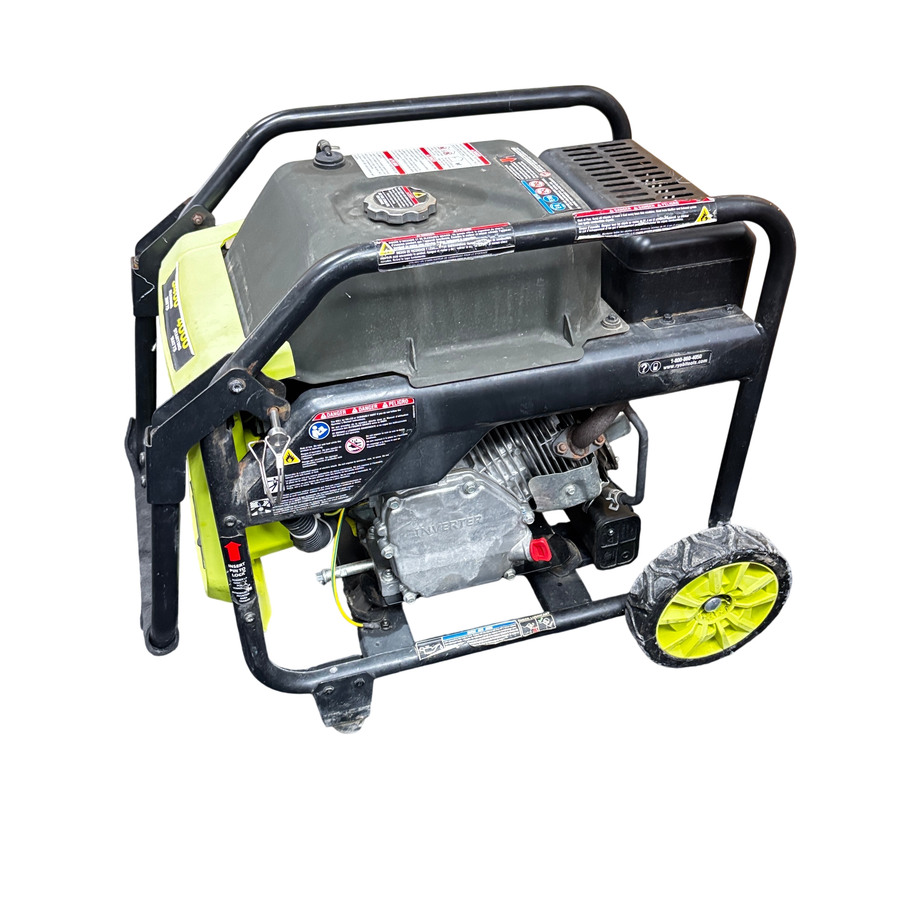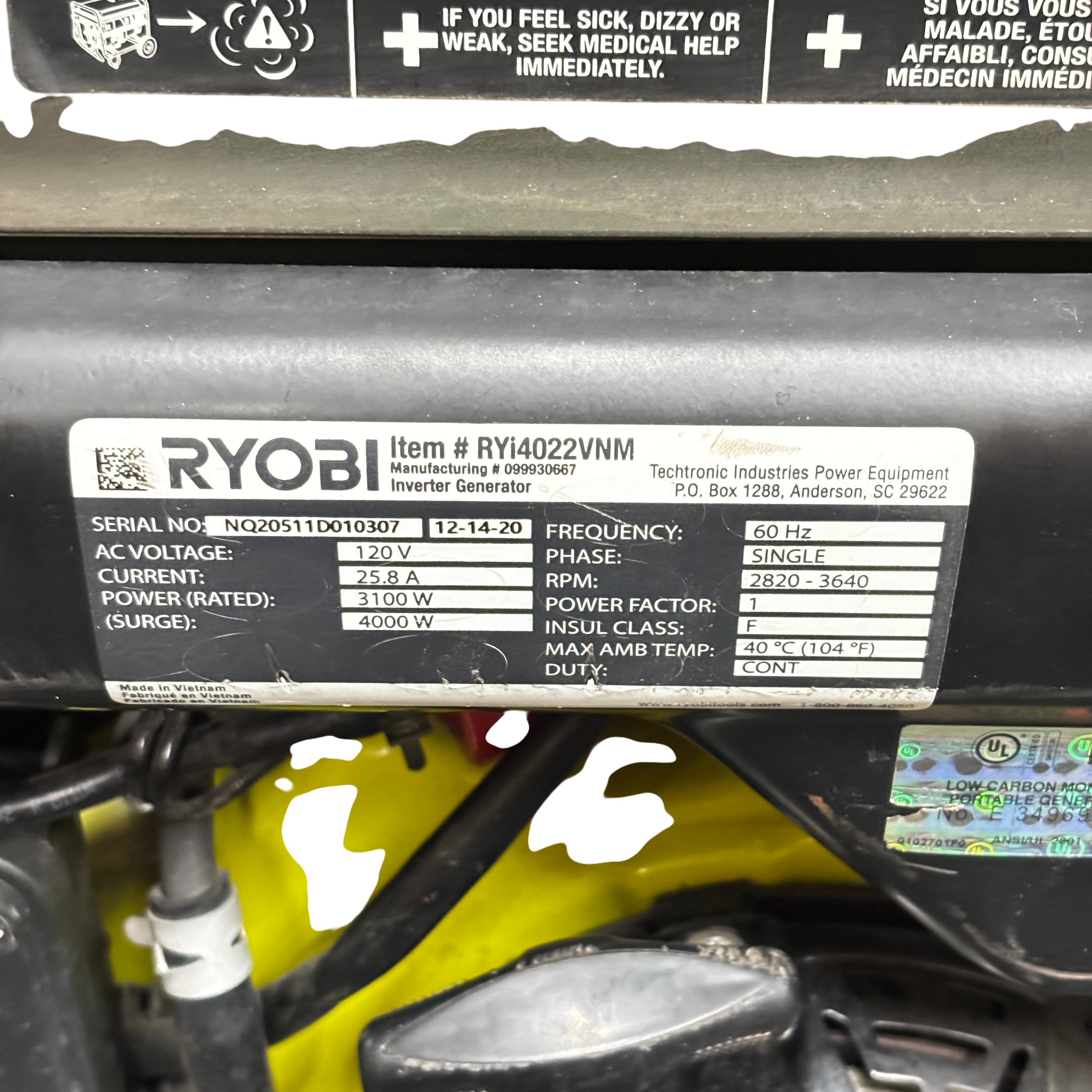 The Ryobi RYi4022VNM Inverter Generator delivers a rated power output of 3100 watts and a surge capacity of 4000 watts, making it ideal for powering tools and appliances during outages or on job sites. Featuring a 120V single-phase output and a variable RPM range of 2820 to 3640, this generator provides stable and efficient power. It includes Ryobi's Easy Start system for hassle-free operation and a CO Detect automatic carbon monoxide shutdown system for enhanced safety. The unit is built with a durable metal frame and compact design. This generator is perfect for homeowners and professionals seeking reliable portable power with advanced safety features.