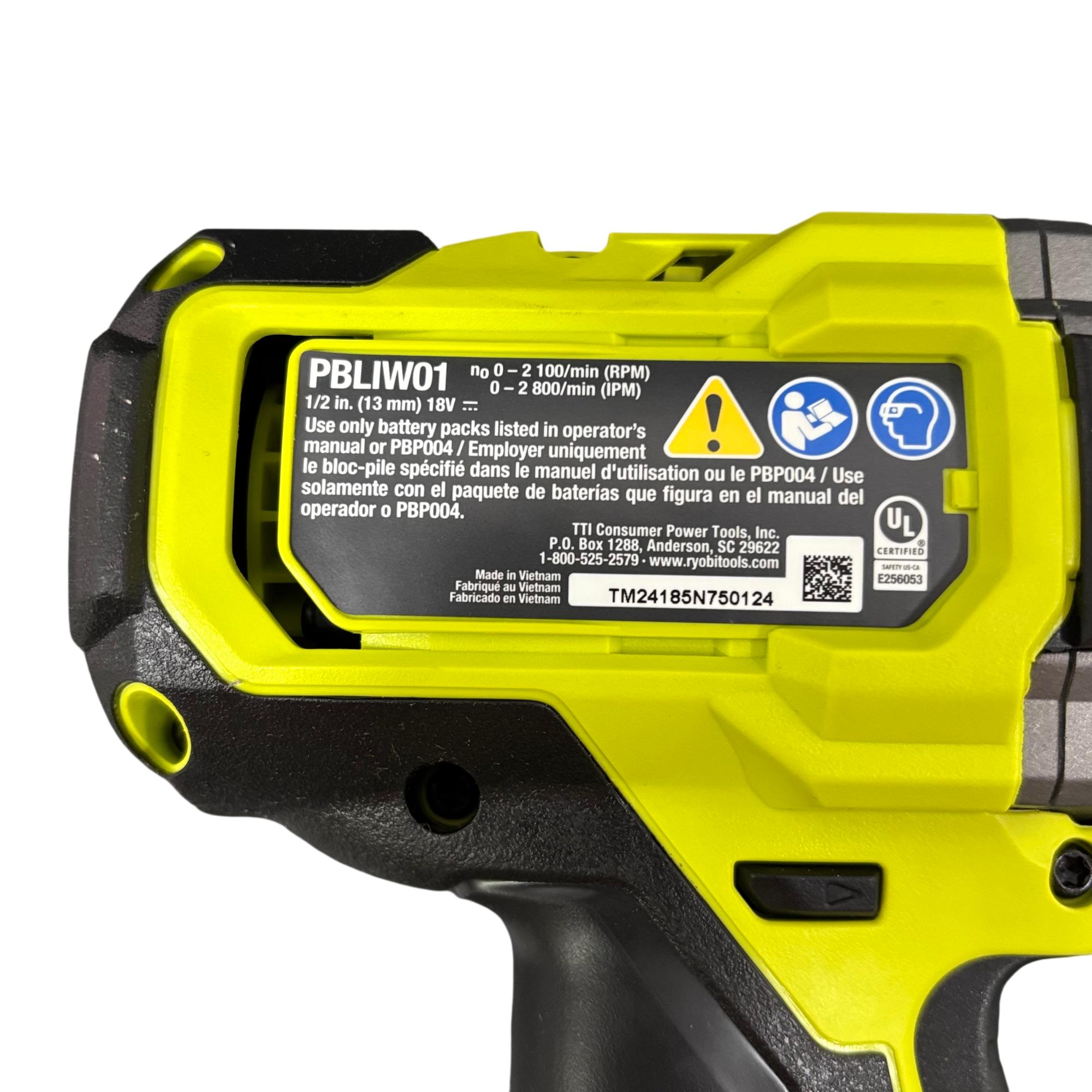 Ryobi ONE+ HP 18V Brushless Impact Wrench Model PBLIW01 delivers high-torque performance with its 1/2-inch drive and brushless motor technology for enhanced power and durability.