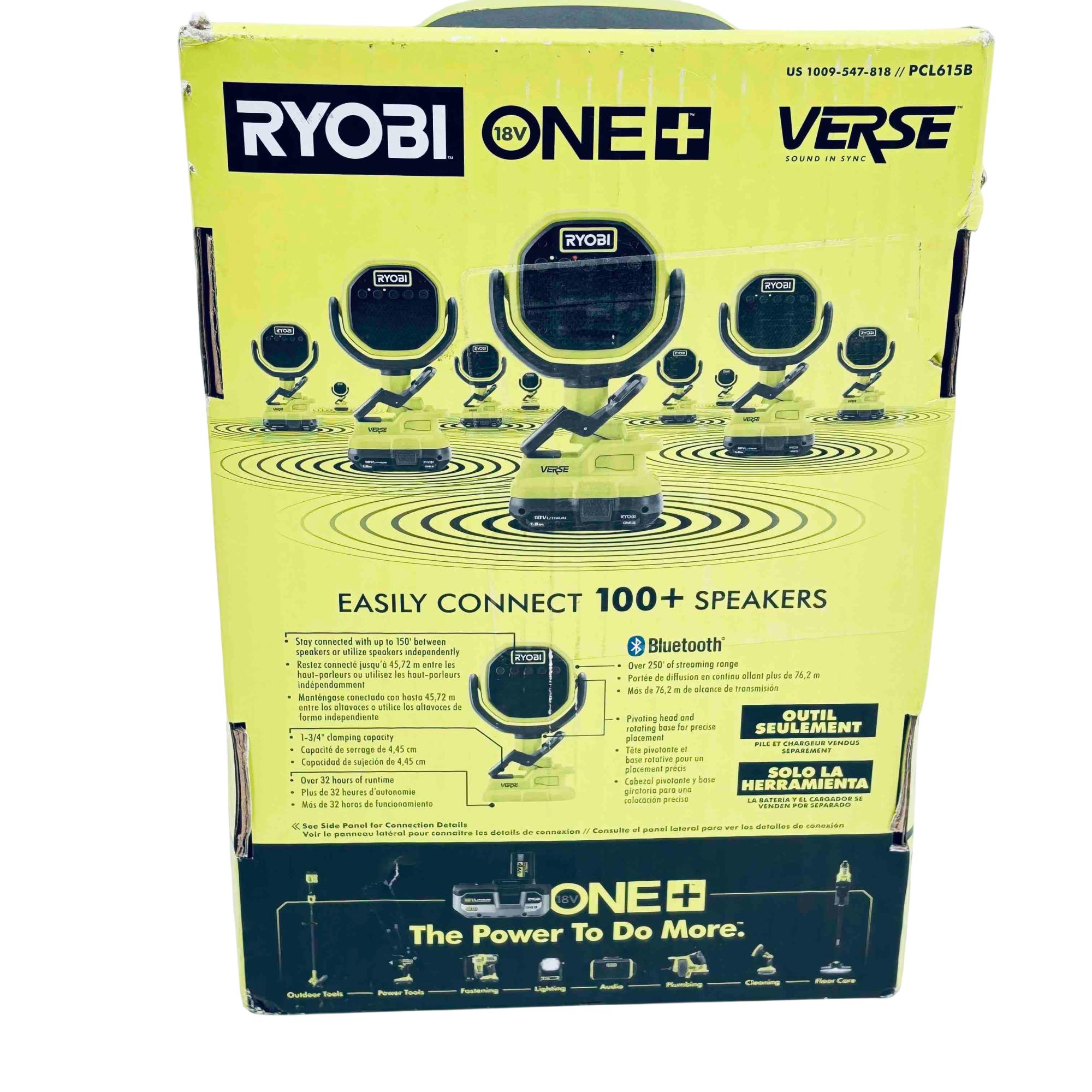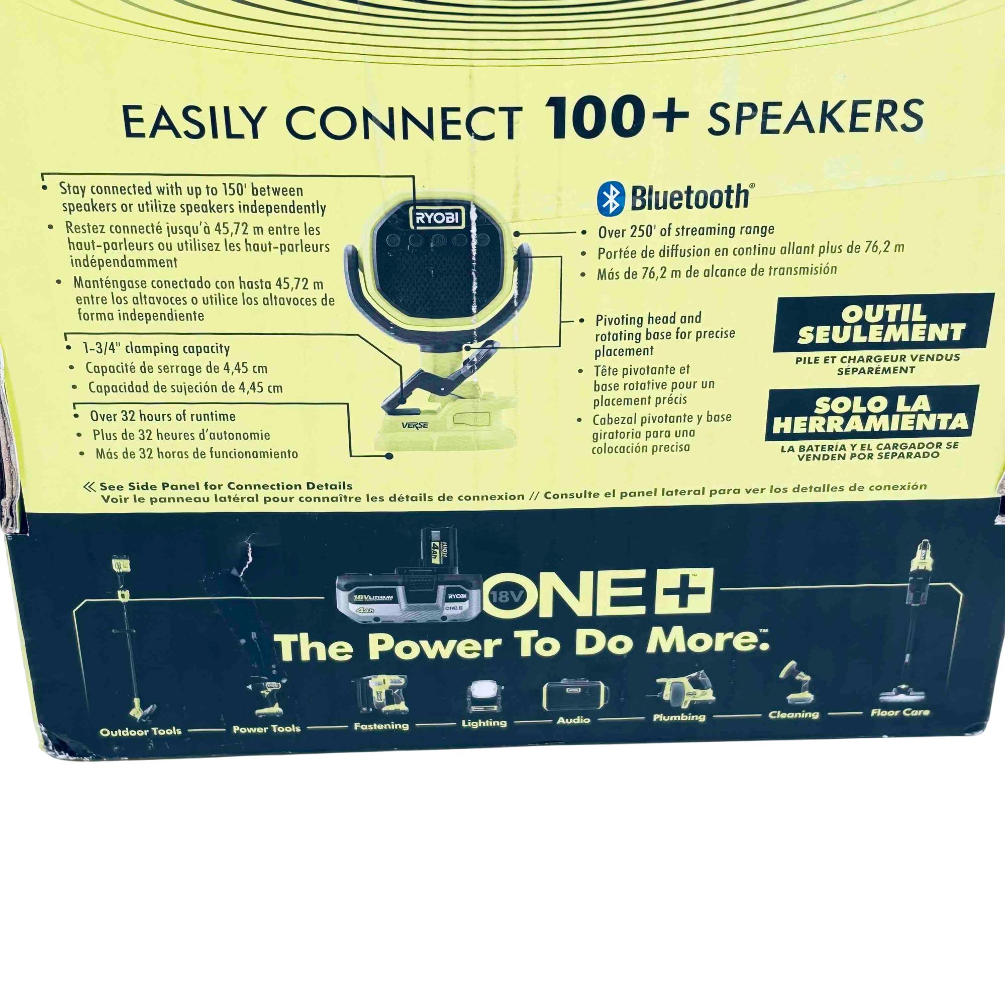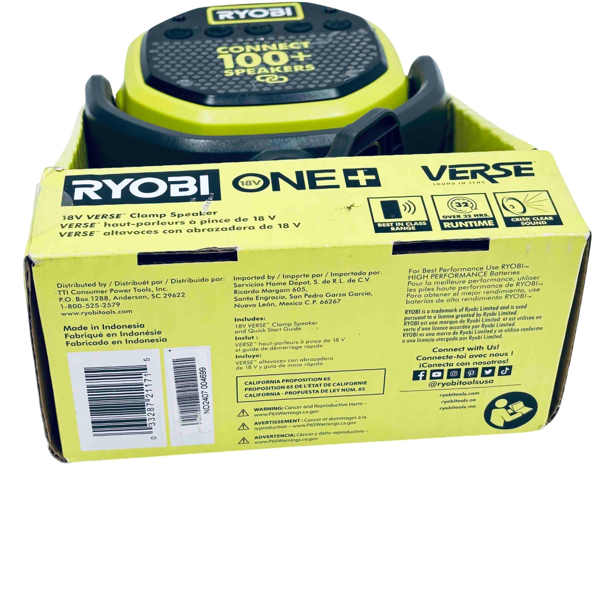 Experience powerful, portable sound anywhere with the Ryobi 18V ONE+ VERSE Clamp Bluetooth Speaker. Designed for professionals and DIYers, this versatile speaker easily clamps to various surfaces, features Bluetooth connectivity with a range of over 250 ft, and allows you to sync up with over 100+ compatible speakers for immersive audio. With up to 32 hours of runtime (battery sold separately), it’s the ultimate rugged audio companion for your workshop, jobsite, or outdoor adventures.