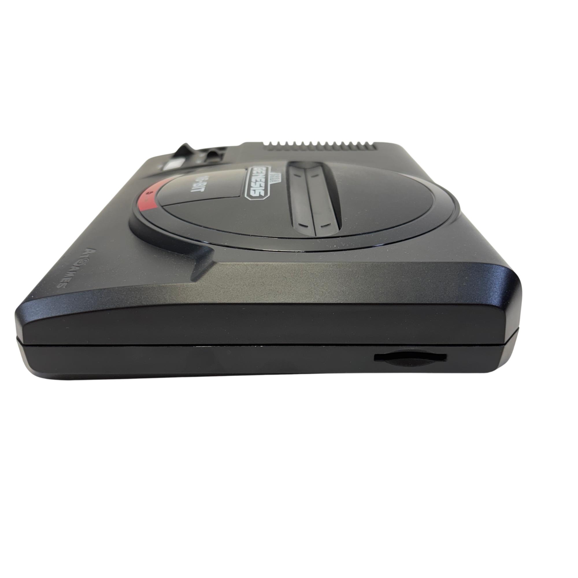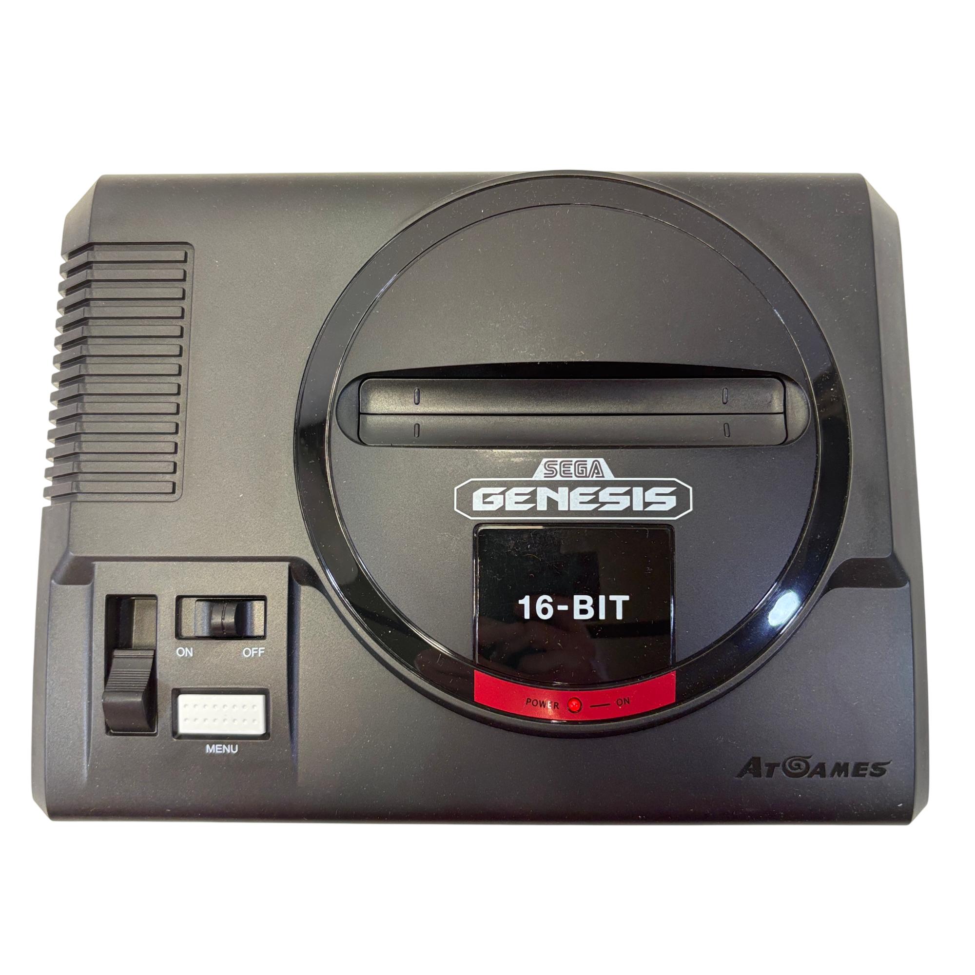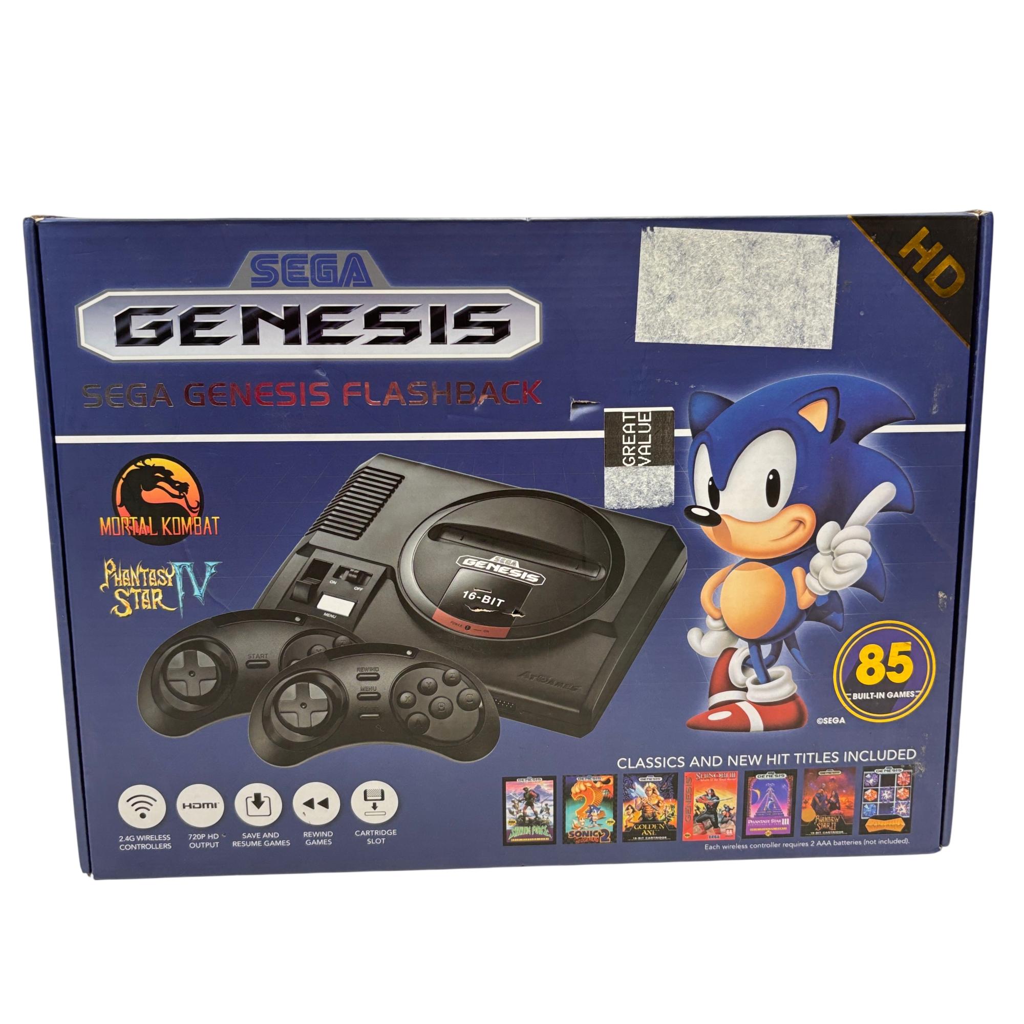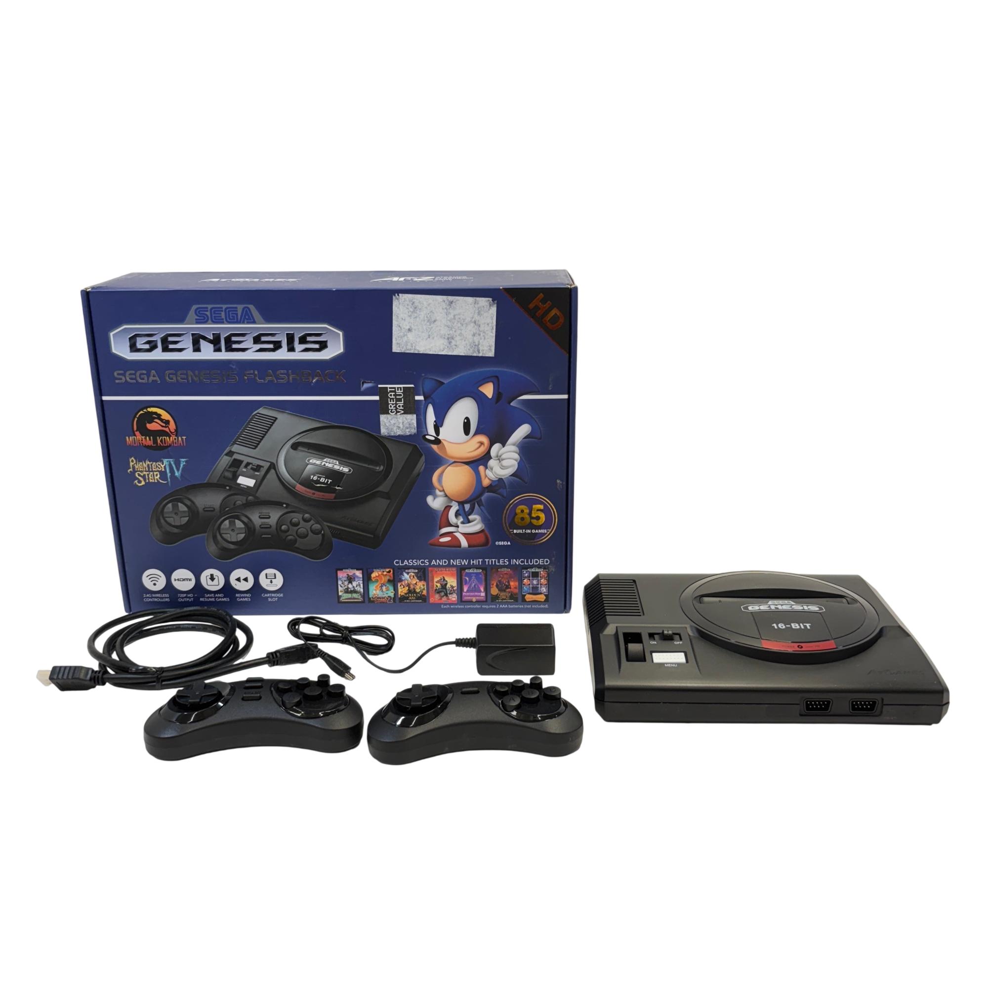 The SEGA Genesis Flashback Console by AtGames offers a classic gaming experience with 85 built-in titles that include both timeless classics and new hit games. This black rectangular video game console features HDMI output, providing high-definition gameplay, and comes with controllers designed for comfortable and precise control. Its 16-bit design faithfully replicates the original SEGA Genesis system, making it ideal for retro gaming enthusiasts.