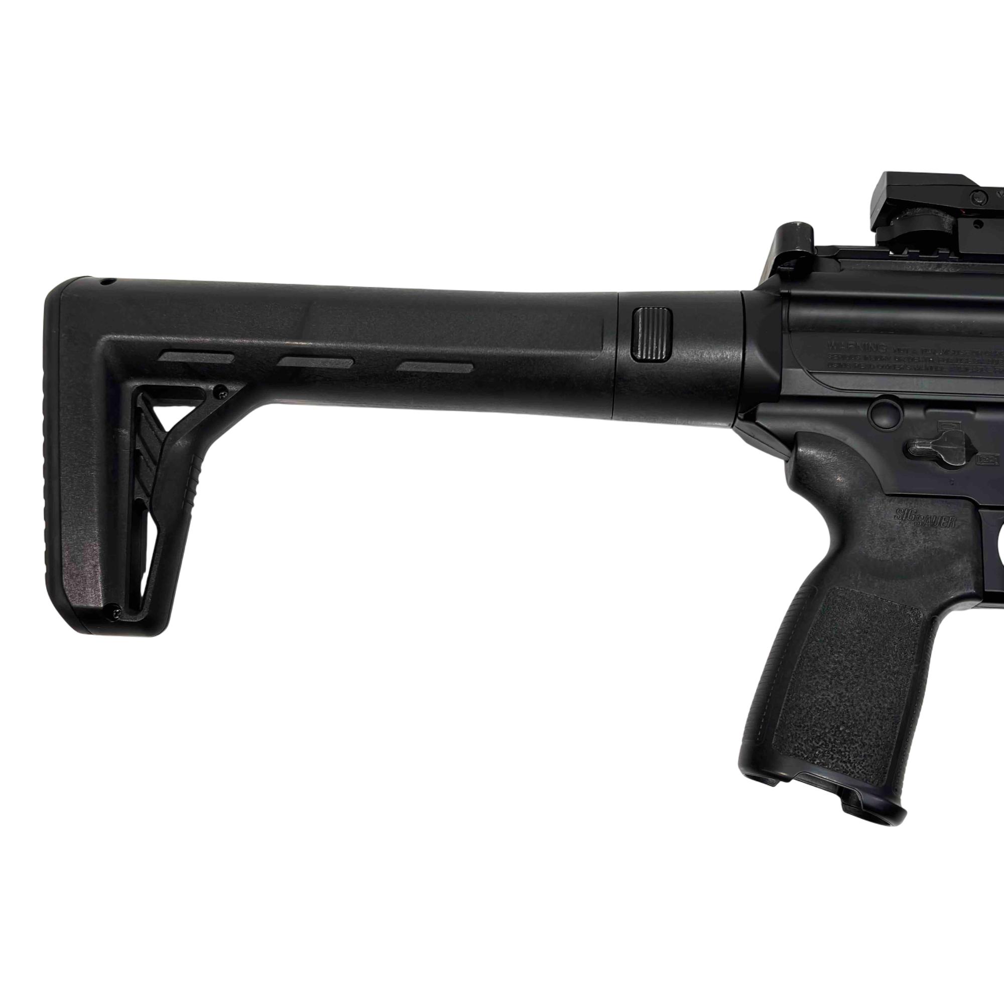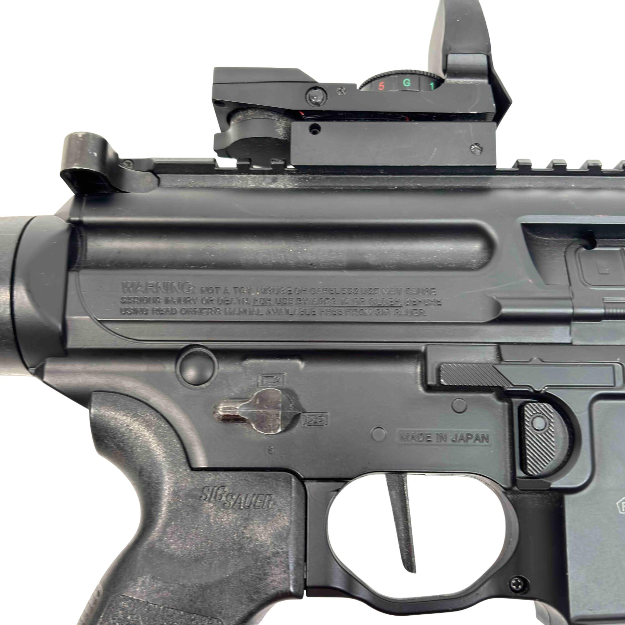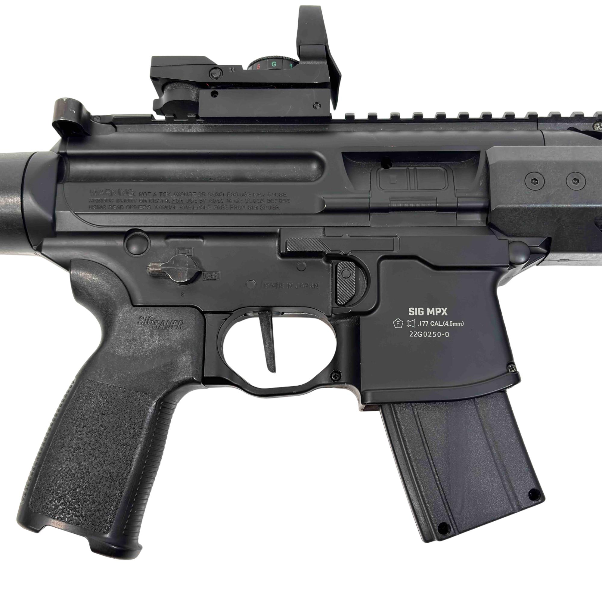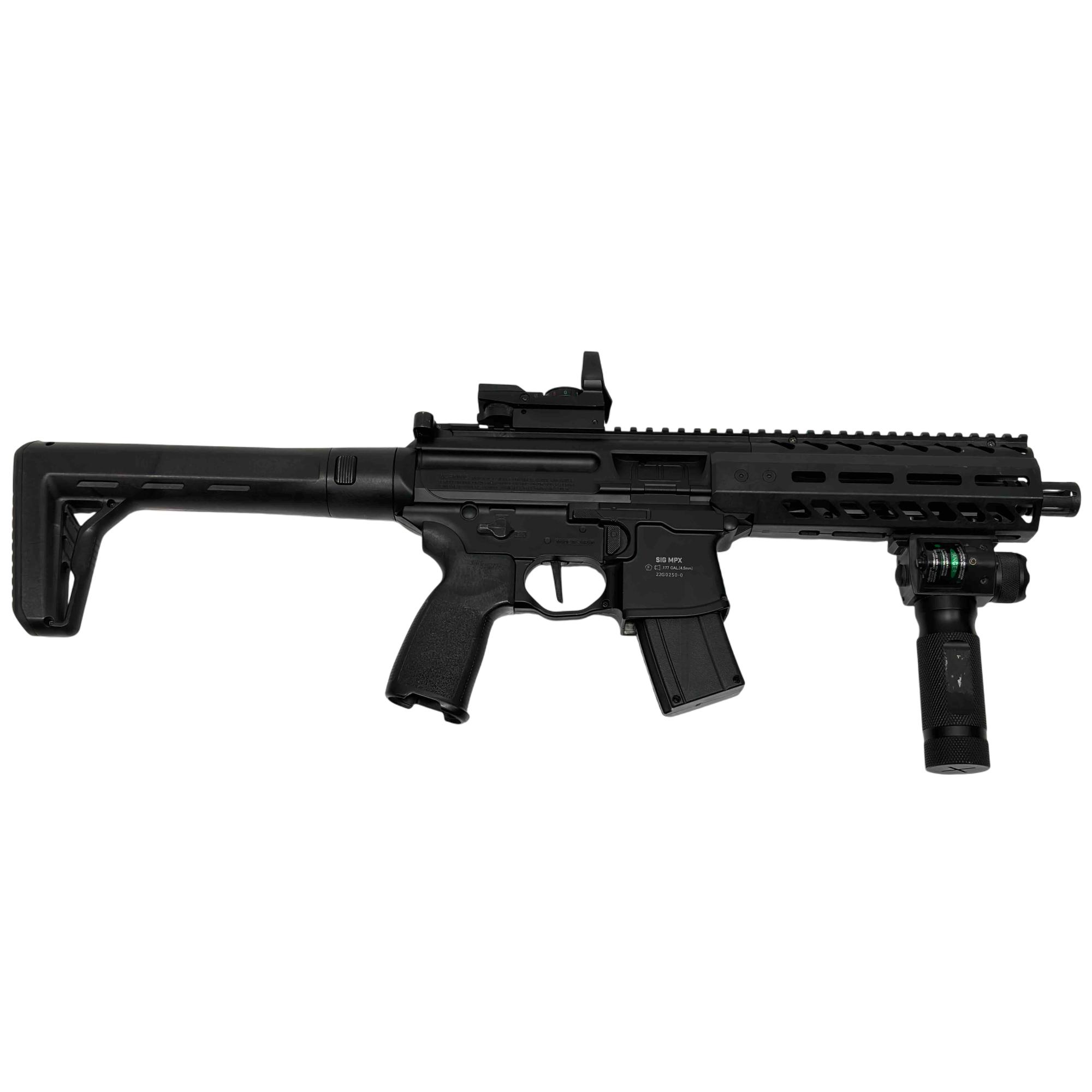 Experience the realism and performance of the SIG Sauer MPX ASP, a CO2-powered semi-automatic air rifle designed for enthusiasts and training. With authentic SIG branding, a metal frame, and .177 caliber (4.5mm) pellet compatibility, this airgun delivers both style and accuracy. Perfect for target shooting and practice, enjoy the reliability and feel of the iconic MPX platform without the cost of live ammunition.