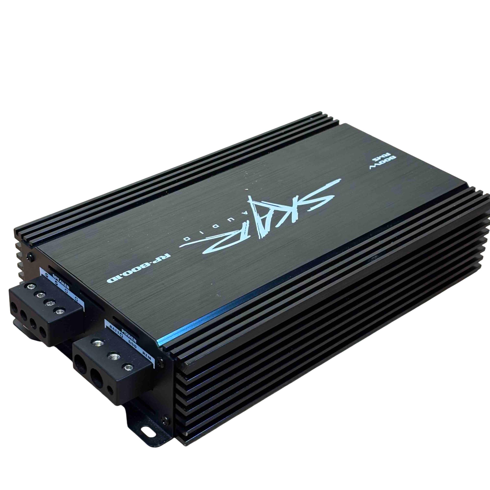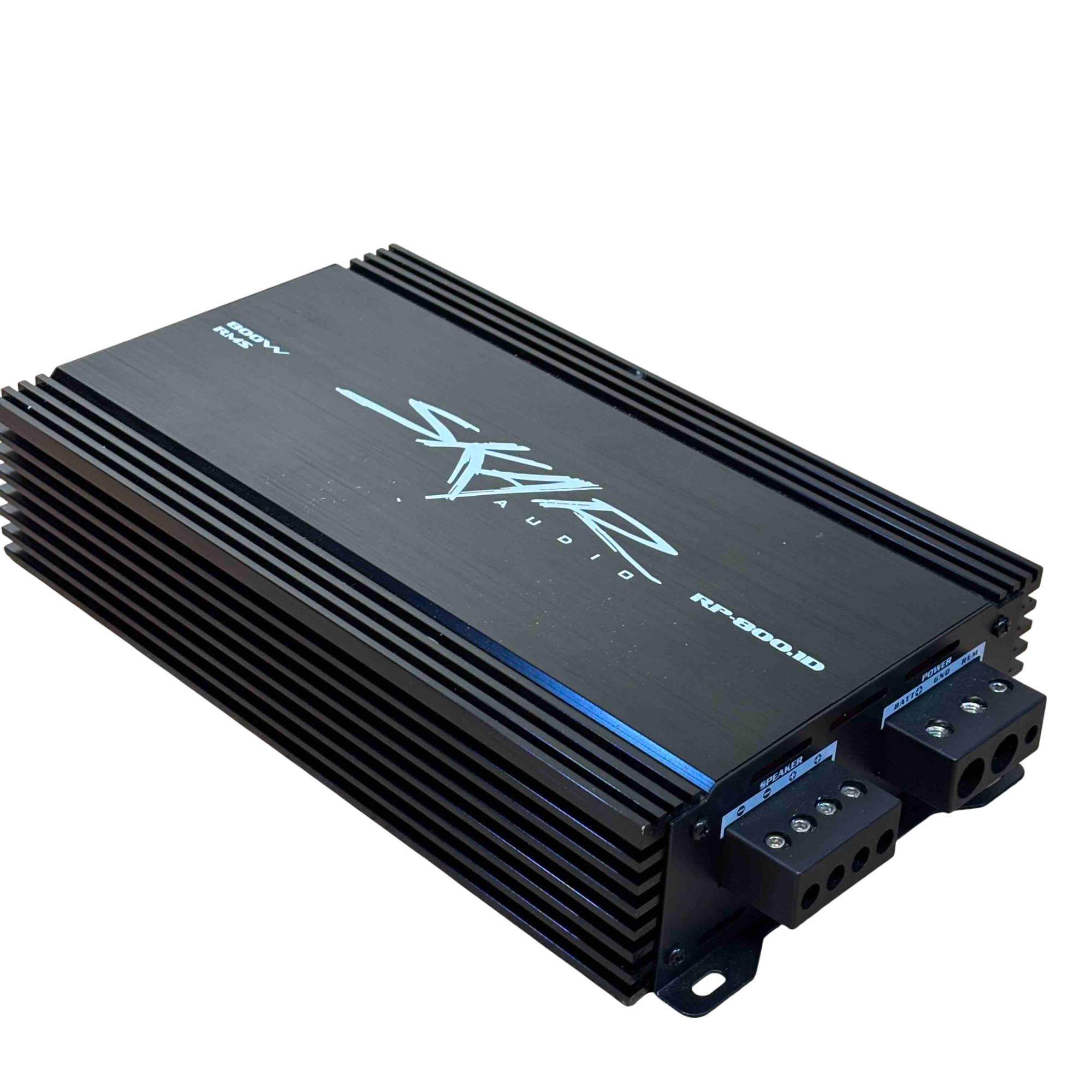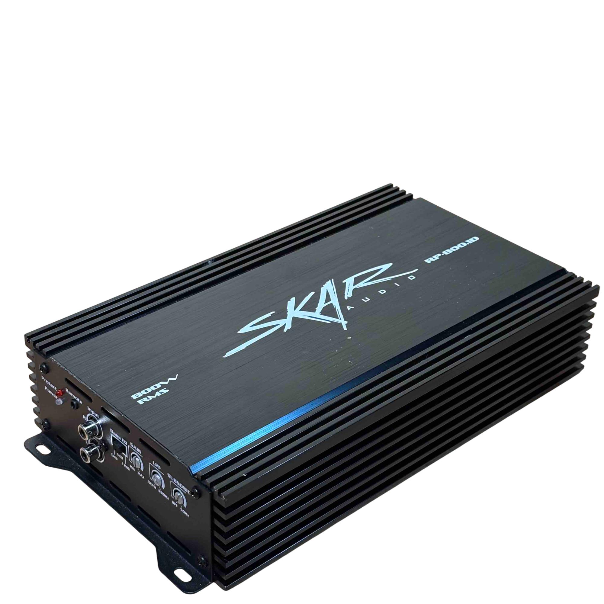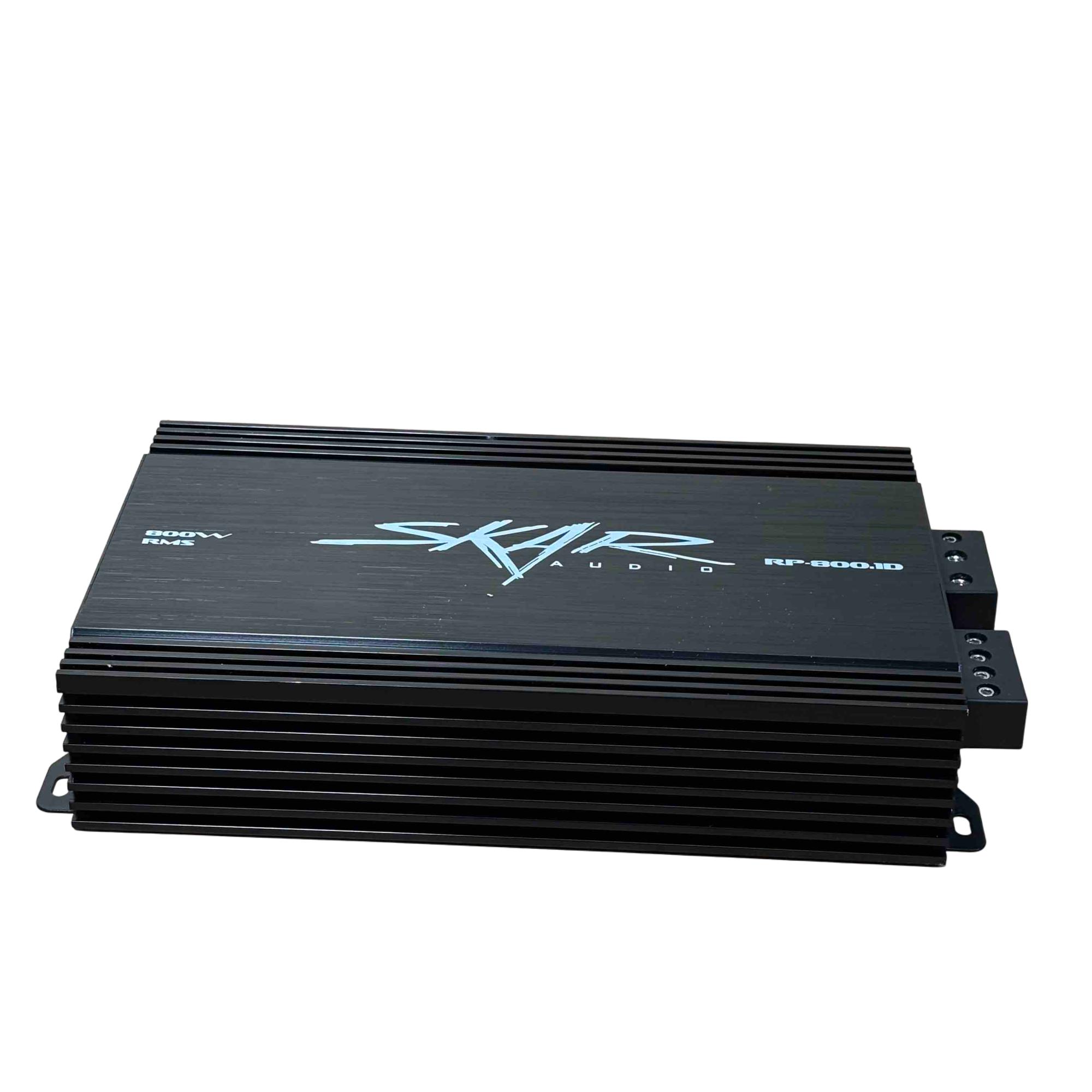 Skar Audio RP-800.1D 800W RMS Class D Monoblock Car Amplifier delivers powerful 800 watts RMS output with efficient Class D amplification, ideal for driving subwoofers in car audio systems. This sleek black monoblock design features advanced audio technology for clear, deep bass and high performance in a compact, durable chassis.
