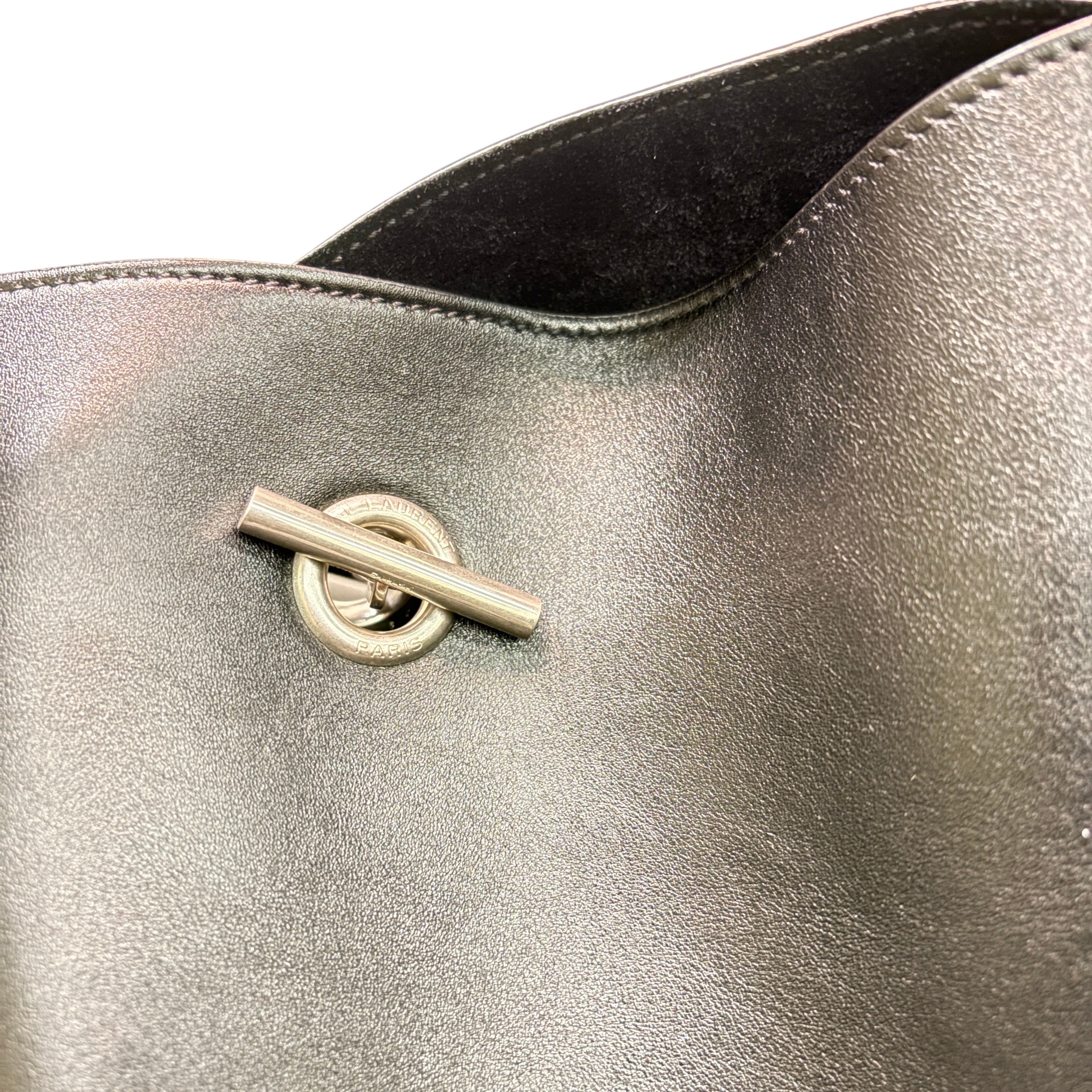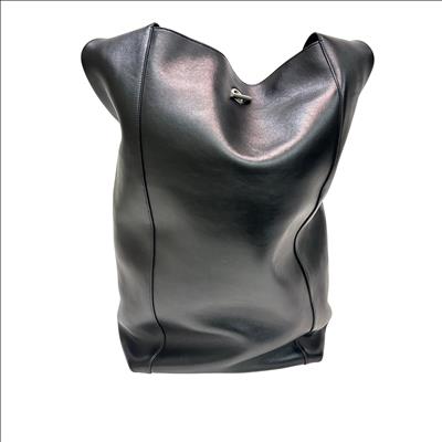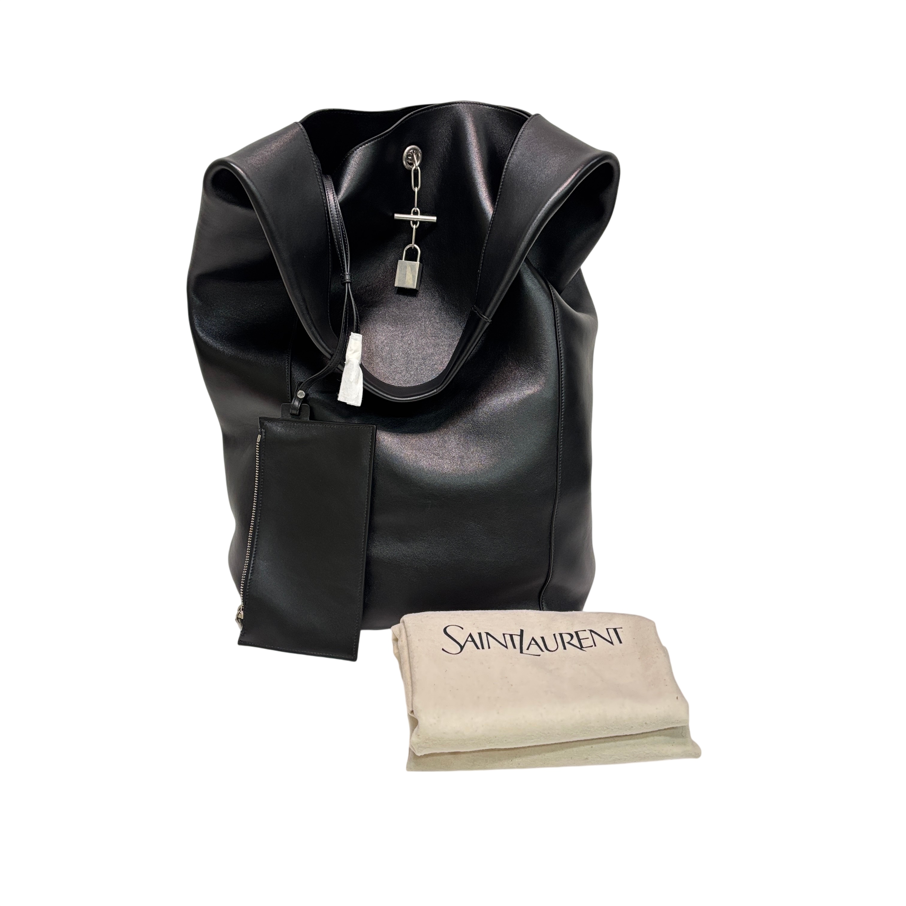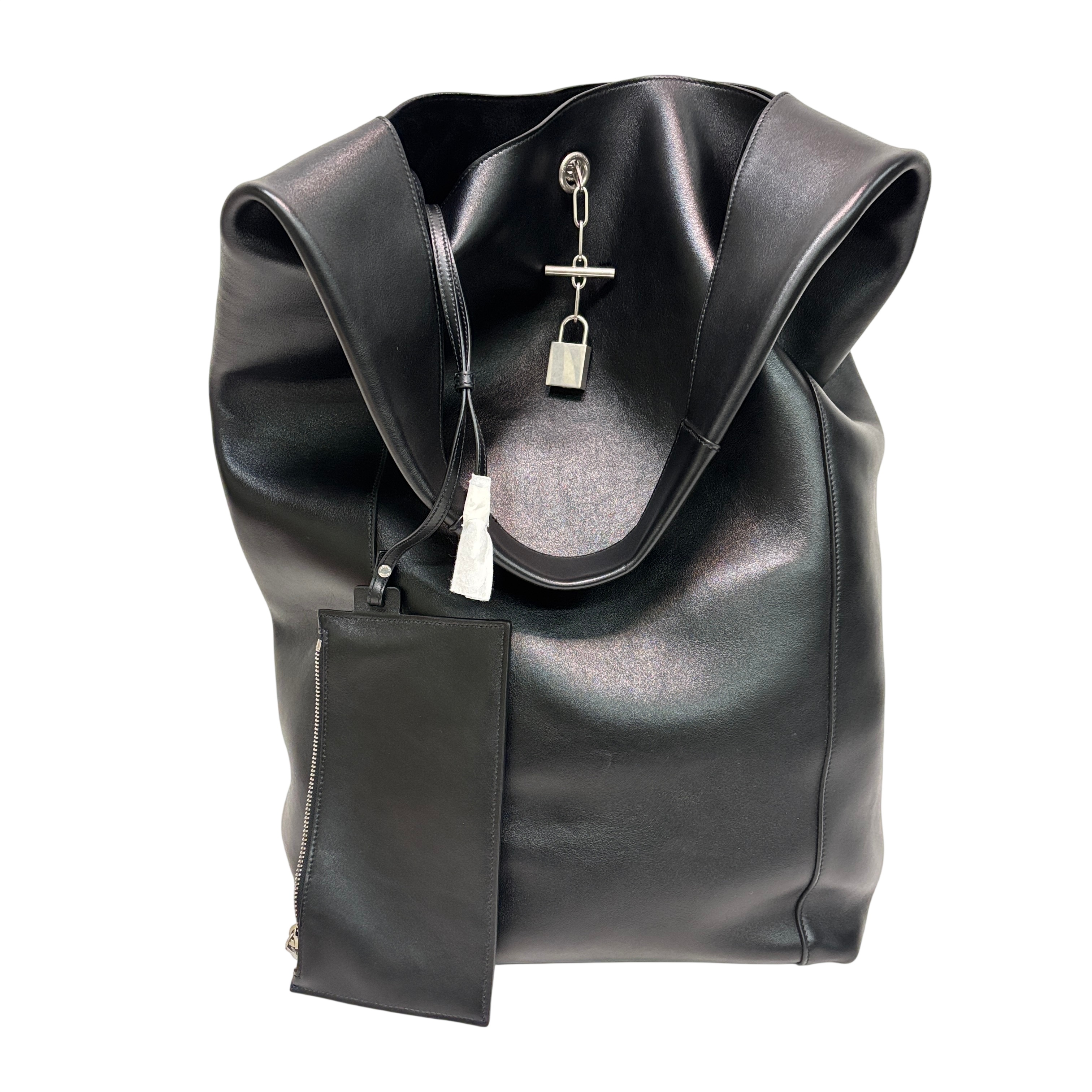 A sleek black leather tote bag featuring a distinctive toggle and padlock closure for added security and style. Crafted from high-quality leather, this tote includes a removable zip pouch for versatile storage and comes with a branded dust bag for protection. Its spacious design and elegant finish make it an ideal accessory for everyday use or sophisticated occasions, combining functionality with luxury.