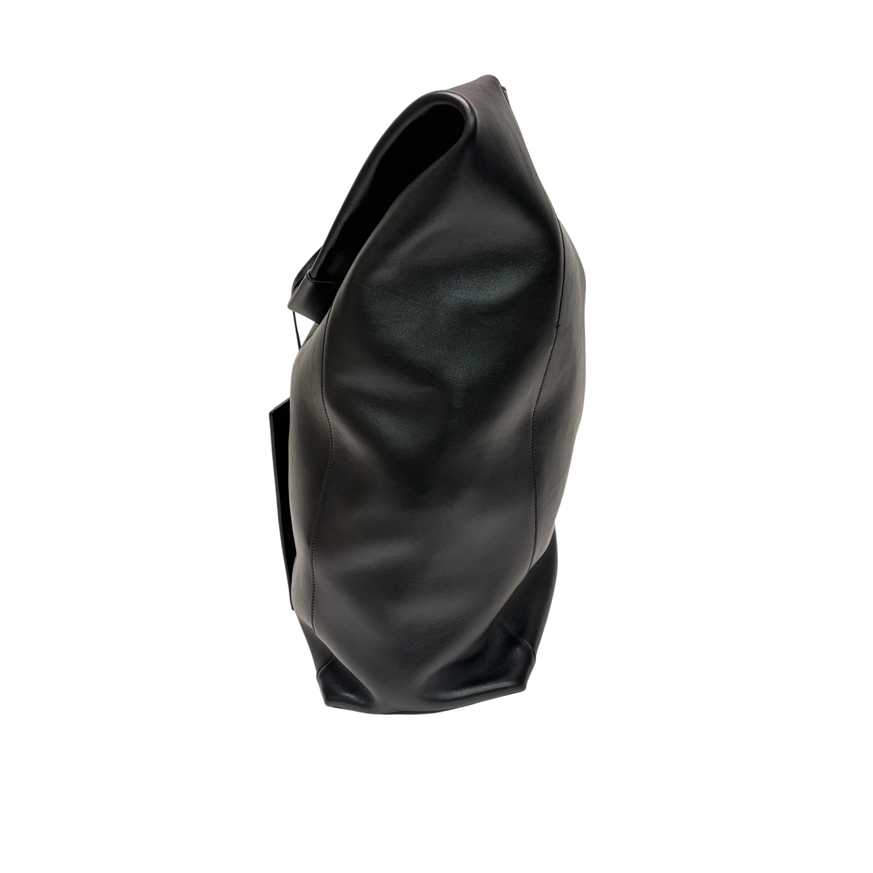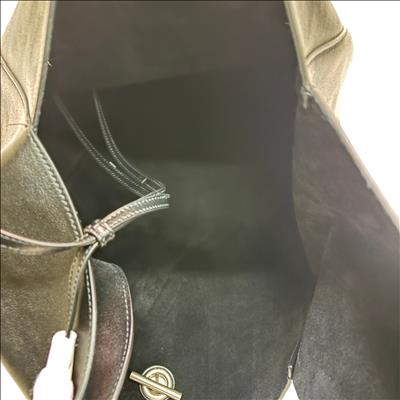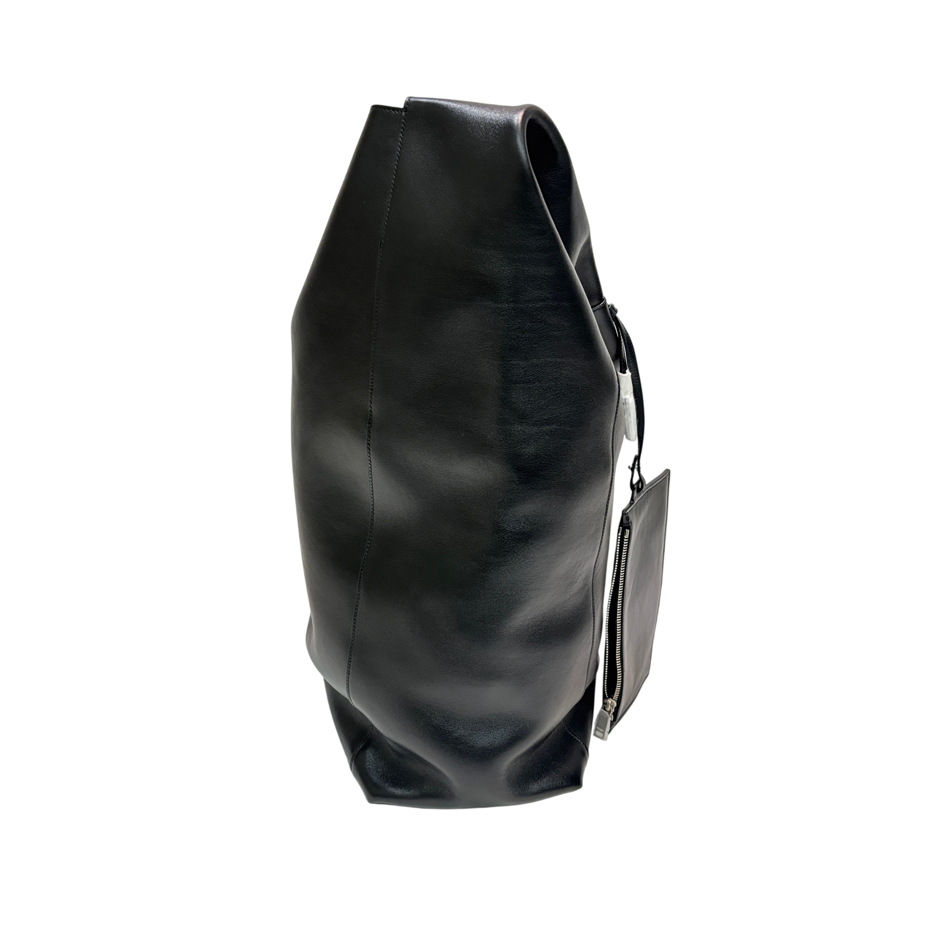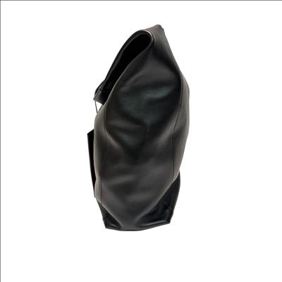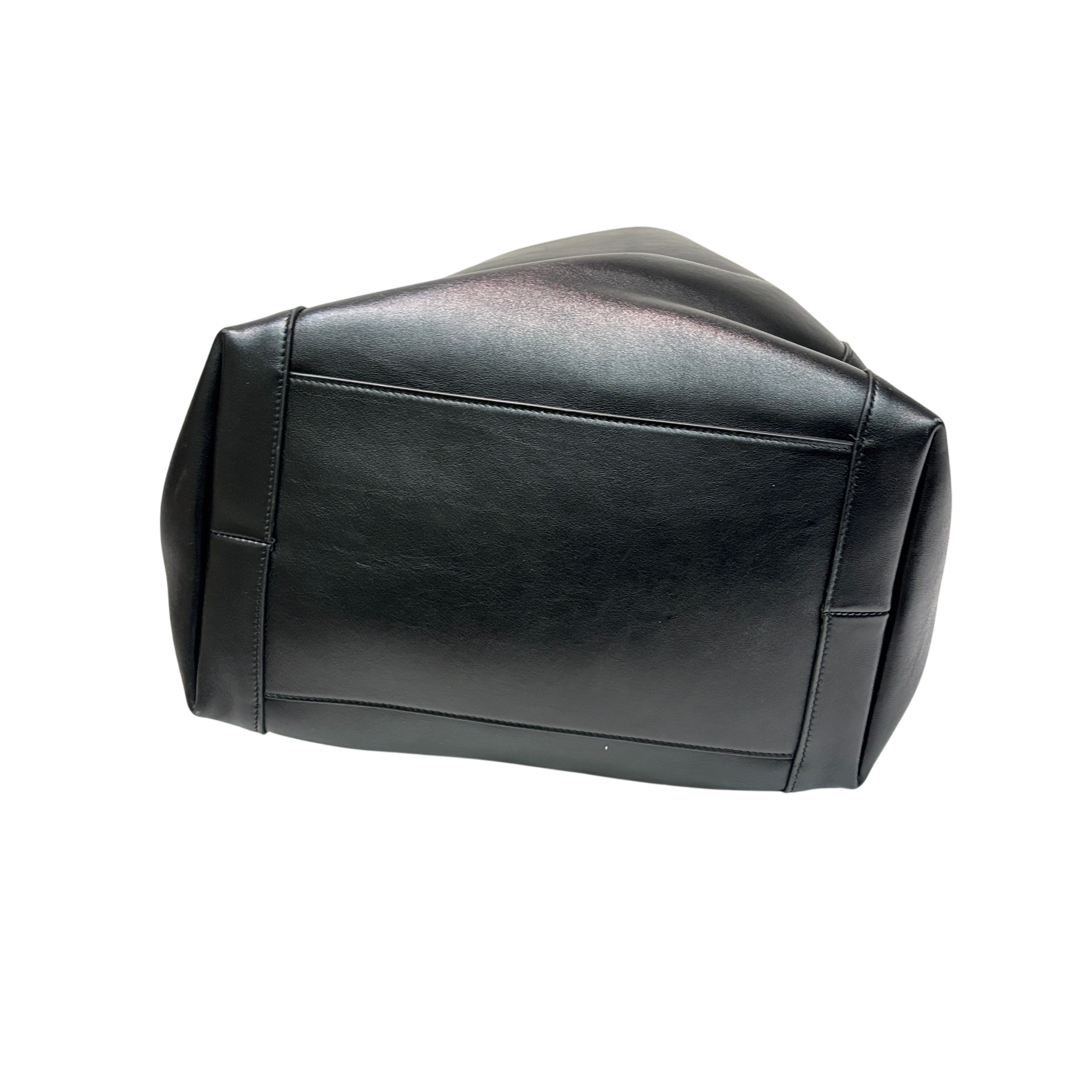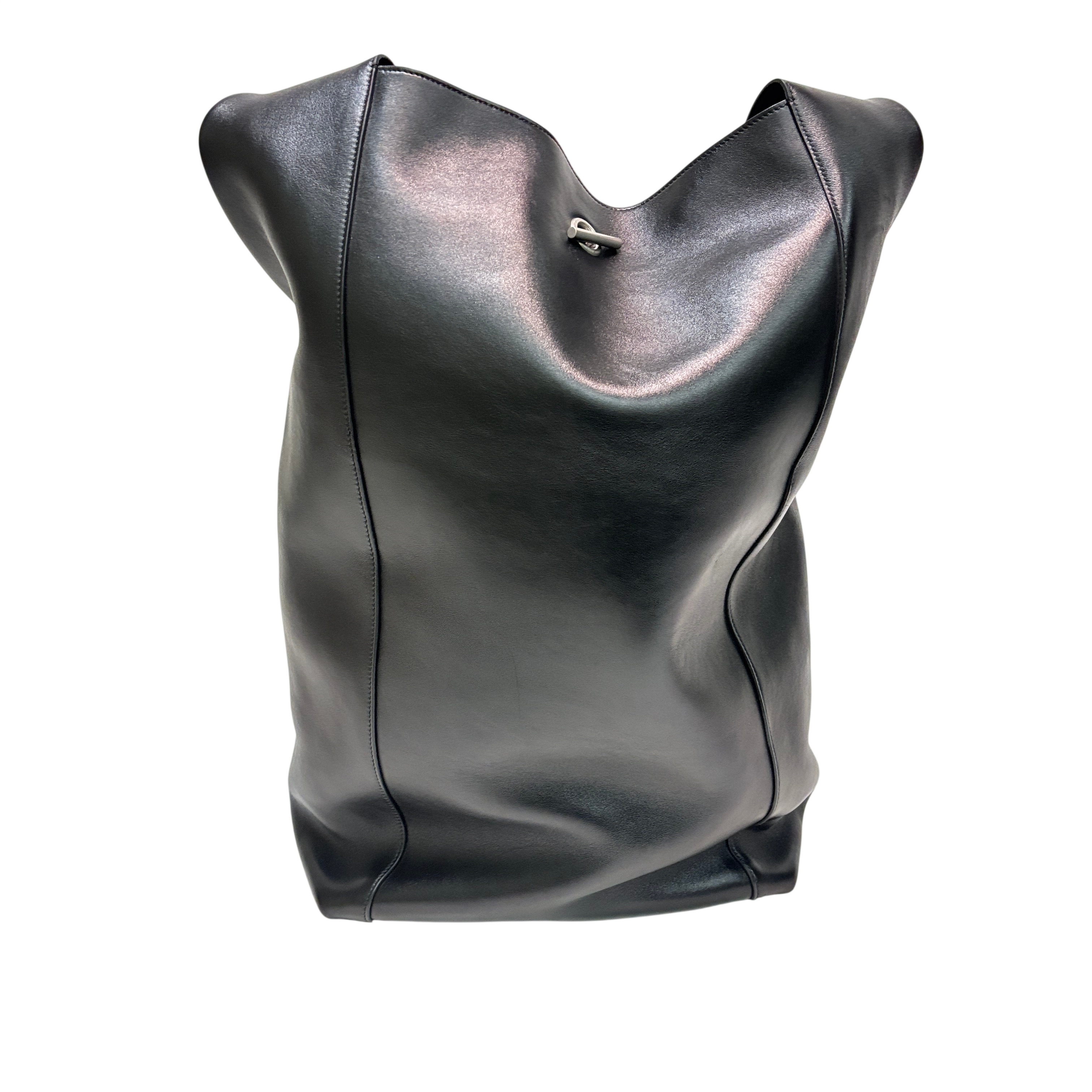 A sleek black leather tote bag featuring a distinctive toggle and padlock closure for added security and style. Crafted from high-quality leather, this tote includes a removable zip pouch for versatile storage and comes with a branded dust bag for protection. Its spacious design and elegant finish make it an ideal accessory for everyday use or sophisticated occasions, combining functionality with luxury.